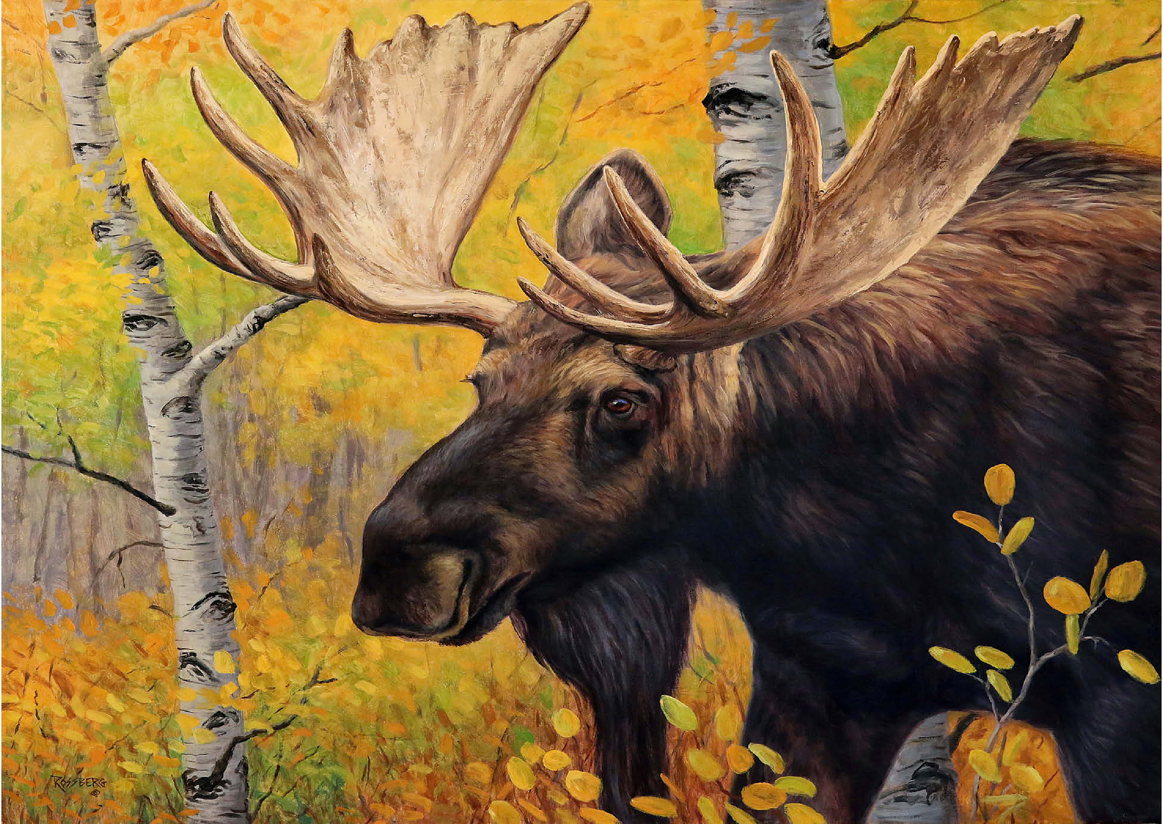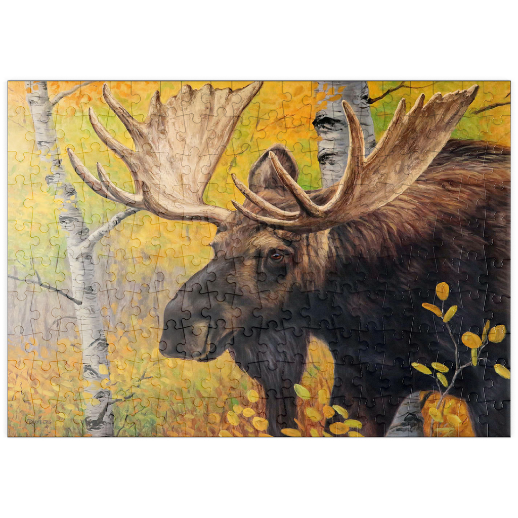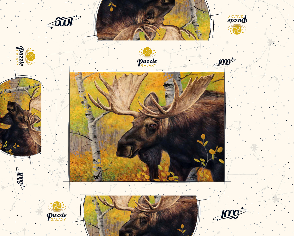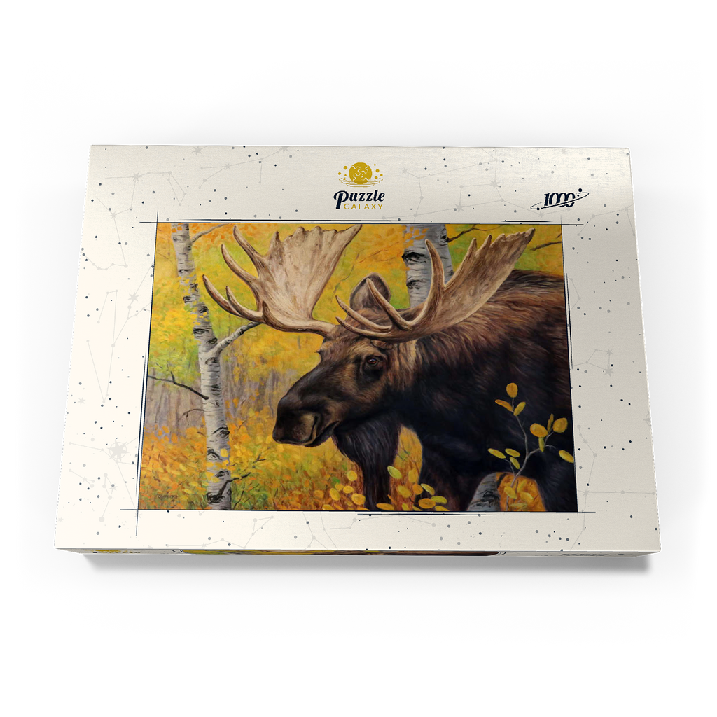 Eine beeindruckende Nahaufnahme eines Elchbullen inmitten eines lebhaften Herbstwaldes. Das goldgelbe Laub der Espenbäume umgibt den Elch und hebt die warmen, erdigen Töne seines dicken Fells und die Pracht seines massiven Geweihs hervor. Der ruhige Gesichtsausdruck des Elchs in Kombination mit den leuchtenden Herbstfarben schafft eine fesselnde Szene, die die Schönheit und Ruhe der Wildtiere in ihrem natürlichen Lebensraum verkörpert.