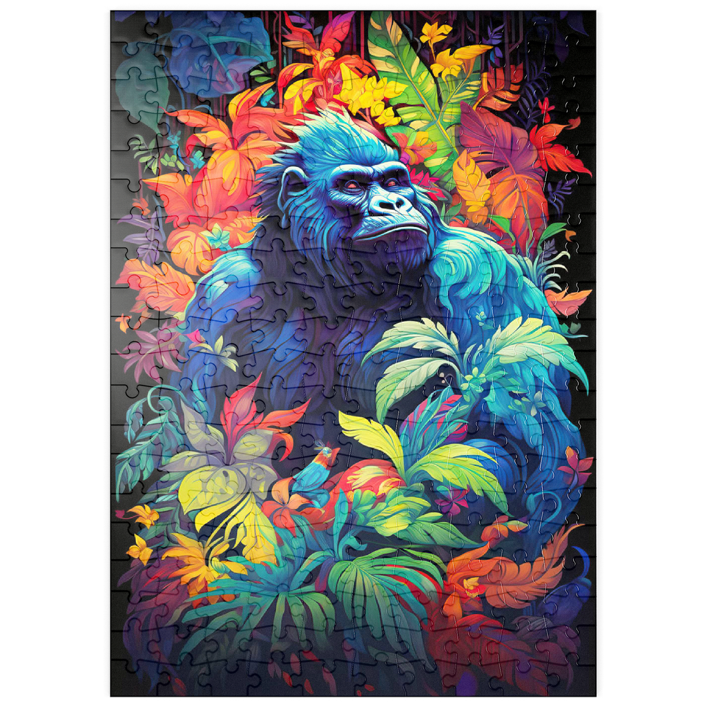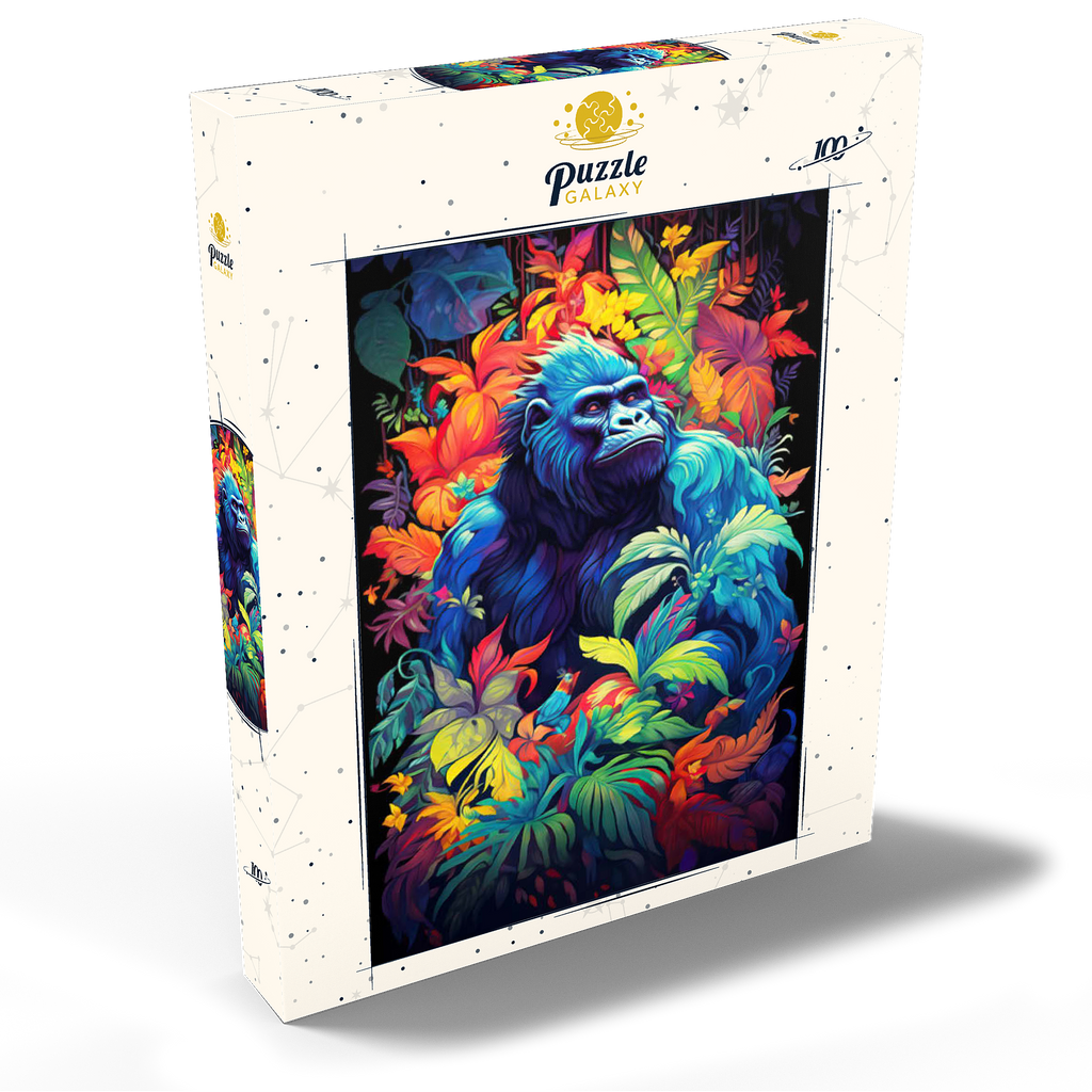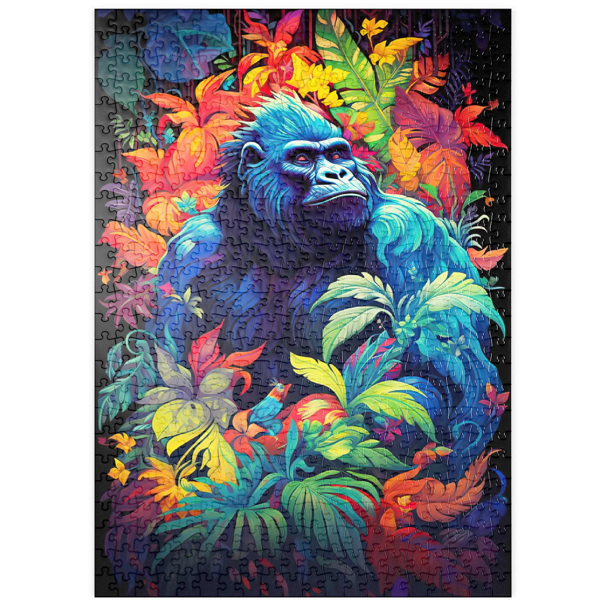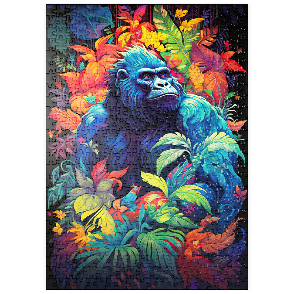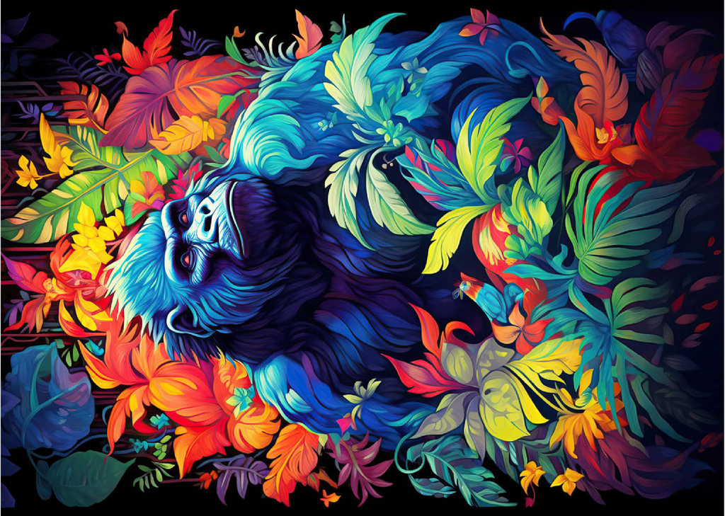 Dieses atemberaubende Kunstwerk zeigt einen kräftigen Gorilla, der von einem üppigen, farbenfrohen Dschungel umgeben ist. Die tiefen Blau- und Violetttöne des Gorillafells kontrastieren wunderschön mit den feurigen Orange-, Gelb- und Grüntönen des tropischen Laubes und schaffen eine atemberaubende Verschmelzung von Natur und Fantasie. Der intensive Blick des Gorillas vermittelt ein Gefühl von Weisheit und Stärke und macht dieses Stück zu einer beeindruckenden Ergänzung für jede Tier- oder Kunstsammlung. Eine perfekte Wahl für Naturliebhaber, Dschungelforscher und Fans von kühner, surrealer Tierkunst.