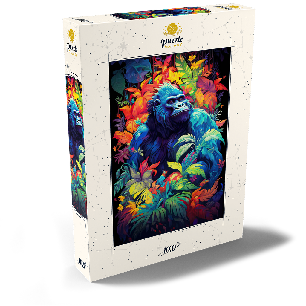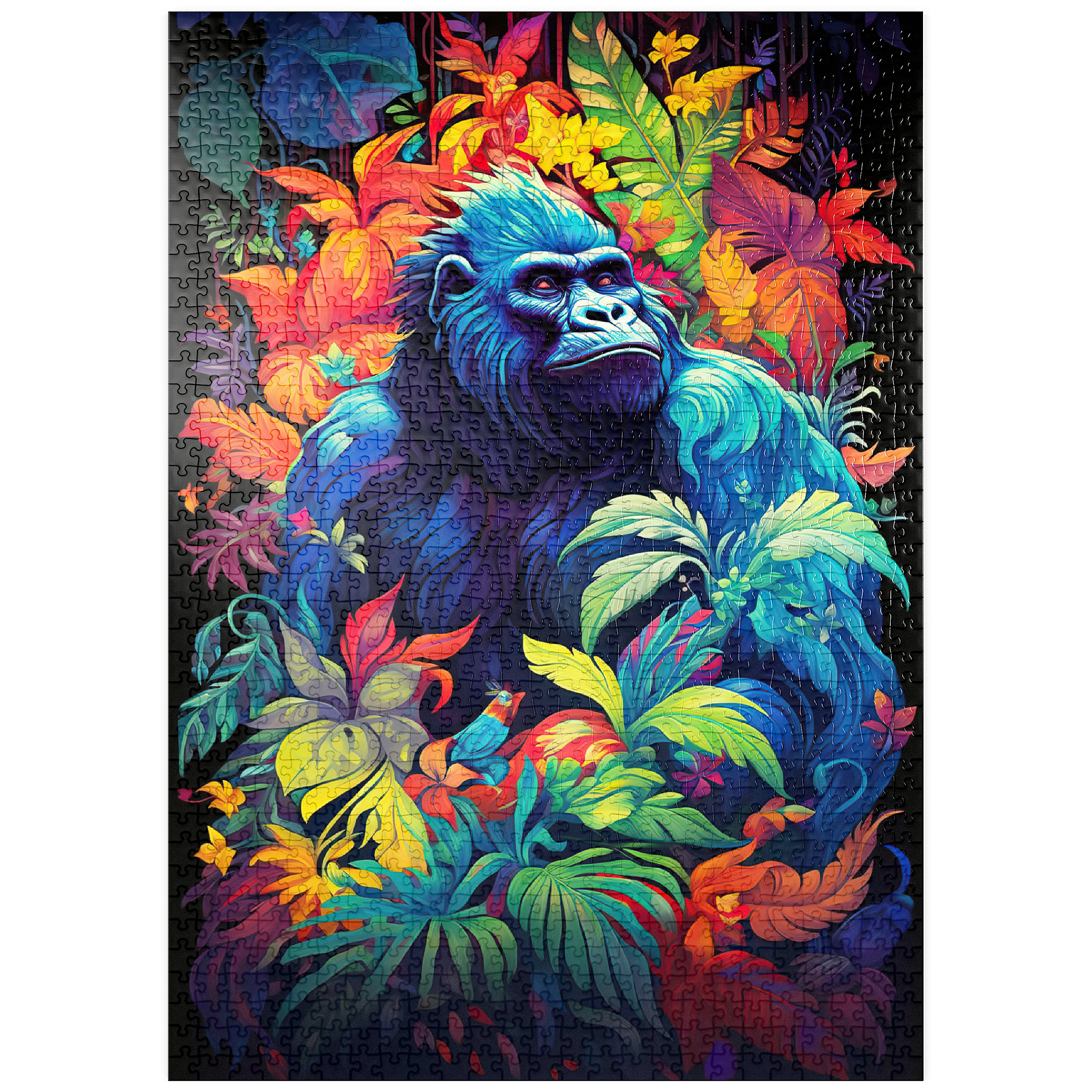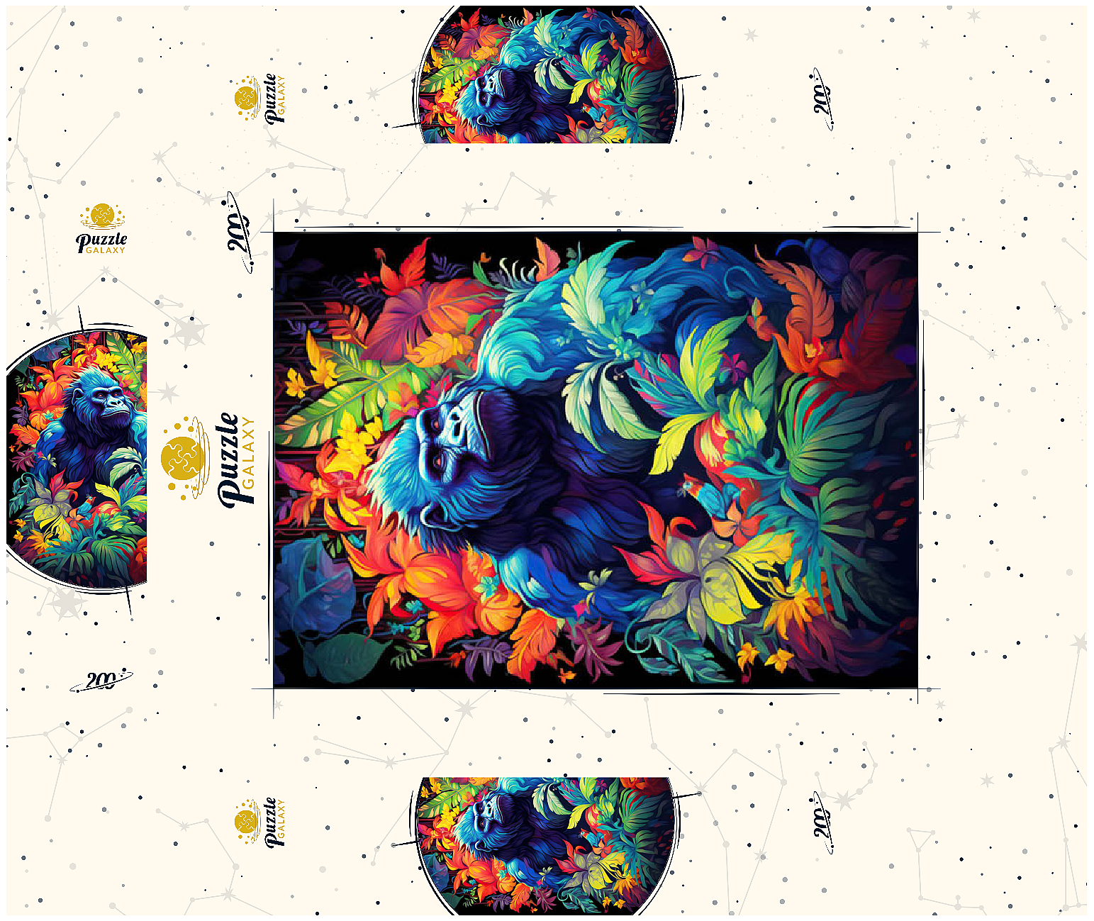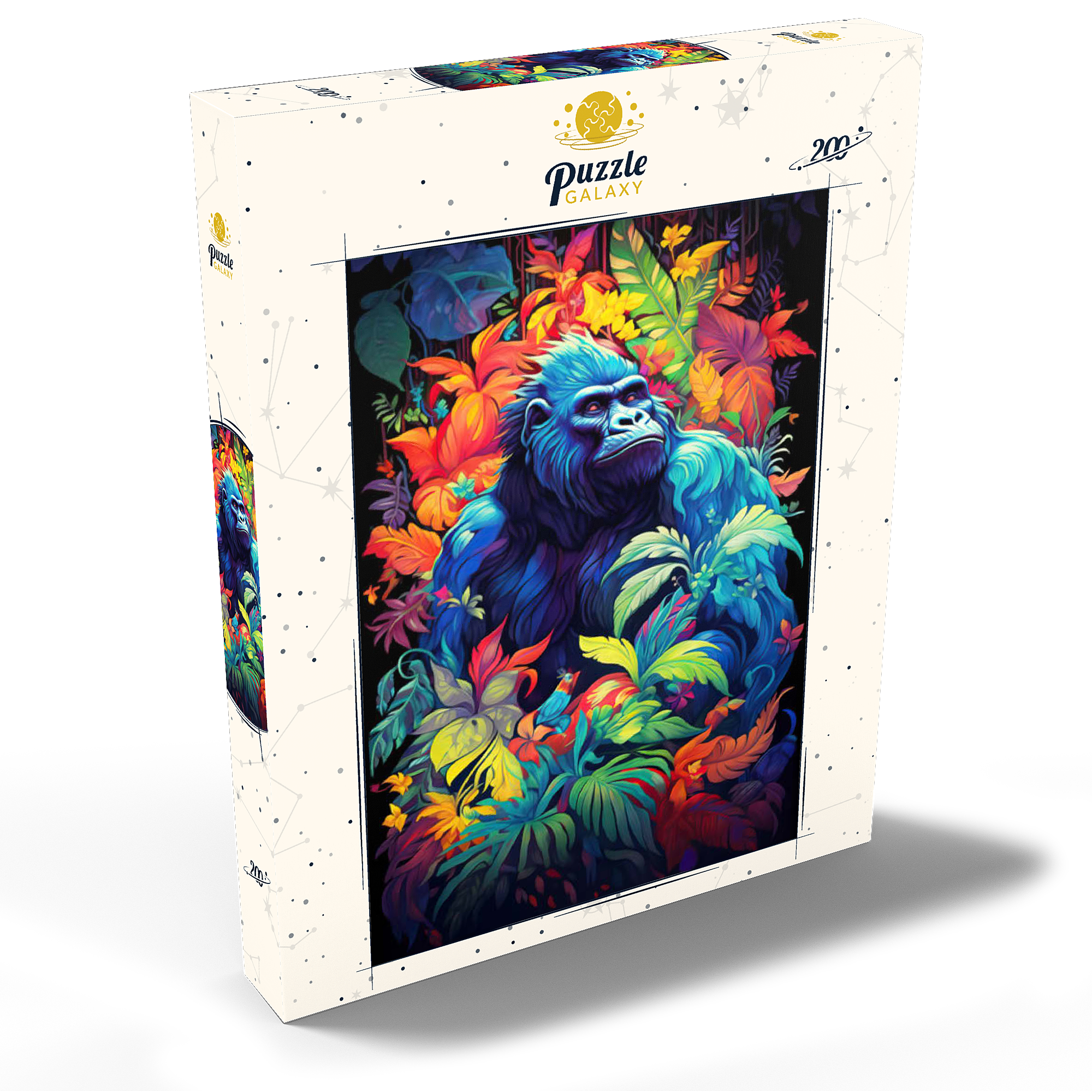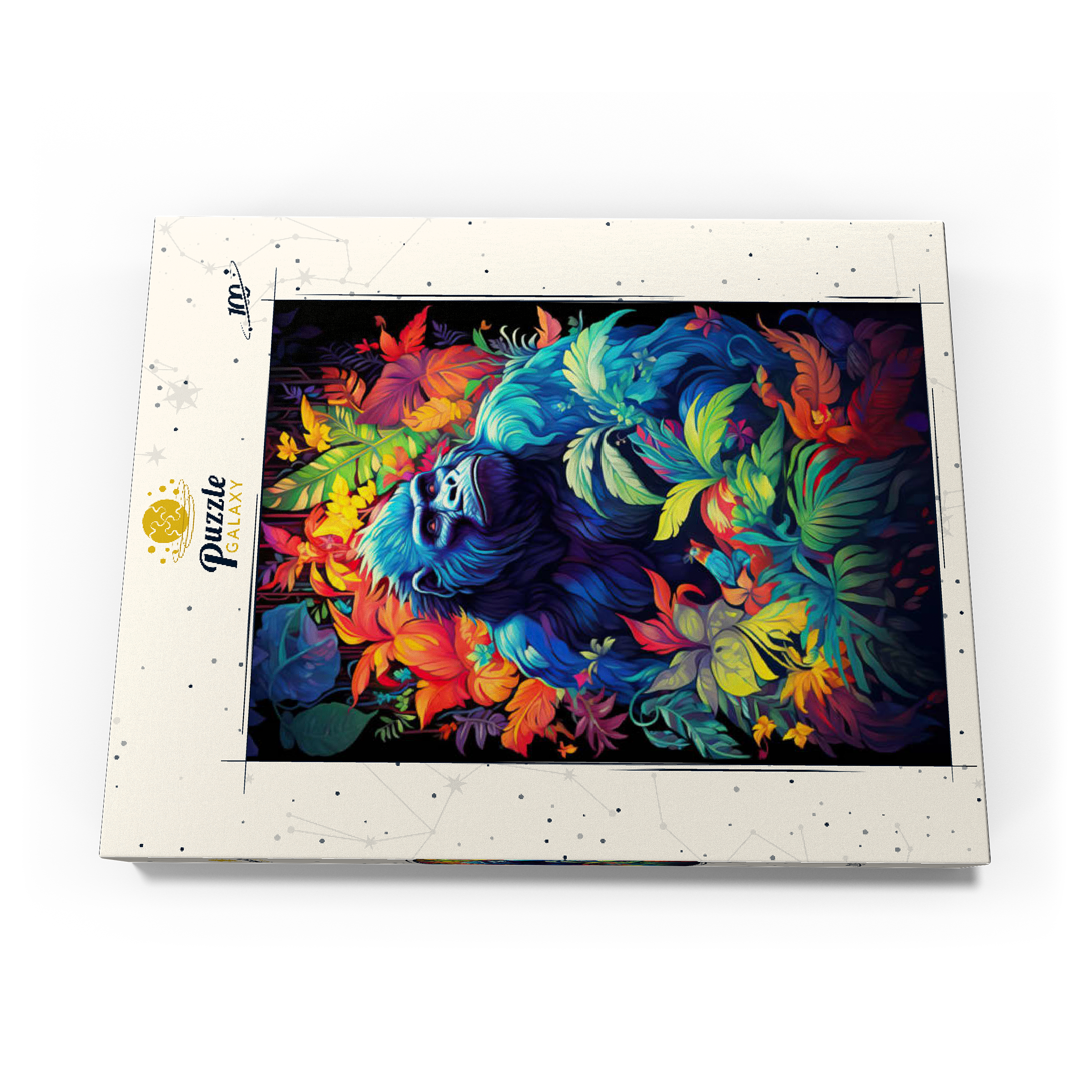 Dieses atemberaubende Kunstwerk zeigt einen kräftigen Gorilla, der von einem üppigen, farbenfrohen Dschungel umgeben ist. Die tiefen Blau- und Violetttöne des Gorillafells kontrastieren wunderschön mit den feurigen Orange-, Gelb- und Grüntönen des tropischen Laubes und schaffen eine atemberaubende Verschmelzung von Natur und Fantasie. Der intensive Blick des Gorillas vermittelt ein Gefühl von Weisheit und Stärke und macht dieses Stück zu einer beeindruckenden Ergänzung für jede Tier- oder Kunstsammlung. Eine perfekte Wahl für Naturliebhaber, Dschungelforscher und Fans von kühner, surrealer Tierkunst.