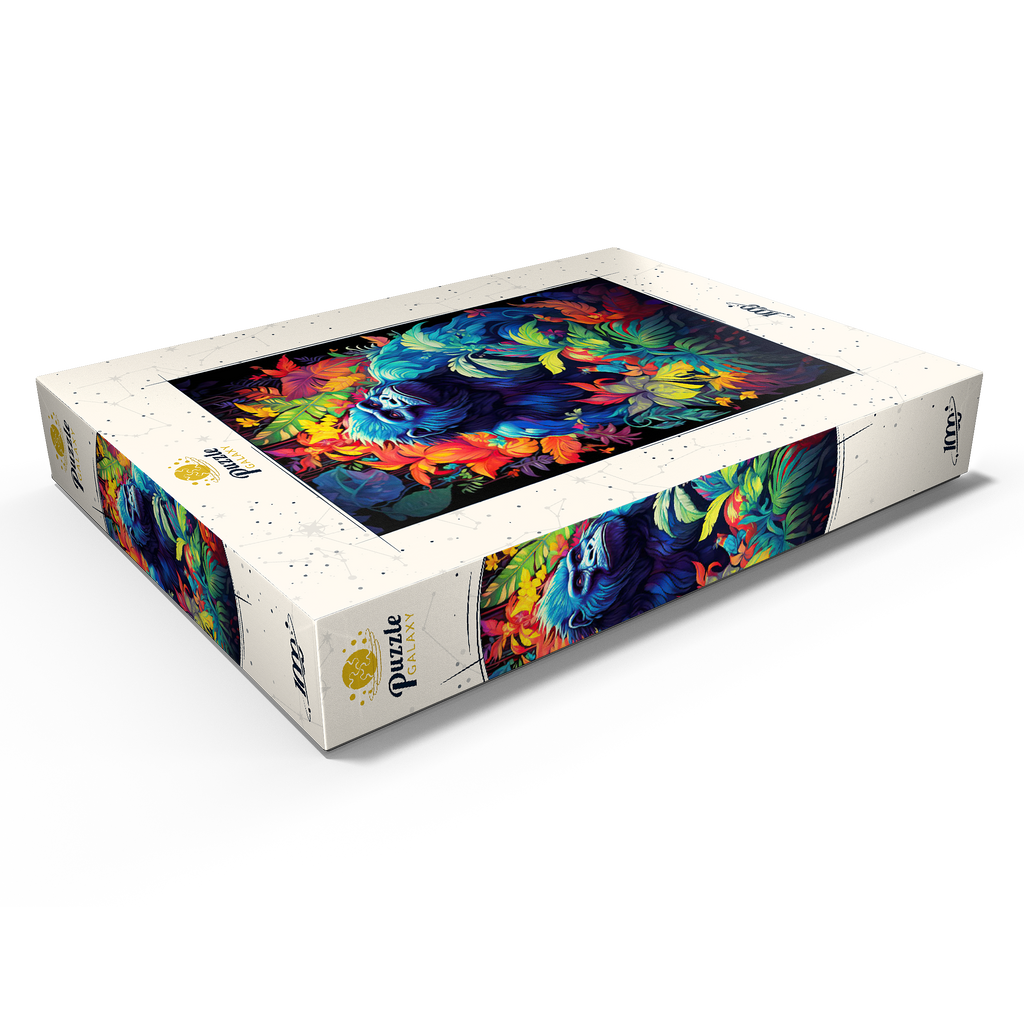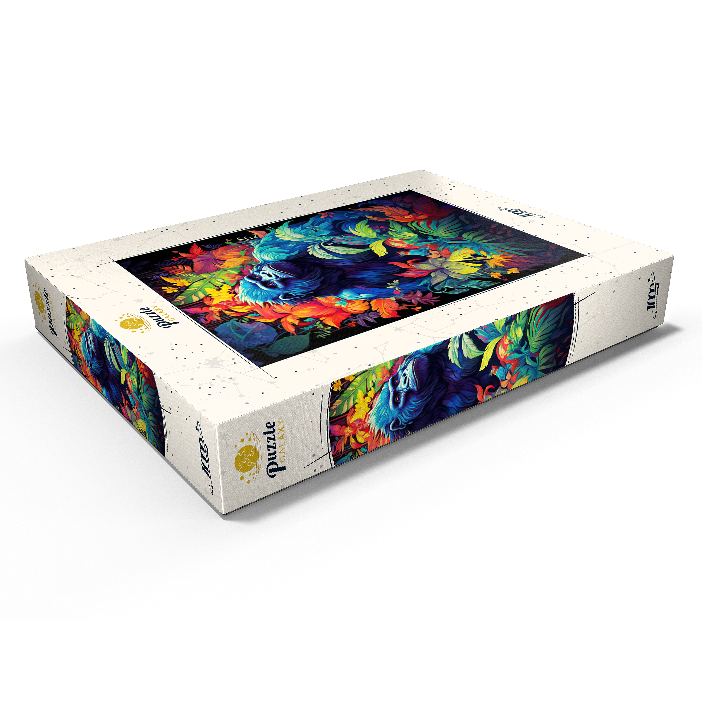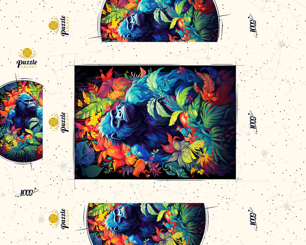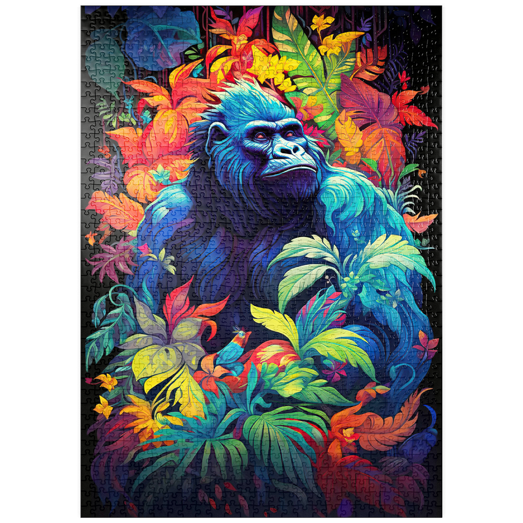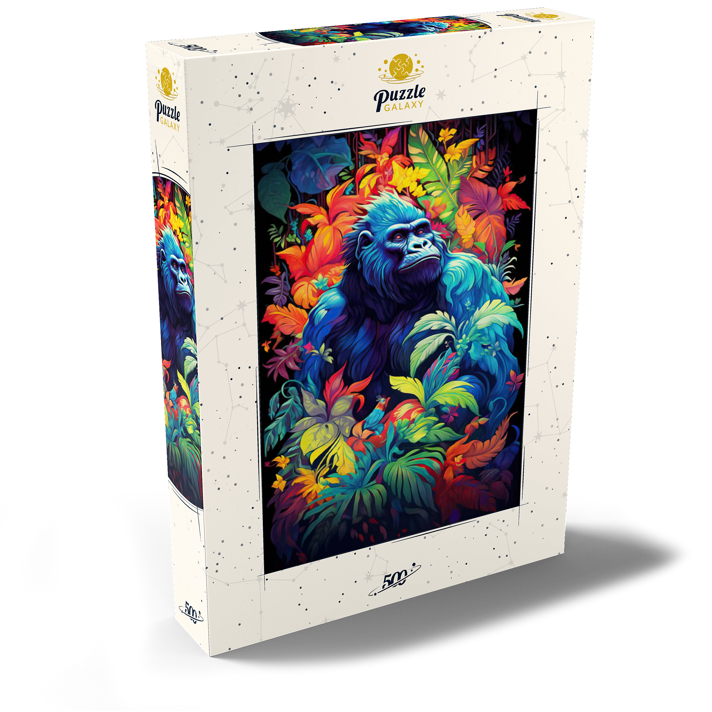 Dieses atemberaubende Kunstwerk zeigt einen kräftigen Gorilla, der von einem üppigen, farbenfrohen Dschungel umgeben ist. Die tiefen Blau- und Violetttöne des Gorillafells kontrastieren wunderschön mit den feurigen Orange-, Gelb- und Grüntönen des tropischen Laubes und schaffen eine atemberaubende Verschmelzung von Natur und Fantasie. Der intensive Blick des Gorillas vermittelt ein Gefühl von Weisheit und Stärke und macht dieses Stück zu einer beeindruckenden Ergänzung für jede Tier- oder Kunstsammlung. Eine perfekte Wahl für Naturliebhaber, Dschungelforscher und Fans von kühner, surrealer Tierkunst.