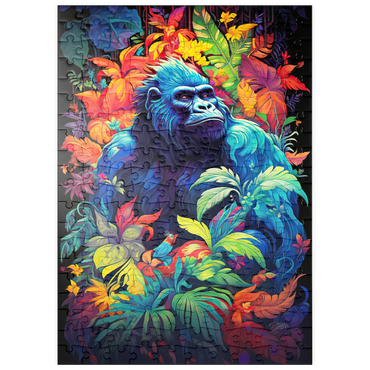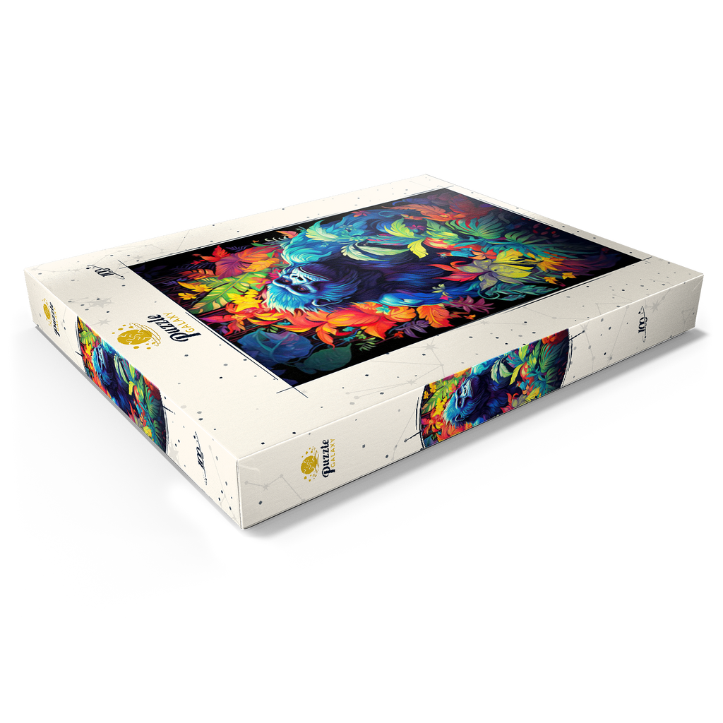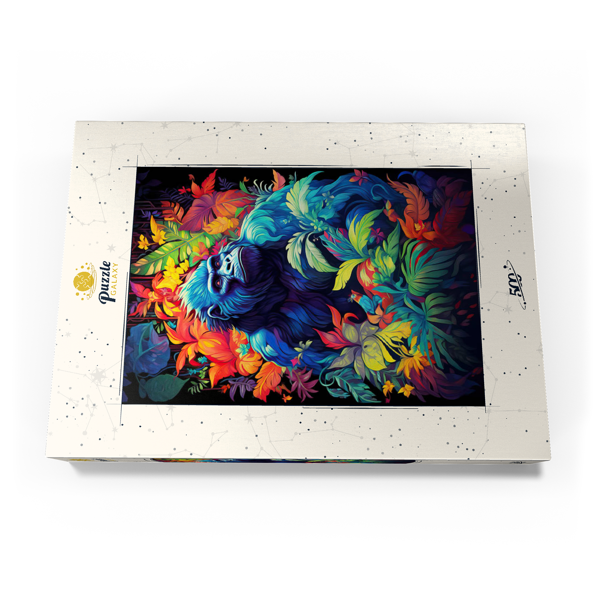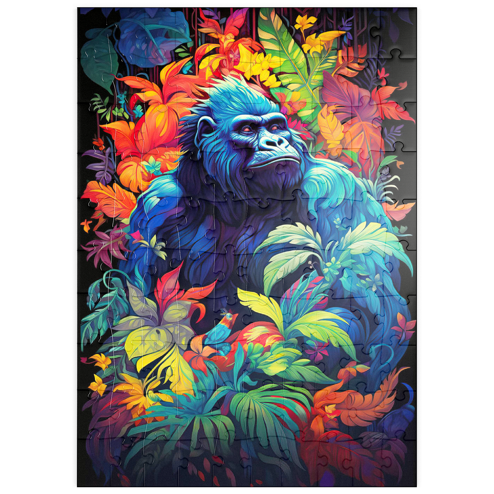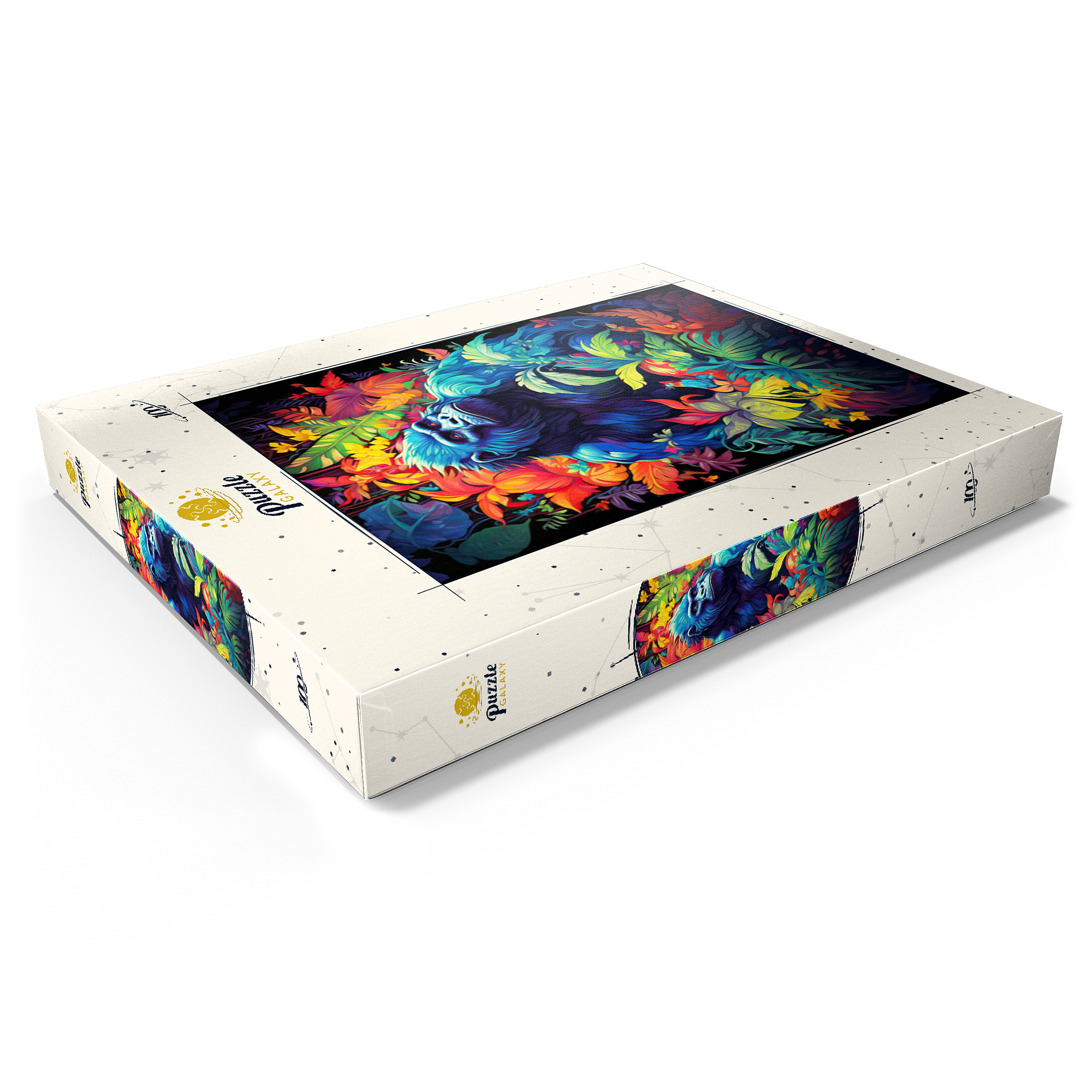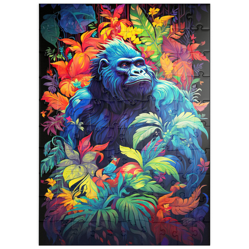 Dieses atemberaubende Kunstwerk zeigt einen kräftigen Gorilla, der von einem üppigen, farbenfrohen Dschungel umgeben ist. Die tiefen Blau- und Violetttöne des Gorillafells kontrastieren wunderschön mit den feurigen Orange-, Gelb- und Grüntönen des tropischen Laubes und schaffen eine atemberaubende Verschmelzung von Natur und Fantasie. Der intensive Blick des Gorillas vermittelt ein Gefühl von Weisheit und Stärke und macht dieses Stück zu einer beeindruckenden Ergänzung für jede Tier- oder Kunstsammlung. Eine perfekte Wahl für Naturliebhaber, Dschungelforscher und Fans von kühner, surrealer Tierkunst.