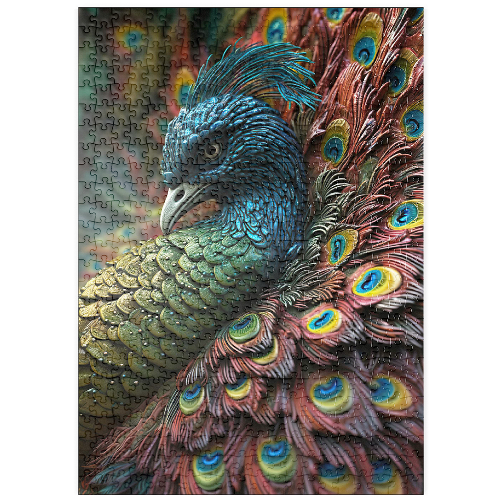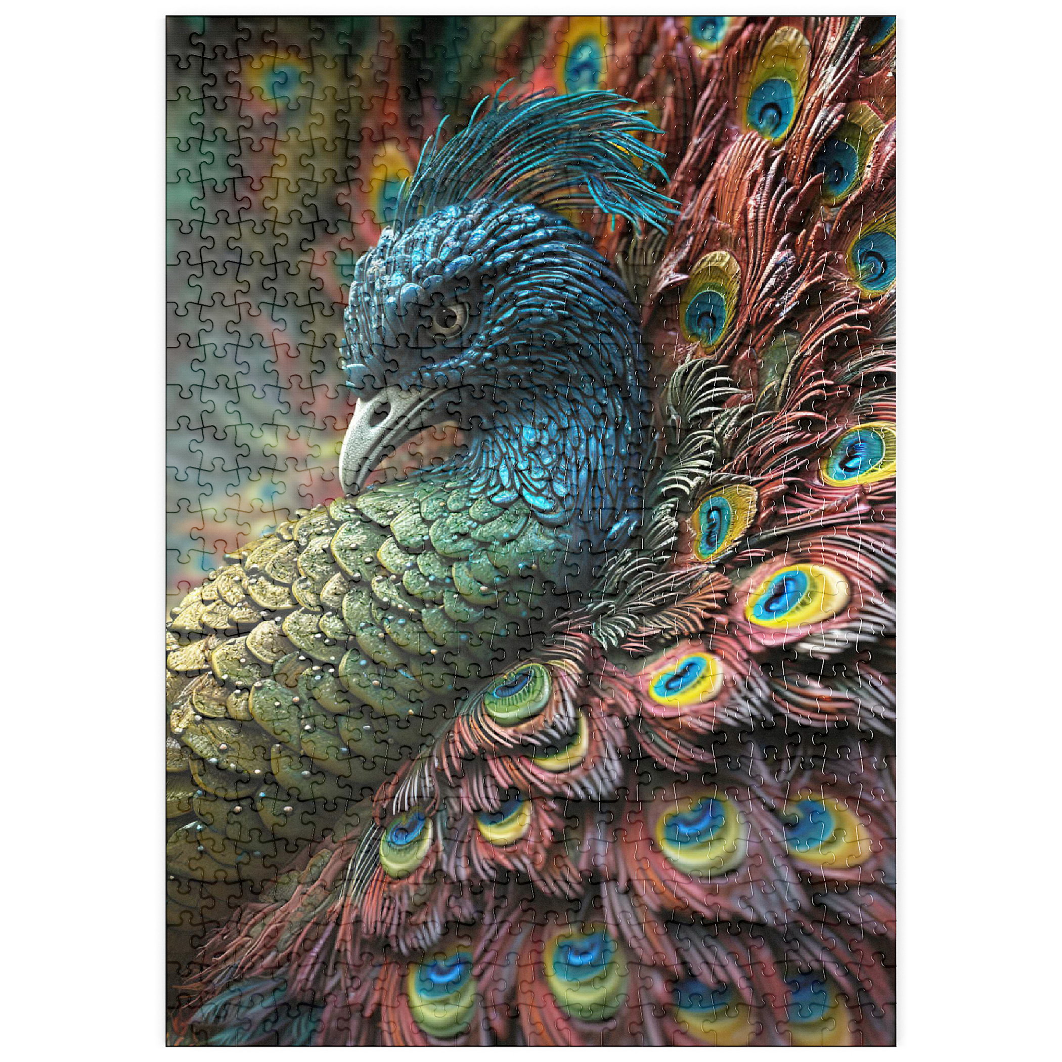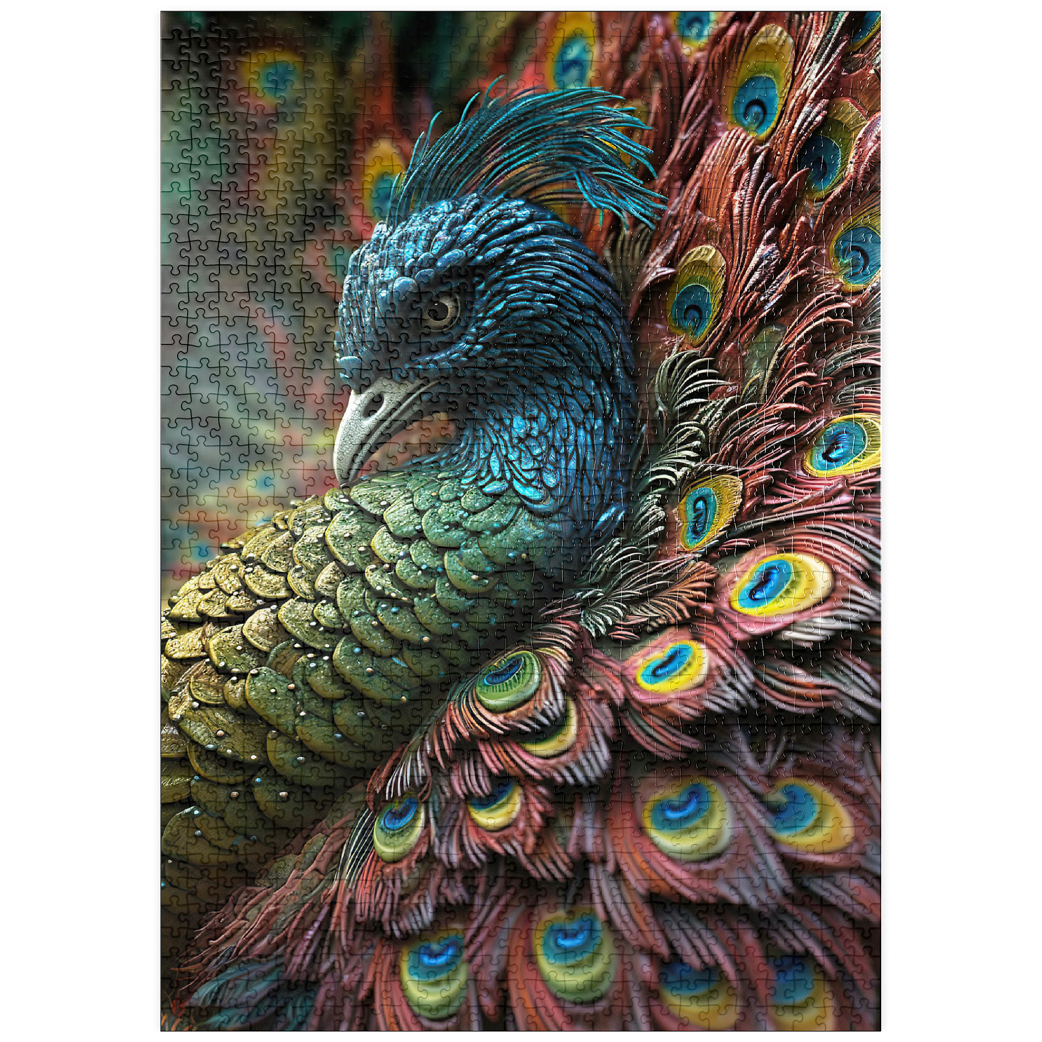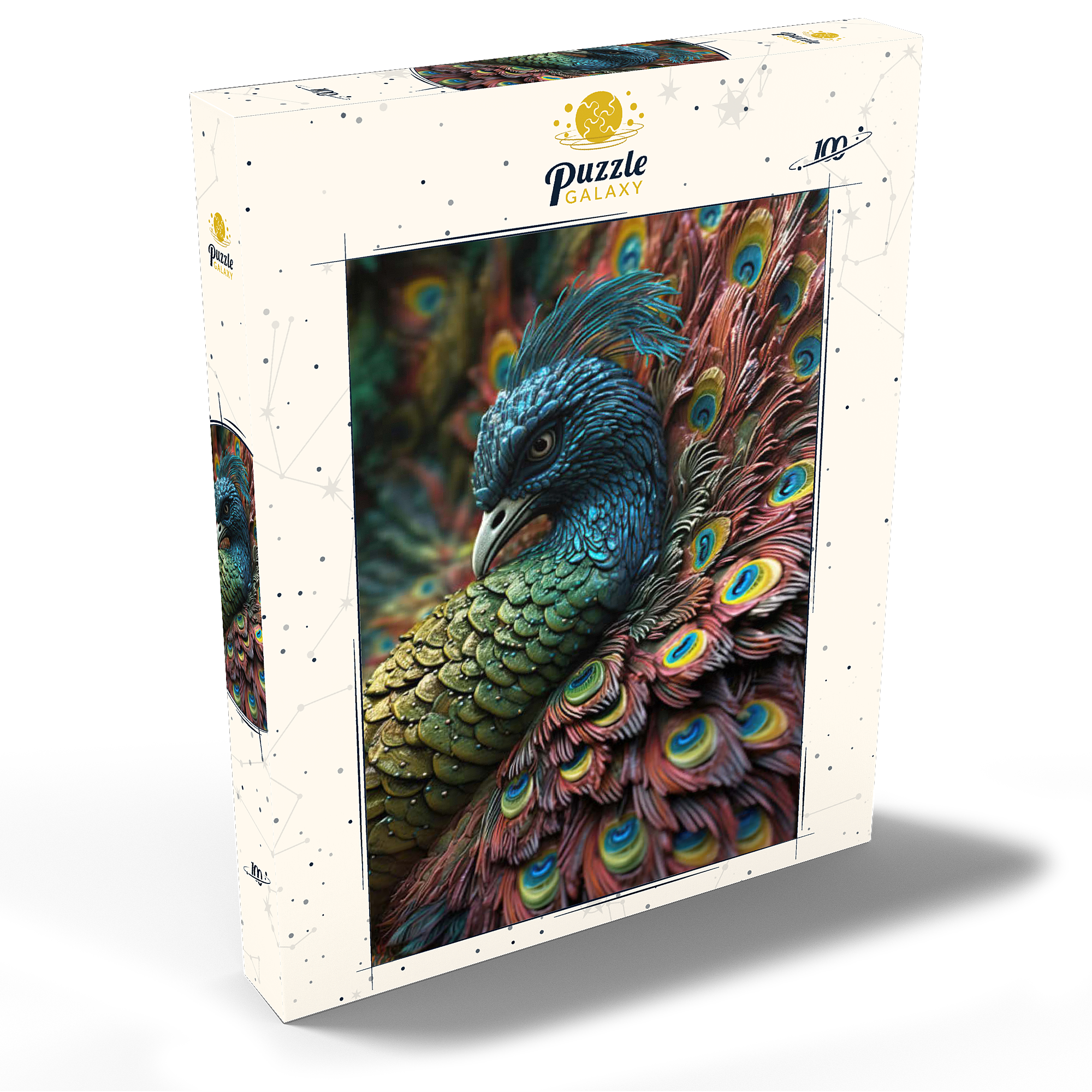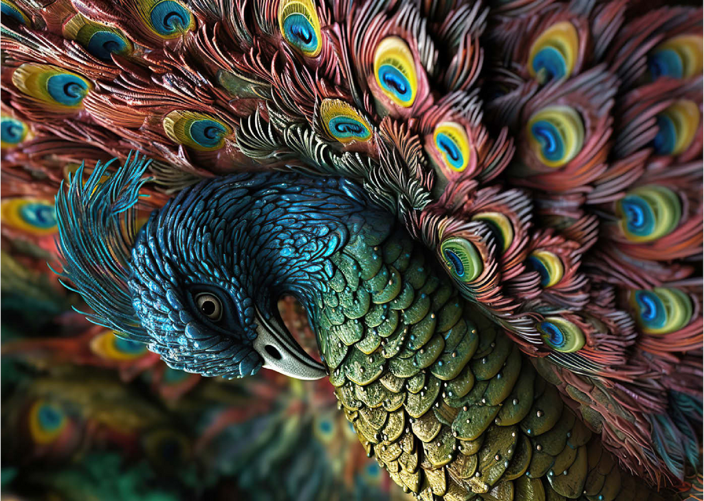 Dieses atemberaubende Kunstwerk zeigt einen majestätischen Pfau mit komplizierten, hochdetaillierten Federn, die in satten Farbtönen von tiefem Blau, Smaragdgrün und Bronzegold schimmern. Jede Feder ist sorgfältig gearbeitet und mit auffallend schillernden Augenflecken verziert, die die königliche und mystische Aura des Vogels noch verstärken. Der durchdringende Blick und die elegante Haltung des Pfaus strahlen Kraft und Anmut aus und machen dieses Stück zu einer atemberaubenden Verschmelzung von Fantasie und Realismus. Dieses Meisterwerk ist perfekt für Liebhaber exotischer Wildtiere, luxuriöser Texturen und komplizierter digitaler Kunst und fängt die Schönheit und Erhabenheit des extravagantesten Vogels der Natur ein.