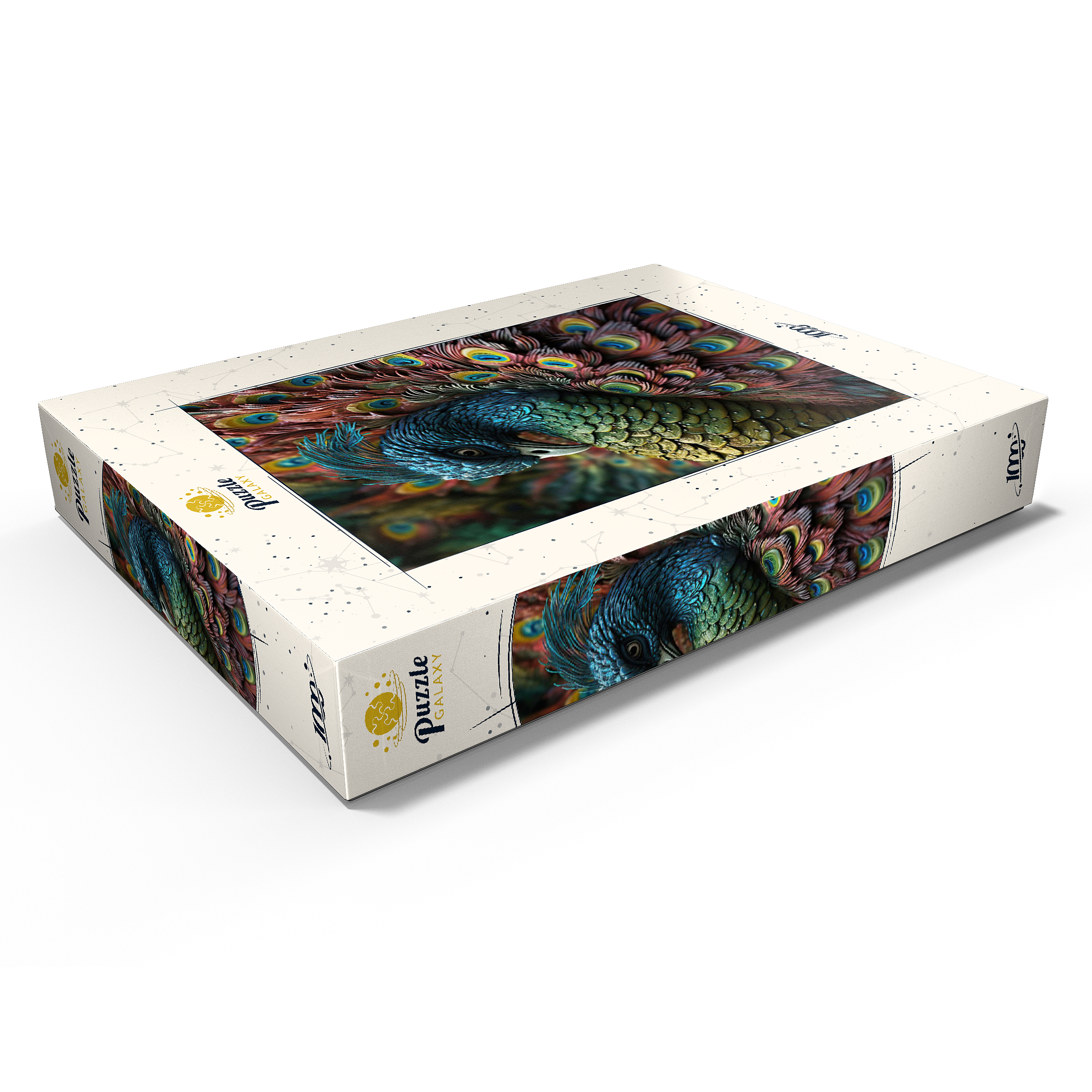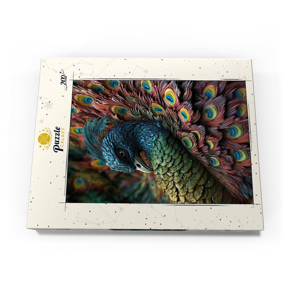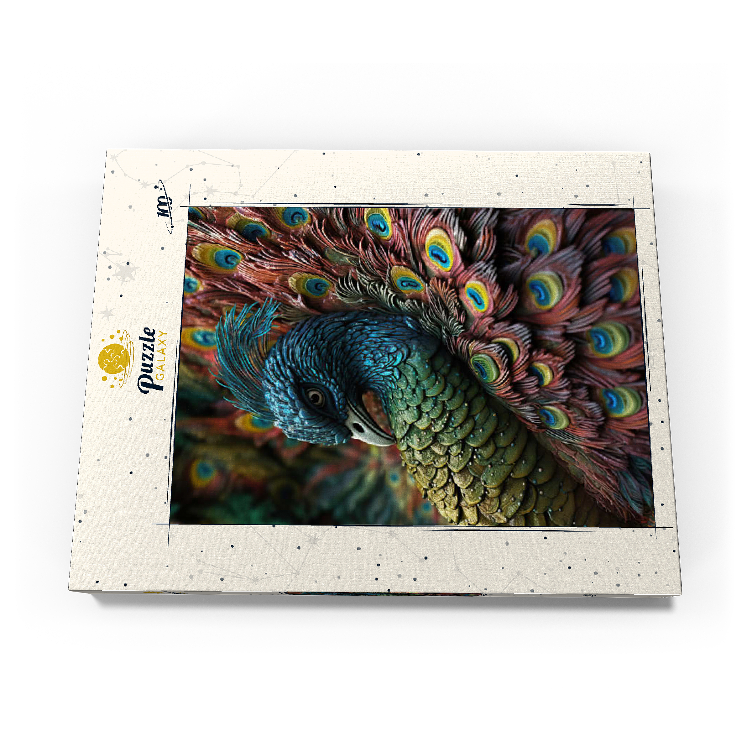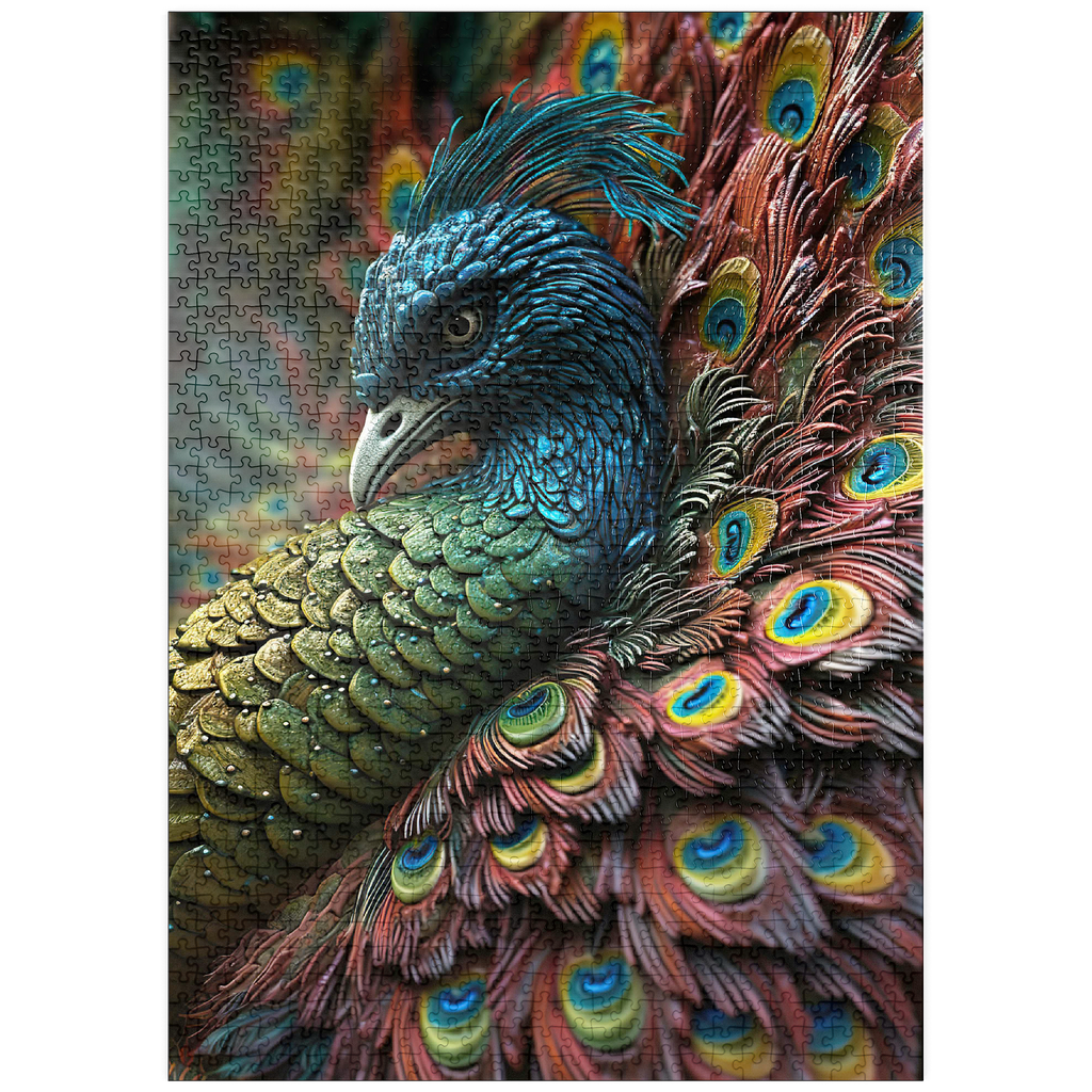 Dieses atemberaubende Kunstwerk zeigt einen majestätischen Pfau mit komplizierten, hochdetaillierten Federn, die in satten Farbtönen von tiefem Blau, Smaragdgrün und Bronzegold schimmern. Jede Feder ist sorgfältig gearbeitet und mit auffallend schillernden Augenflecken verziert, die die königliche und mystische Aura des Vogels noch verstärken. Der durchdringende Blick und die elegante Haltung des Pfaus strahlen Kraft und Anmut aus und machen dieses Stück zu einer atemberaubenden Verschmelzung von Fantasie und Realismus. Dieses Meisterwerk ist perfekt für Liebhaber exotischer Wildtiere, luxuriöser Texturen und komplizierter digitaler Kunst und fängt die Schönheit und Erhabenheit des extravagantesten Vogels der Natur ein.