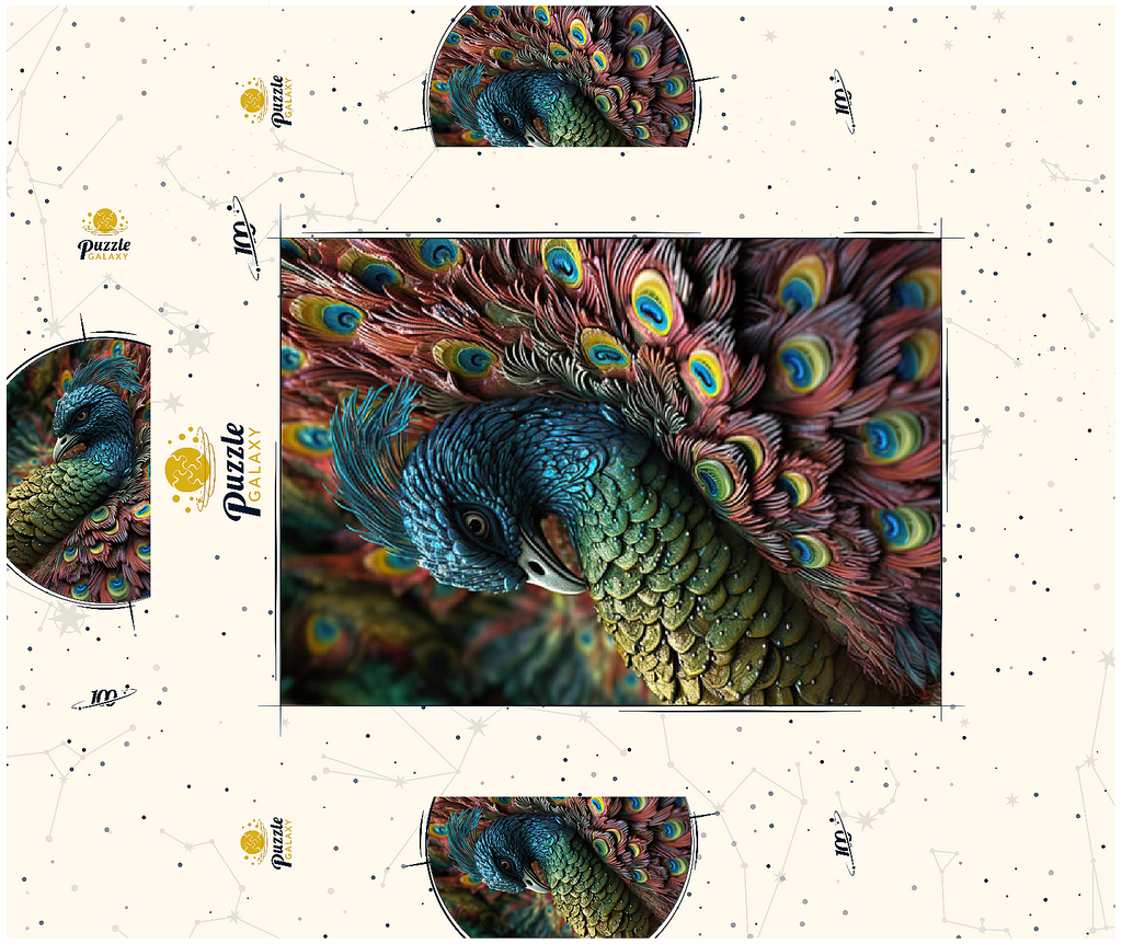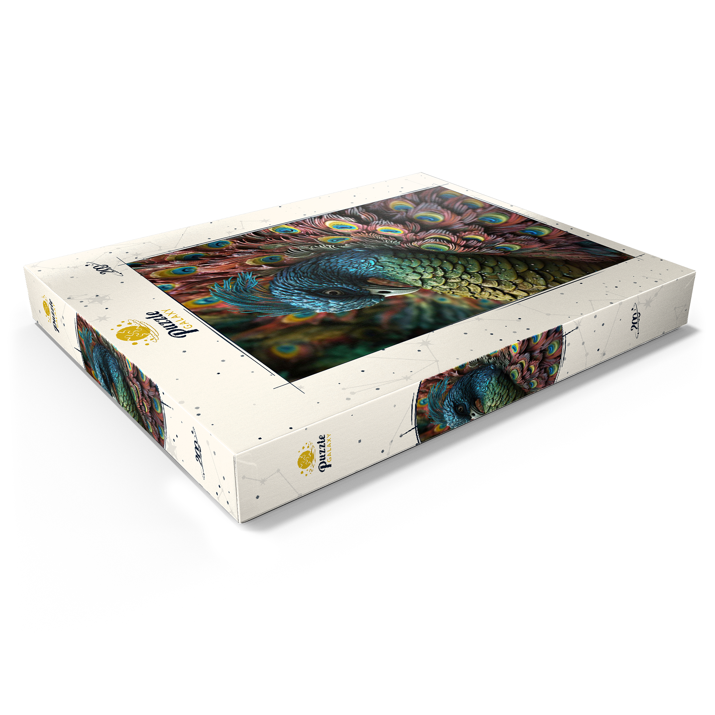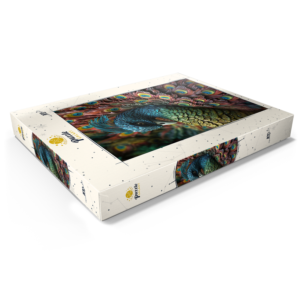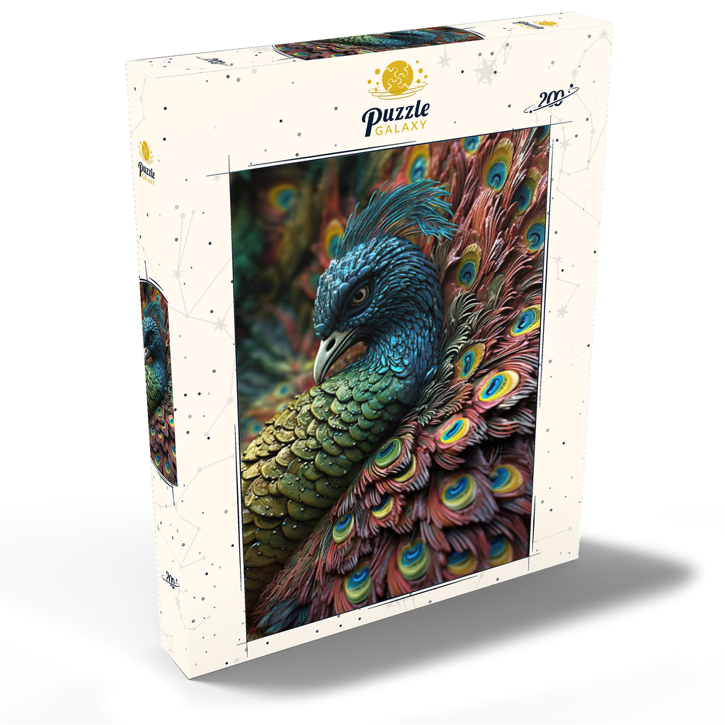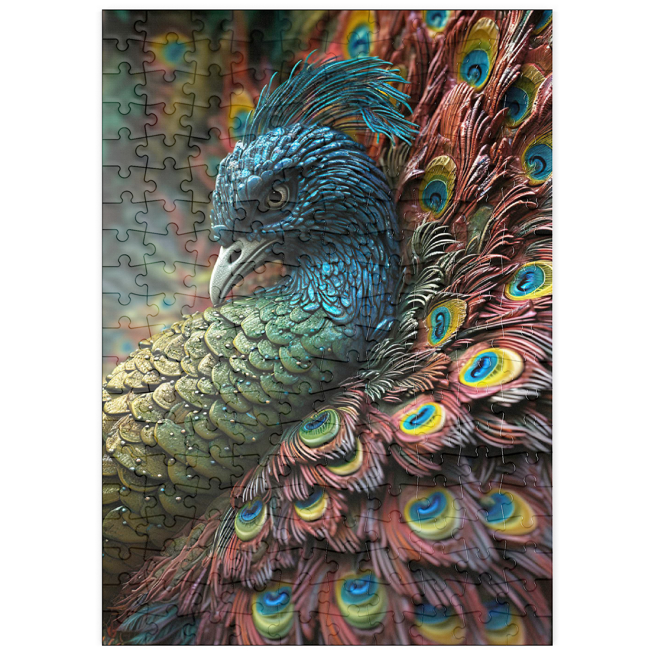Dieses atemberaubende Kunstwerk zeigt einen majestätischen Pfau mit komplizierten, hochdetaillierten Federn, die in satten Farbtönen von tiefem Blau, Smaragdgrün und Bronzegold schimmern. Jede Feder ist sorgfältig gearbeitet und mit auffallend schillernden Augenflecken verziert, die die königliche und mystische Aura des Vogels noch verstärken. Der durchdringende Blick und die elegante Haltung des Pfaus strahlen Kraft und Anmut aus und machen dieses Stück zu einer atemberaubenden Verschmelzung von Fantasie und Realismus. Dieses Meisterwerk ist perfekt für Liebhaber exotischer Wildtiere, luxuriöser Texturen und komplizierter digitaler Kunst und fängt die Schönheit und Erhabenheit des extravagantesten Vogels der Natur ein.