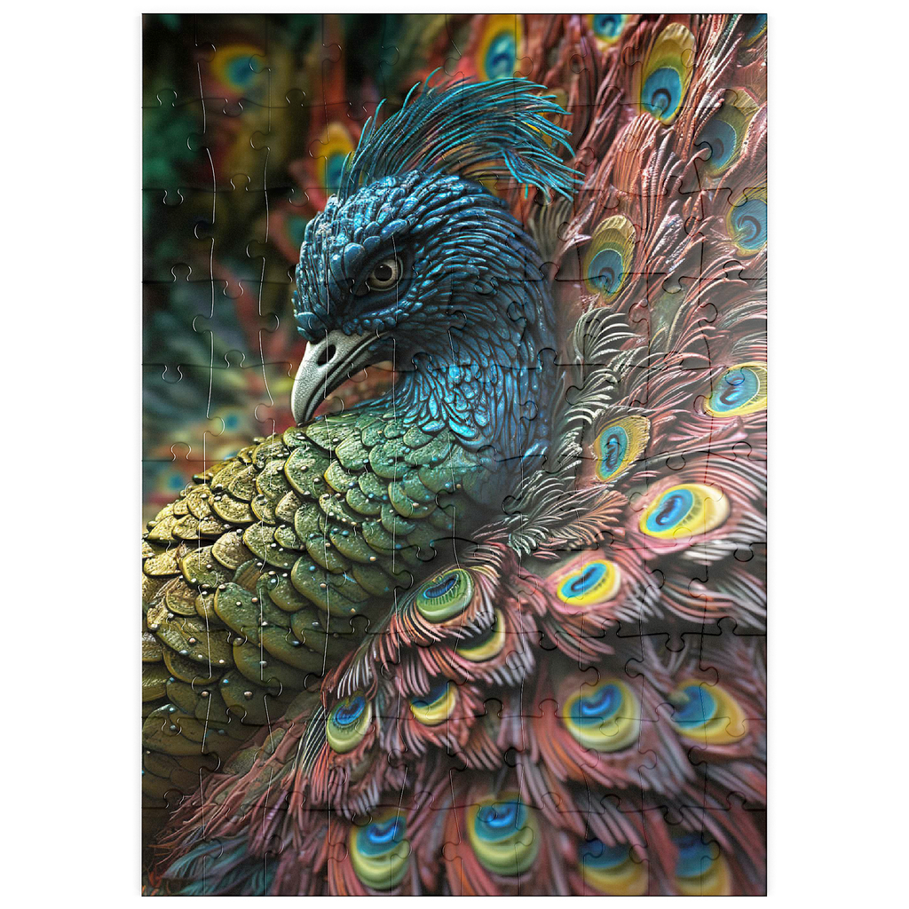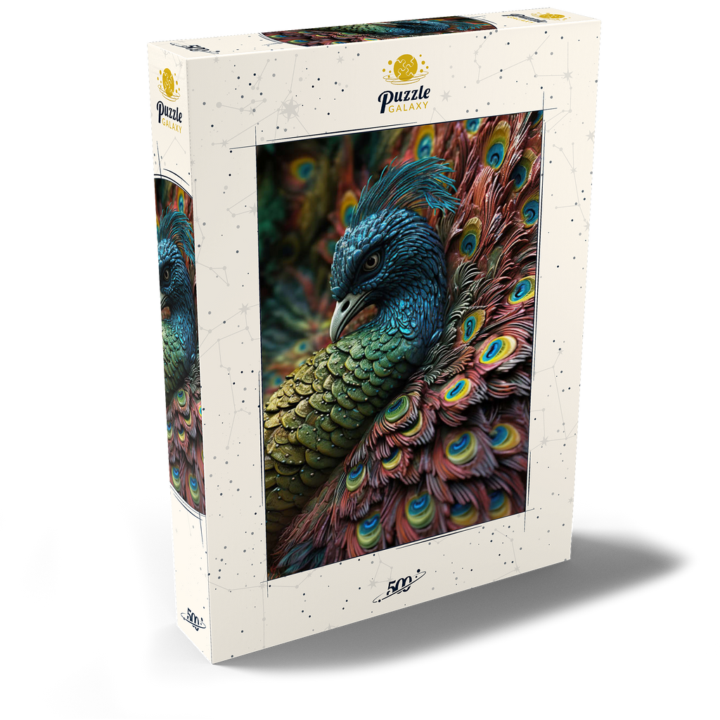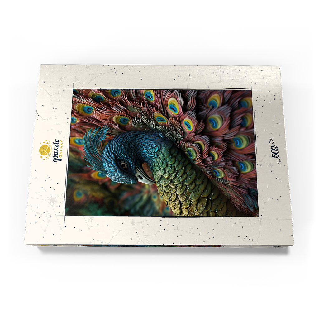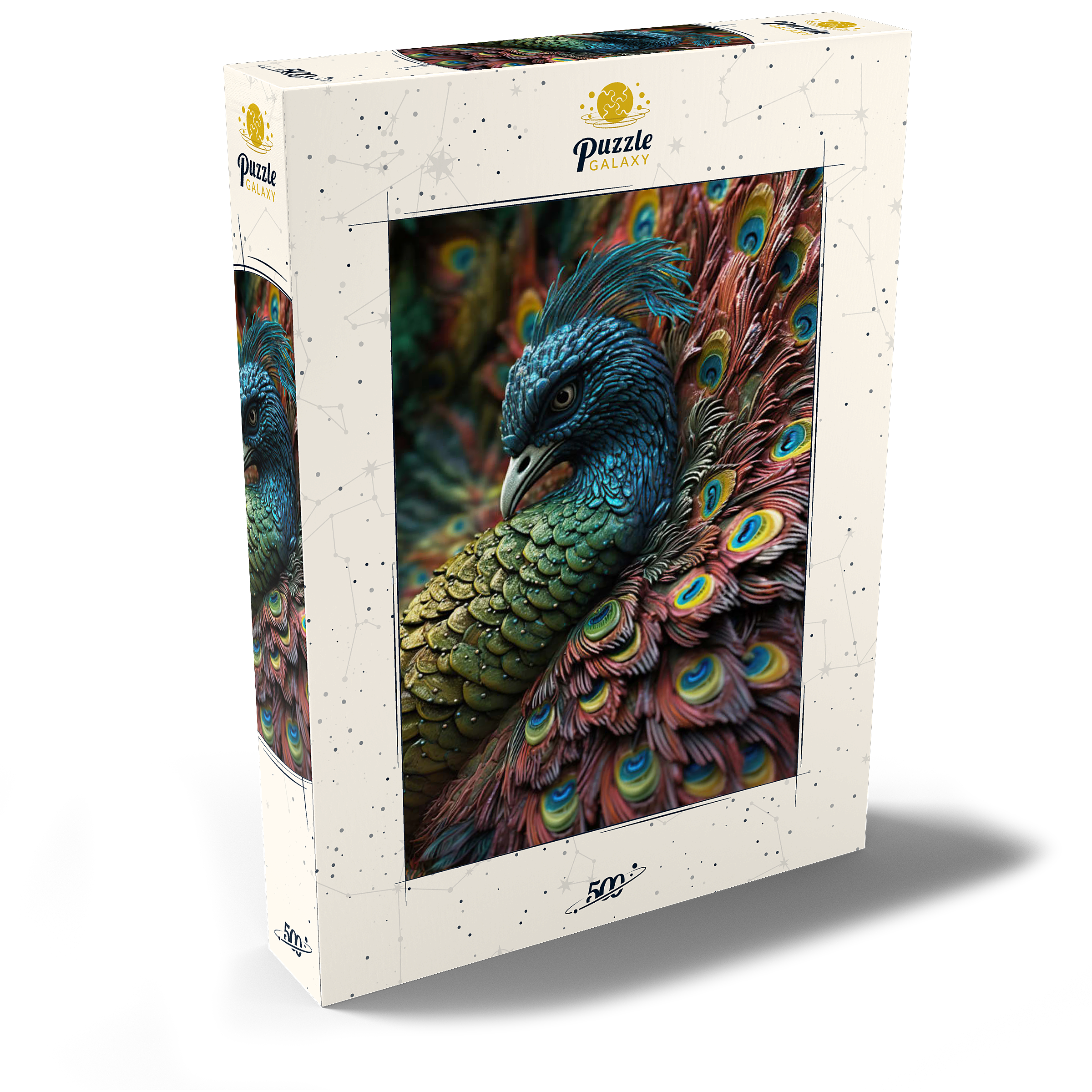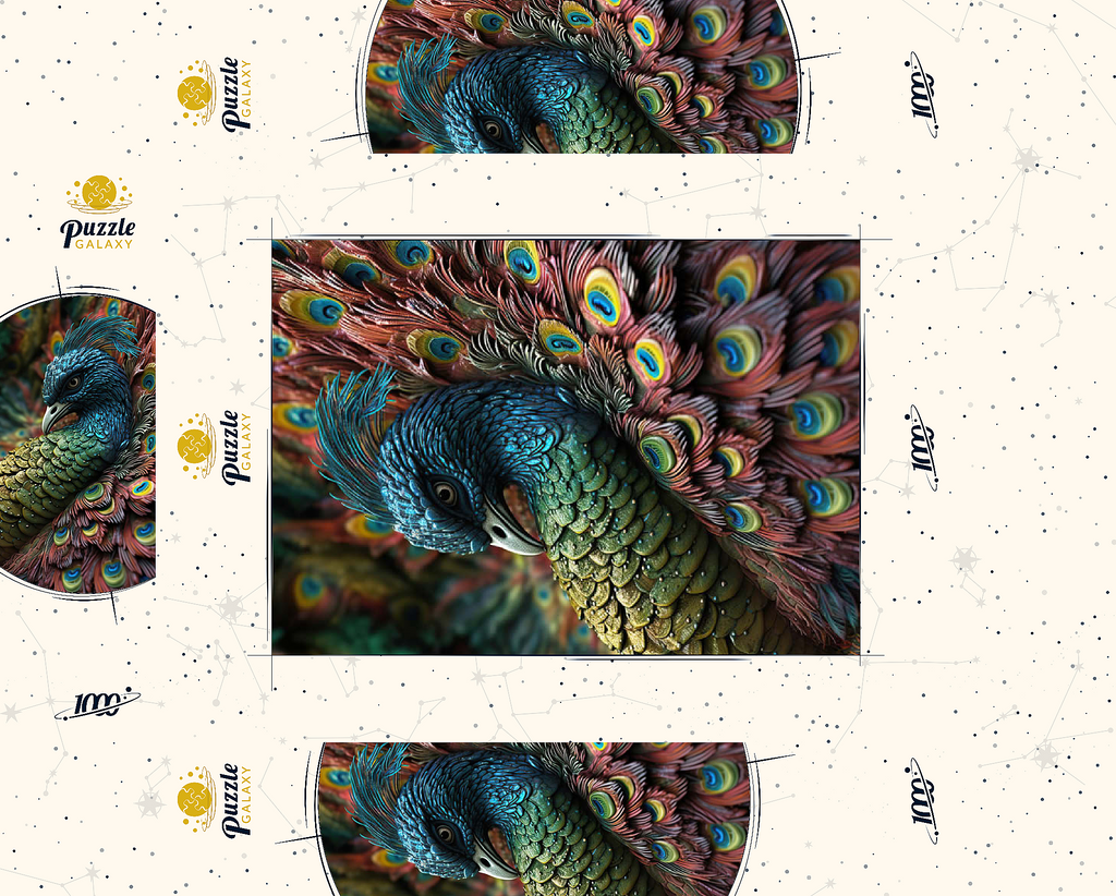Dieses atemberaubende Kunstwerk zeigt einen majestätischen Pfau mit komplizierten, hochdetaillierten Federn, die in satten Farbtönen von tiefem Blau, Smaragdgrün und Bronzegold schimmern. Jede Feder ist sorgfältig gearbeitet und mit auffallend schillernden Augenflecken verziert, die die königliche und mystische Aura des Vogels noch verstärken. Der durchdringende Blick und die elegante Haltung des Pfaus strahlen Kraft und Anmut aus und machen dieses Stück zu einer atemberaubenden Verschmelzung von Fantasie und Realismus. Dieses Meisterwerk ist perfekt für Liebhaber exotischer Wildtiere, luxuriöser Texturen und komplizierter digitaler Kunst und fängt die Schönheit und Erhabenheit des extravagantesten Vogels der Natur ein.