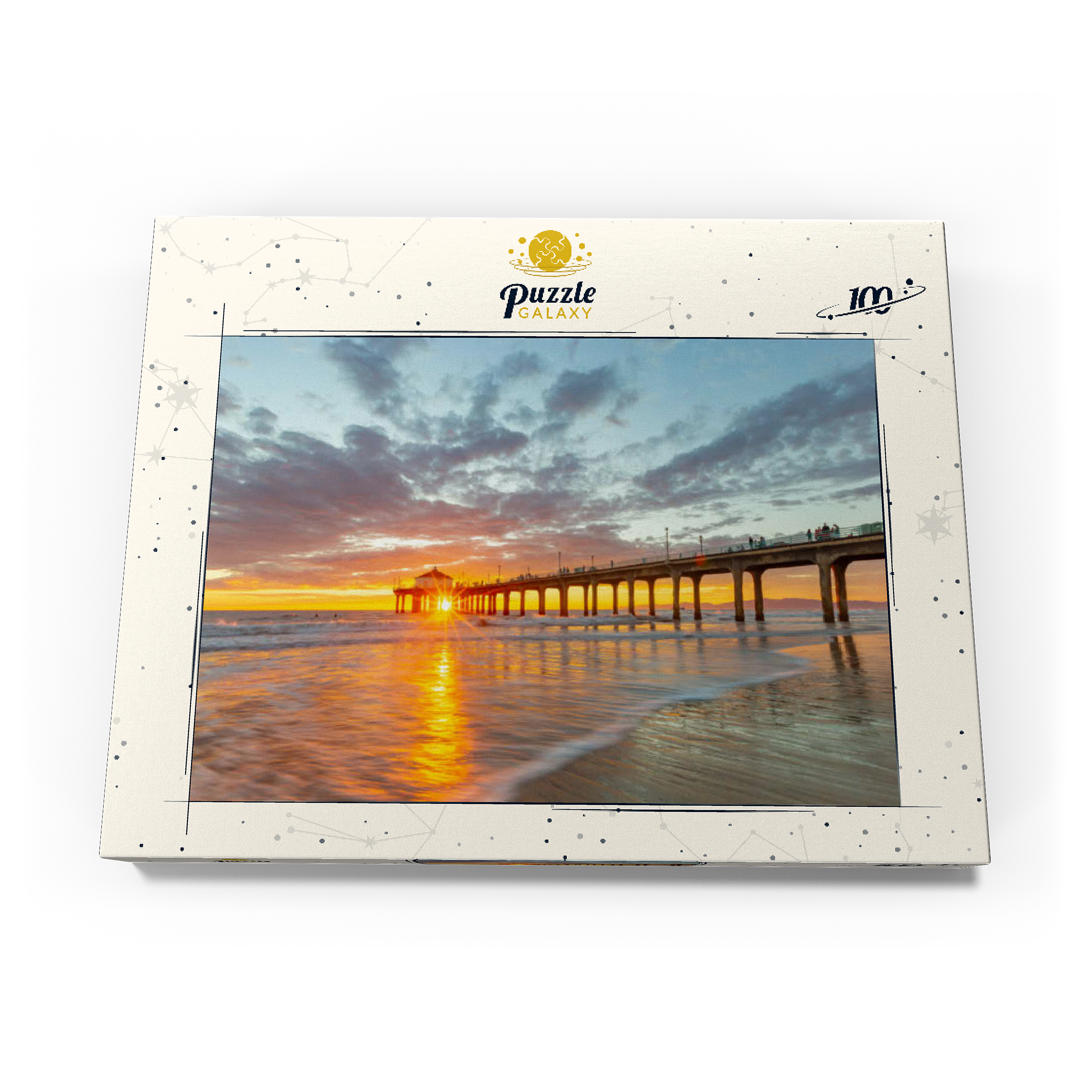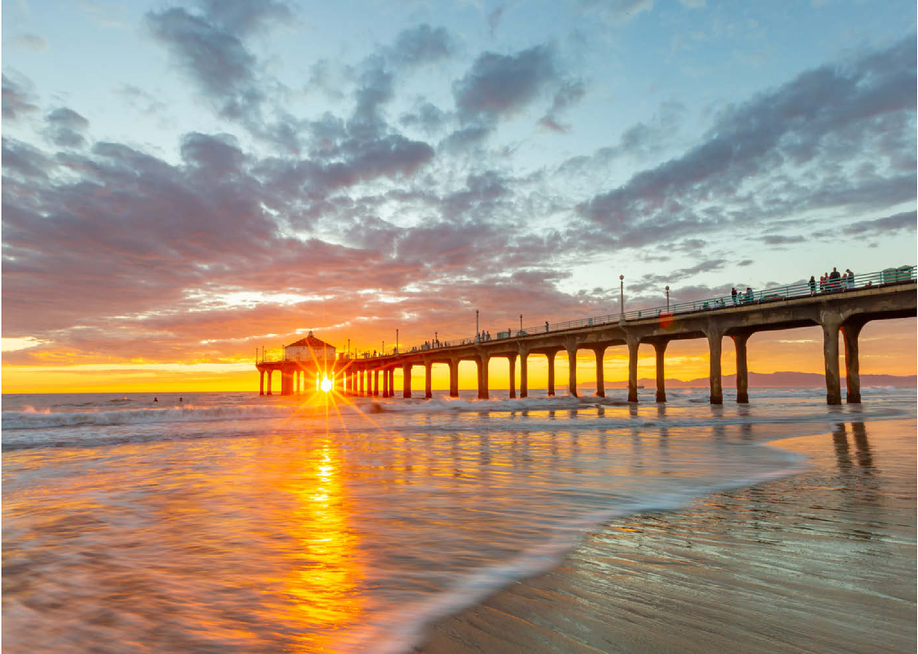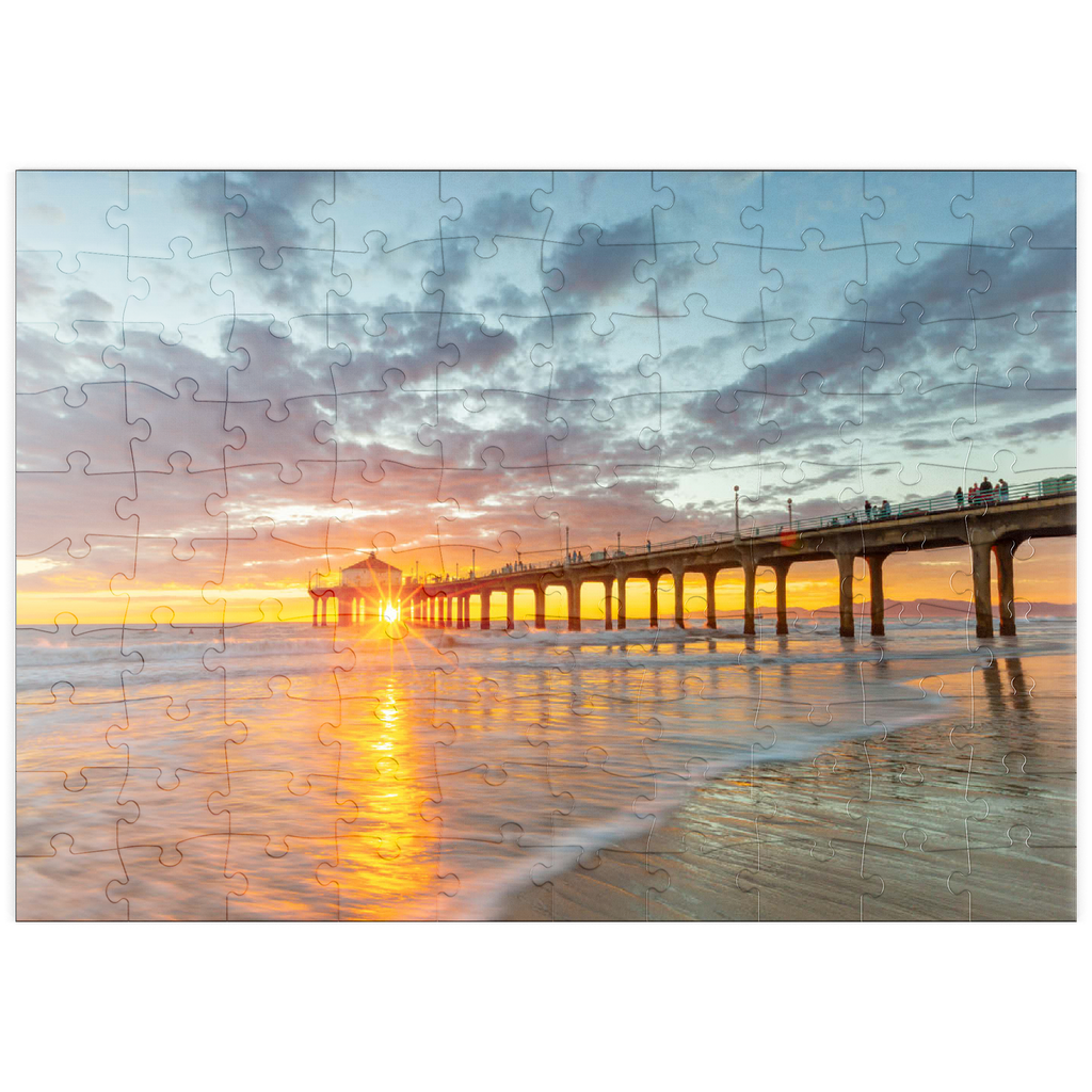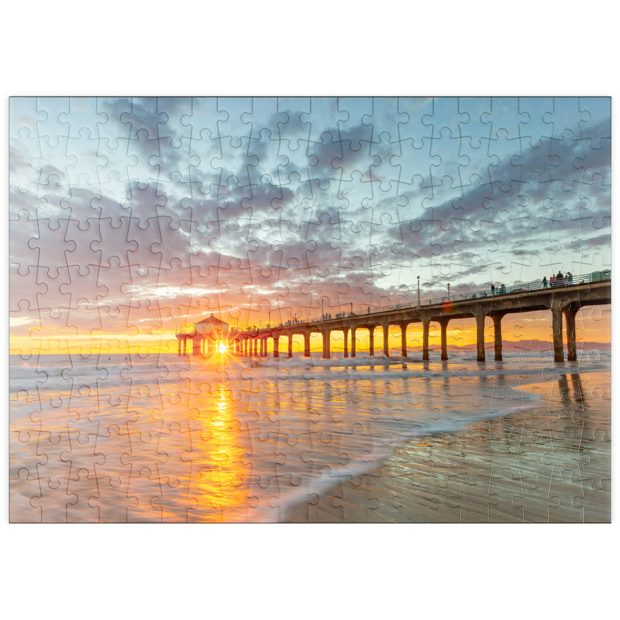 Dieses faszinierende Bild zeigt den legendären Manhattan Beach Pier in Südkalifornien bei strahlendem Sonnenuntergang. Die Sonne steht perfekt über dem Pier und taucht die Bögen der Konstruktion in ein goldenes Licht, das sich in einem schillernden Sternenreflex auf dem nassen Sand und den Wellen widerspiegelt. Der Pazifik funkelt in warmen Orange- und Goldtönen und verschmilzt nahtlos mit den Pastelltönen des Abendhimmels. Die Silhouetten der Menschen, die entlang des Piers spazieren, verleihen dieser Küstenlandschaft Lebendigkeit und Perspektive. Manhattan Beach liegt im Los Angeles County und ist ein beliebtes Ziel für Strandbesucher, Surfer und Fotografen. Der berühmte Pier, der 1920 fertiggestellt wurde, ist ein historisches Wahrzeichen und ein erstklassiger Ort, um den Sonnenuntergang zu beobachten. Dieses Bild unterstreicht auf wunderschöne Weise den entspannten Charme und die natürliche Schönheit der kalifornischen Küste und eignet sich daher hervorragend als Bildmotiv für Stranddekorationen, Reiseinspirationen oder das Branding eines Küstenlifestyles.