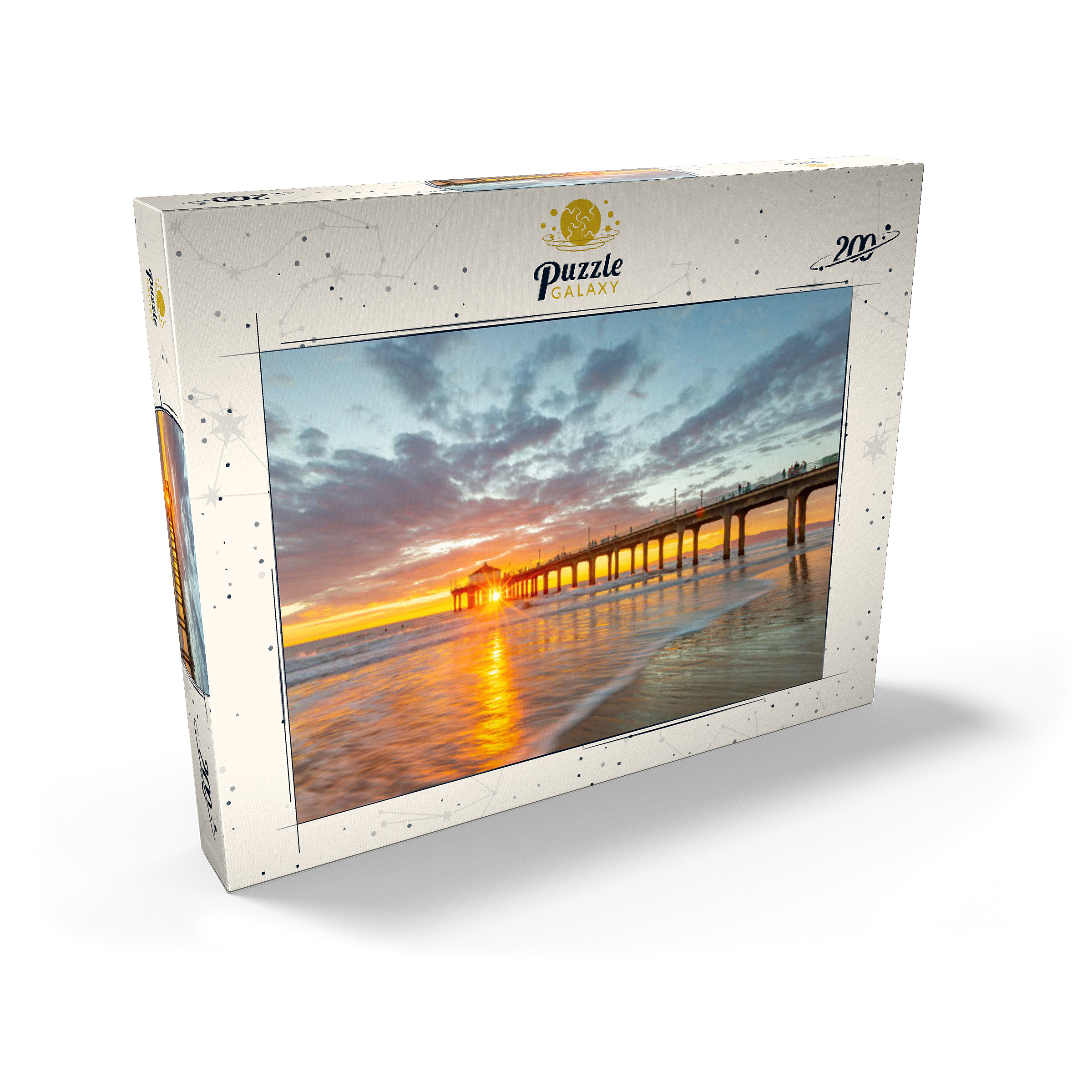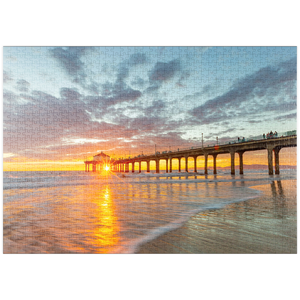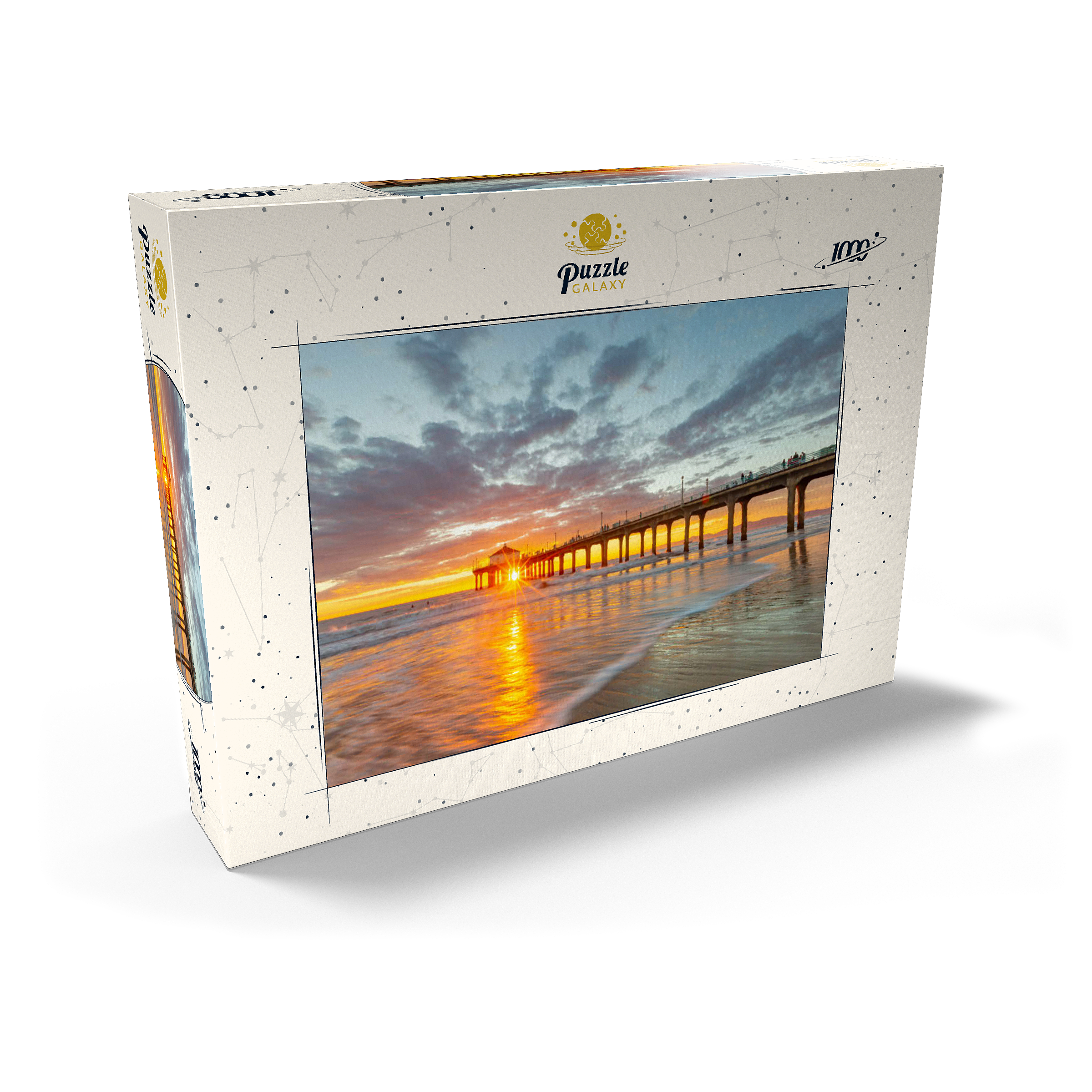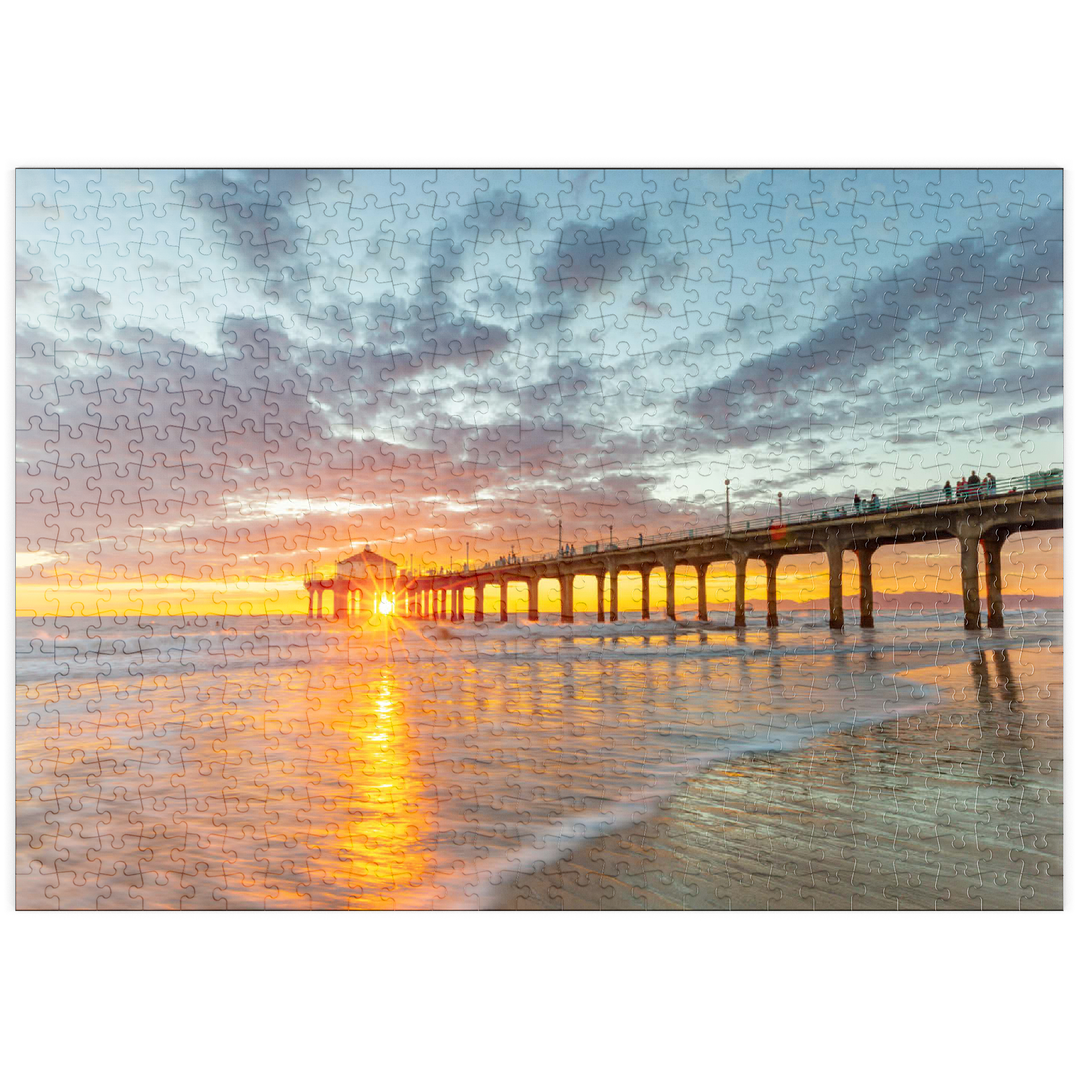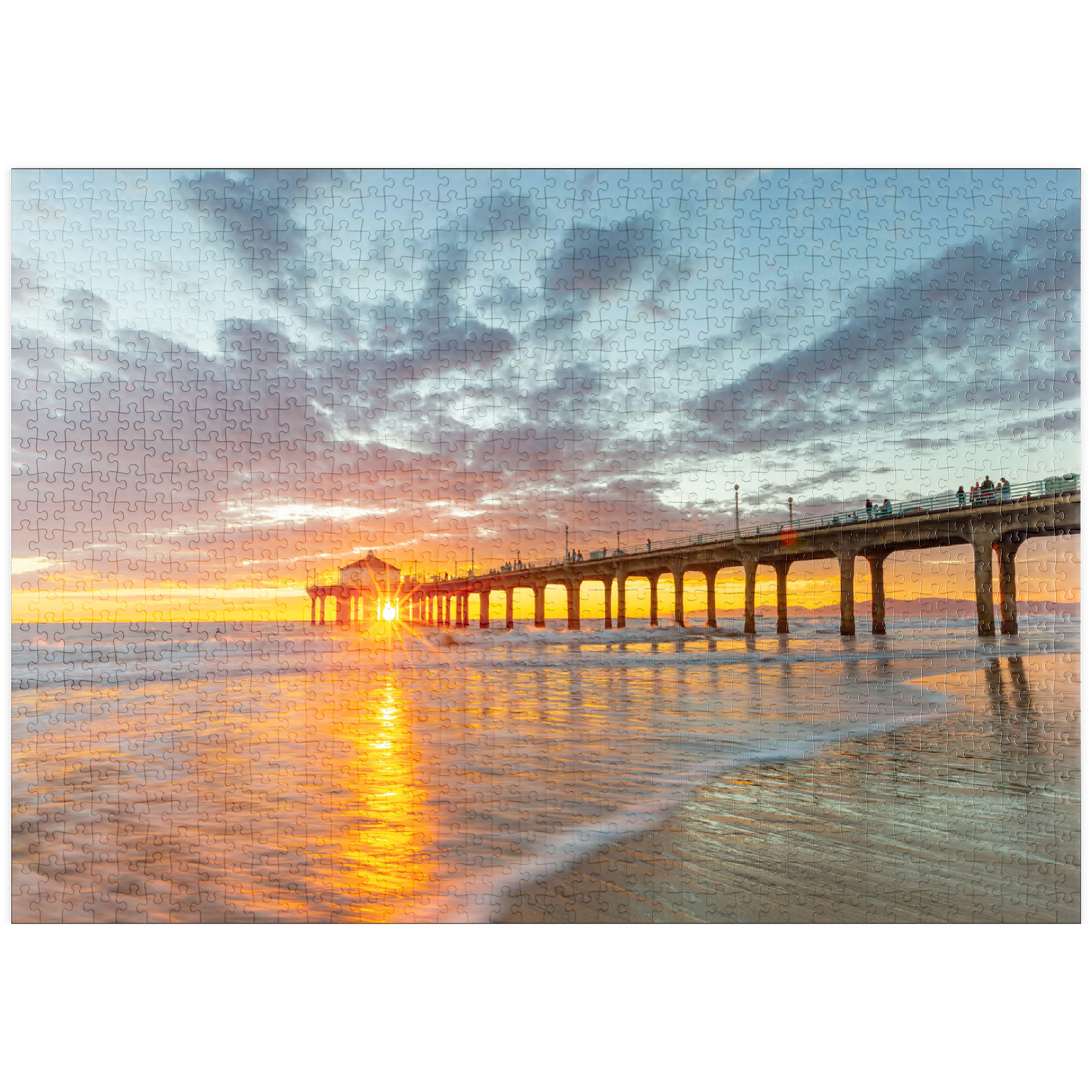 Dieses faszinierende Bild zeigt den legendären Manhattan Beach Pier in Südkalifornien bei strahlendem Sonnenuntergang. Die Sonne steht perfekt über dem Pier und taucht die Bögen der Konstruktion in ein goldenes Licht, das sich in einem schillernden Sternenreflex auf dem nassen Sand und den Wellen widerspiegelt. Der Pazifik funkelt in warmen Orange- und Goldtönen und verschmilzt nahtlos mit den Pastelltönen des Abendhimmels. Die Silhouetten der Menschen, die entlang des Piers spazieren, verleihen dieser Küstenlandschaft Lebendigkeit und Perspektive. Manhattan Beach liegt im Los Angeles County und ist ein beliebtes Ziel für Strandbesucher, Surfer und Fotografen. Der berühmte Pier, der 1920 fertiggestellt wurde, ist ein historisches Wahrzeichen und ein erstklassiger Ort, um den Sonnenuntergang zu beobachten. Dieses Bild unterstreicht auf wunderschöne Weise den entspannten Charme und die natürliche Schönheit der kalifornischen Küste und eignet sich daher hervorragend als Bildmotiv für Stranddekorationen, Reiseinspirationen oder das Branding eines Küstenlifestyles.