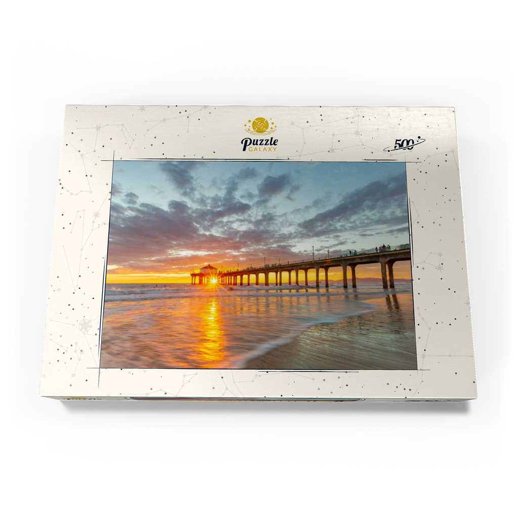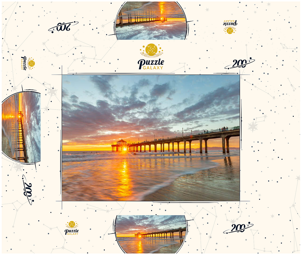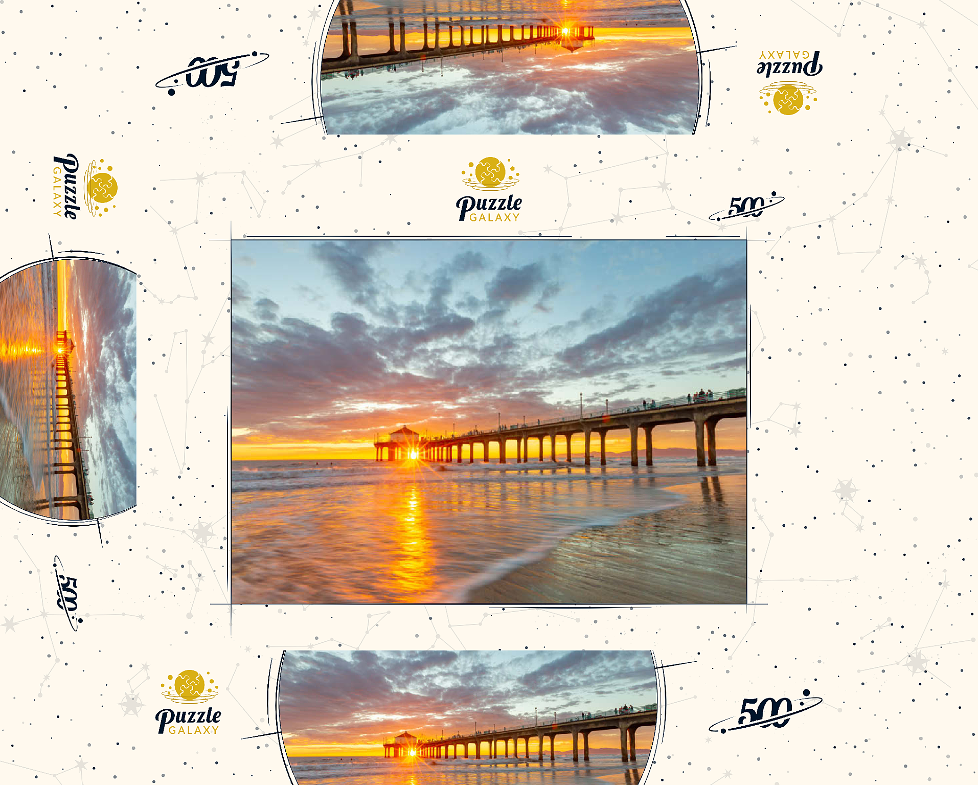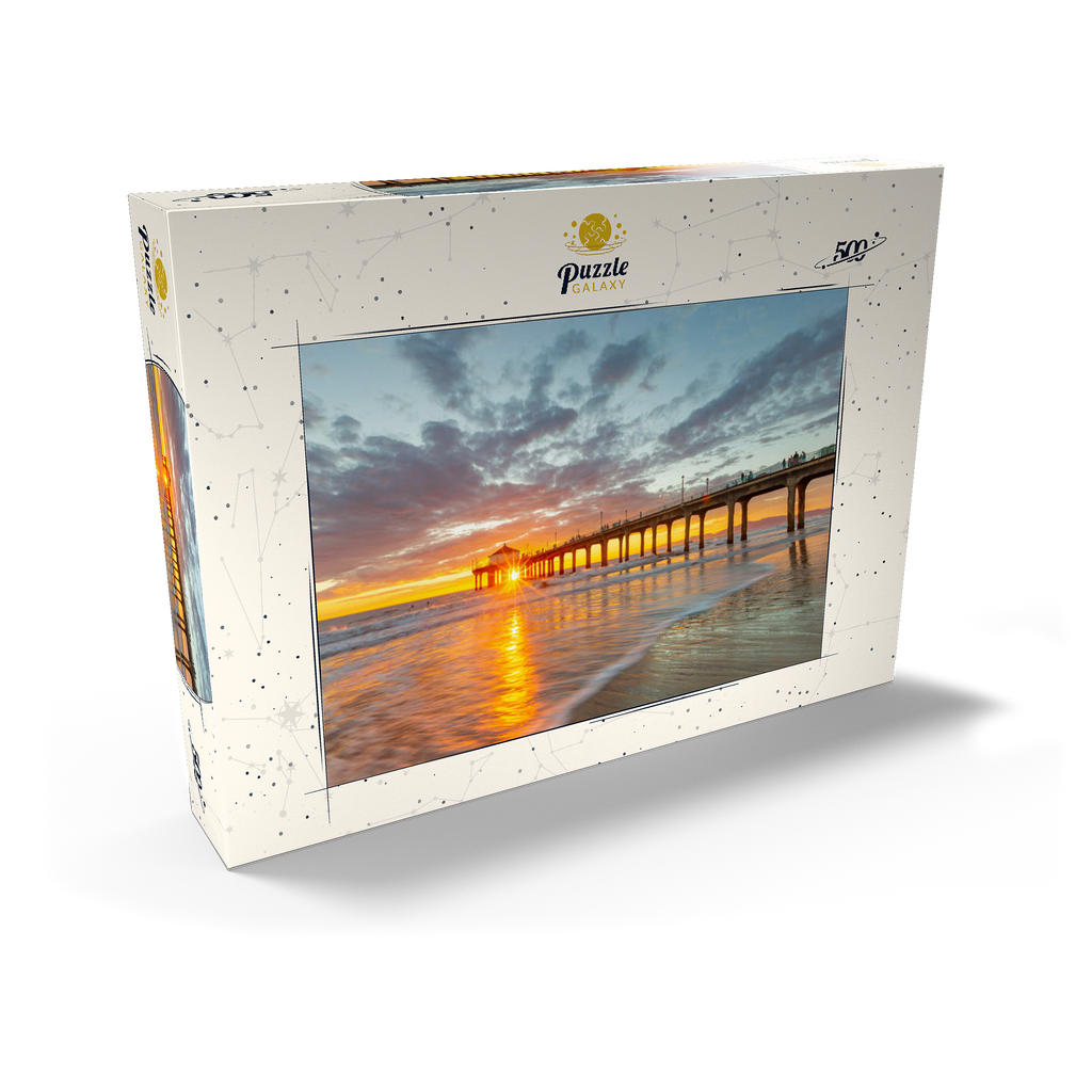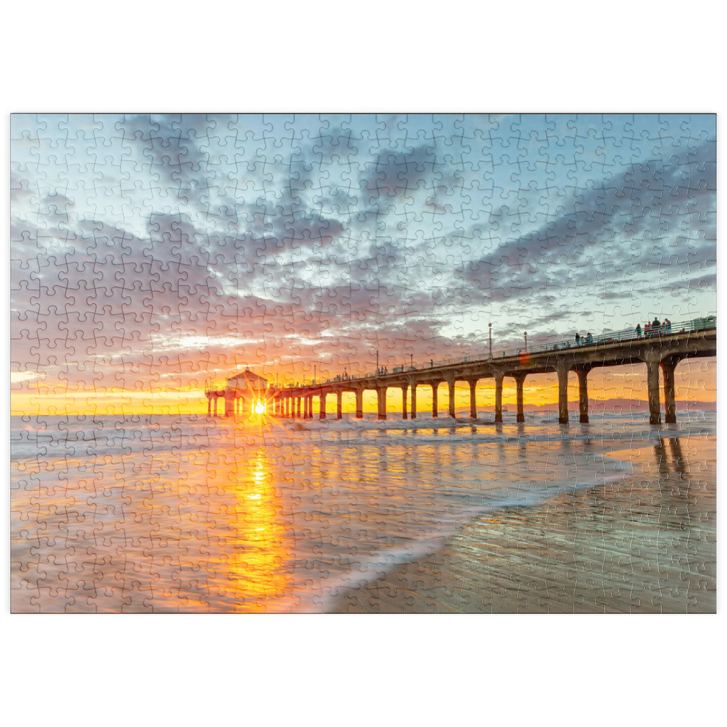 Dieses faszinierende Bild zeigt den legendären Manhattan Beach Pier in Südkalifornien bei strahlendem Sonnenuntergang. Die Sonne steht perfekt über dem Pier und taucht die Bögen der Konstruktion in ein goldenes Licht, das sich in einem schillernden Sternenreflex auf dem nassen Sand und den Wellen widerspiegelt. Der Pazifik funkelt in warmen Orange- und Goldtönen und verschmilzt nahtlos mit den Pastelltönen des Abendhimmels. Die Silhouetten der Menschen, die entlang des Piers spazieren, verleihen dieser Küstenlandschaft Lebendigkeit und Perspektive. Manhattan Beach liegt im Los Angeles County und ist ein beliebtes Ziel für Strandbesucher, Surfer und Fotografen. Der berühmte Pier, der 1920 fertiggestellt wurde, ist ein historisches Wahrzeichen und ein erstklassiger Ort, um den Sonnenuntergang zu beobachten. Dieses Bild unterstreicht auf wunderschöne Weise den entspannten Charme und die natürliche Schönheit der kalifornischen Küste und eignet sich daher hervorragend als Bildmotiv für Stranddekorationen, Reiseinspirationen oder das Branding eines Küstenlifestyles.