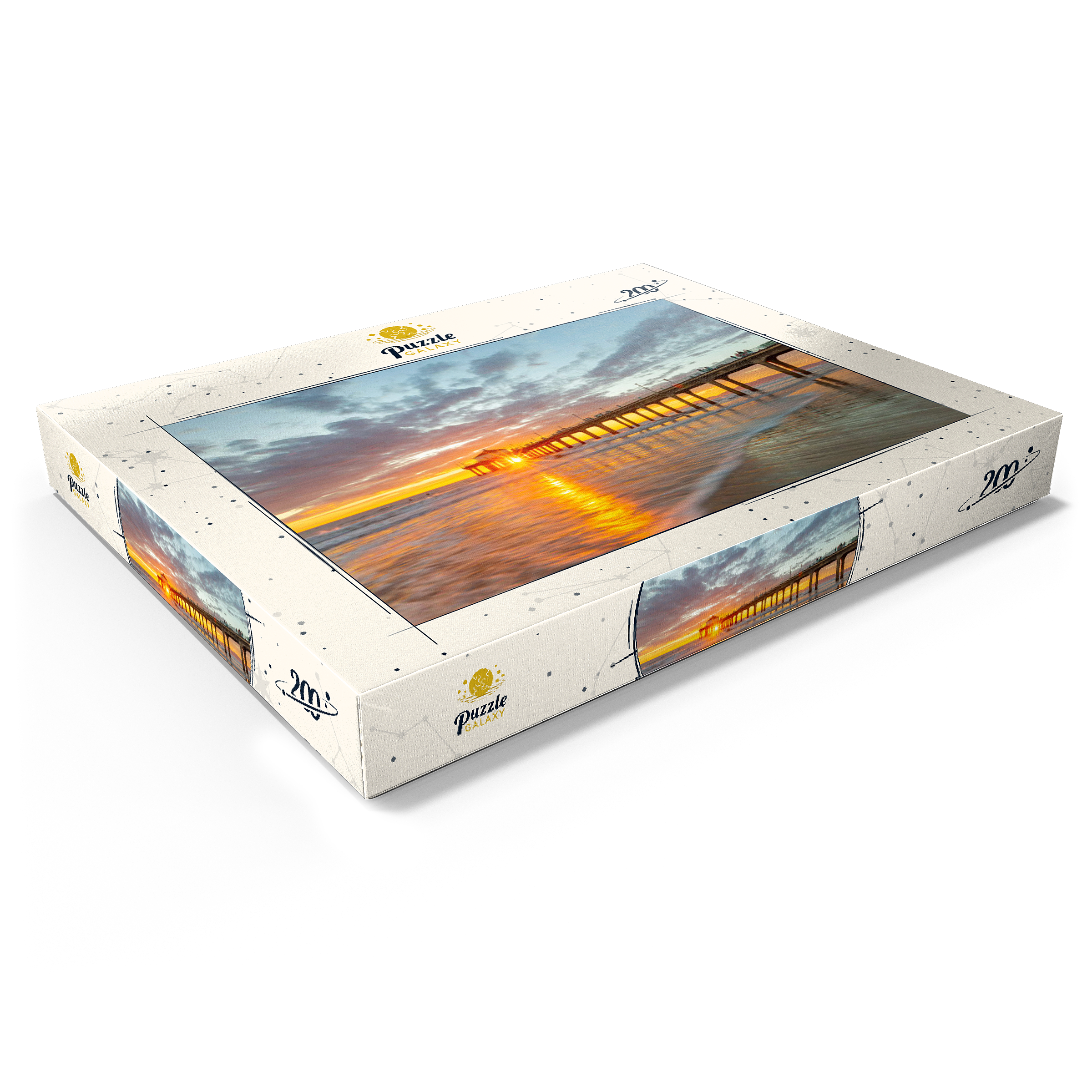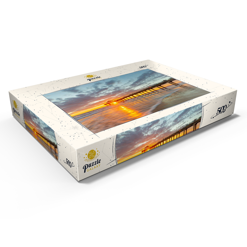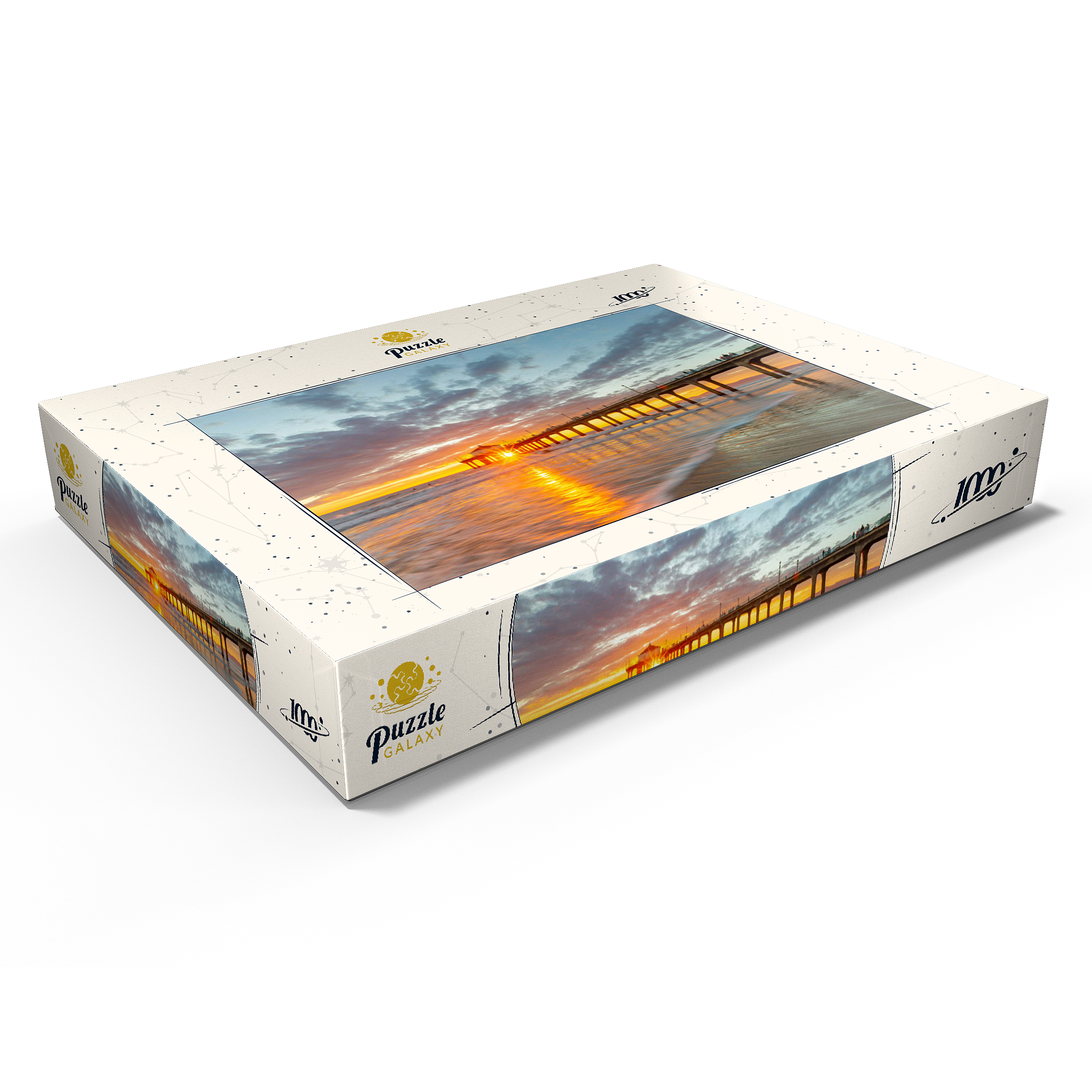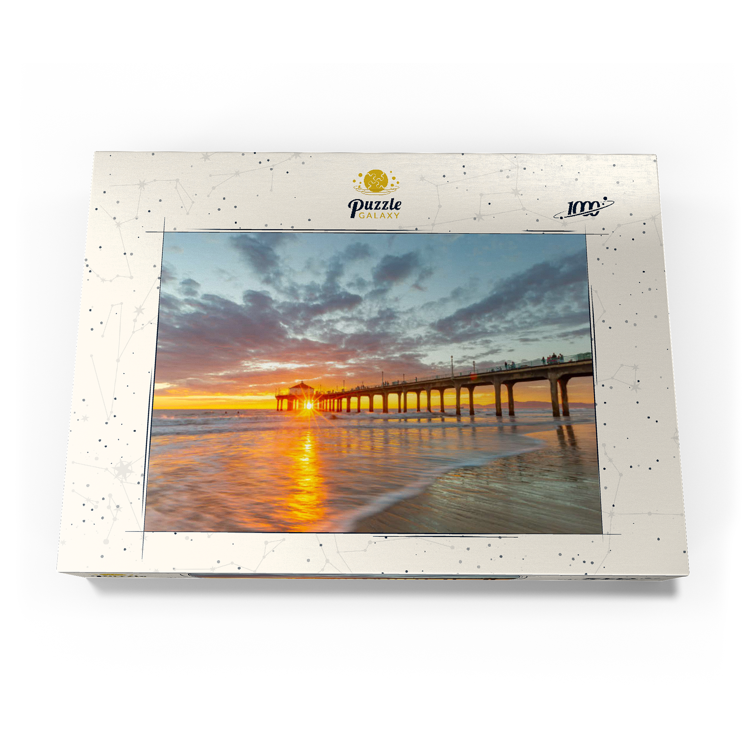 Dieses faszinierende Bild zeigt den legendären Manhattan Beach Pier in Südkalifornien bei strahlendem Sonnenuntergang. Die Sonne steht perfekt über dem Pier und taucht die Bögen der Konstruktion in ein goldenes Licht, das sich in einem schillernden Sternenreflex auf dem nassen Sand und den Wellen widerspiegelt. Der Pazifik funkelt in warmen Orange- und Goldtönen und verschmilzt nahtlos mit den Pastelltönen des Abendhimmels. Die Silhouetten der Menschen, die entlang des Piers spazieren, verleihen dieser Küstenlandschaft Lebendigkeit und Perspektive. Manhattan Beach liegt im Los Angeles County und ist ein beliebtes Ziel für Strandbesucher, Surfer und Fotografen. Der berühmte Pier, der 1920 fertiggestellt wurde, ist ein historisches Wahrzeichen und ein erstklassiger Ort, um den Sonnenuntergang zu beobachten. Dieses Bild unterstreicht auf wunderschöne Weise den entspannten Charme und die natürliche Schönheit der kalifornischen Küste und eignet sich daher hervorragend als Bildmotiv für Stranddekorationen, Reiseinspirationen oder das Branding eines Küstenlifestyles.