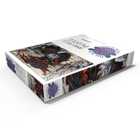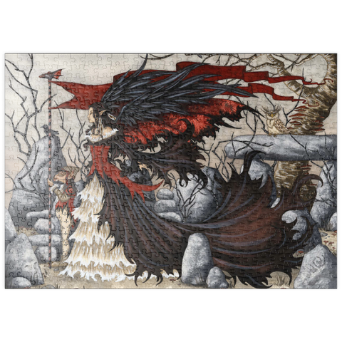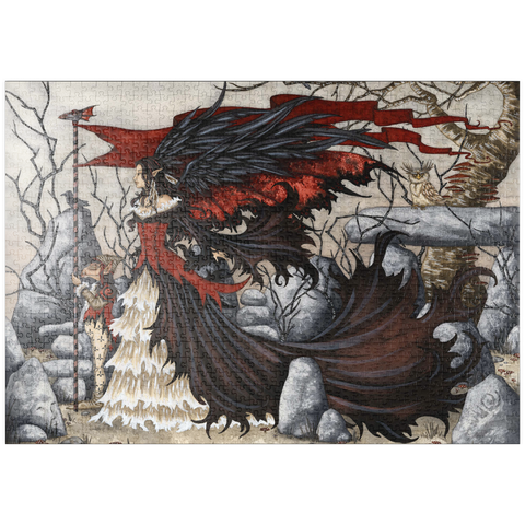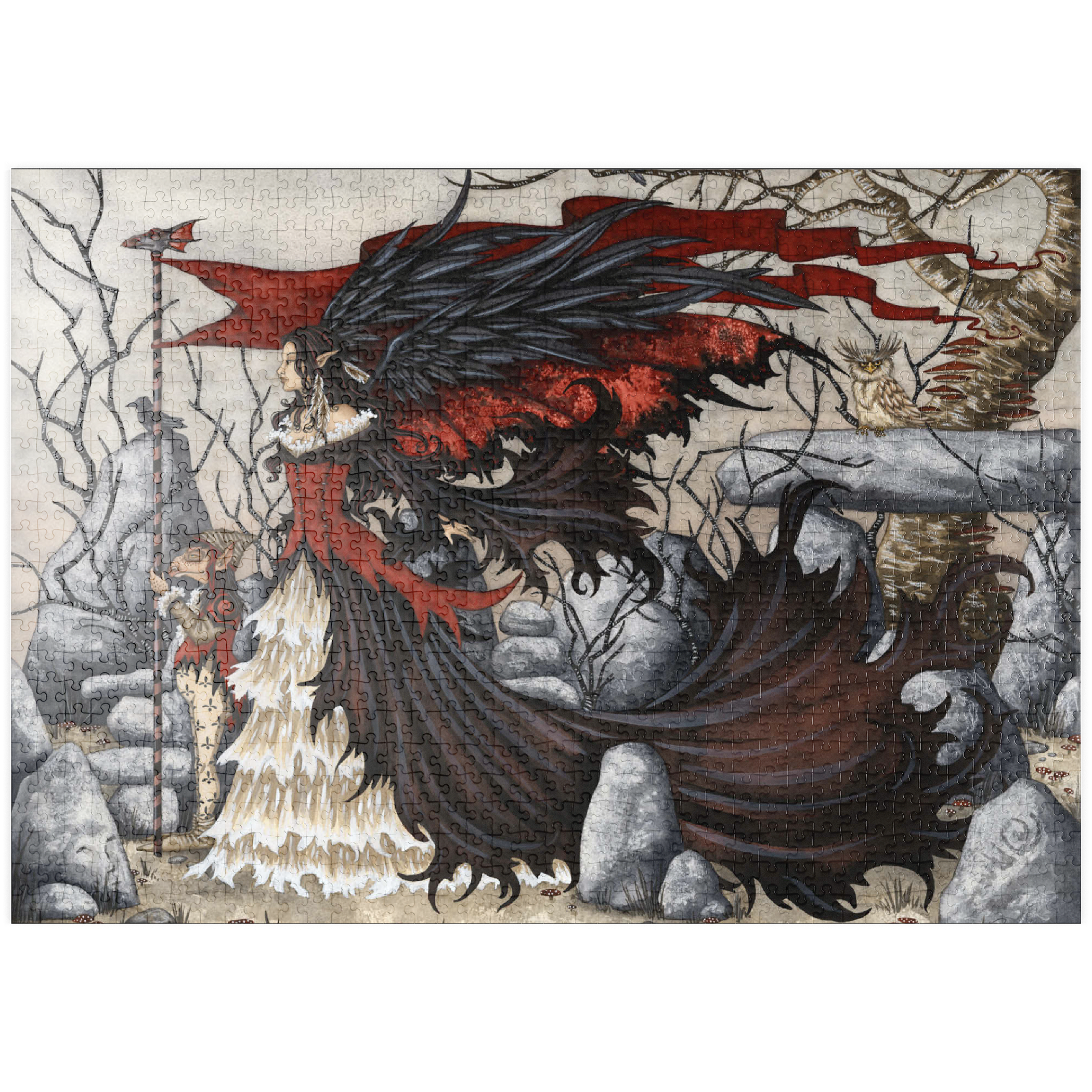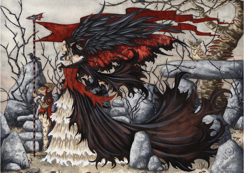Das beeindruckende Kunstwerk -Morgan Lefey- von Amy Brown zeigt Morgan Le Fey in einem dramatischen rot-schwarzen Kleid, ihre dunklen Flügel schwingen hinter ihr, während sie eine beherrschende Pose einnimmt. Begleitet wird sie von einem treuen Kobold, der einen Stab hält, und einer aufmerksamen Eule, die in der Nähe hockt. Die Szene strahlt Macht und Geheimnis in einem kahlen, verwunschenen Wald aus.