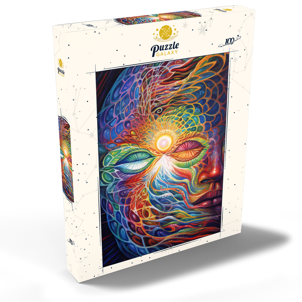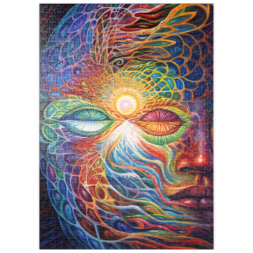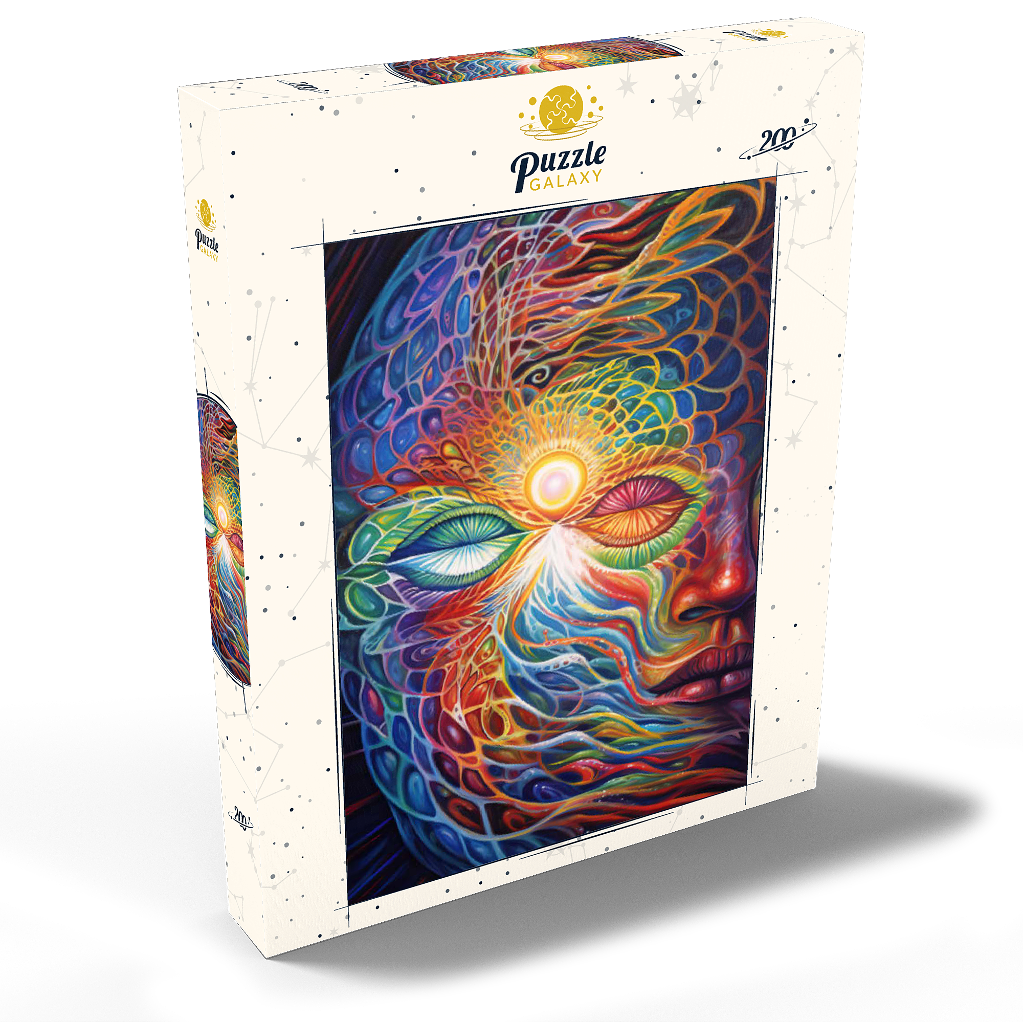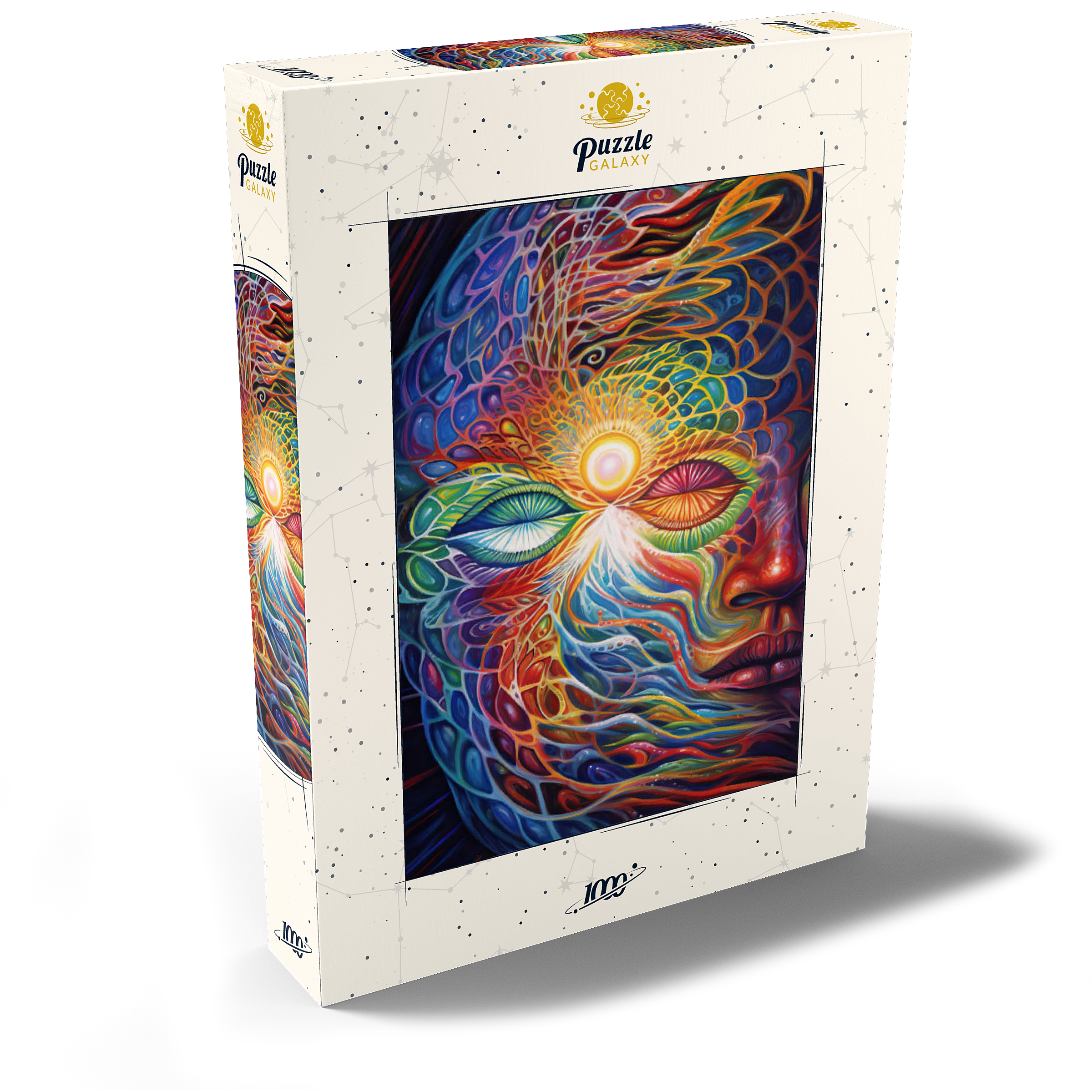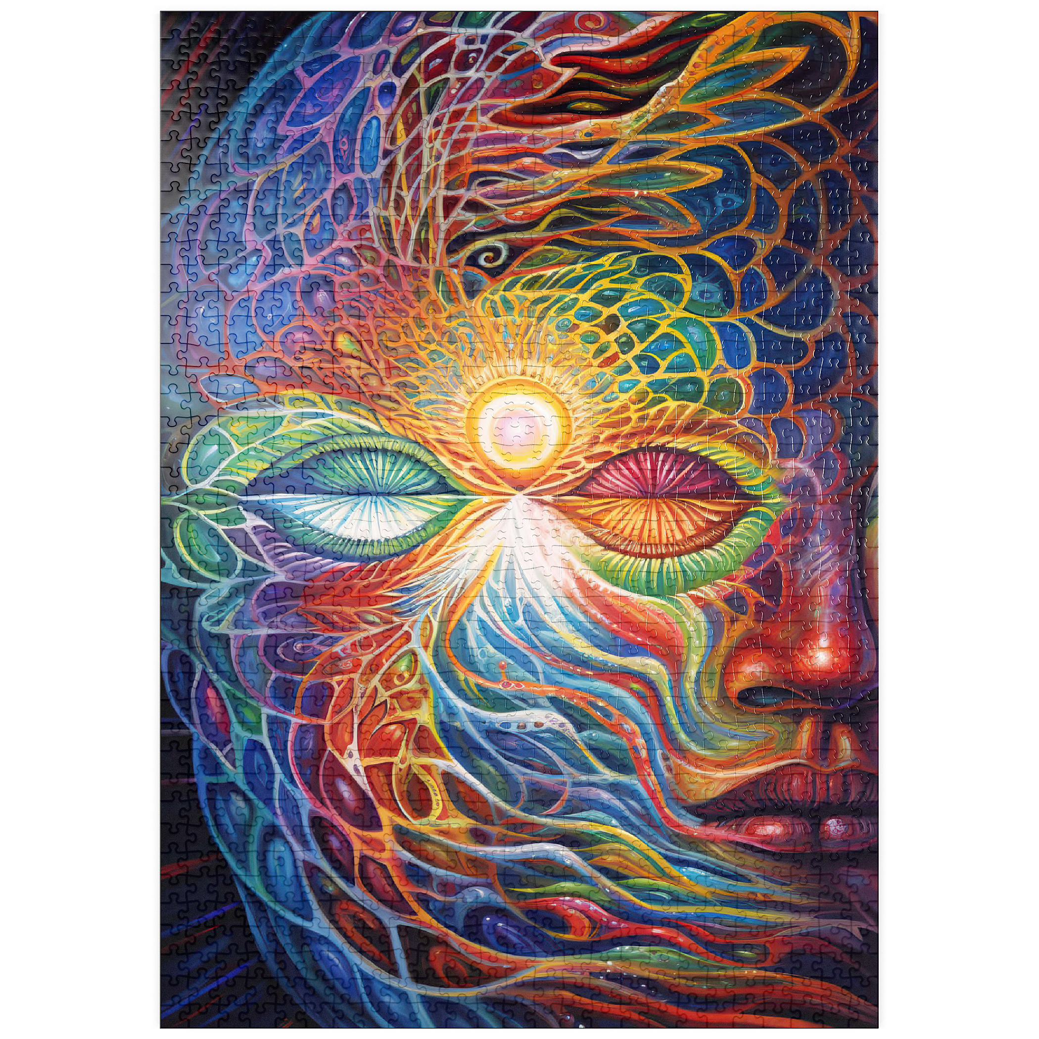 Dieses faszinierende Kunstwerk zeigt ein psychedelisches und visionäres Gesicht, das vor leuchtenden Farben und komplizierten Mustern nur so strotzt. Die Komposition verbindet surreale und abstrakte Elemente und schafft eine traumhafte Verschmelzung von organischen Strukturen und leuchtender Energie. Die ausdrucksstarken Augen, die aus einem Spektrum von Blau- und Grüntönen bestehen, bilden einen schönen Kontrast zu der feurigen, strahlenden Sonne in der Mitte, die Erleuchtung und kosmisches Bewusstsein symbolisiert. Fließende Linien und dynamische Rot-, Orange- und Blautöne gehen nahtlos ineinander über und rufen ein Gefühl von Bewegung und Transzendenz hervor. Dieses visuell atemberaubende Werk verkörpert Elemente des spirituellen Erwachens, des Mystizismus und der psychedelischen Ästhetik und ist damit eine fesselnde Ergänzung für jeden Raum, der sich zu visionärer Kunst und abstraktem Surrealismus hingezogen fühlt.
