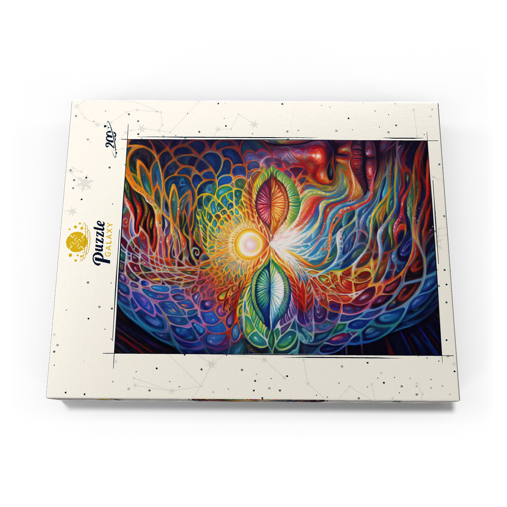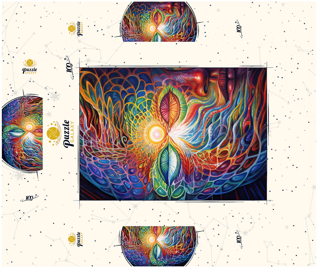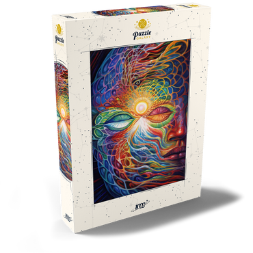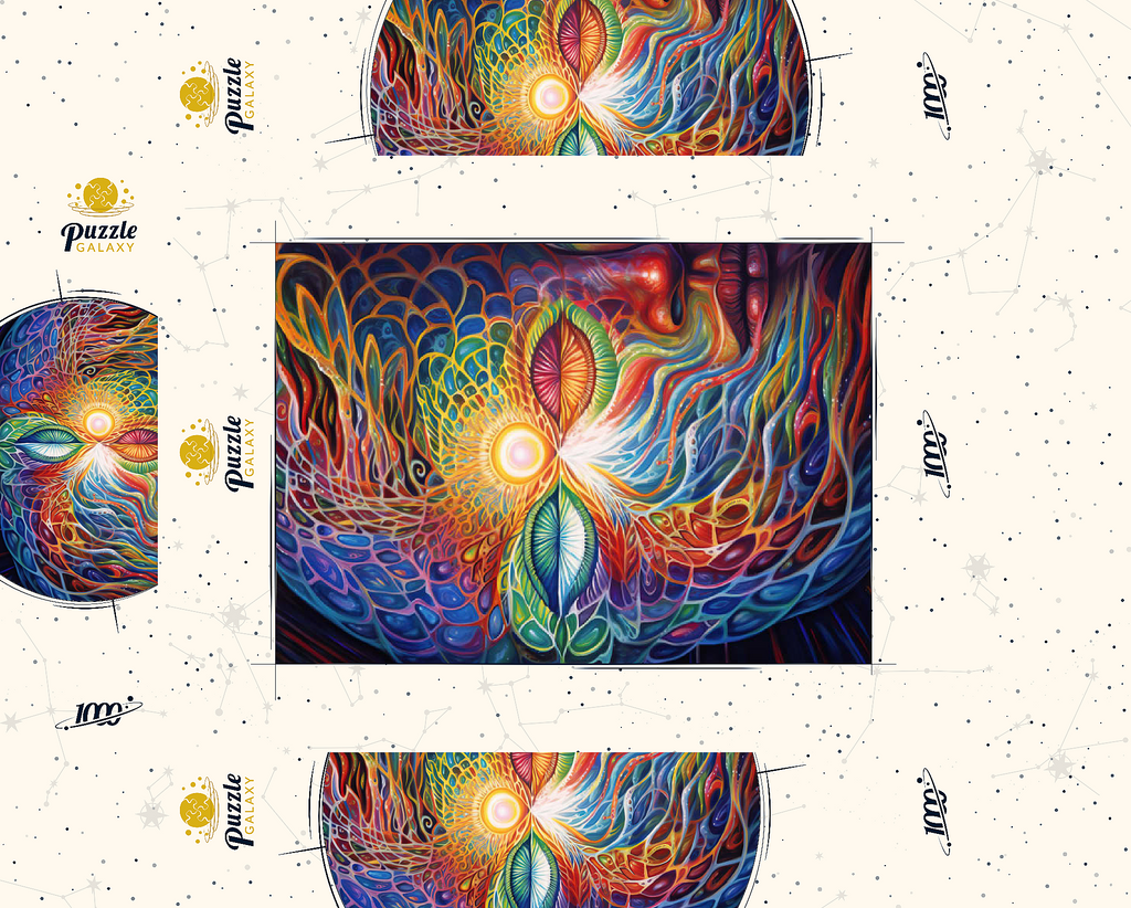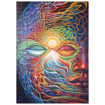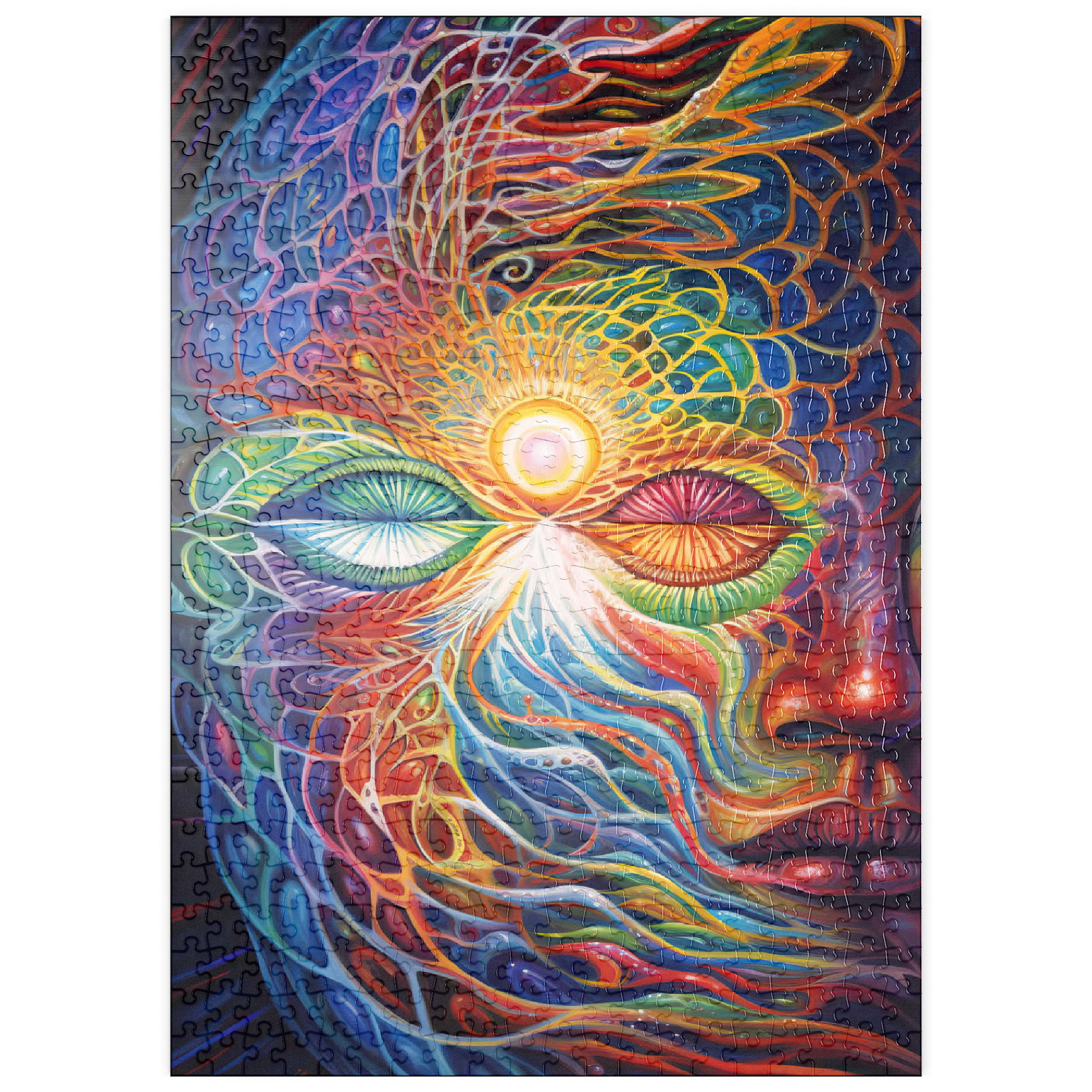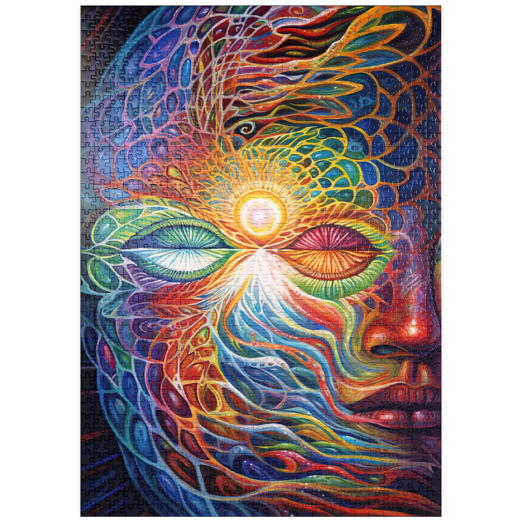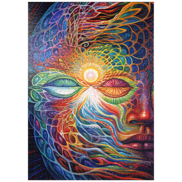 Dieses faszinierende Kunstwerk zeigt ein psychedelisches und visionäres Gesicht, das vor leuchtenden Farben und komplizierten Mustern nur so strotzt. Die Komposition verbindet surreale und abstrakte Elemente und schafft eine traumhafte Verschmelzung von organischen Strukturen und leuchtender Energie. Die ausdrucksstarken Augen, die aus einem Spektrum von Blau- und Grüntönen bestehen, bilden einen schönen Kontrast zu der feurigen, strahlenden Sonne in der Mitte, die Erleuchtung und kosmisches Bewusstsein symbolisiert. Fließende Linien und dynamische Rot-, Orange- und Blautöne gehen nahtlos ineinander über und rufen ein Gefühl von Bewegung und Transzendenz hervor. Dieses visuell atemberaubende Werk verkörpert Elemente des spirituellen Erwachens, des Mystizismus und der psychedelischen Ästhetik und ist damit eine fesselnde Ergänzung für jeden Raum, der sich zu visionärer Kunst und abstraktem Surrealismus hingezogen fühlt.
