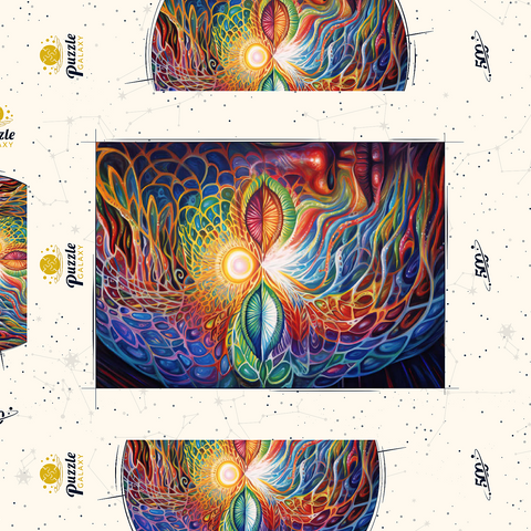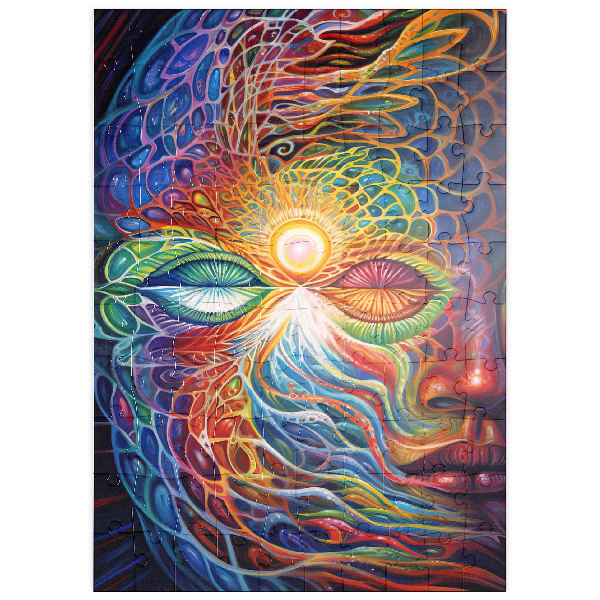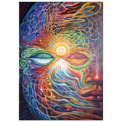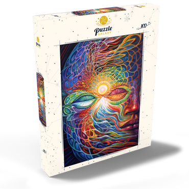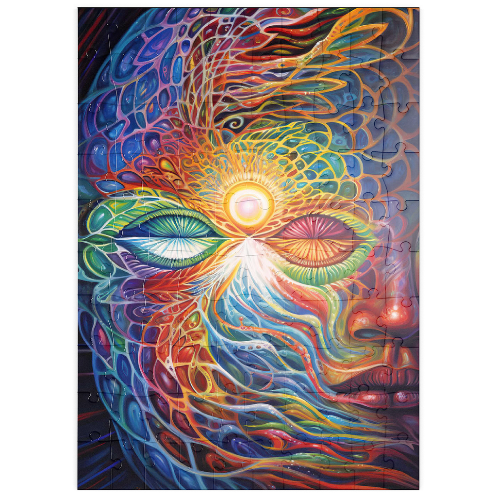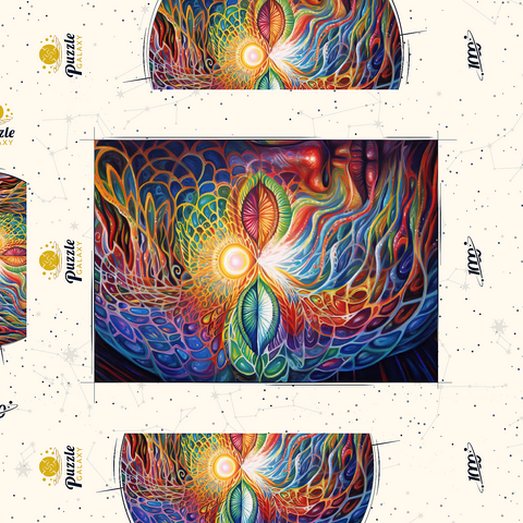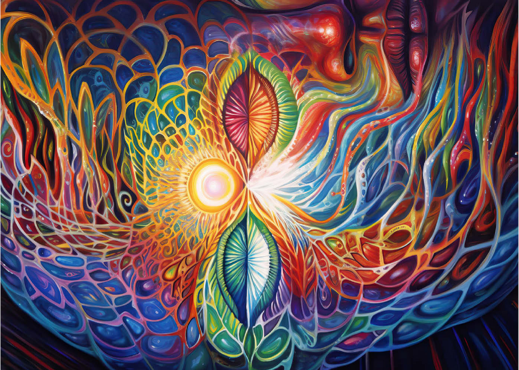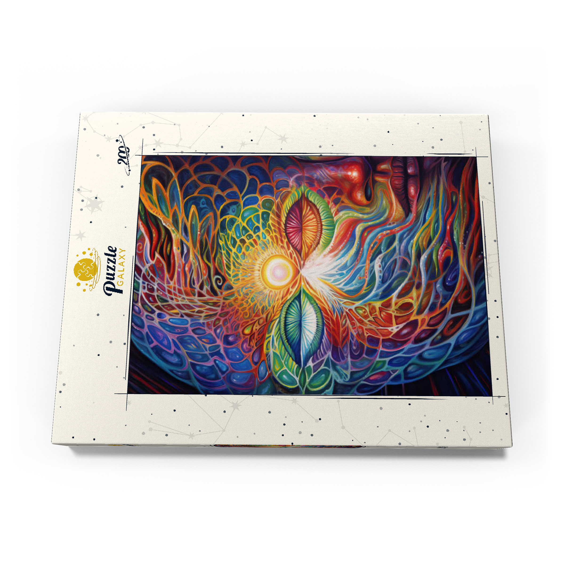 Dieses faszinierende Kunstwerk zeigt ein psychedelisches und visionäres Gesicht, das vor leuchtenden Farben und komplizierten Mustern nur so strotzt. Die Komposition verbindet surreale und abstrakte Elemente und schafft eine traumhafte Verschmelzung von organischen Strukturen und leuchtender Energie. Die ausdrucksstarken Augen, die aus einem Spektrum von Blau- und Grüntönen bestehen, bilden einen schönen Kontrast zu der feurigen, strahlenden Sonne in der Mitte, die Erleuchtung und kosmisches Bewusstsein symbolisiert. Fließende Linien und dynamische Rot-, Orange- und Blautöne gehen nahtlos ineinander über und rufen ein Gefühl von Bewegung und Transzendenz hervor. Dieses visuell atemberaubende Werk verkörpert Elemente des spirituellen Erwachens, des Mystizismus und der psychedelischen Ästhetik und ist damit eine fesselnde Ergänzung für jeden Raum, der sich zu visionärer Kunst und abstraktem Surrealismus hingezogen fühlt.