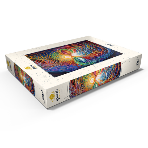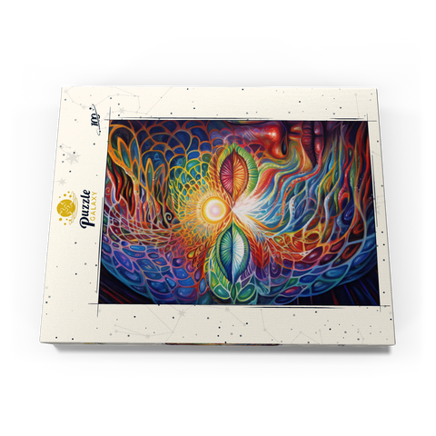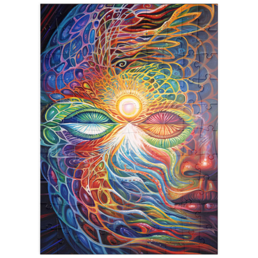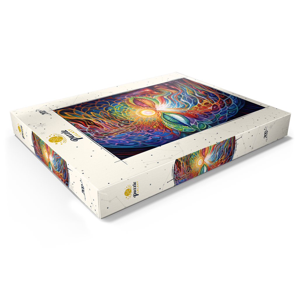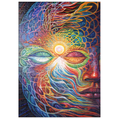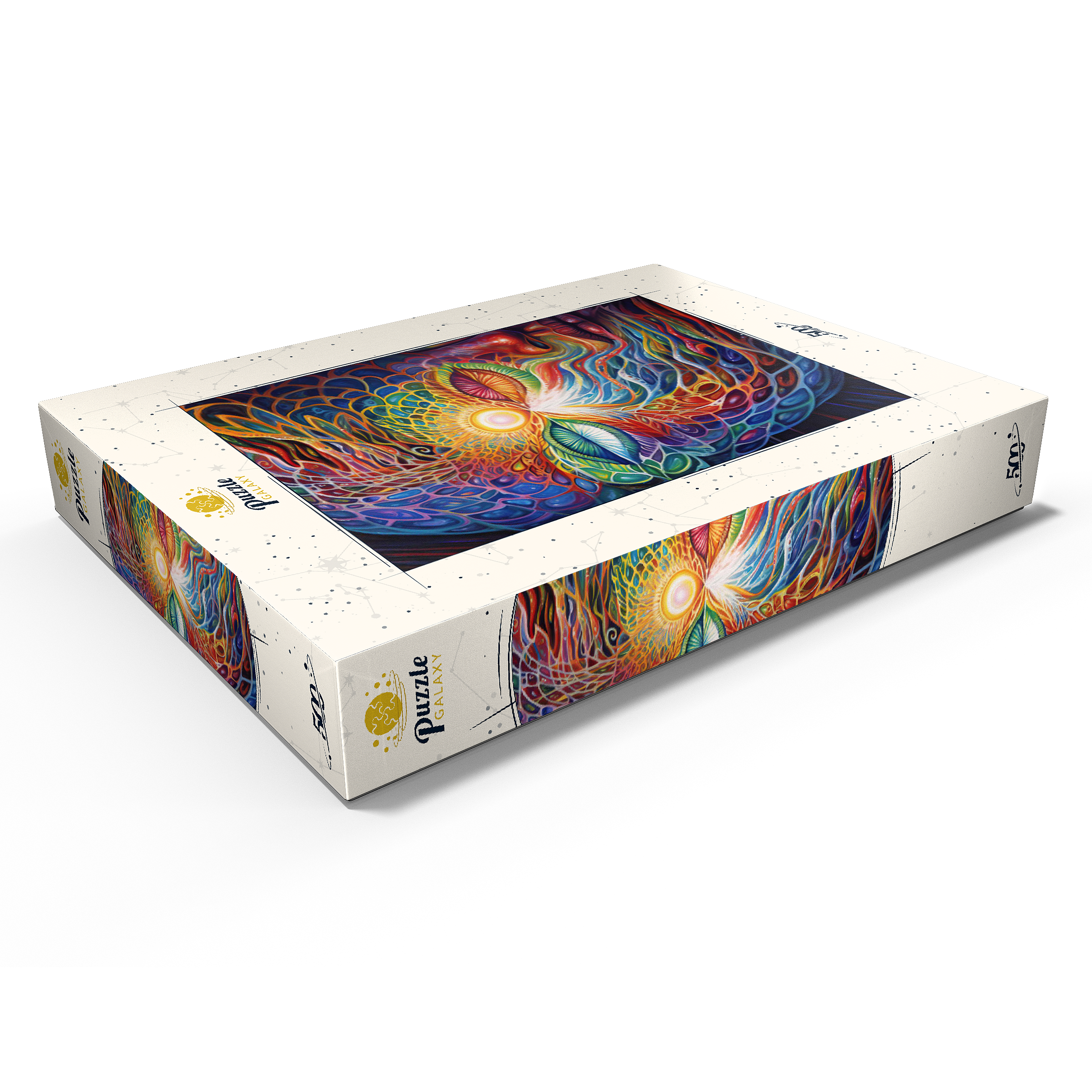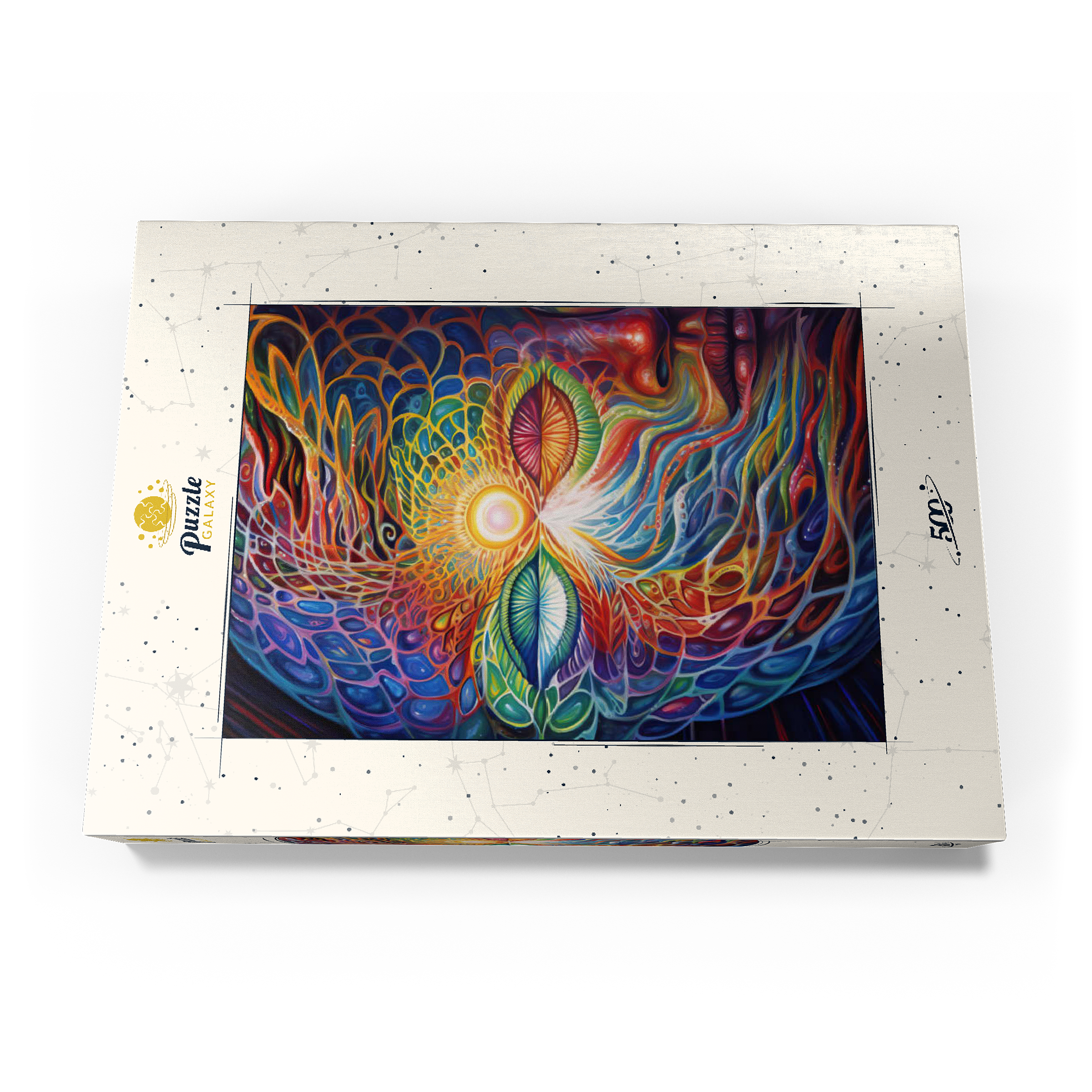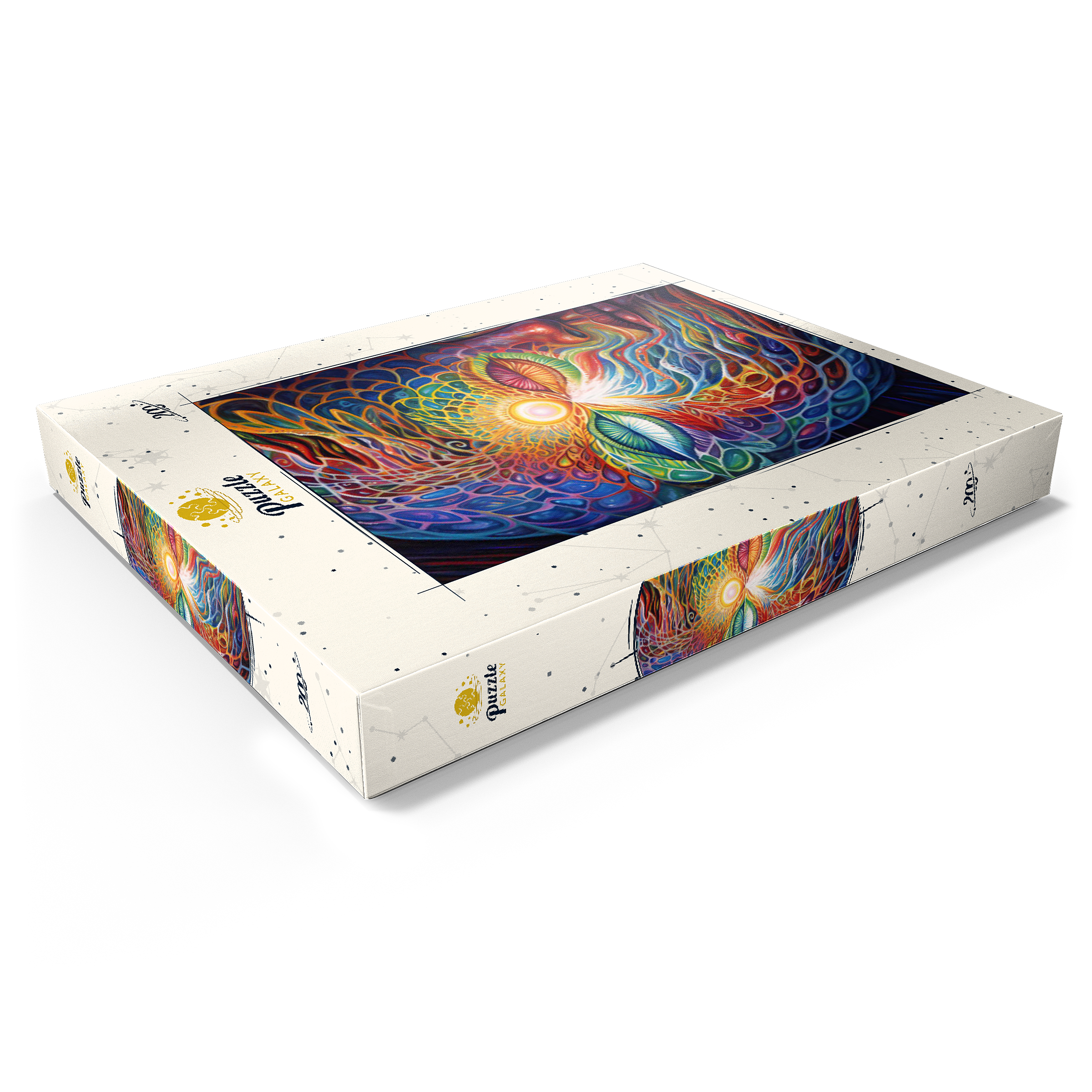 Dieses faszinierende Kunstwerk zeigt ein psychedelisches und visionäres Gesicht, das vor leuchtenden Farben und komplizierten Mustern nur so strotzt. Die Komposition verbindet surreale und abstrakte Elemente und schafft eine traumhafte Verschmelzung von organischen Strukturen und leuchtender Energie. Die ausdrucksstarken Augen, die aus einem Spektrum von Blau- und Grüntönen bestehen, bilden einen schönen Kontrast zu der feurigen, strahlenden Sonne in der Mitte, die Erleuchtung und kosmisches Bewusstsein symbolisiert. Fließende Linien und dynamische Rot-, Orange- und Blautöne gehen nahtlos ineinander über und rufen ein Gefühl von Bewegung und Transzendenz hervor. Dieses visuell atemberaubende Werk verkörpert Elemente des spirituellen Erwachens, des Mystizismus und der psychedelischen Ästhetik und ist damit eine fesselnde Ergänzung für jeden Raum, der sich zu visionärer Kunst und abstraktem Surrealismus hingezogen fühlt.