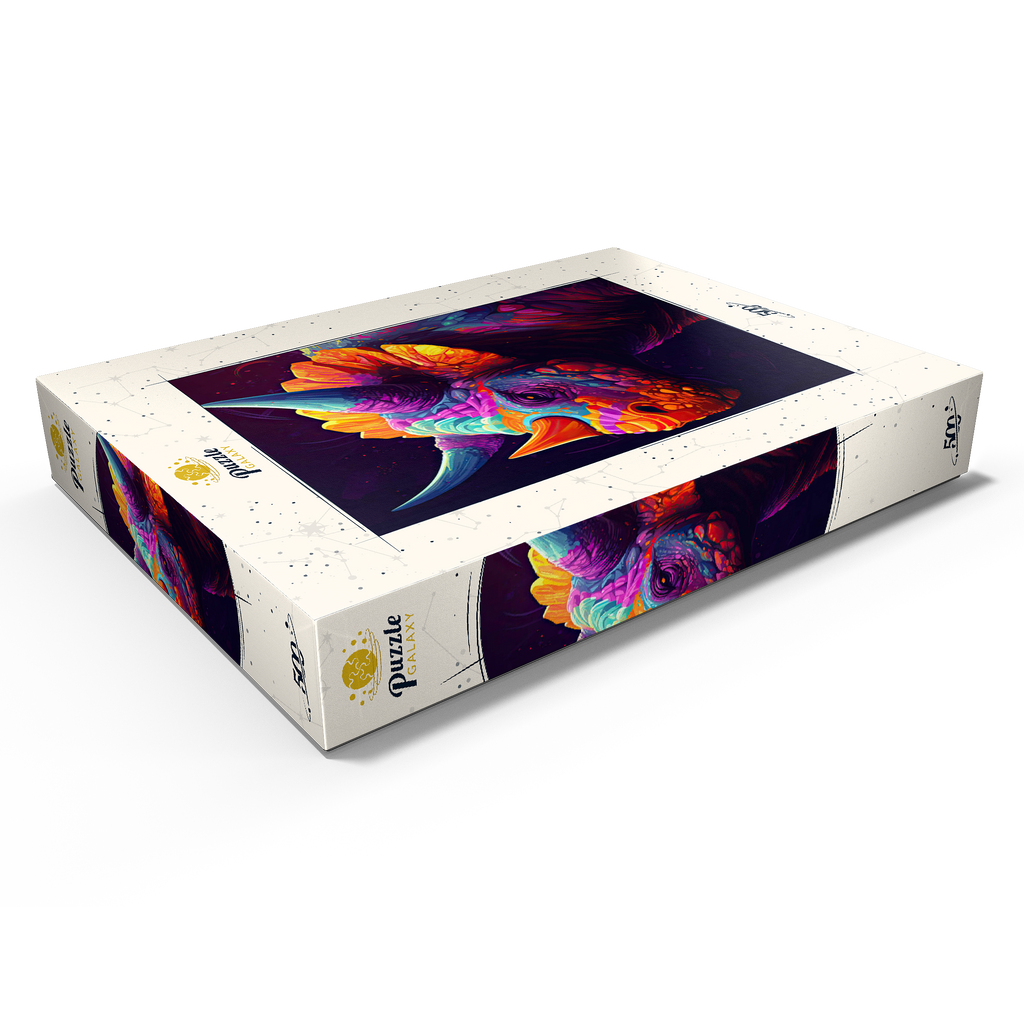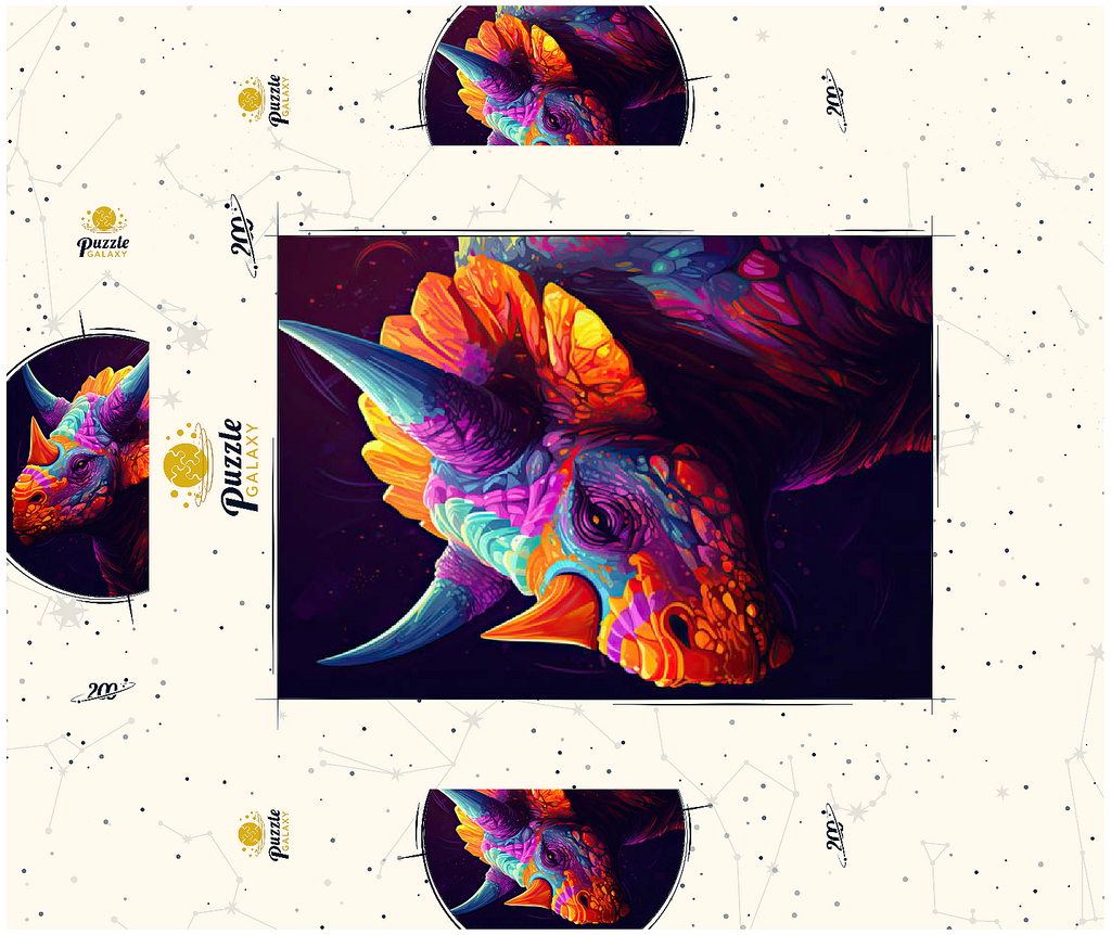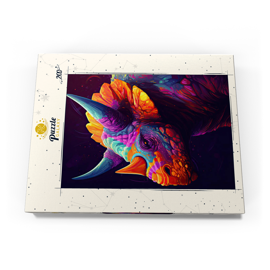 Dieses atemberaubende Kunstwerk zeigt eine lebendige und surreale Interpretation eines Triceratops, die mit einer Explosion von Neonfarben und komplizierten abstrakten Mustern zum Leben erweckt wird. Die gewagte Kombination aus elektrischem Blau, feurigem Orange und tiefem Violett erzeugt eine faszinierende psychedelische Ästhetik vor einem dunklen, kosmisch inspirierten Hintergrund. Die detaillierten Texturen und futuristischen Lichteffekte verstärken die majestätische Präsenz der Kreatur und lassen sie sowohl mythisch als auch außerweltlich erscheinen. Dieses dynamische Werk ist perfekt für Dinosaurier-Enthusiasten, Liebhaber von Fantasy-Kunst und alle, die mutige, farbenfrohe und auffällige digitale Kunstwerke schätzen.