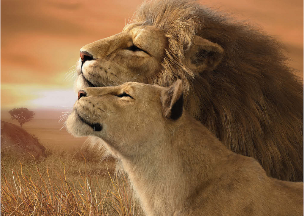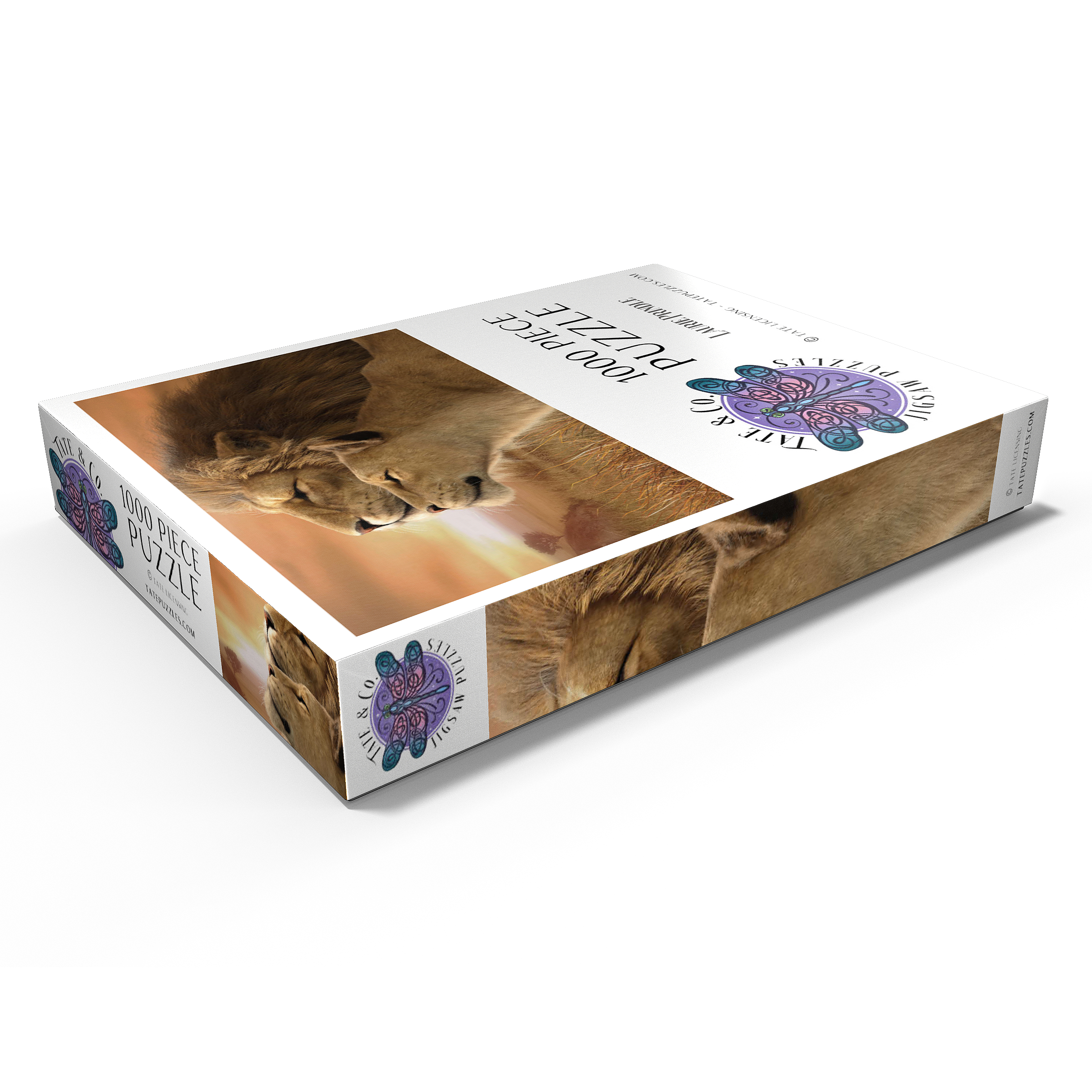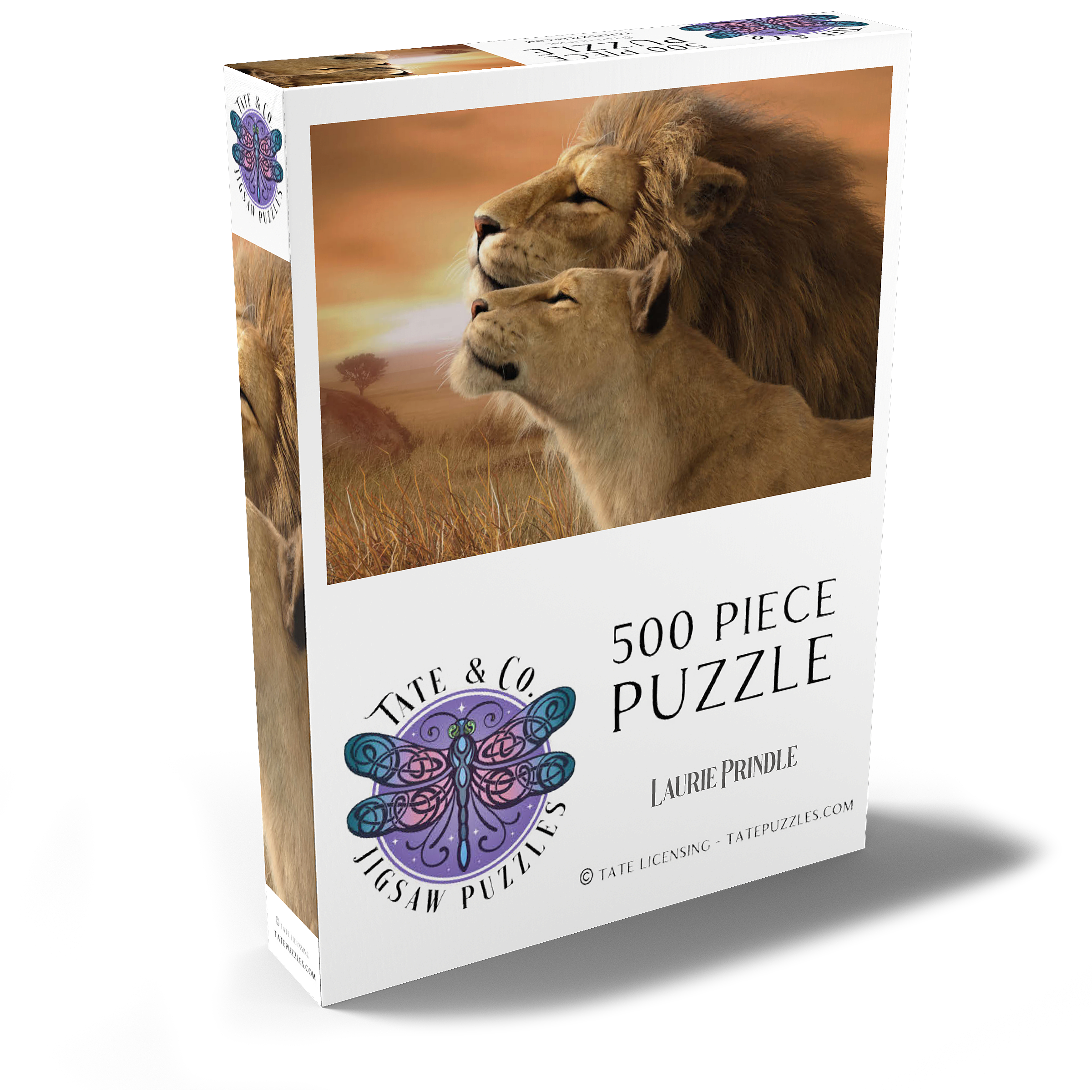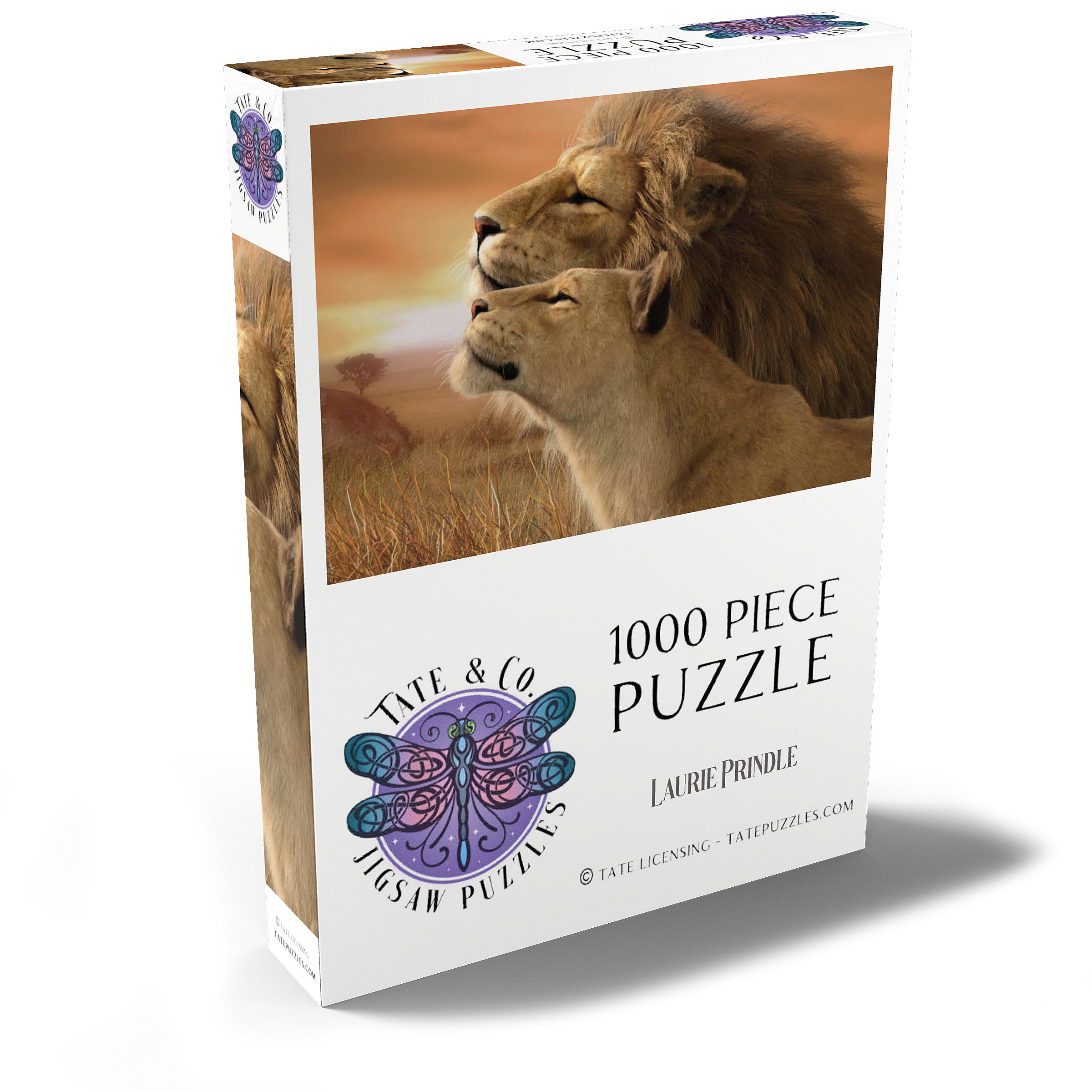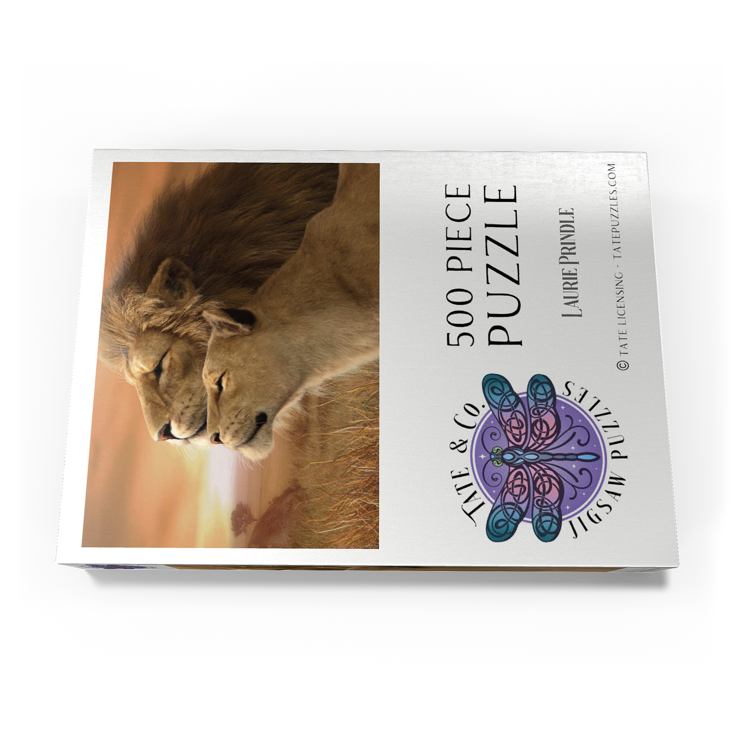 „A Tender Moment“ zeigt einen edlen Löwen mit goldener Mähne, der einen zärtlichen Moment mit seiner lieblichen Löwin teilt. Ihr gemeinsames Profil zeugt von einer tiefen Verbundenheit. Beide werden vom Abendlicht der afrikanischen Savanne warm beleuchtet, während der leuchtende Sonnenuntergang ihr sattes Fell in einem warmen Ton erstrahlen lässt und die majestätische Schönheit der Natur in diesem emotional berührenden Kunstwerk von Laurie Prindle zum Ausdruck bringt.