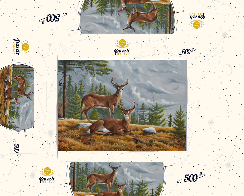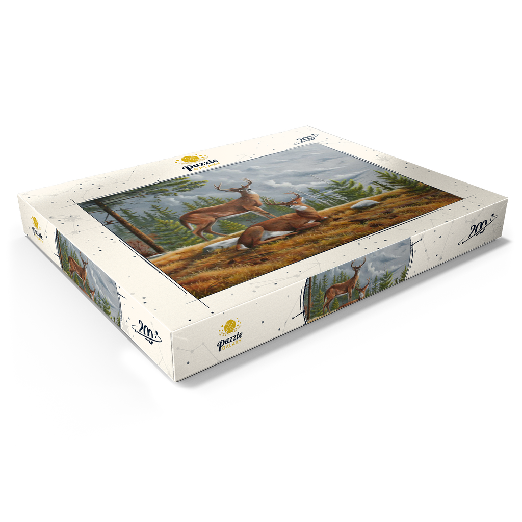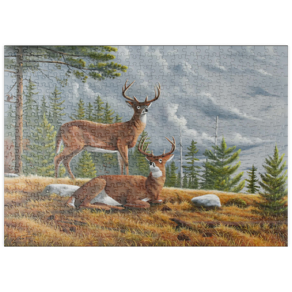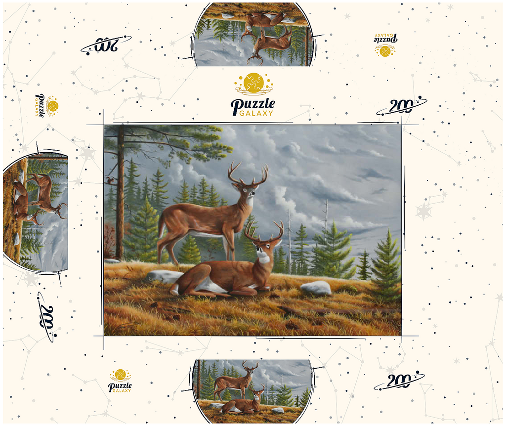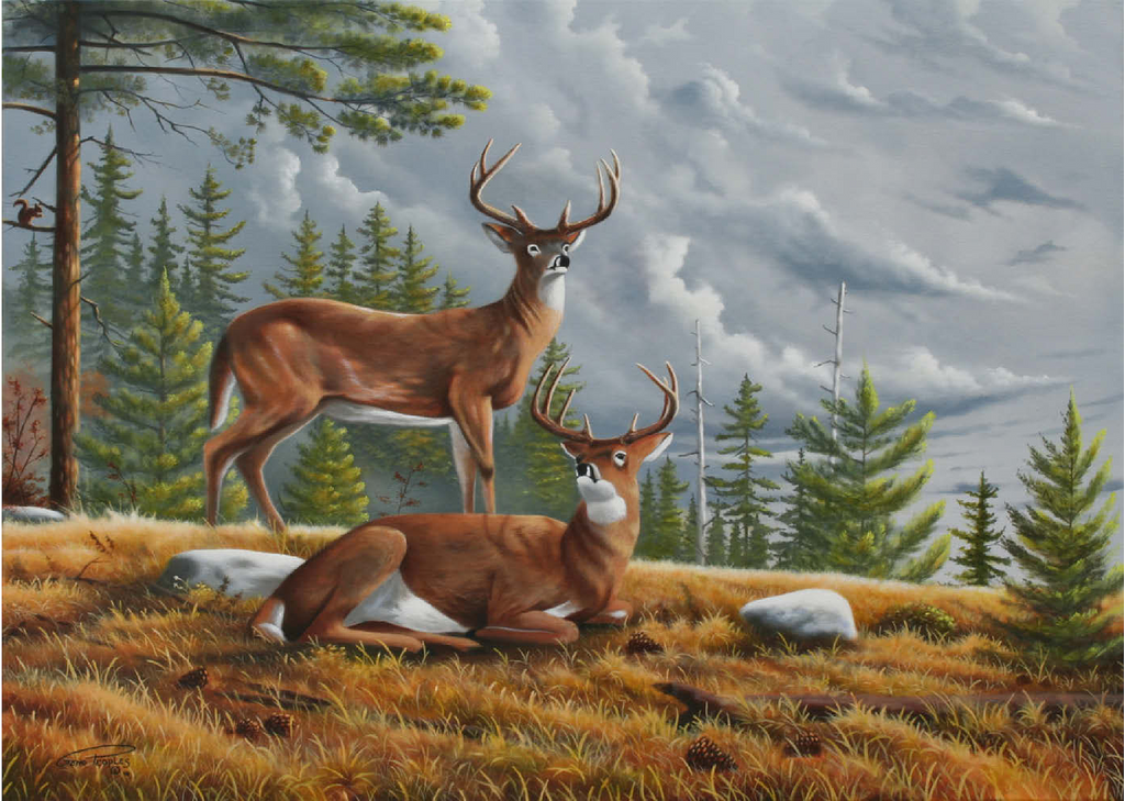 Dieses ruhige Gemälde zeigt zwei majestätische Weißwedelhirsche (Odocoileus virginianus) in einer friedlichen Waldlichtung im Herbst. Ein Hirsch steht wachsam da, während der andere zwischen goldenem Gras, Tannenzapfen und verstreuten Steinen ruht, umrahmt von hohen immergrünen Bäumen. Der stimmungsvolle Himmel und das sanfte Licht schaffen eine friedliche und doch dramatische Waldatmosphäre. Die sorgfältige Detailarbeit bei Fell und Geweih in Kombination mit der natürlichen Umgebung unterstreicht die stille Schönheit und wachsame Präsenz dieser ikonischen nordamerikanischen Tiere in ihrem natürlichen Lebensraum.