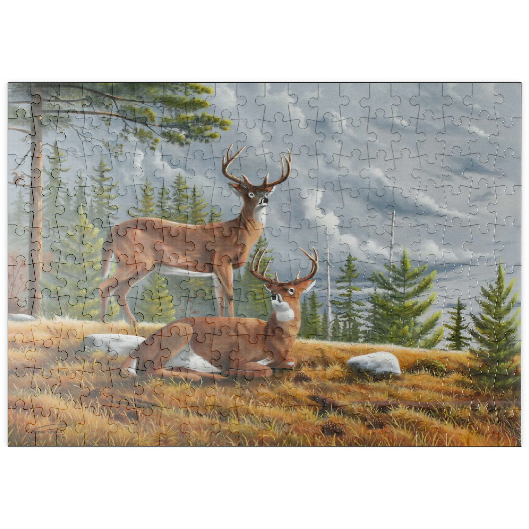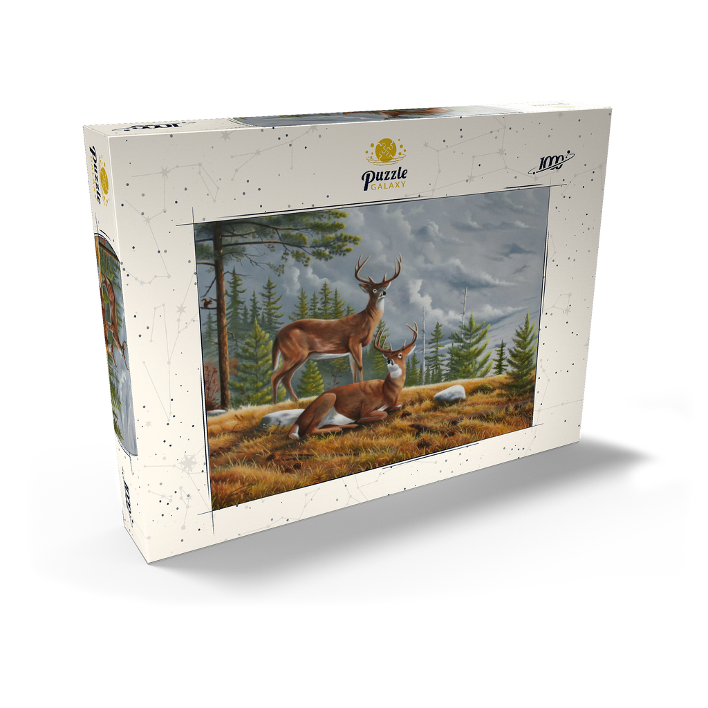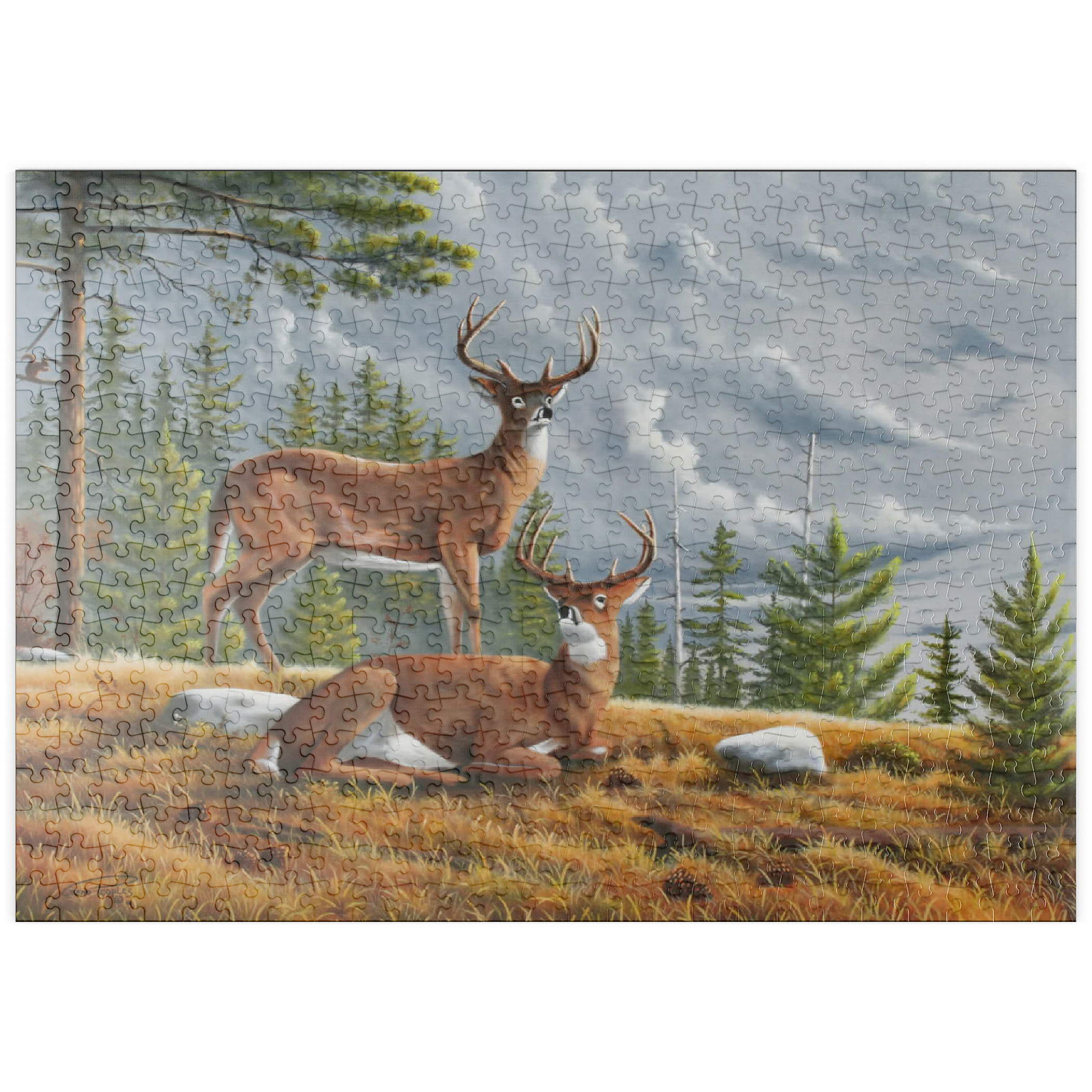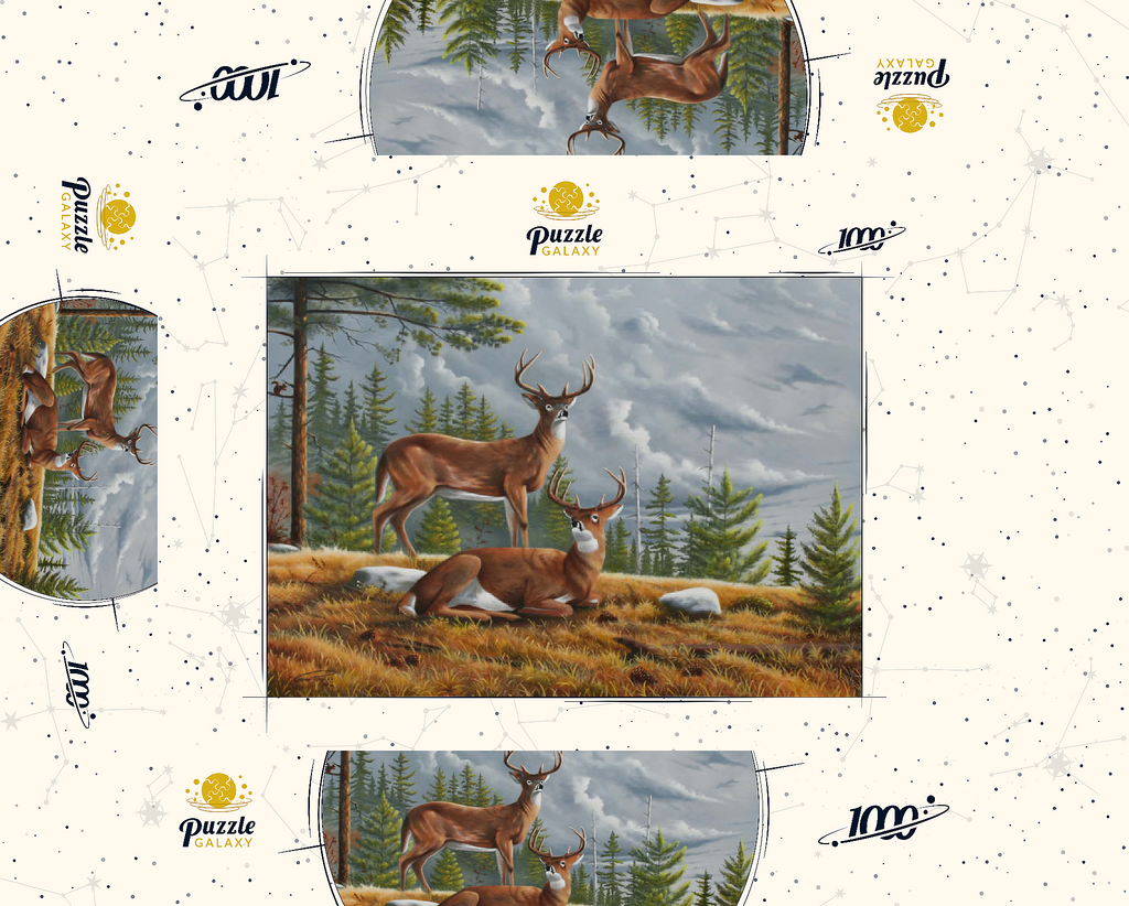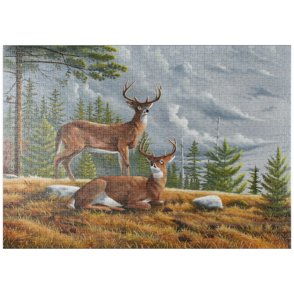 Dieses ruhige Gemälde zeigt zwei majestätische Weißwedelhirsche (Odocoileus virginianus) in einer friedlichen Waldlichtung im Herbst. Ein Hirsch steht wachsam da, während der andere zwischen goldenem Gras, Tannenzapfen und verstreuten Steinen ruht, umrahmt von hohen immergrünen Bäumen. Der stimmungsvolle Himmel und das sanfte Licht schaffen eine friedliche und doch dramatische Waldatmosphäre. Die sorgfältige Detailarbeit bei Fell und Geweih in Kombination mit der natürlichen Umgebung unterstreicht die stille Schönheit und wachsame Präsenz dieser ikonischen nordamerikanischen Tiere in ihrem natürlichen Lebensraum.