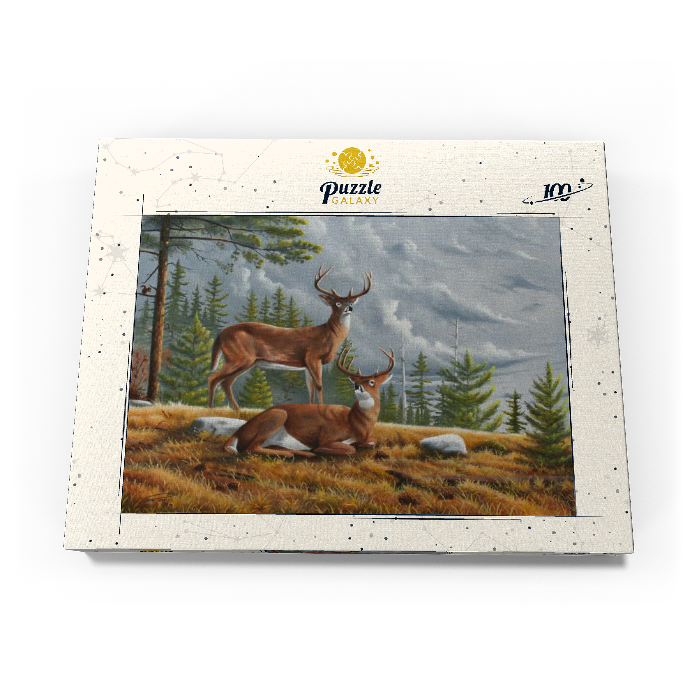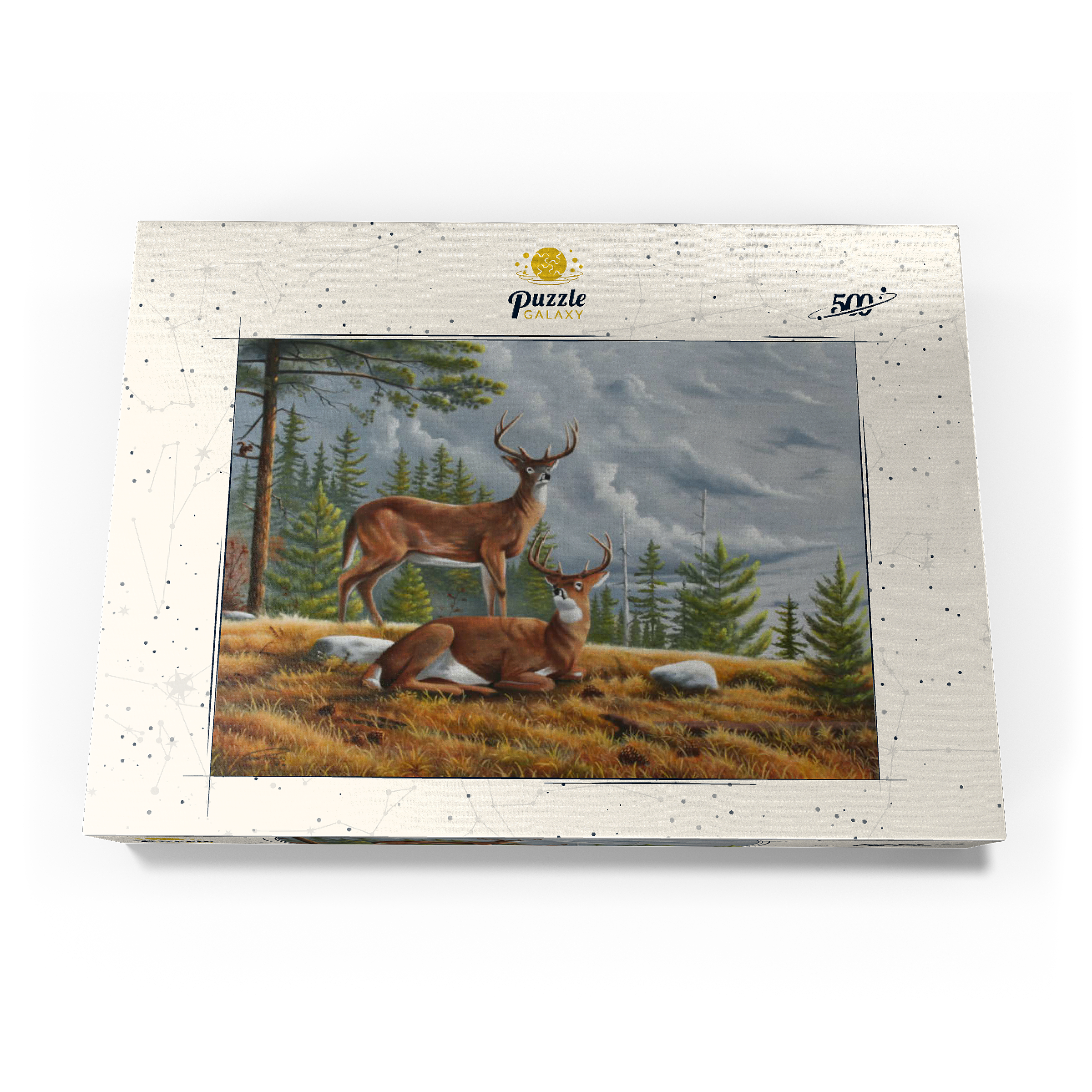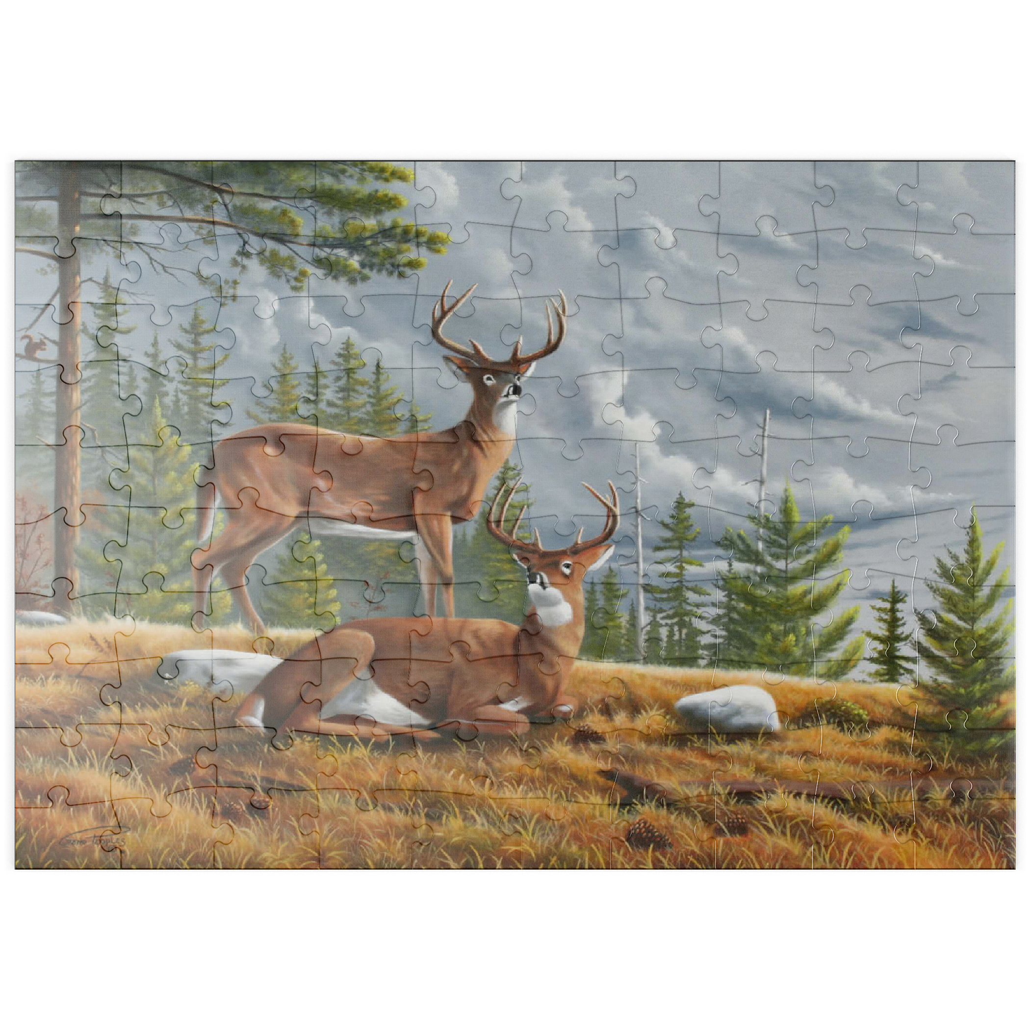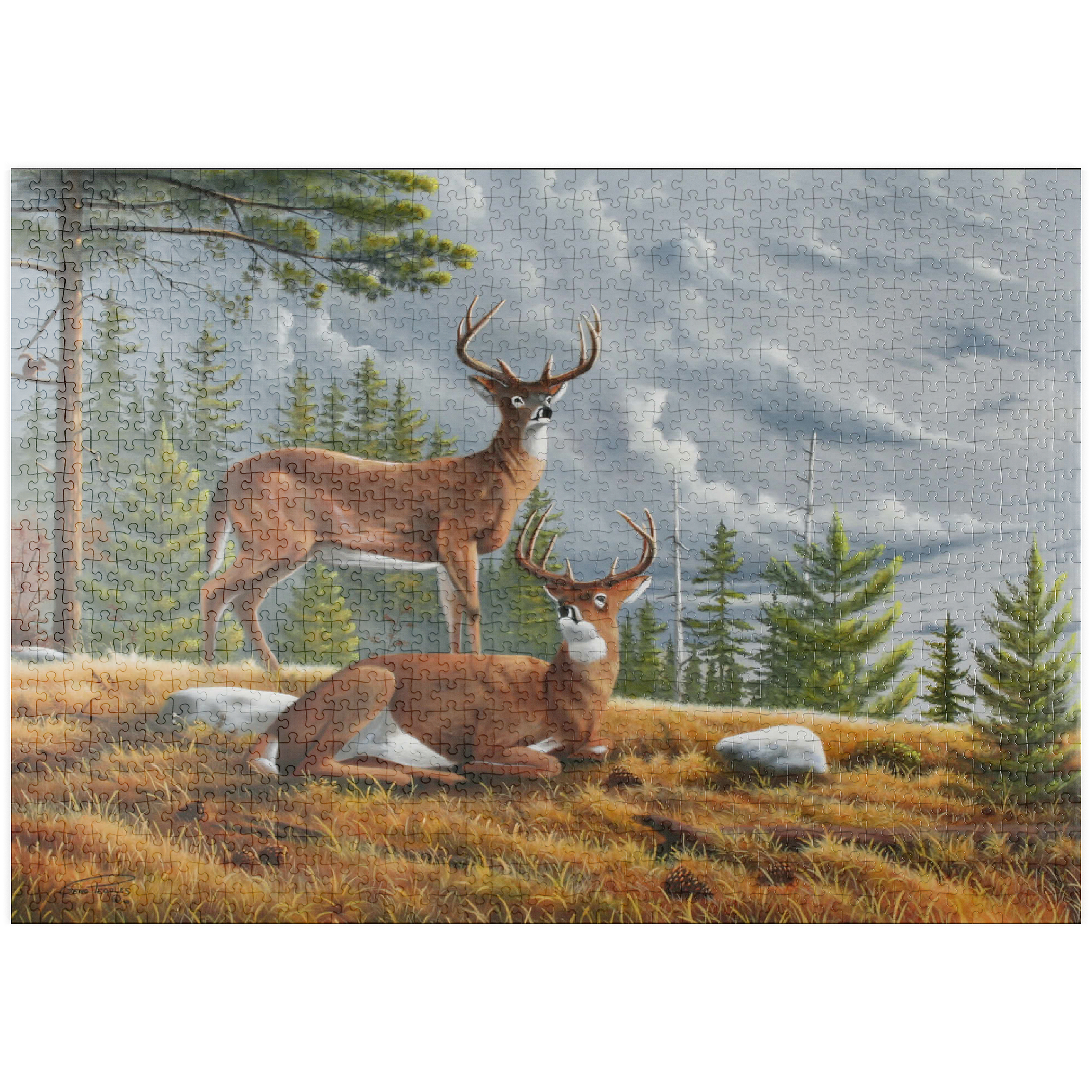 Dieses ruhige Gemälde zeigt zwei majestätische Weißwedelhirsche (Odocoileus virginianus) in einer friedlichen Waldlichtung im Herbst. Ein Hirsch steht wachsam da, während der andere zwischen goldenem Gras, Tannenzapfen und verstreuten Steinen ruht, umrahmt von hohen immergrünen Bäumen. Der stimmungsvolle Himmel und das sanfte Licht schaffen eine friedliche und doch dramatische Waldatmosphäre. Die sorgfältige Detailarbeit bei Fell und Geweih in Kombination mit der natürlichen Umgebung unterstreicht die stille Schönheit und wachsame Präsenz dieser ikonischen nordamerikanischen Tiere in ihrem natürlichen Lebensraum.