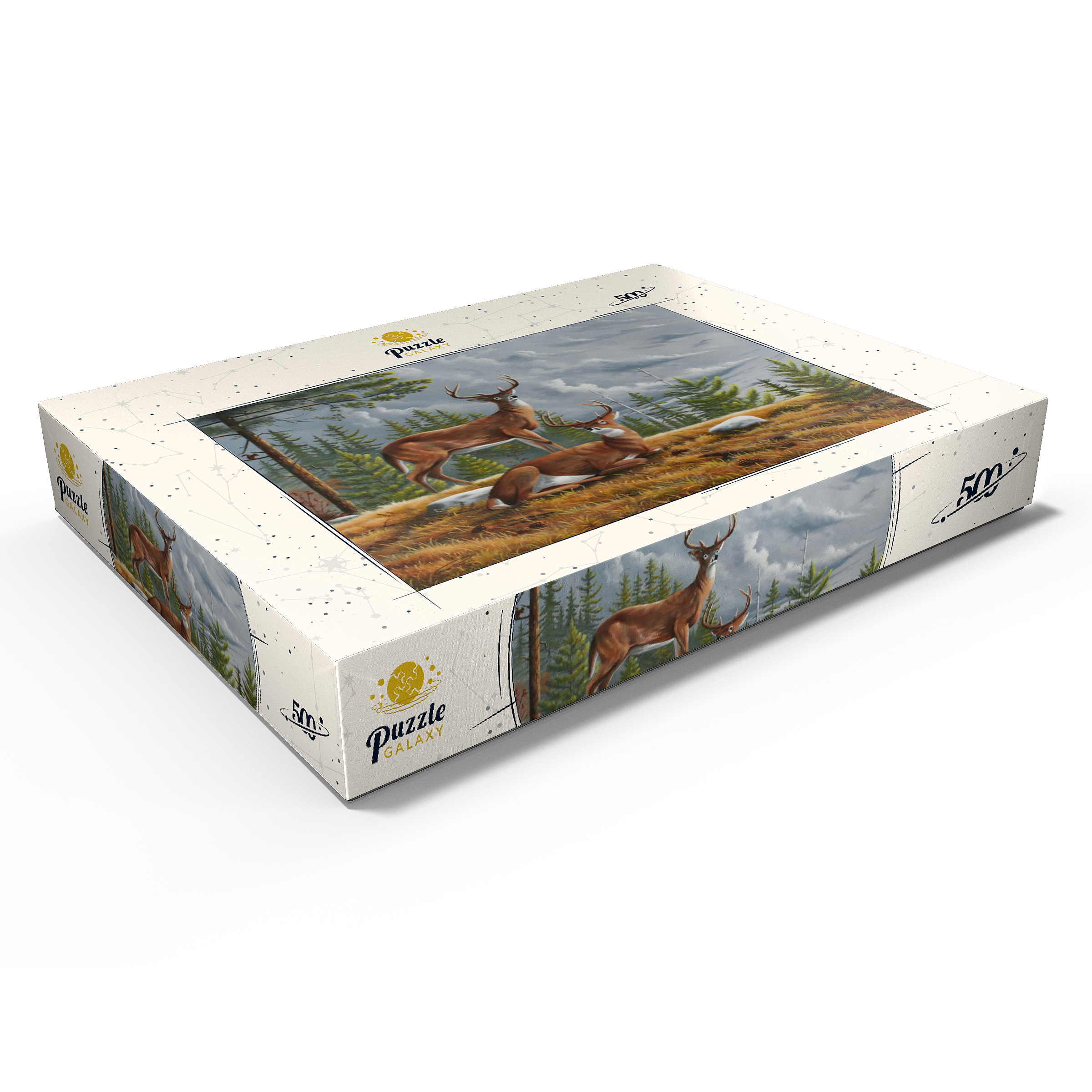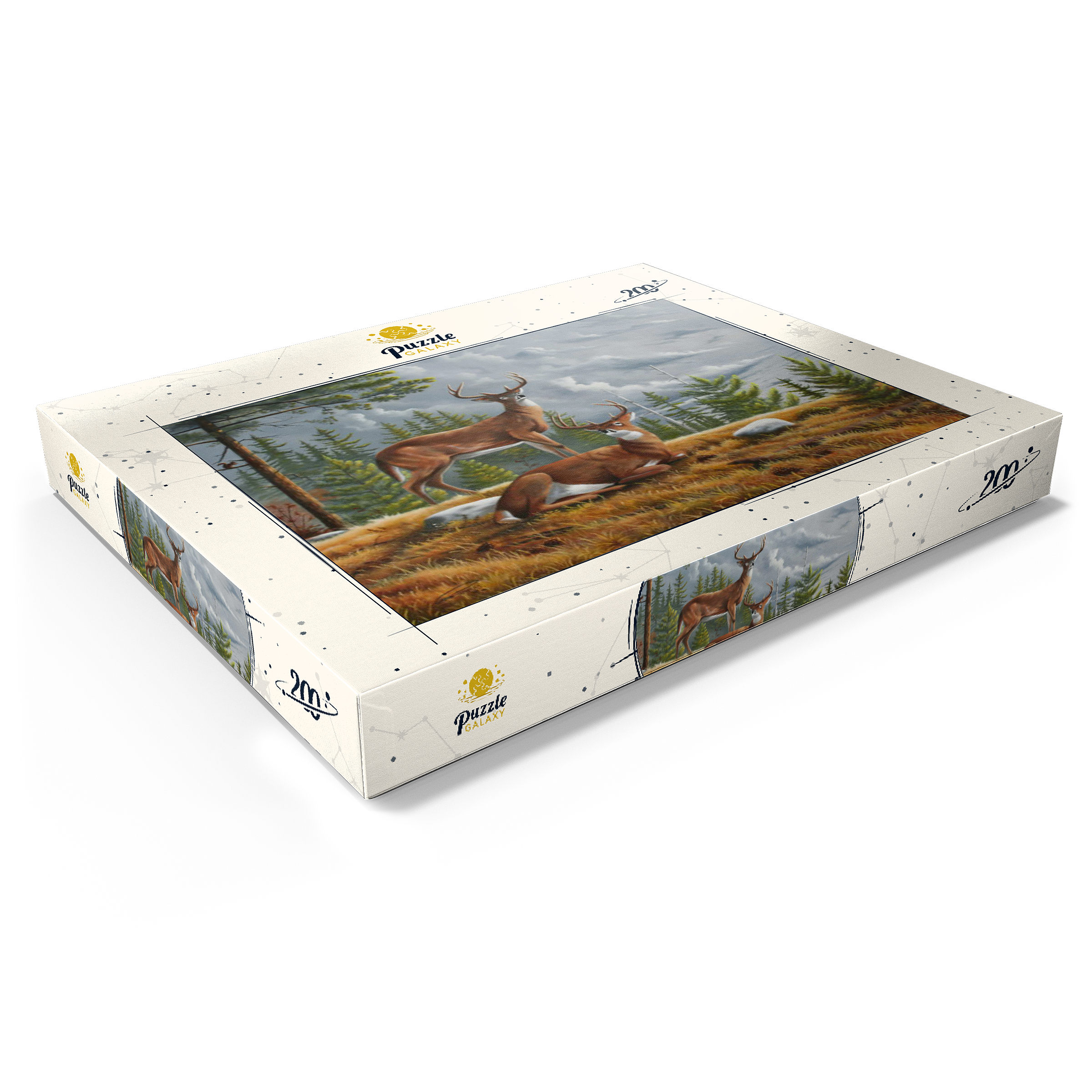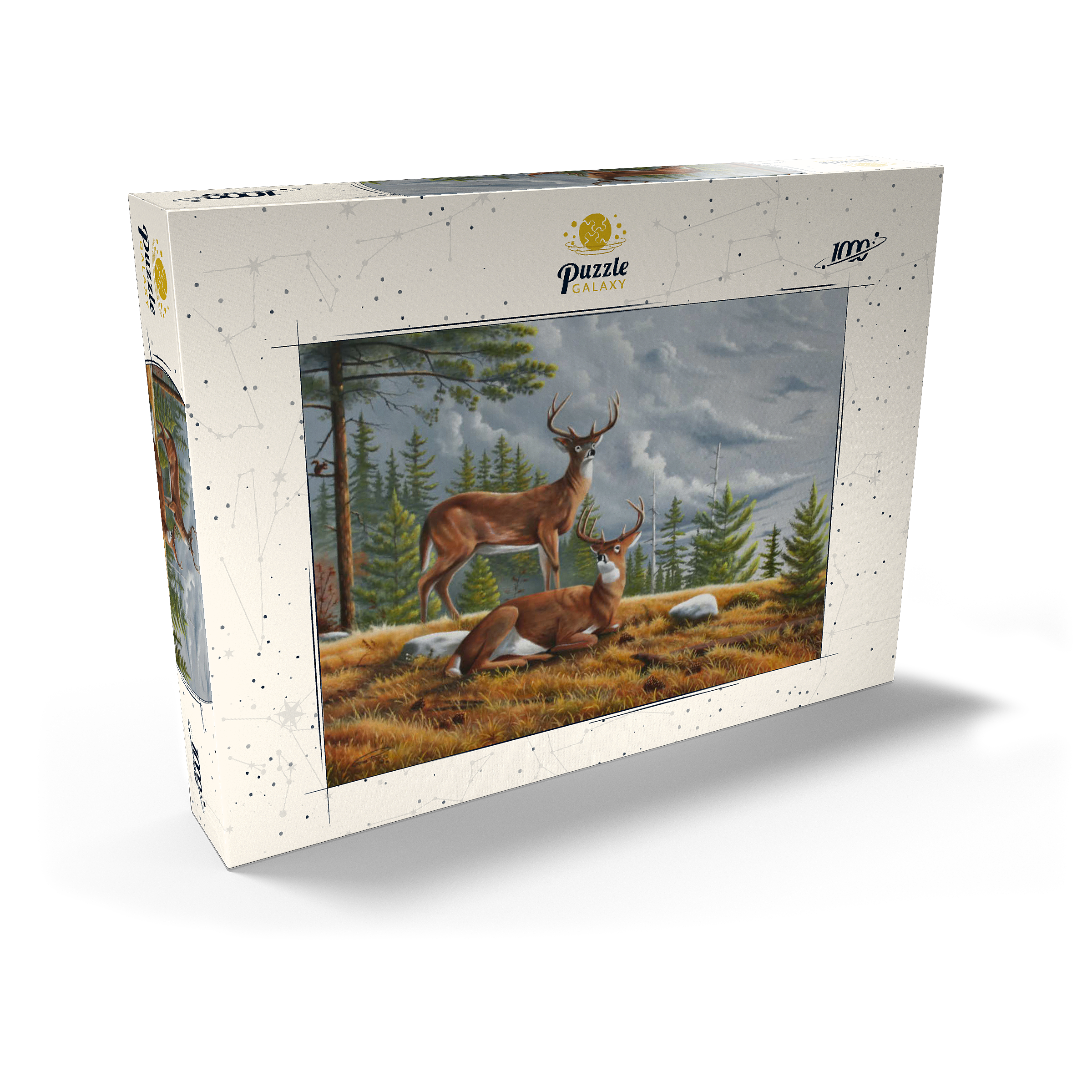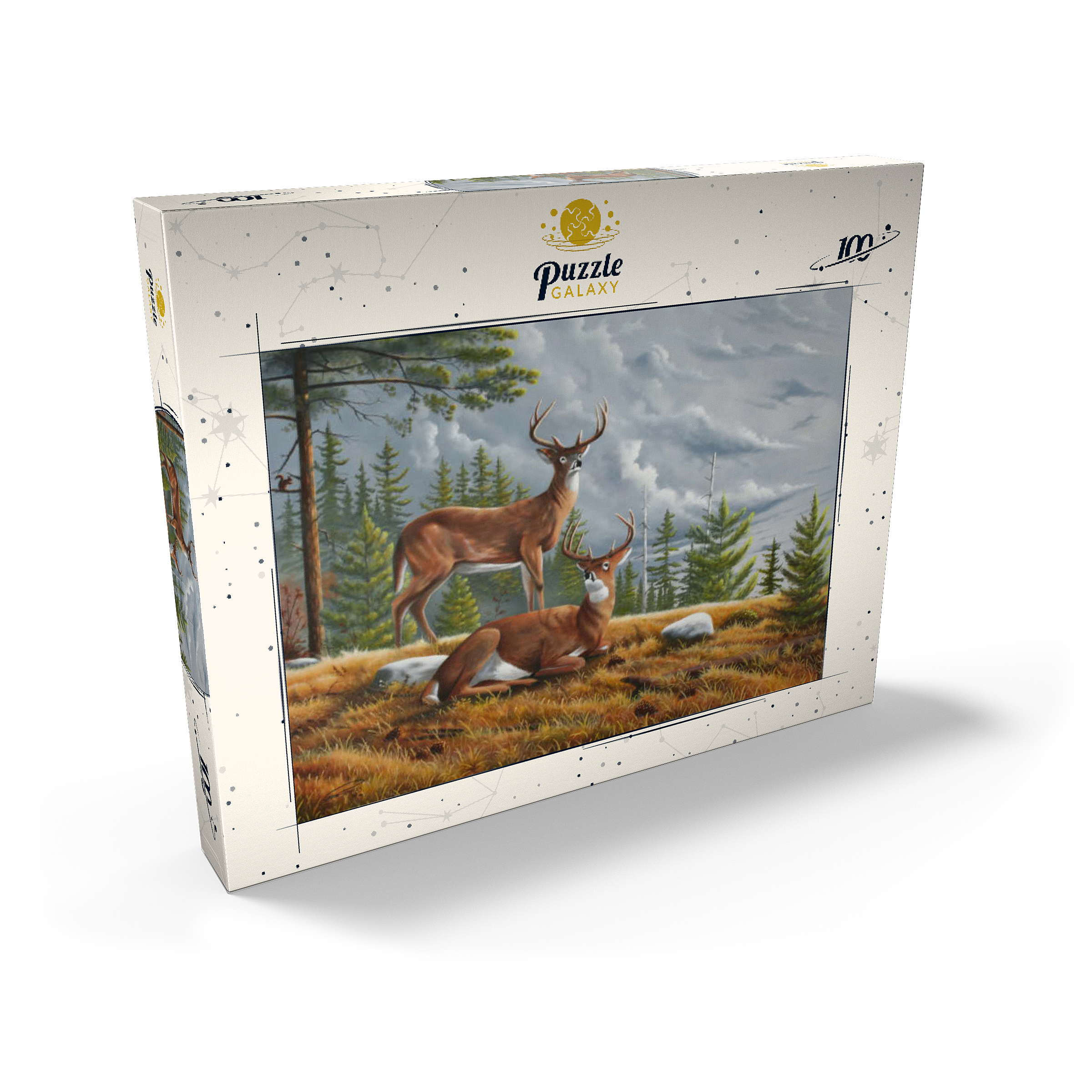 Dieses ruhige Gemälde zeigt zwei majestätische Weißwedelhirsche (Odocoileus virginianus) in einer friedlichen Waldlichtung im Herbst. Ein Hirsch steht wachsam da, während der andere zwischen goldenem Gras, Tannenzapfen und verstreuten Steinen ruht, umrahmt von hohen immergrünen Bäumen. Der stimmungsvolle Himmel und das sanfte Licht schaffen eine friedliche und doch dramatische Waldatmosphäre. Die sorgfältige Detailarbeit bei Fell und Geweih in Kombination mit der natürlichen Umgebung unterstreicht die stille Schönheit und wachsame Präsenz dieser ikonischen nordamerikanischen Tiere in ihrem natürlichen Lebensraum.