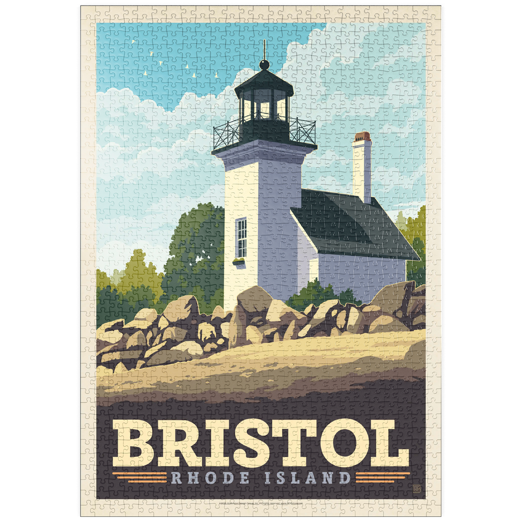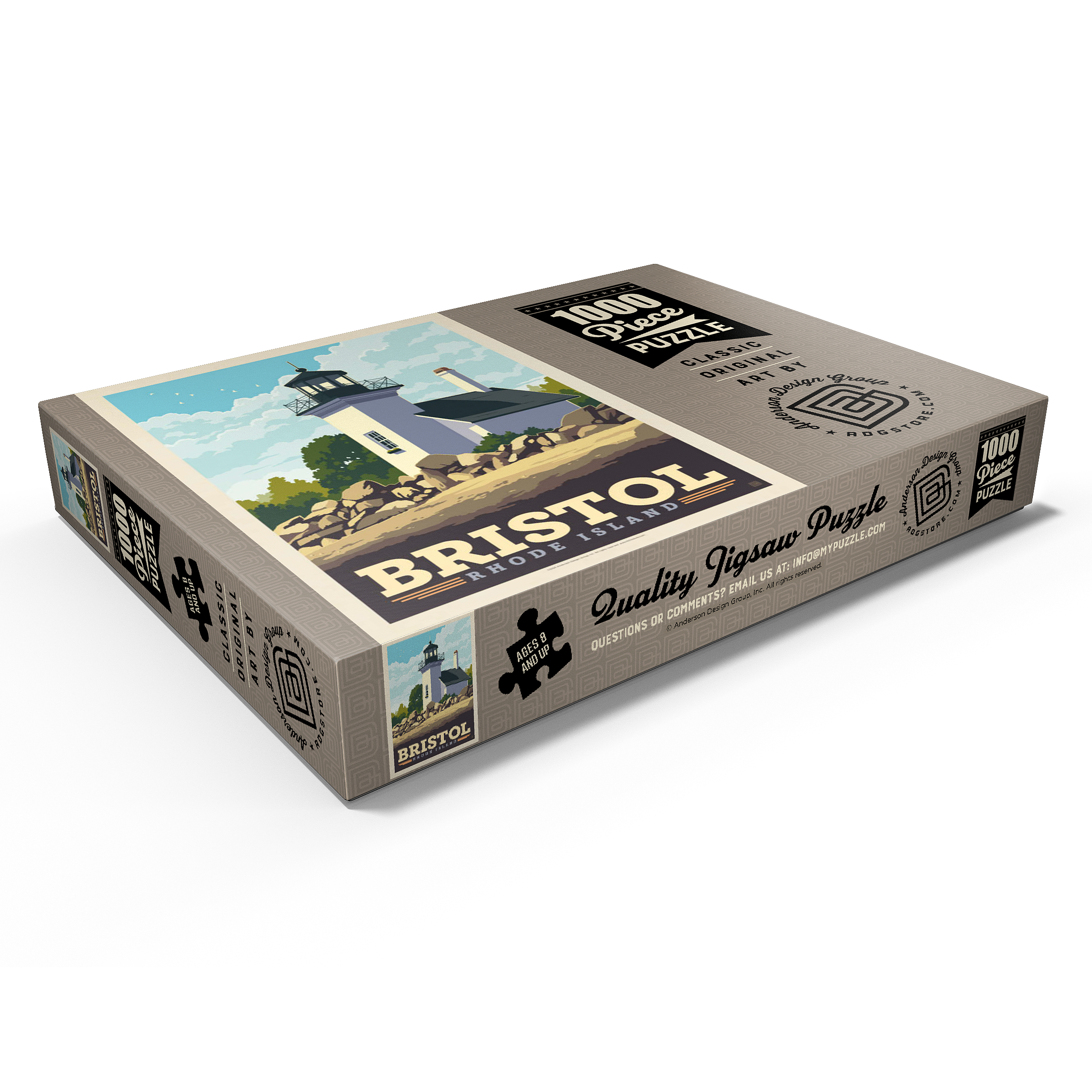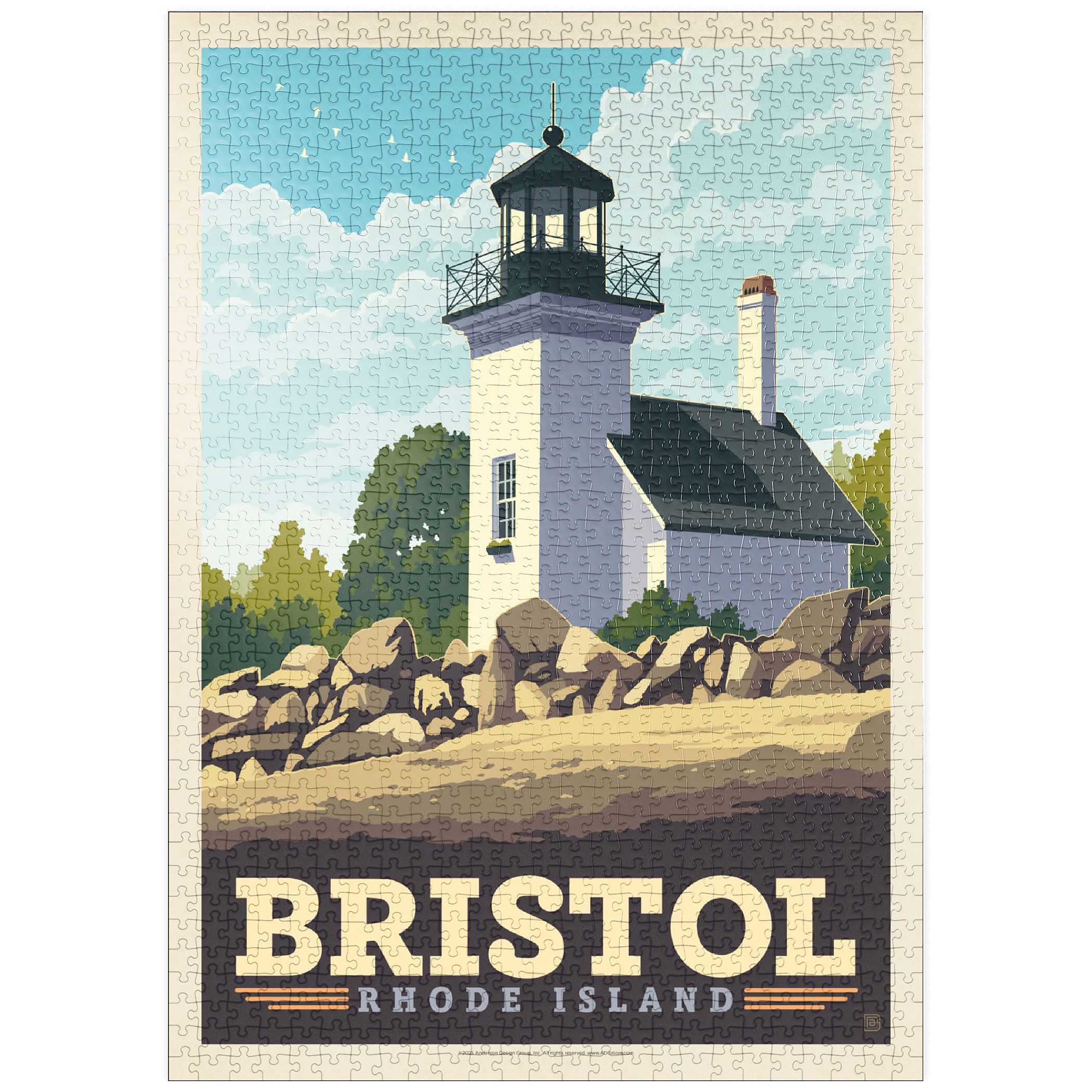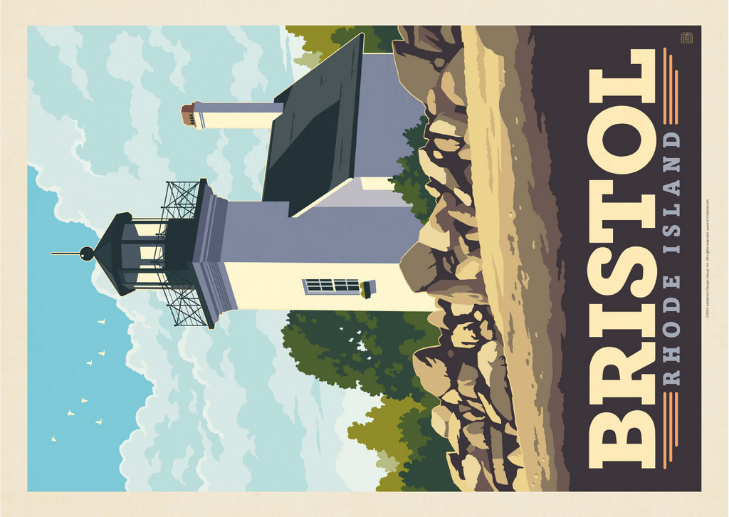 Bristol, Rhode Island, wird wunderschön illustriert mit einem klassischen Küstenleuchtturm, der unter strahlend blauem Himmel auf einer felsigen Küste steht. Die klaren Linien und die sanfte Beleuchtung unterstreichen den zeitlosen Charme des maritimen Erbes Neuenglands. Seevögel schweben über der Szene, während das Sonnenlicht den weißen Turm und das umgebende Grün badet und ein Gefühl der Ruhe und Nostalgie am Meer hervorruft. Diese Darstellung fängt die Essenz der Küstenschönheit von Rhode Island und den historischen Charakter des Hafens von Bristol ein, wo maritime Traditionen auf malerische Ausblicke auf das Meer treffen. Es ist eine ruhige und einladende Hommage an eine der landschaftlich reizvollsten Küstenstädte Neuenglands.