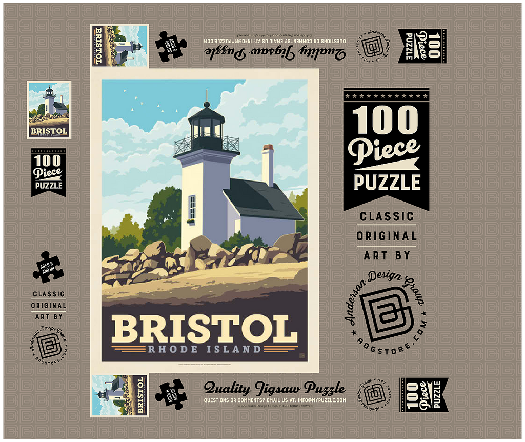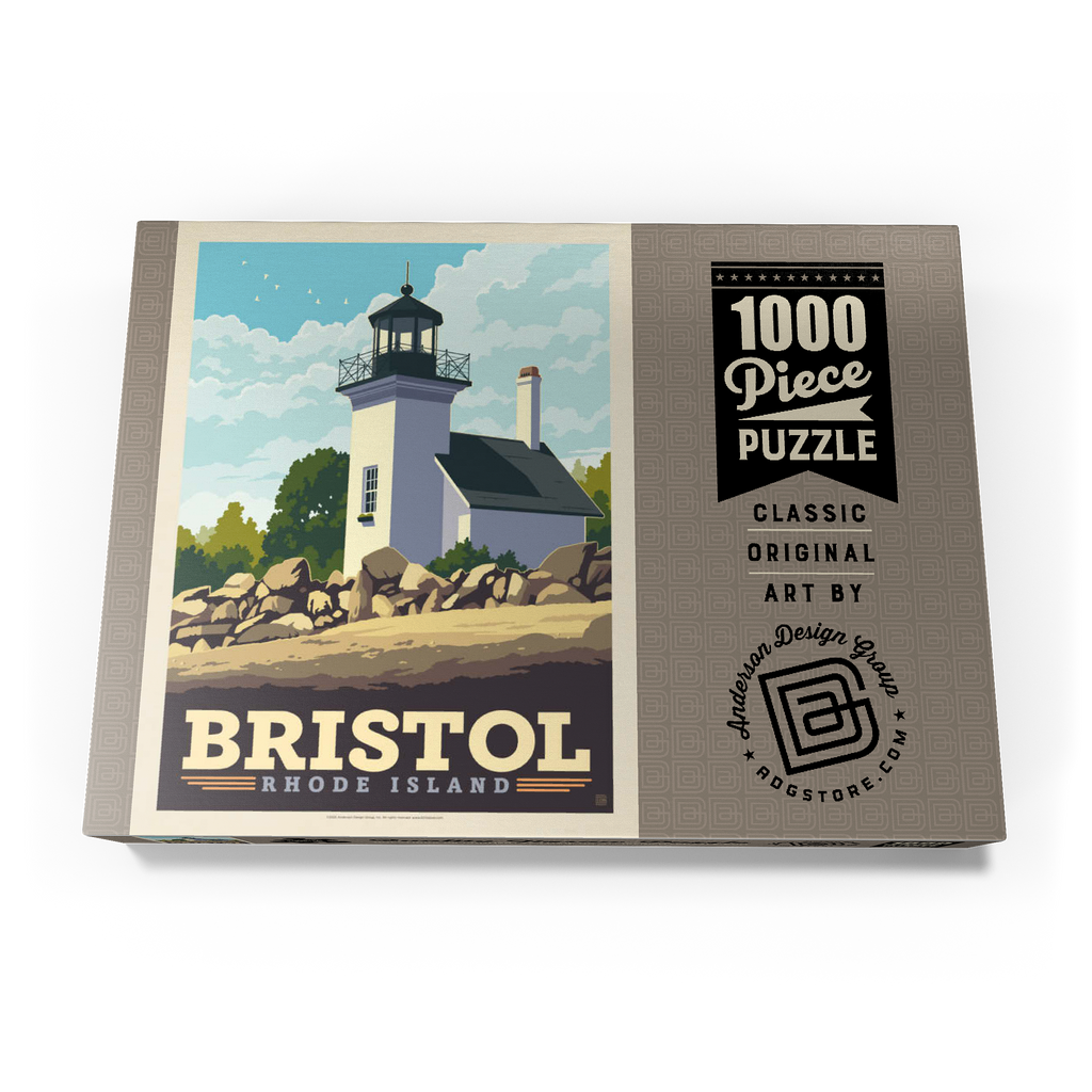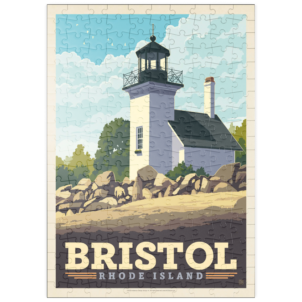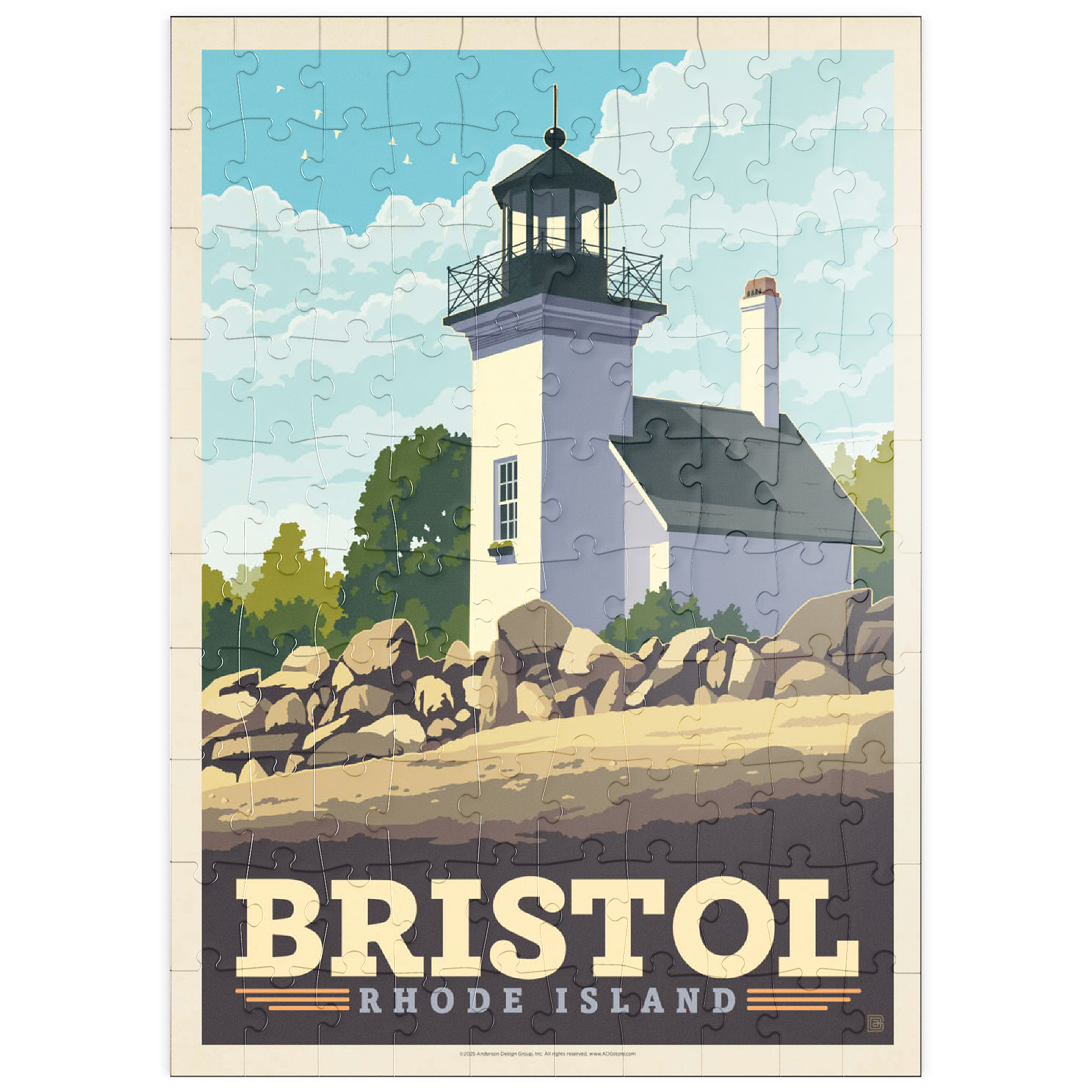 Bristol, Rhode Island, wird wunderschön illustriert mit einem klassischen Küstenleuchtturm, der unter strahlend blauem Himmel auf einer felsigen Küste steht. Die klaren Linien und die sanfte Beleuchtung unterstreichen den zeitlosen Charme des maritimen Erbes Neuenglands. Seevögel schweben über der Szene, während das Sonnenlicht den weißen Turm und das umgebende Grün badet und ein Gefühl der Ruhe und Nostalgie am Meer hervorruft. Diese Darstellung fängt die Essenz der Küstenschönheit von Rhode Island und den historischen Charakter des Hafens von Bristol ein, wo maritime Traditionen auf malerische Ausblicke auf das Meer treffen. Es ist eine ruhige und einladende Hommage an eine der landschaftlich reizvollsten Küstenstädte Neuenglands.