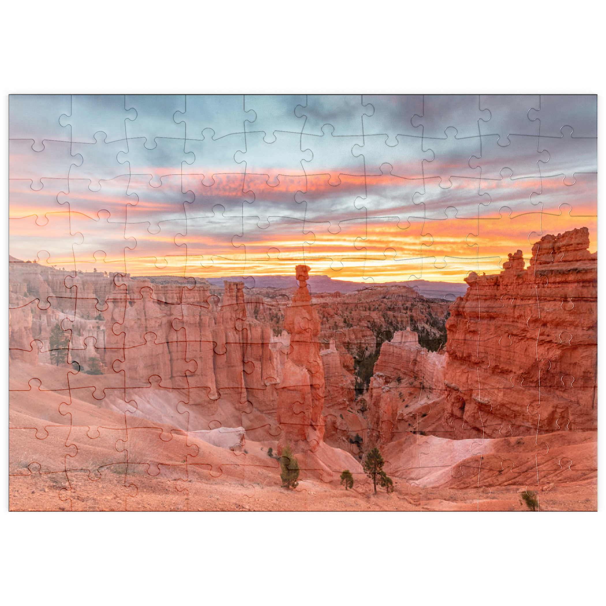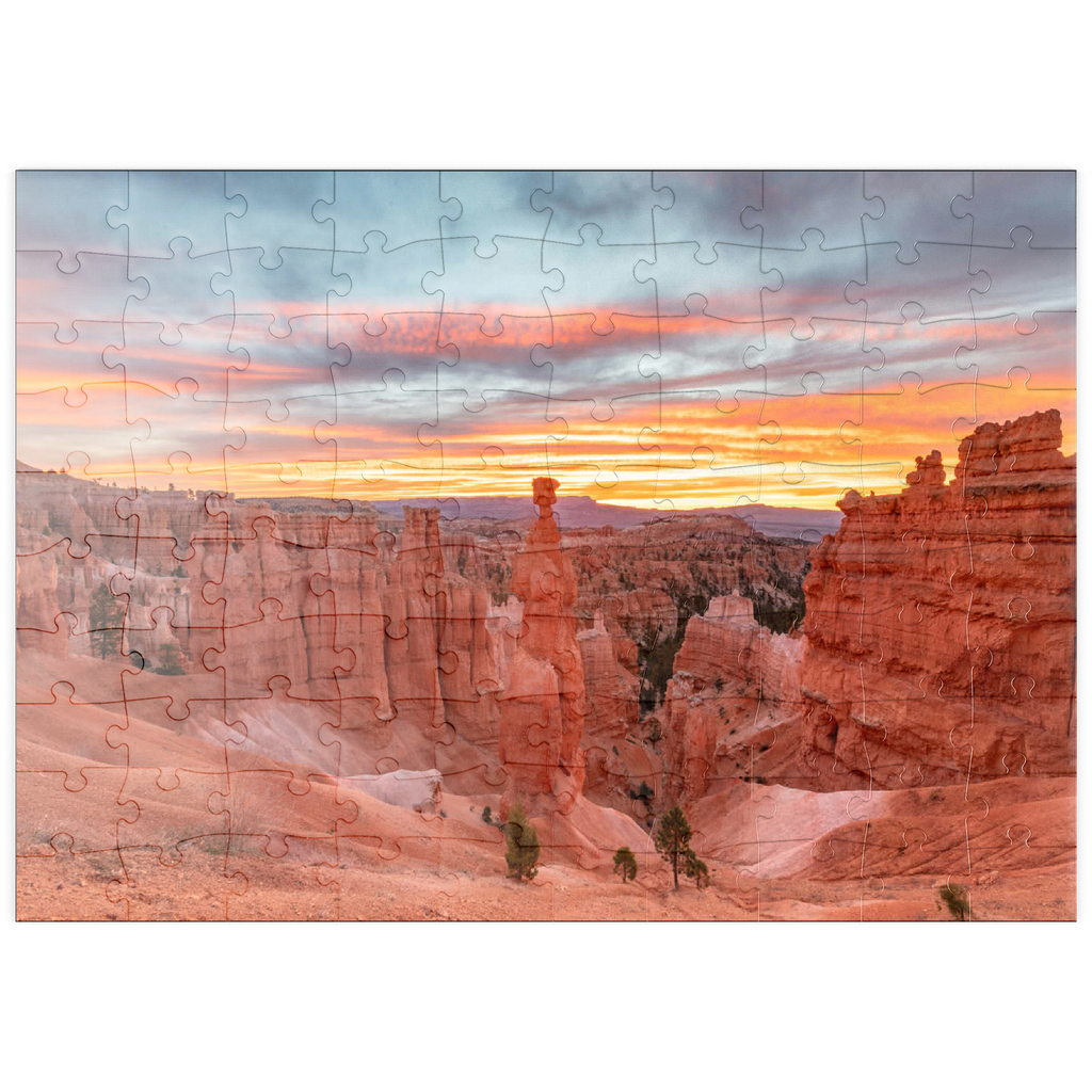 Dieser atemberaubende Sonnenaufgang zeigt die ikonische Felsformation „Thor's Hammer“ im Bryce Canyon National Park in Utah. Der Bryce Canyon ist bekannt für seine dramatischen Hoodoos – hohe, dünne Felsspitzen – und ist ein geologisches Wunderwerk, das über Millionen von Jahren durch Frostverwitterung und Strömungserosion geformt wurde. Das sanfte Morgenlicht beleuchtet die roten und orangefarbenen Sandsteinfelsen und bildet einen faszinierenden Kontrast zum blassen Himmel, der von Gold-, Rosa- und Lavendeltönen durchzogen ist. Hoch aufragende Formationen erheben sich aus dem Canyonboden, umgeben von vereinzelten Kiefern und zerklüfteter Wüstenlandschaft. Diese beeindruckende Szenerie fängt die raue Schönheit des amerikanischen Südwestens ein und ist ein Muss für Wanderer, Fotografen und Naturliebhaber gleichermaßen. Die hohe Lage des Bryce Canyon bietet nicht nur atemberaubende Ausblicke, sondern auch einen der klarsten Nachthimmel der Vereinigten Staaten.