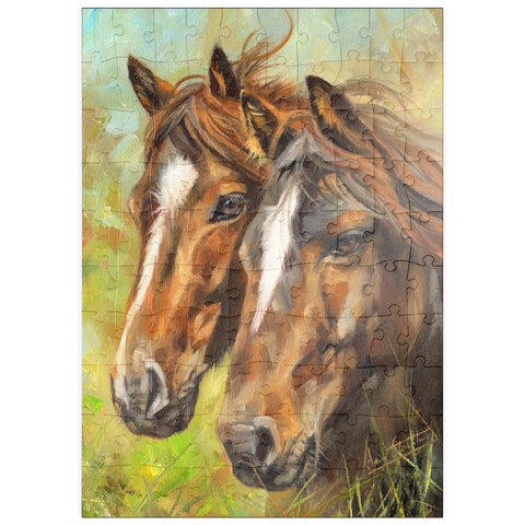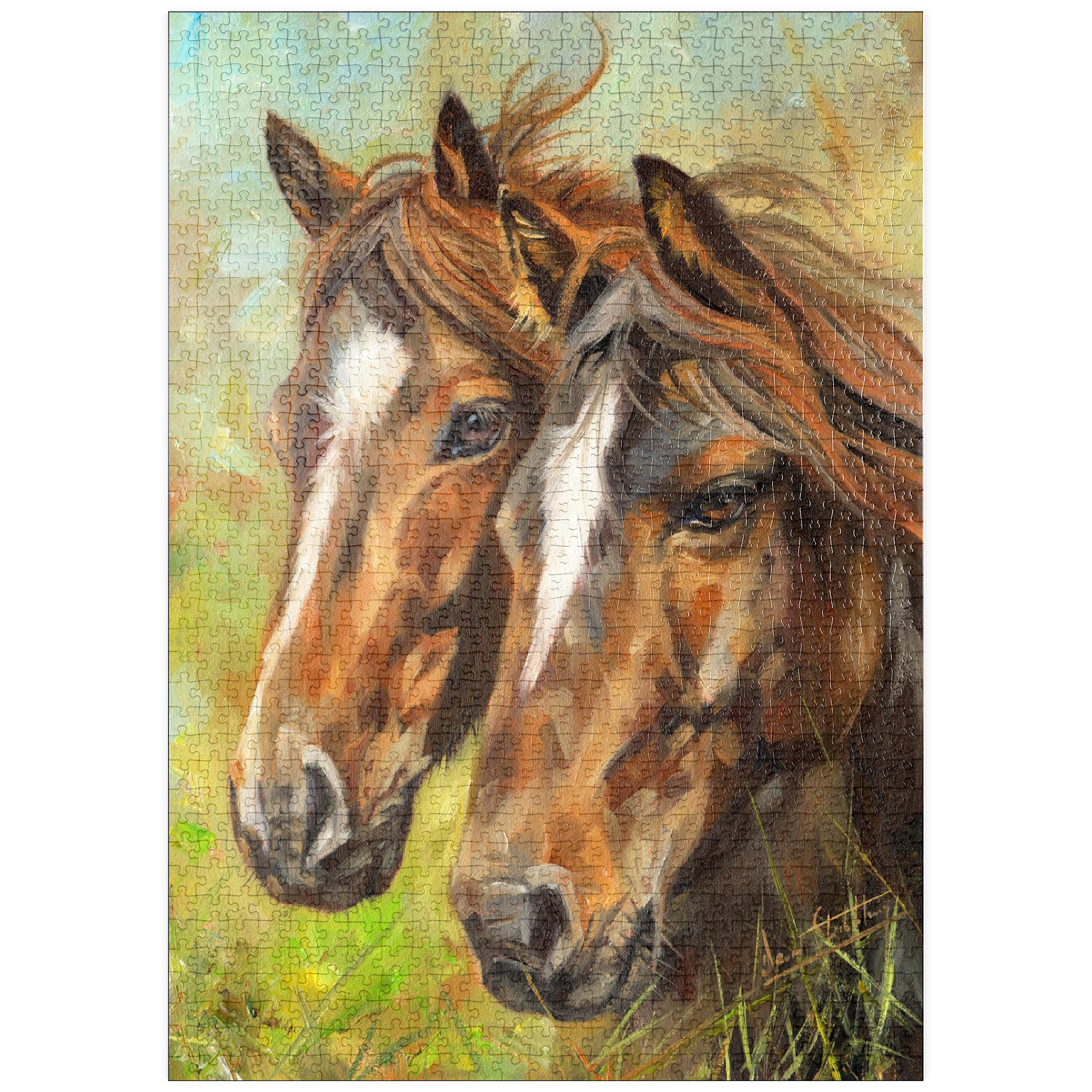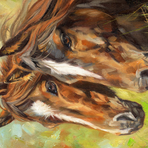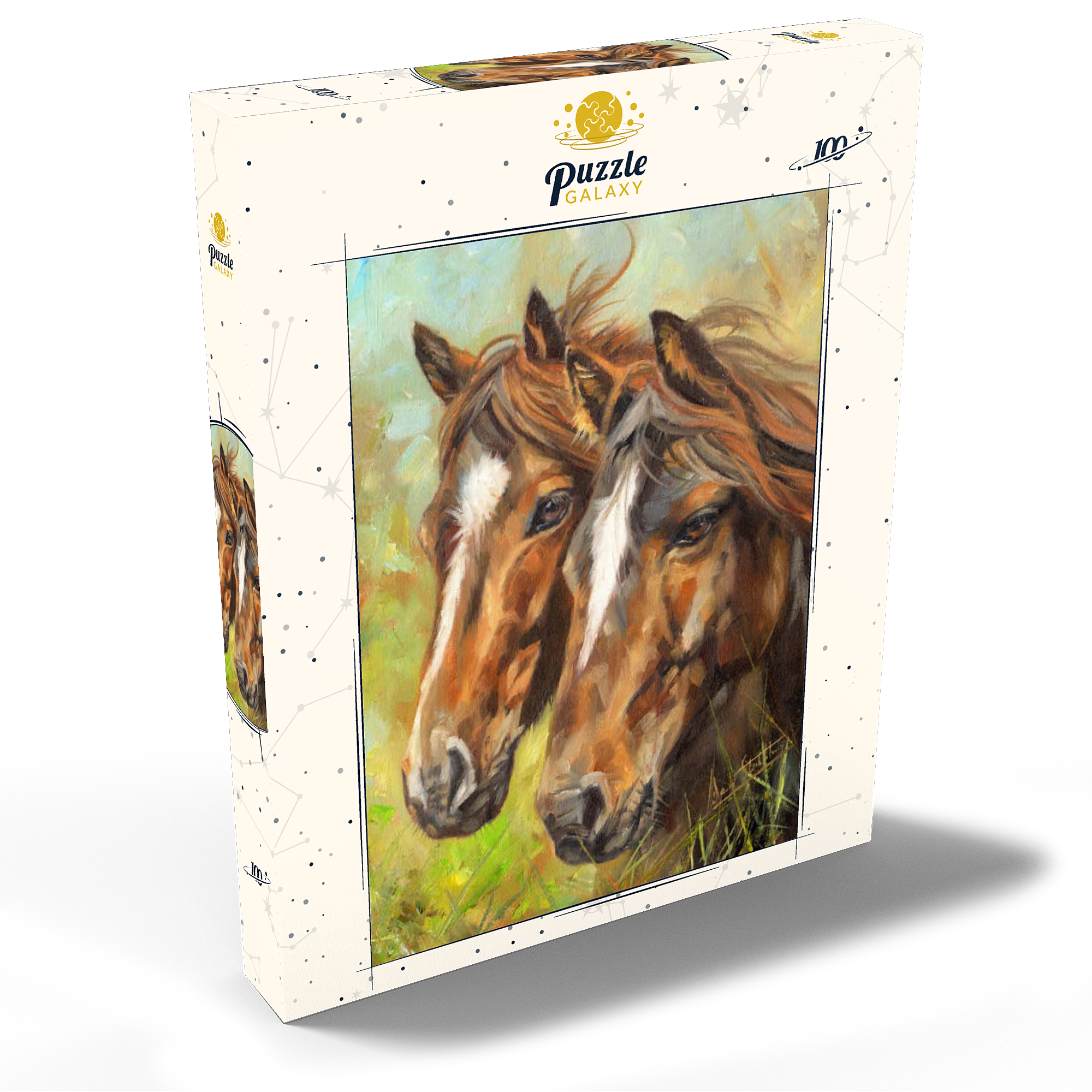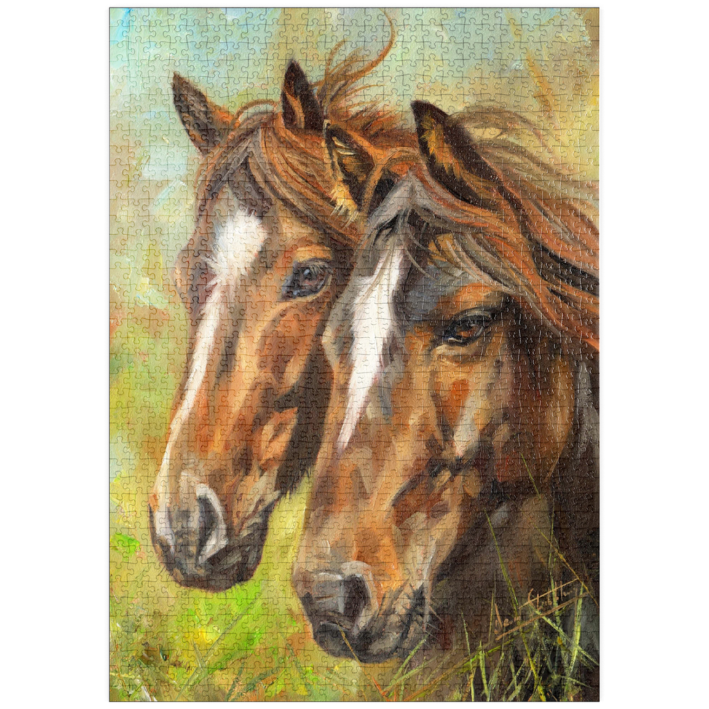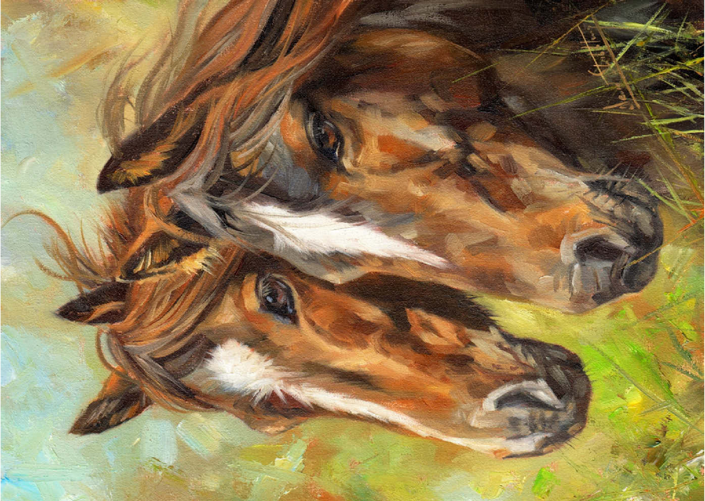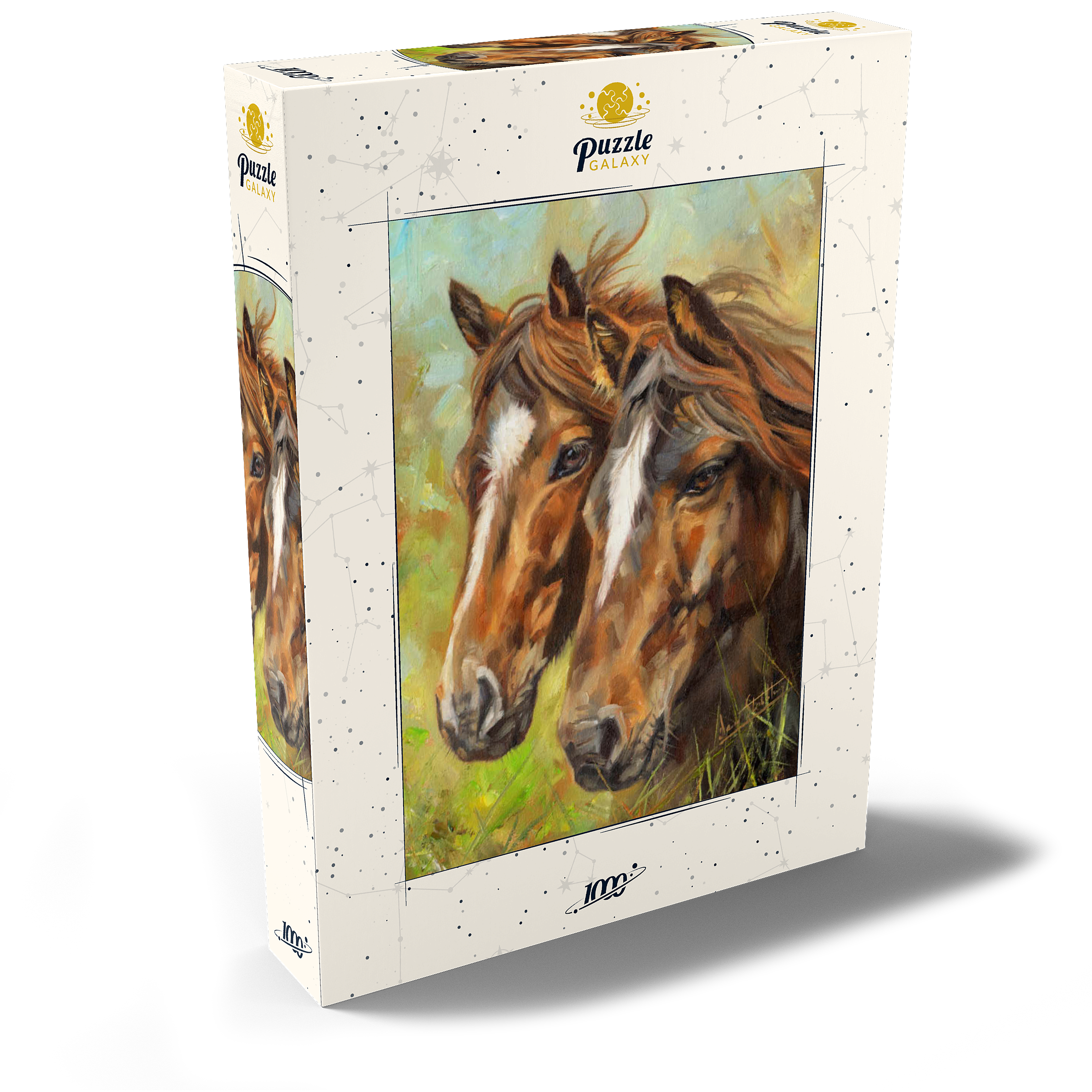 Ein herzerwärmendes Porträt von zwei Pferden, die eng beieinander auf einer sonnenbeschienenen Weide stehen. Ihre ausdrucksstarken Augen und das weiche braune Fell mit den weißen Abzeichen sind wunderschön detailliert und zeigen die sanfte Verbindung zwischen den beiden. Die dynamischen Pinselstriche und der lebendige Hintergrund in Grün- und Blautönen verleihen Energie und Wärme und fangen die ruhige Schönheit dieser majestätischen Tiere in einer natürlichen Umgebung ein.