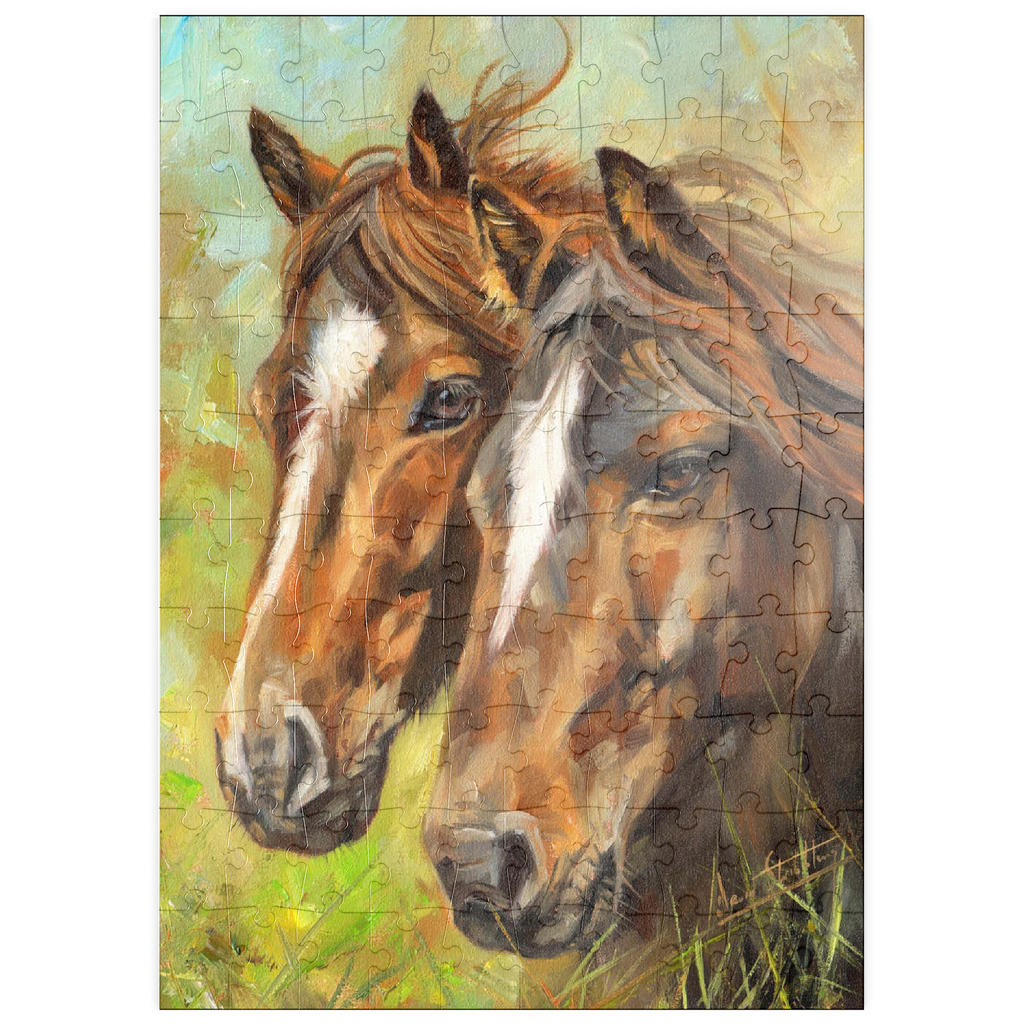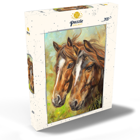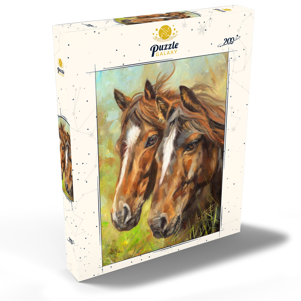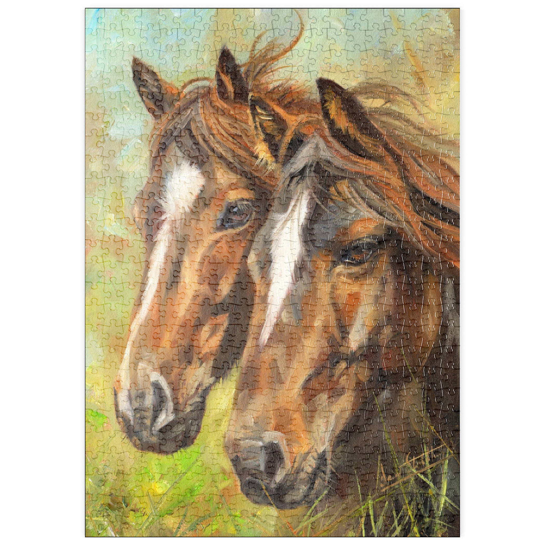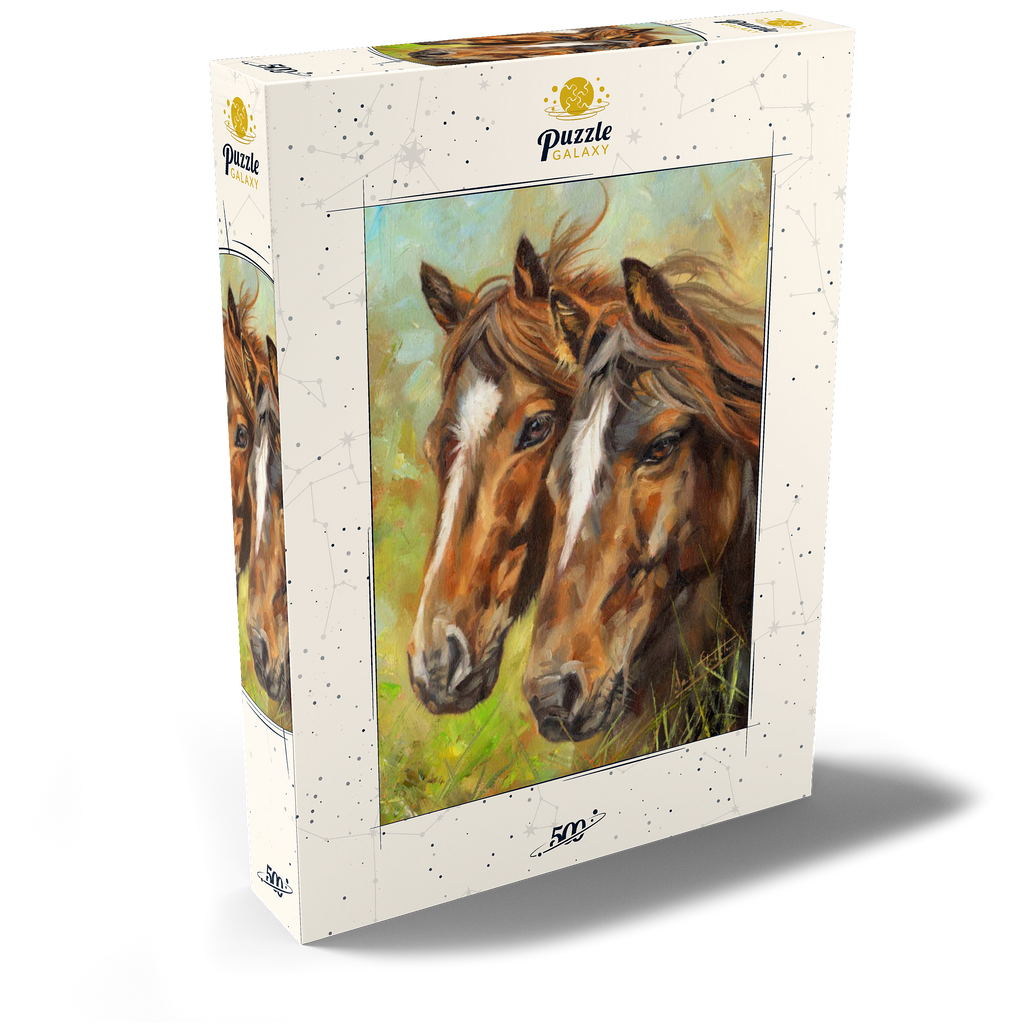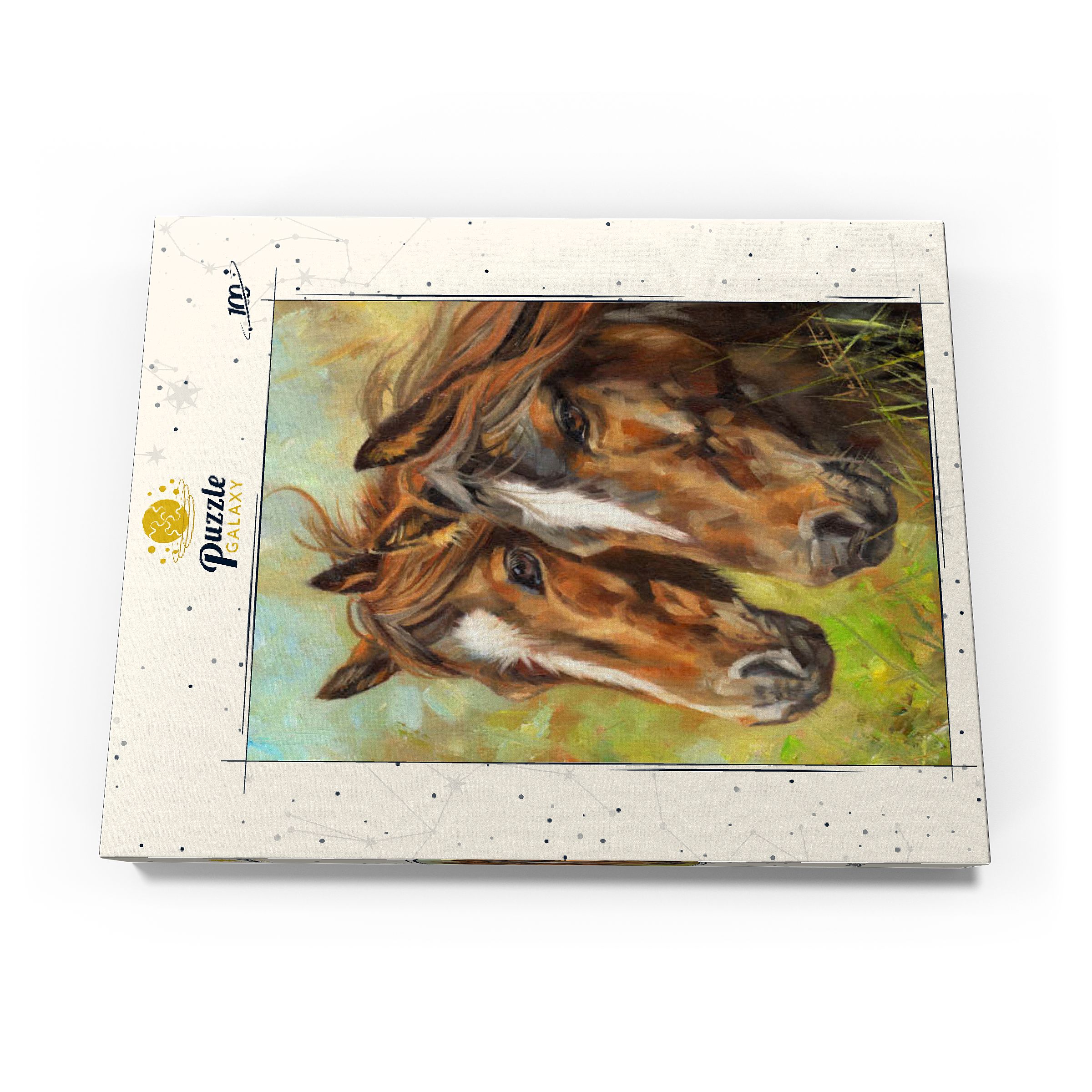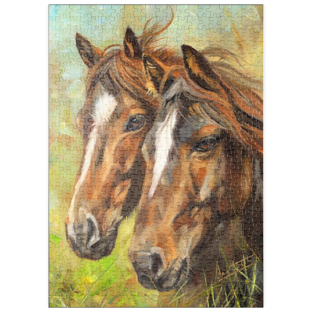 Ein herzerwärmendes Porträt von zwei Pferden, die eng beieinander auf einer sonnenbeschienenen Weide stehen. Ihre ausdrucksstarken Augen und das weiche braune Fell mit den weißen Abzeichen sind wunderschön detailliert und zeigen die sanfte Verbindung zwischen den beiden. Die dynamischen Pinselstriche und der lebendige Hintergrund in Grün- und Blautönen verleihen Energie und Wärme und fangen die ruhige Schönheit dieser majestätischen Tiere in einer natürlichen Umgebung ein.