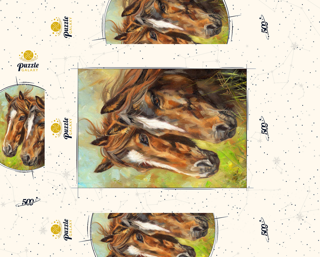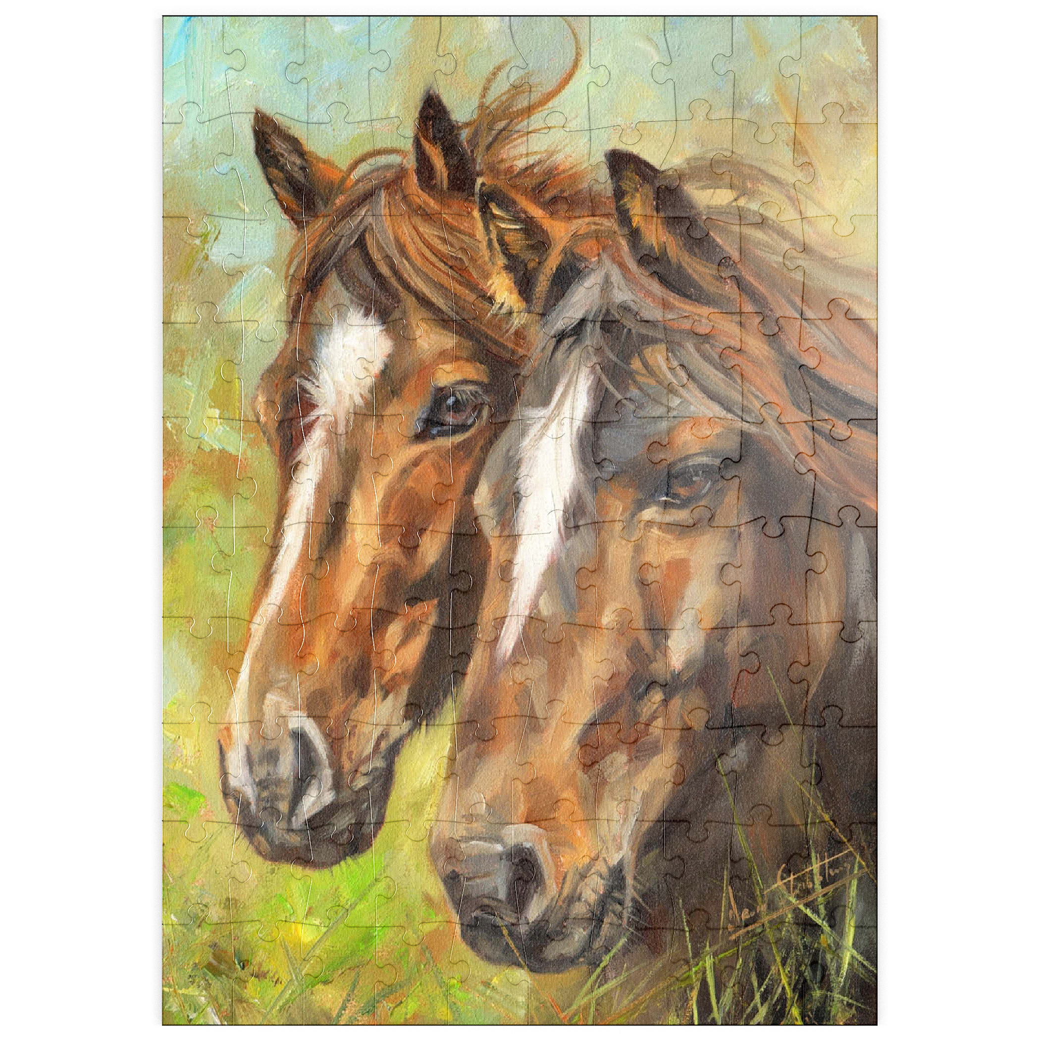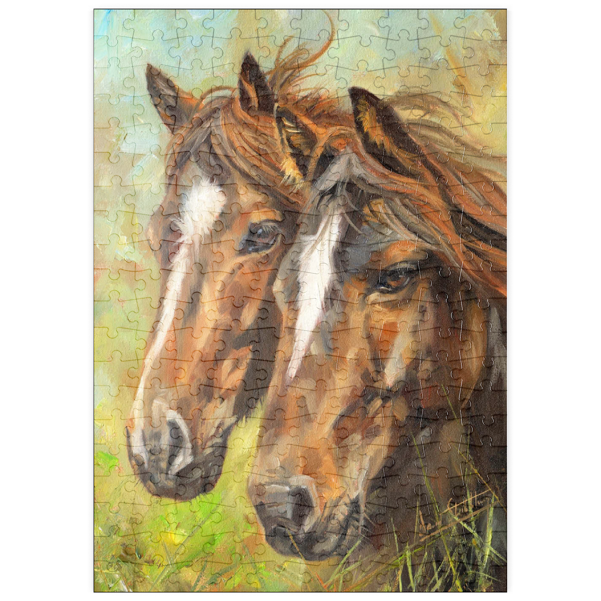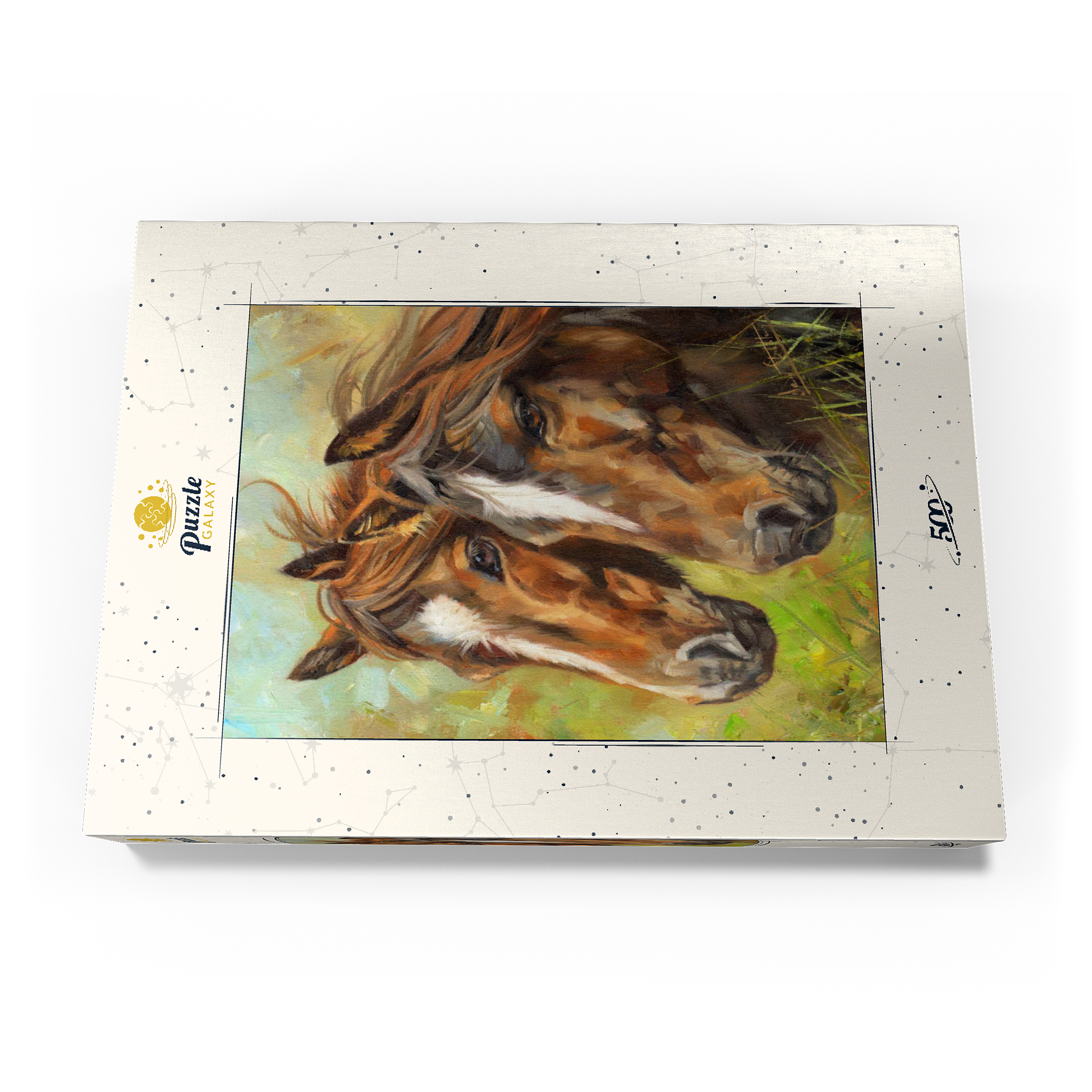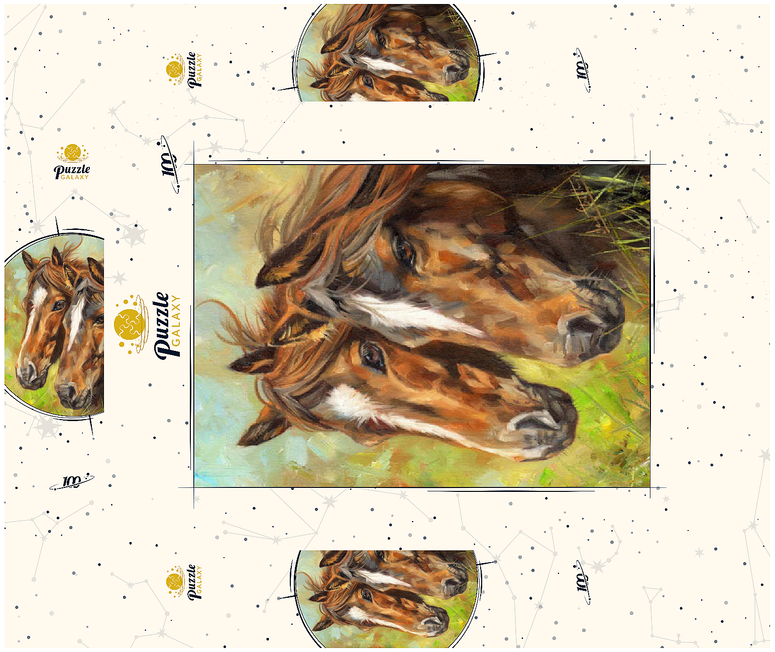 Ein herzerwärmendes Porträt von zwei Pferden, die eng beieinander auf einer sonnenbeschienenen Weide stehen. Ihre ausdrucksstarken Augen und das weiche braune Fell mit den weißen Abzeichen sind wunderschön detailliert und zeigen die sanfte Verbindung zwischen den beiden. Die dynamischen Pinselstriche und der lebendige Hintergrund in Grün- und Blautönen verleihen Energie und Wärme und fangen die ruhige Schönheit dieser majestätischen Tiere in einer natürlichen Umgebung ein.