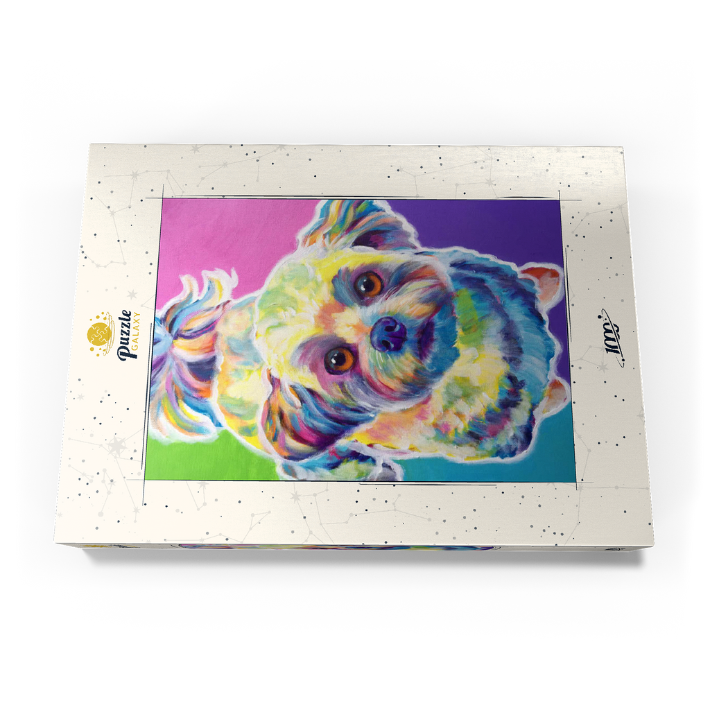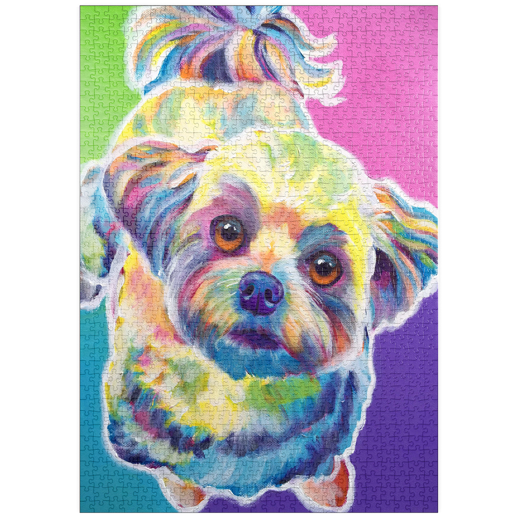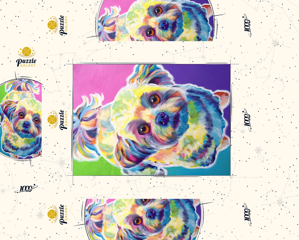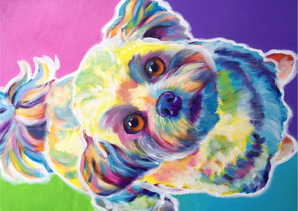 Ein entzückendes und lebhaftes Porträt eines Shih Tzu, das seine großen, ausdrucksstarken braunen Augen und sein flauschiges Fell in kräftigen Strichen in Gelb, Blau, Lila und Rosa zeigt. Der Hintergrund geht nahtlos in Grün, Rosa und Lila über und schafft so eine lebendige und fröhliche Komposition. Dieses moderne Kunstwerk fängt die verspielte und anhängliche Natur der Rasse ein und verbindet leuchtende Farben mit einem liebenswerten Ausdruck zu einem fröhlichen und dynamischen Werk.