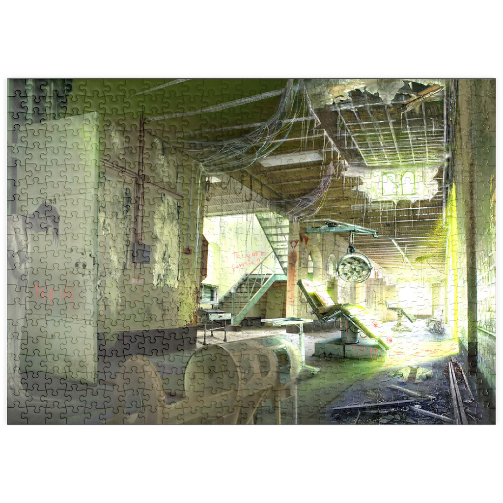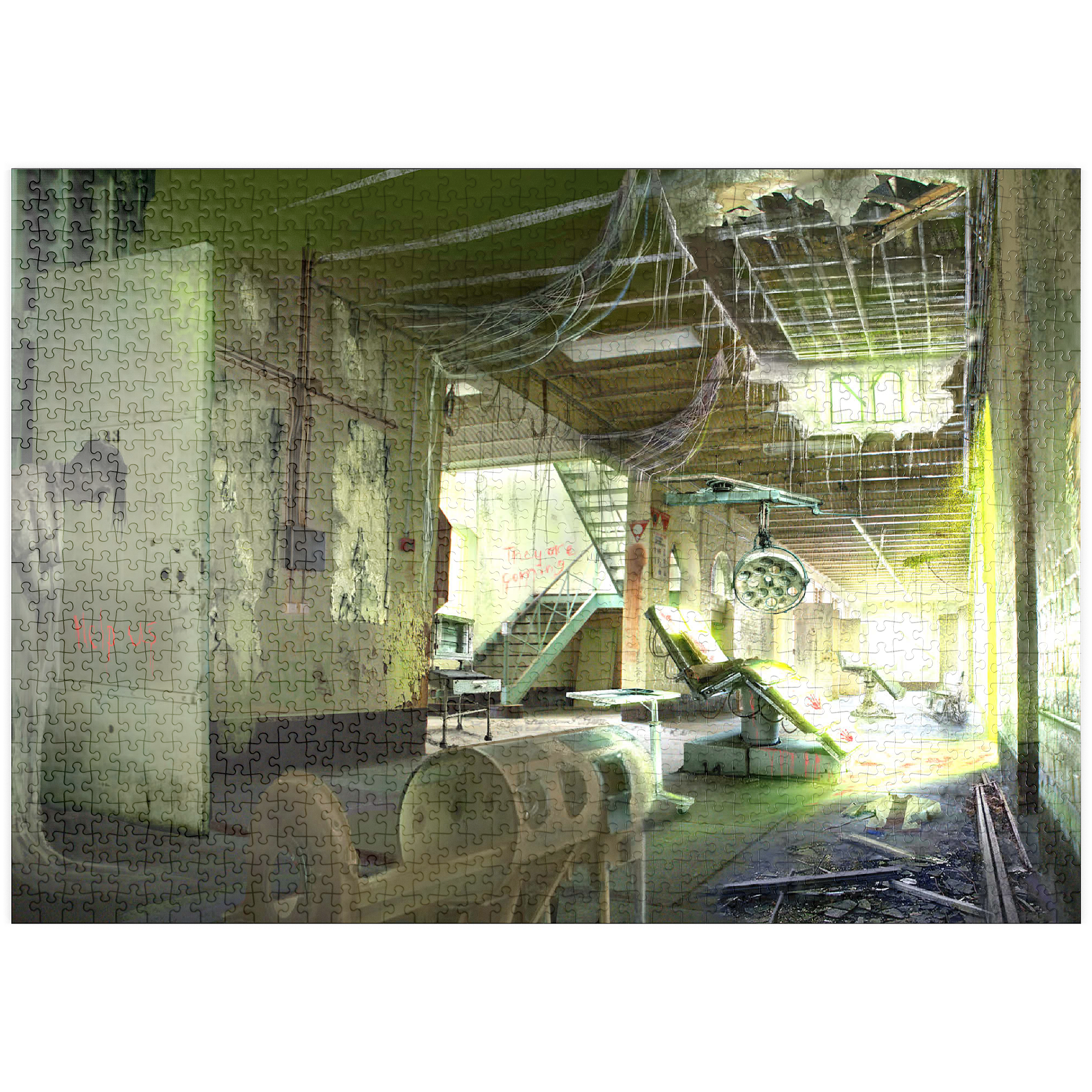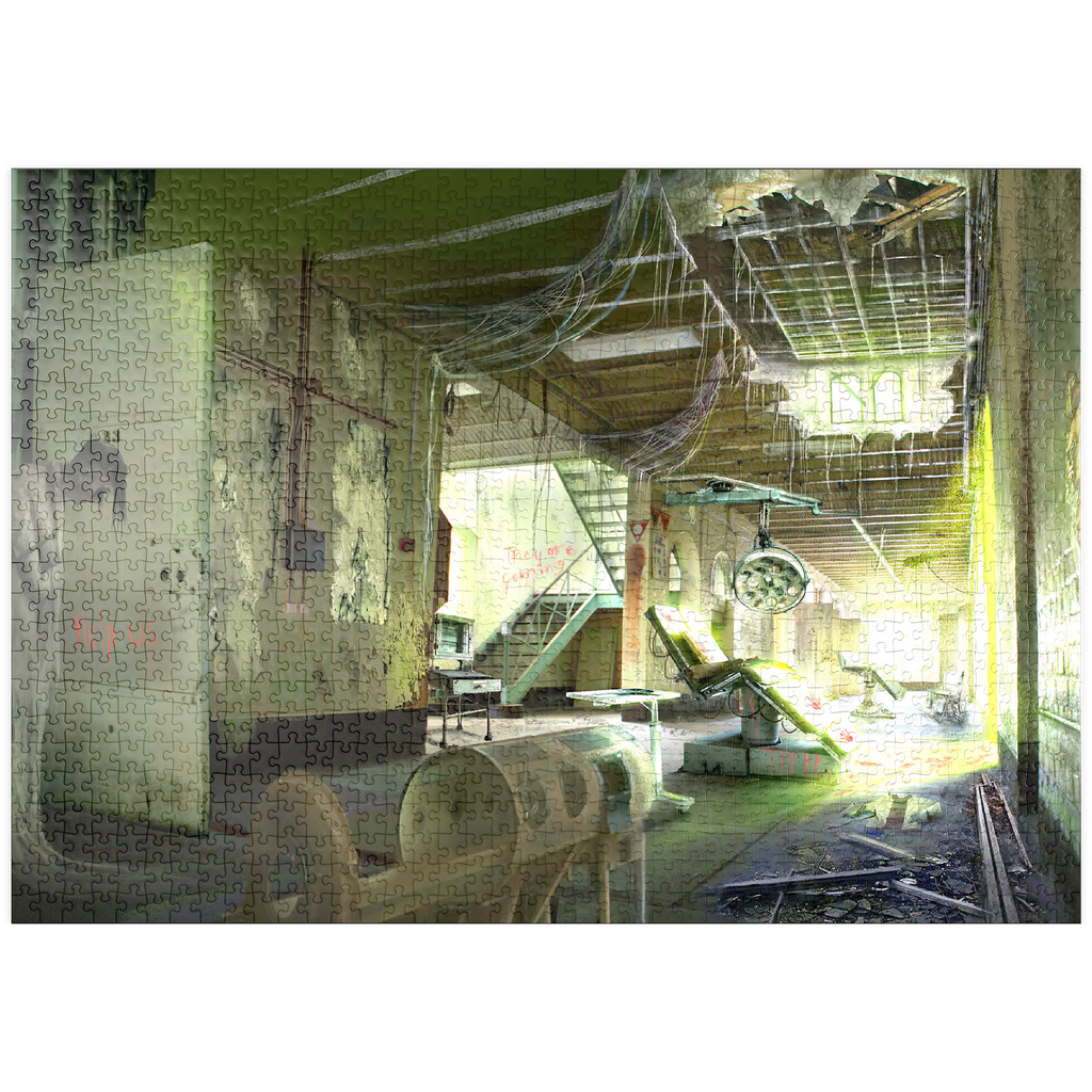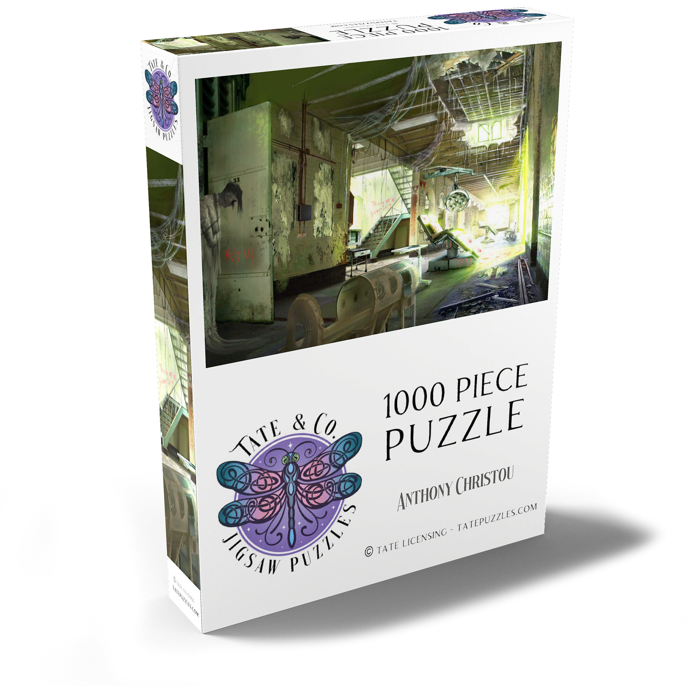 Echoes of the Asylum von Anthony Christou ist ein erschreckendes Horrorbild, das die verfallenen Überreste einer verlassenen psychiatrischen Anstalt einfängt. In unheimliches grünes und kränkliches gelbes Licht getaucht, offenbart die Szene rissige Fliesen, abblätternde Farbe und zerbrochene medizinische Geräte, die über den Boden verstreut sind. Verrostete Krankentragen und zerbrochene Schränke deuten auf eine vergessene Vergangenheit hin. Drähte hängen bedrohlich wie Skelettfinger von der Decke. Auf der linken Seite steht ein einsamer Patient – regungslos, vielleicht beobachtend – eine beunruhigende Präsenz an einem längst verlassenen Ort. Die Stille ist ohrenbetäubend und wird nur durch die imaginären Echos des Wahnsinns unterbrochen. Dieses Werk ruft Angst, Verfall und die Spuren eines Traumas hervor.