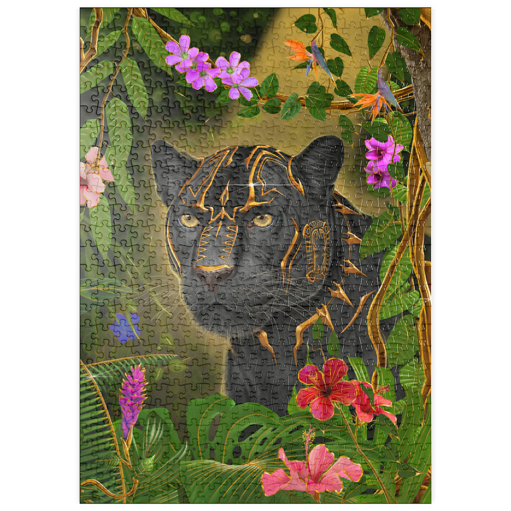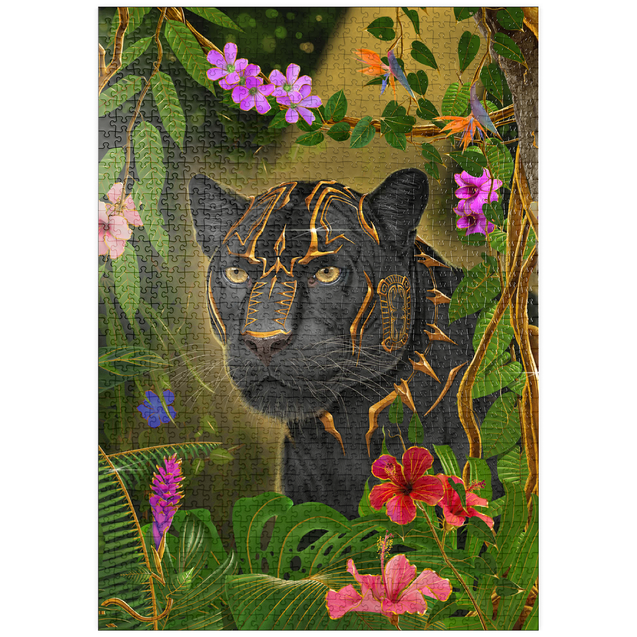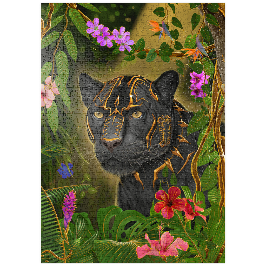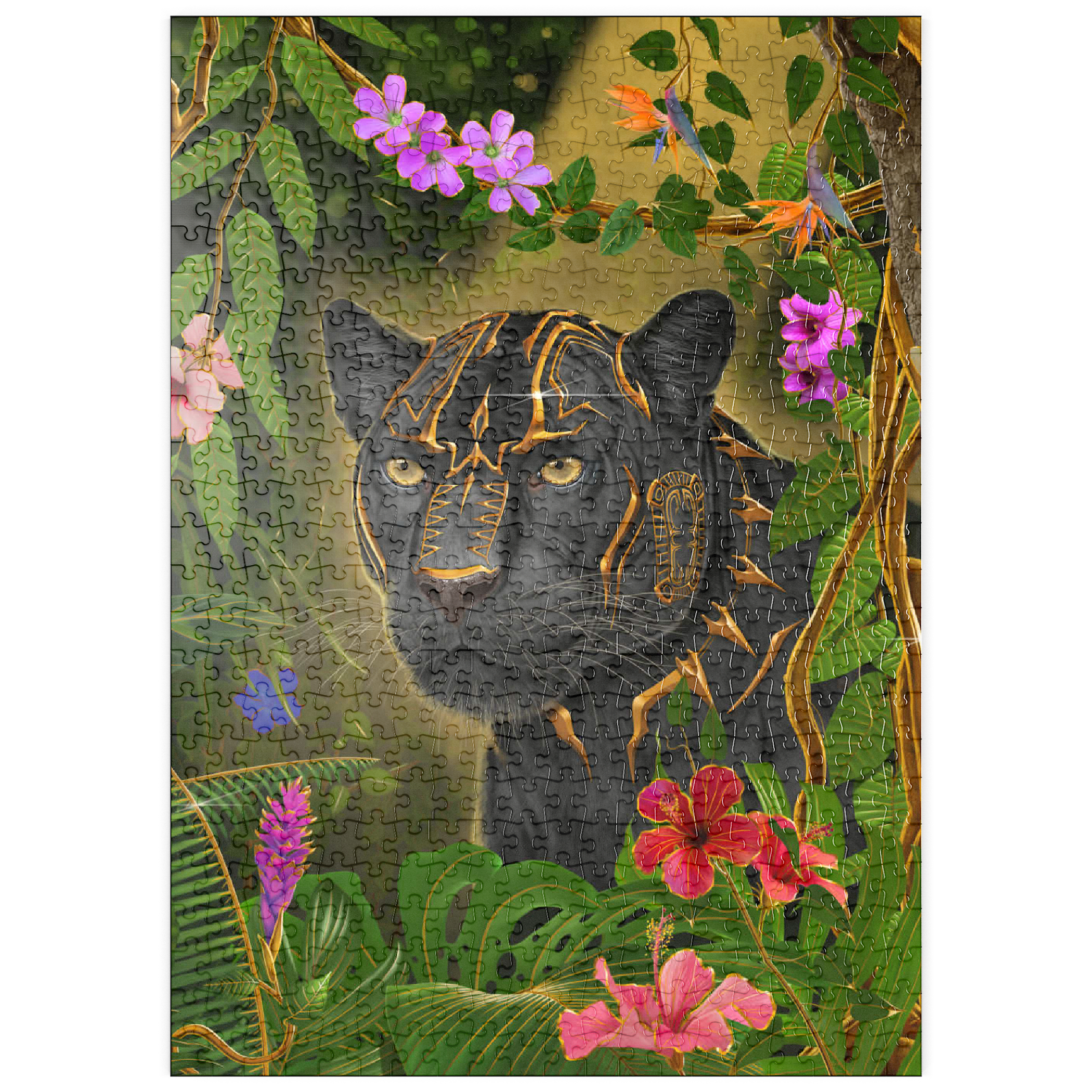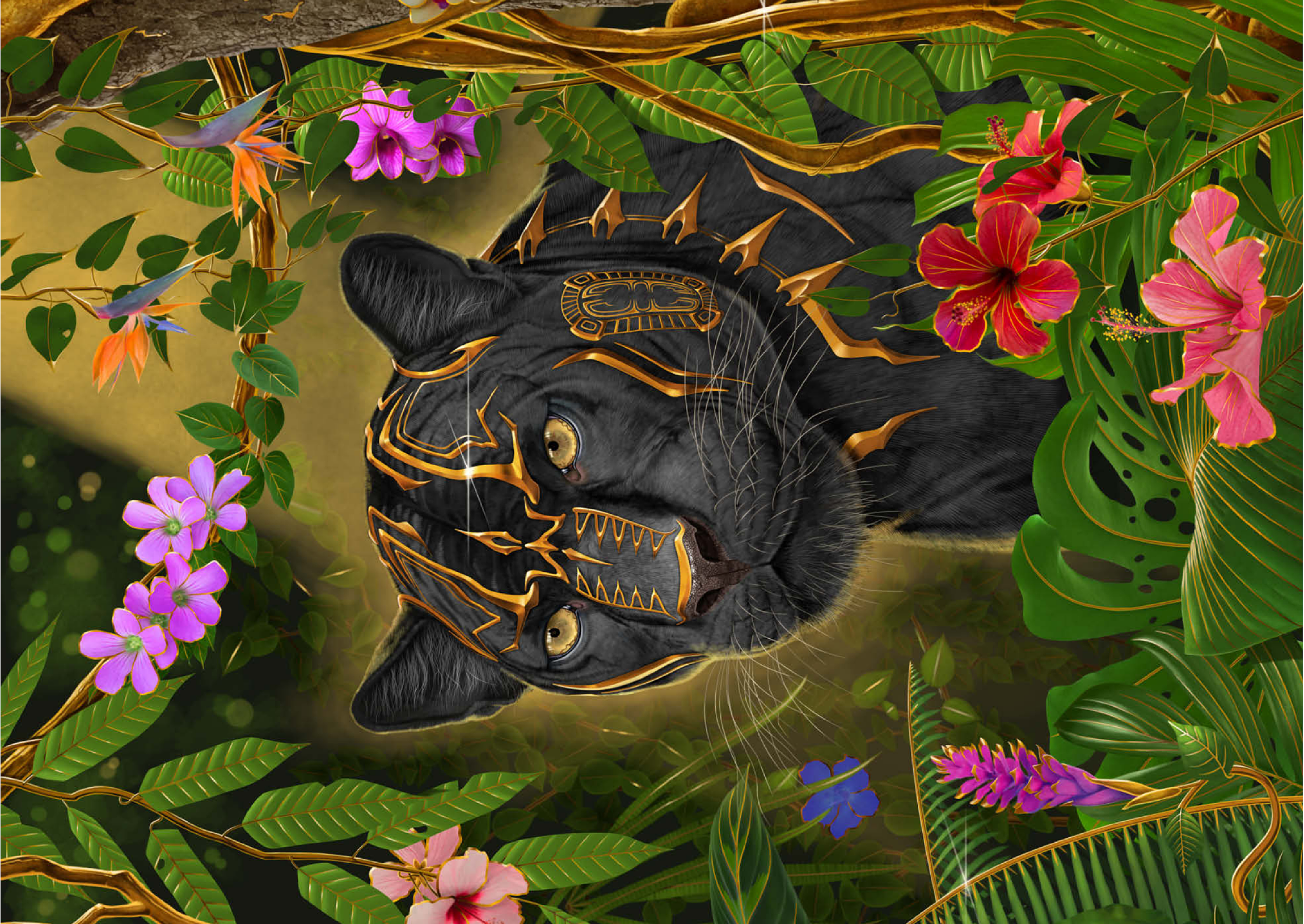 Stellen Sie sich eine Welt vor, in der Gold in der Periodentabelle der Natur eine viel bedeutendere Rolle spielt. Das Kunstwerk zeigt einen schwarzen Panther, der mit goldenen Markierungen im Tribal-Stil verziert ist und sich in einer üppigen, lebendigen tropischen Umgebung befindet. Der Blick des Panthers ist direkt und befehlend, während das umgebende Laub – darunter Hibiskusblüten, Orchideen, Paradiesvogelblumen und verschiedene tropische Blätter – in satten Farben und mit goldenen Akzenten dargestellt ist, was ein Gefühl von Opulenz und exotischer Schönheit vermittelt. Das digital gemalte Bild kombiniert die realistische Darstellung des Tieres mit einer stilisierten, fast dekorativen Gestaltung der Pflanzen und der Markierungen des Panthers.