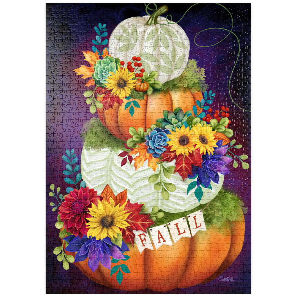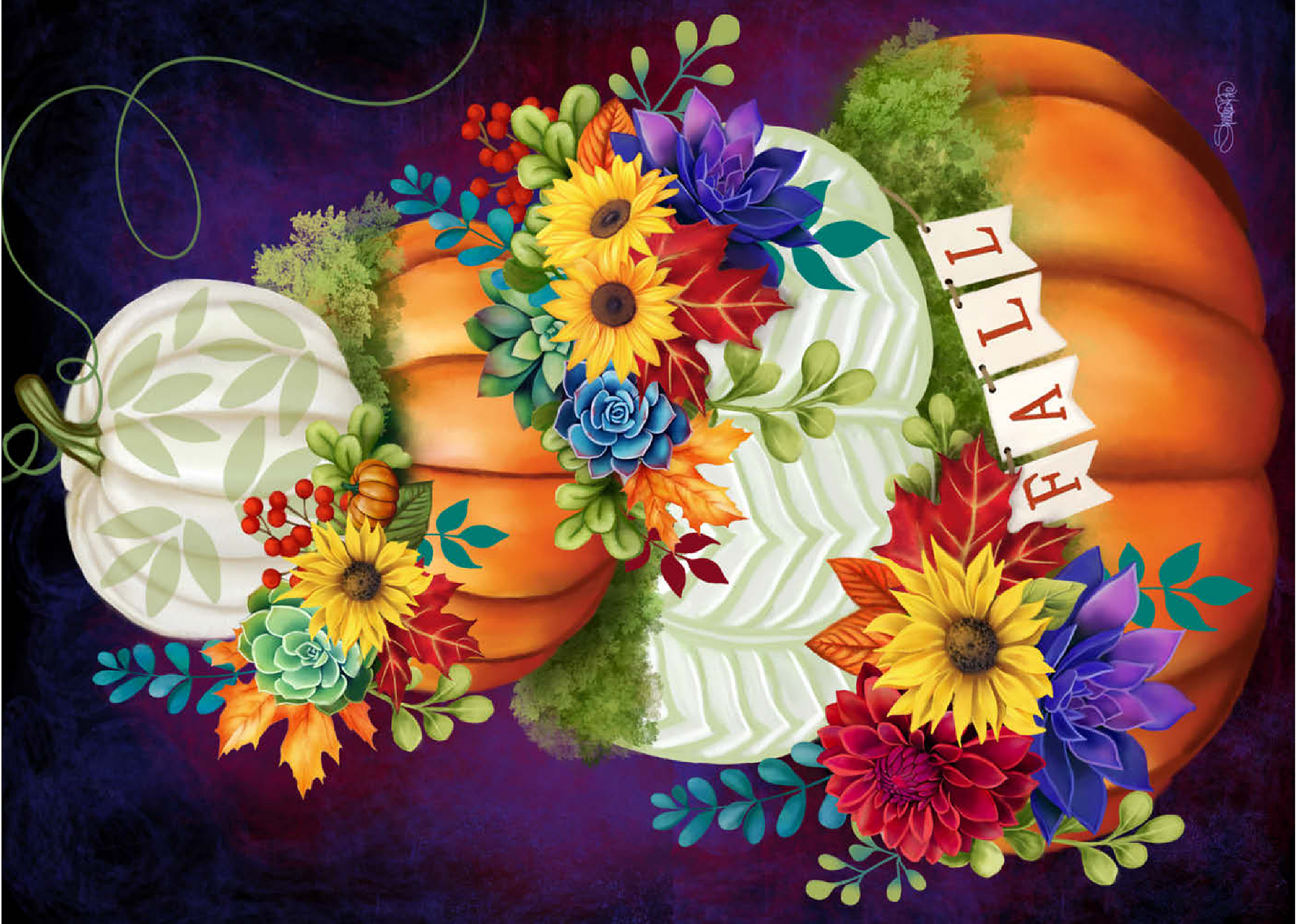 Eine lebendige Komposition von Sheena Pike, die ein klassisches Herbstarrangement präsentiert. Eine reichhaltige Farbpalette, die von traditionellen Herbsttönen dominiert wird und mit luxuriösen Violetttönen verwoben ist, schafft eine optisch auffällige und raffinierte Ästhetik. Der Blickfang ist ein sorgfältig zusammengestellter Stapel von Kürbissen, der kunstvoll mit strukturiertem Laub und eleganten Sukkulenten kombiniert ist und ein Gefühl von zeitloser Ernte und raffinierter saisonaler Schönheit vermittelt.