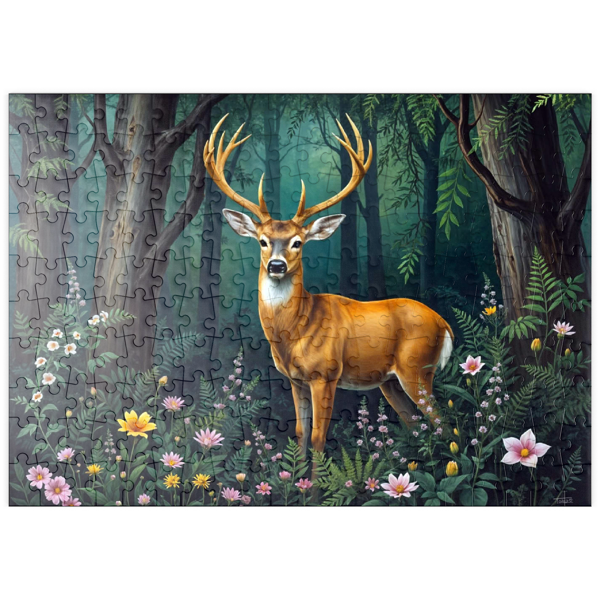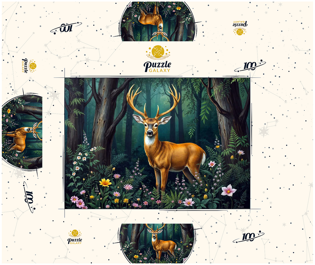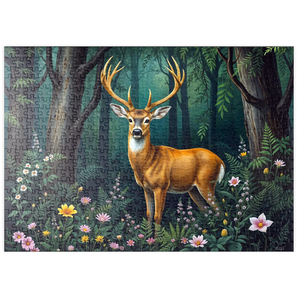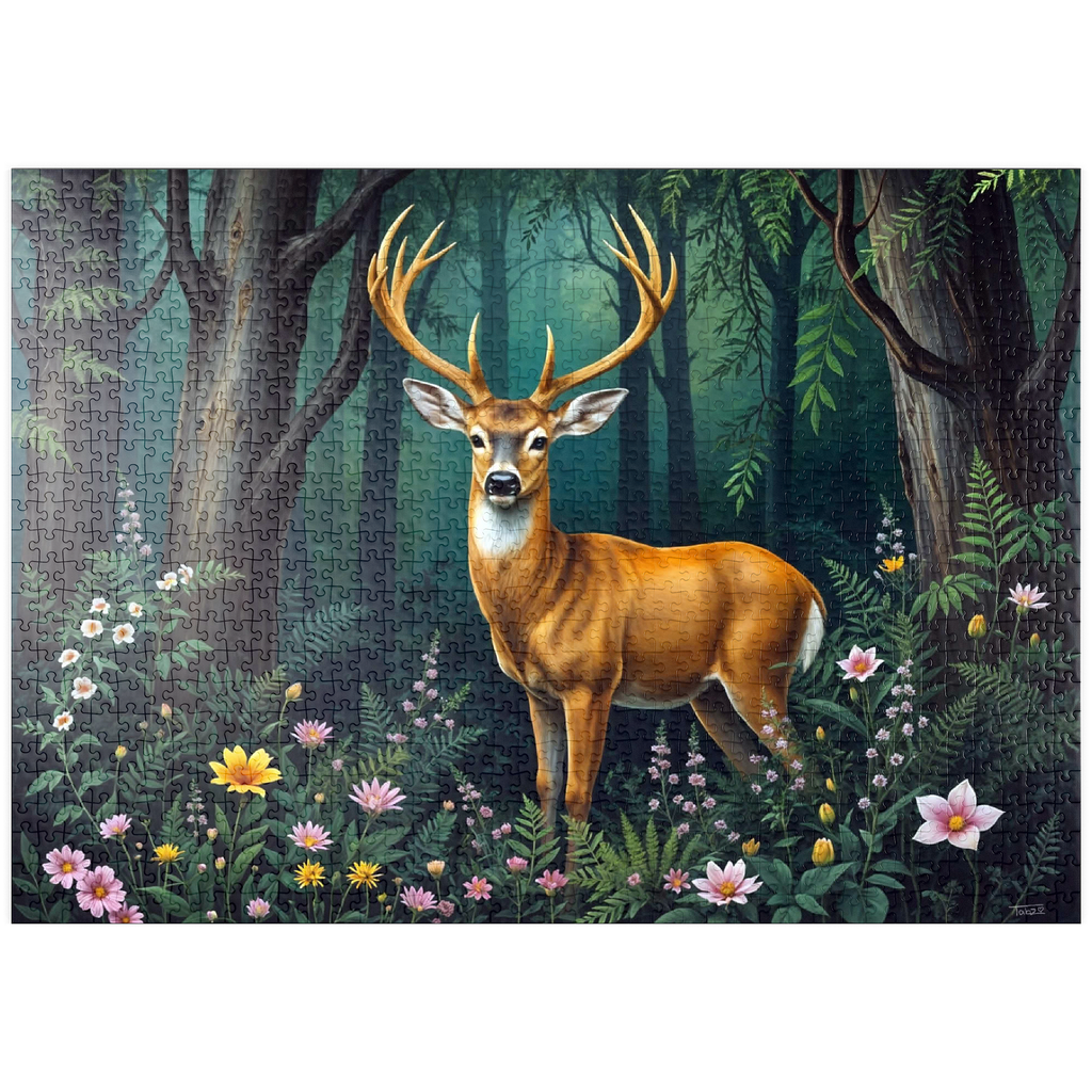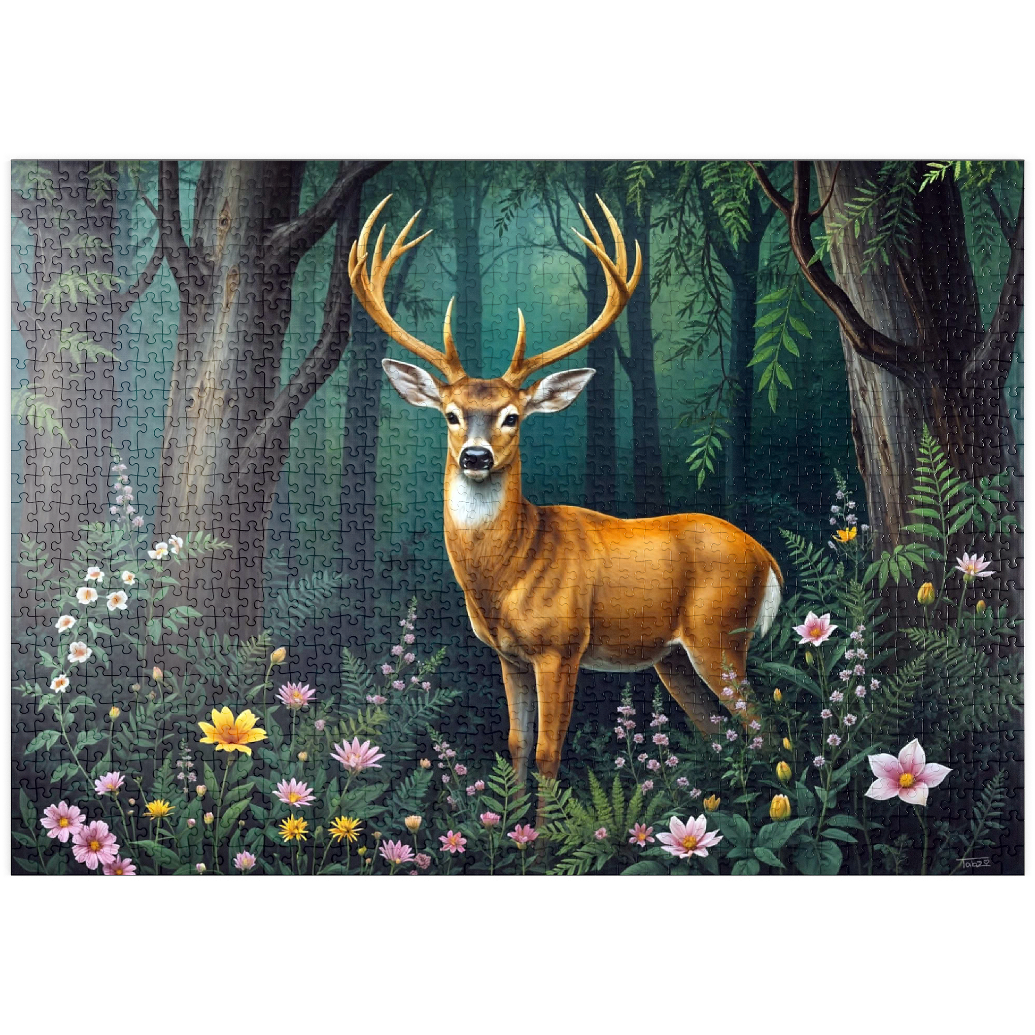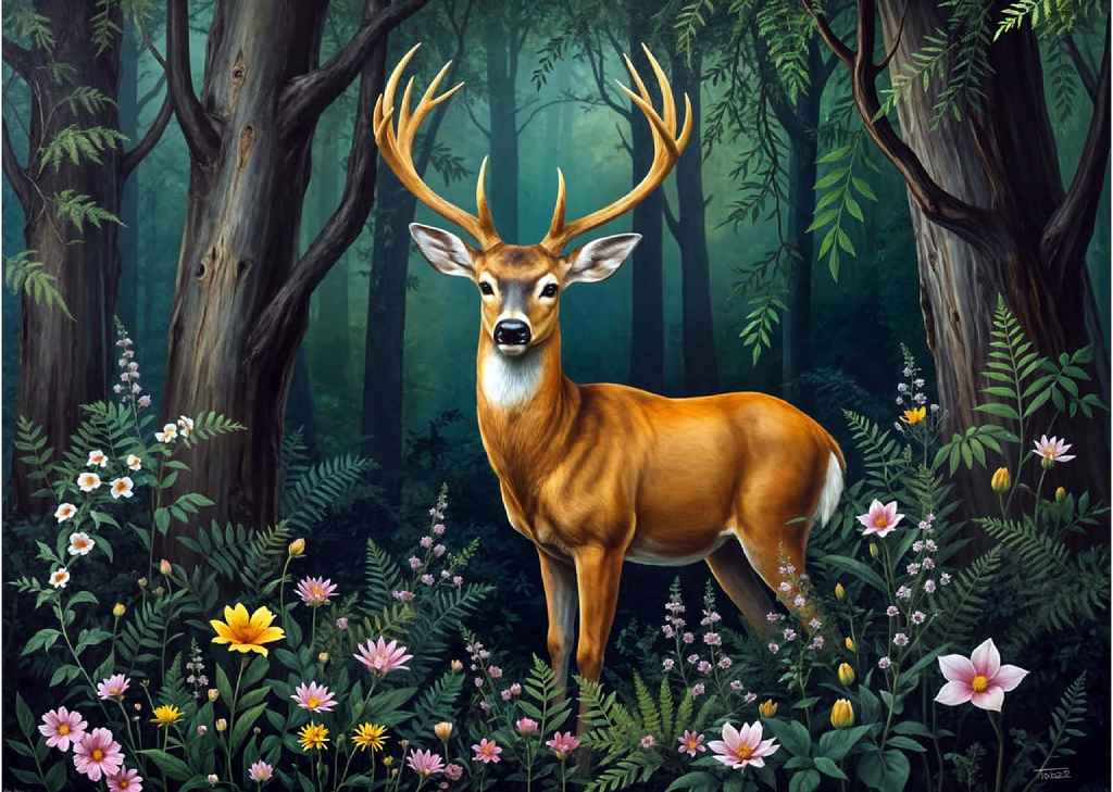 Ein faszinierendes digitales Kunstwerk, das einen majestätischen Hirsch zeigt, der anmutig in einer üppigen Waldlichtung steht. Das goldbraune Fell und das beeindruckende Geweih des Hirsches heben sich vom leuchtend grünen Laub des dichten Waldes ab. Sanftes Licht fällt durch die hohen Bäume und taucht den Waldboden, der mit zarten Wildblumen in Rosa-, Gelb- und Weißtönen geschmückt ist, in ein ruhiges Licht. Die friedliche Atmosphäre und die detailreiche Kunstfertigkeit schaffen eine ruhige Szene, die perfekt für Naturliebhaber, Wildtierfans und Fans rustikaler Dekoration ist. Ideal als Wandkunst oder als Blickfang in Hütten, Lodges oder Räumen mit Naturthema.