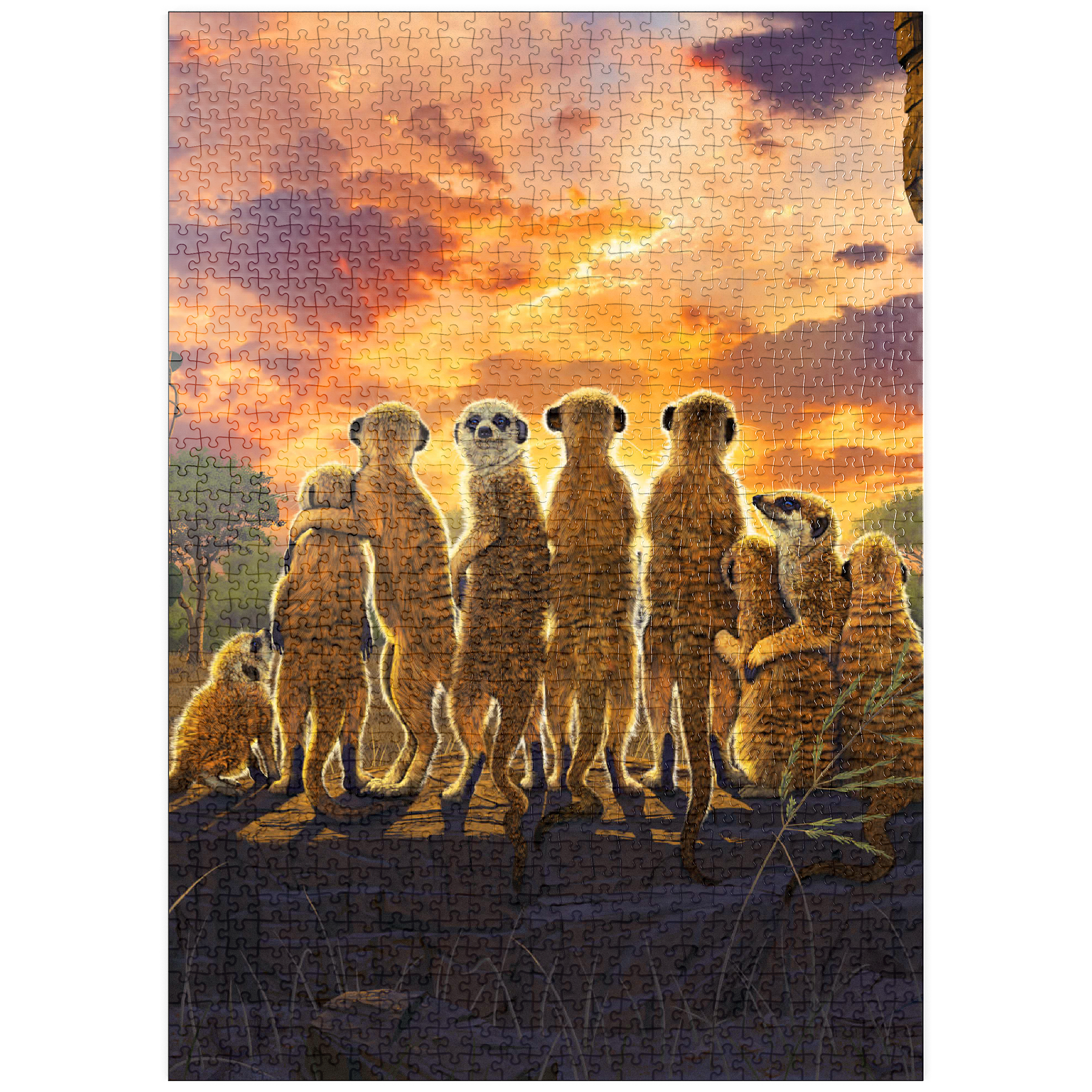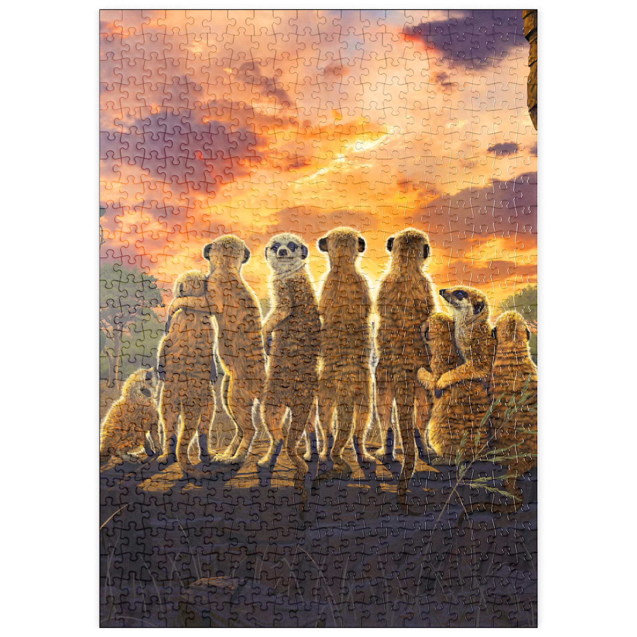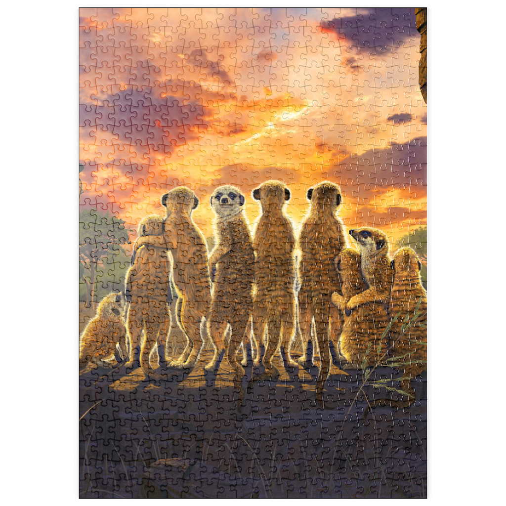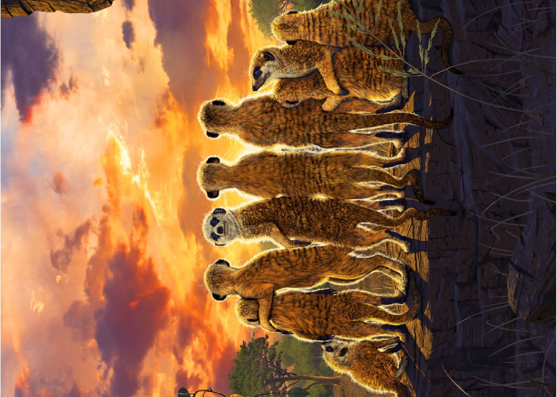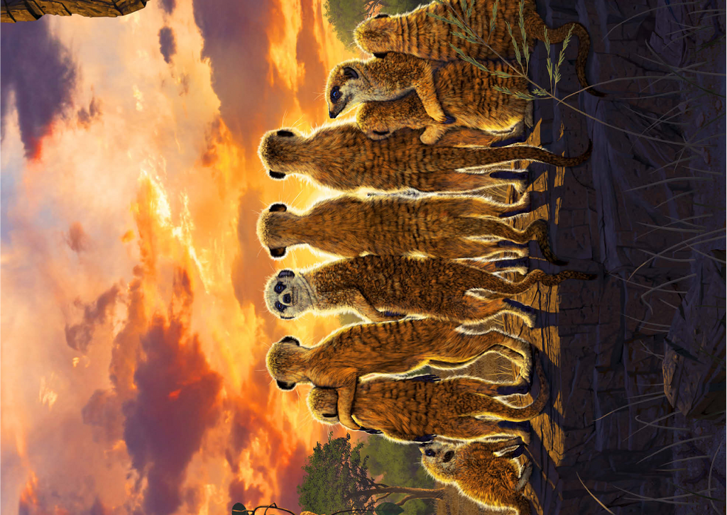 Das Kunstwerk zeigt eine Erdmännchenfamilie, die bei Sonnenuntergang auf einer Felsformation in einer afrikanischen Savanne steht. Die warmen Farben des Sonnenuntergangs spiegeln sich im Fell der Erdmännchen und in der gesamten Atmosphäre der Szene wider. Der Hintergrund besteht aus spärlicher Vegetation und einem Felsvorsprung, was auf einen typischen Lebensraum für Wildtiere hindeutet. Die Gesamtstimmung vermittelt ein Gefühl der friedlichen Kontemplation oder der ruhigen Beobachtung des Sonnenuntergangs, bevor die Tiere sich zur Ruhe begeben.