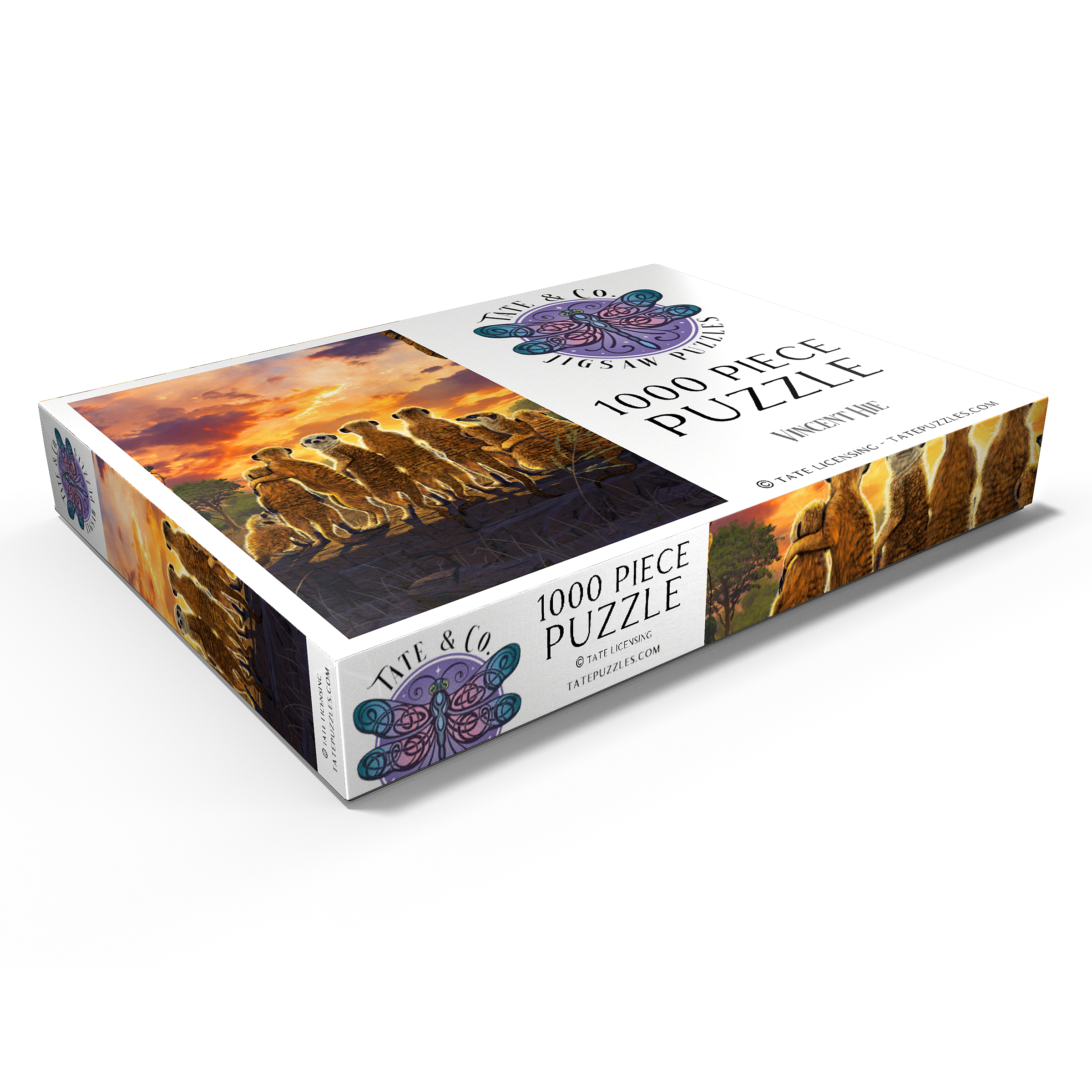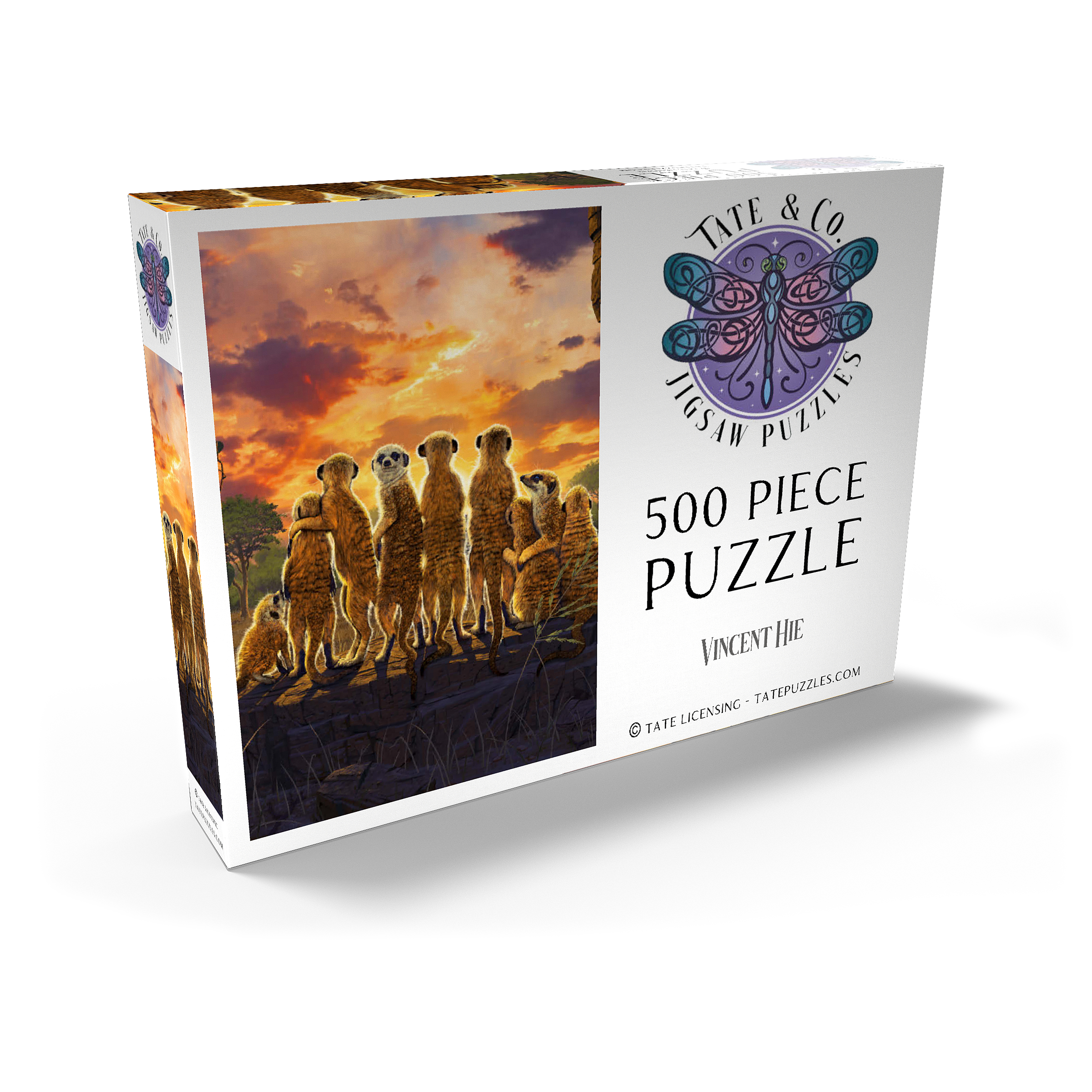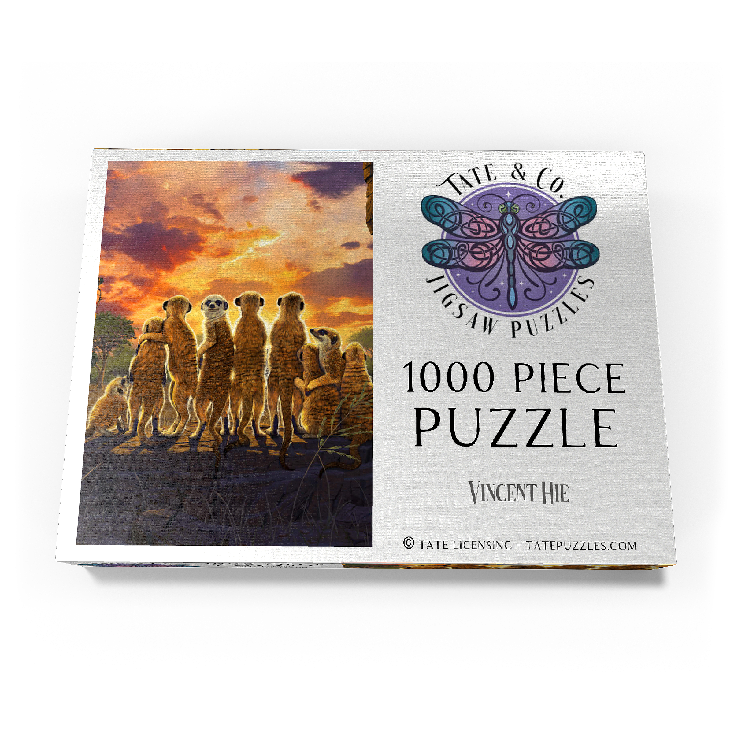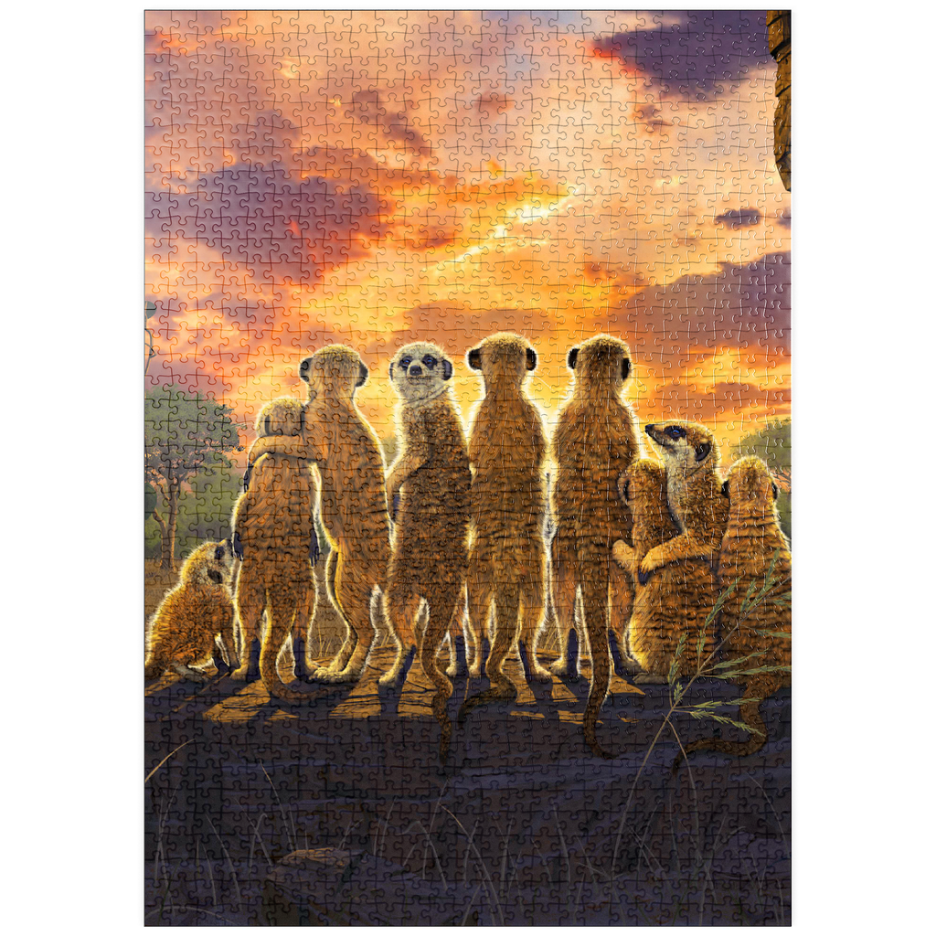 Das Kunstwerk zeigt eine Erdmännchenfamilie, die bei Sonnenuntergang auf einer Felsformation in einer afrikanischen Savanne steht. Die warmen Farben des Sonnenuntergangs spiegeln sich im Fell der Erdmännchen und in der gesamten Atmosphäre der Szene wider. Der Hintergrund besteht aus spärlicher Vegetation und einem Felsvorsprung, was auf einen typischen Lebensraum für Wildtiere hindeutet. Die Gesamtstimmung vermittelt ein Gefühl der friedlichen Kontemplation oder der ruhigen Beobachtung des Sonnenuntergangs, bevor die Tiere sich zur Ruhe begeben.