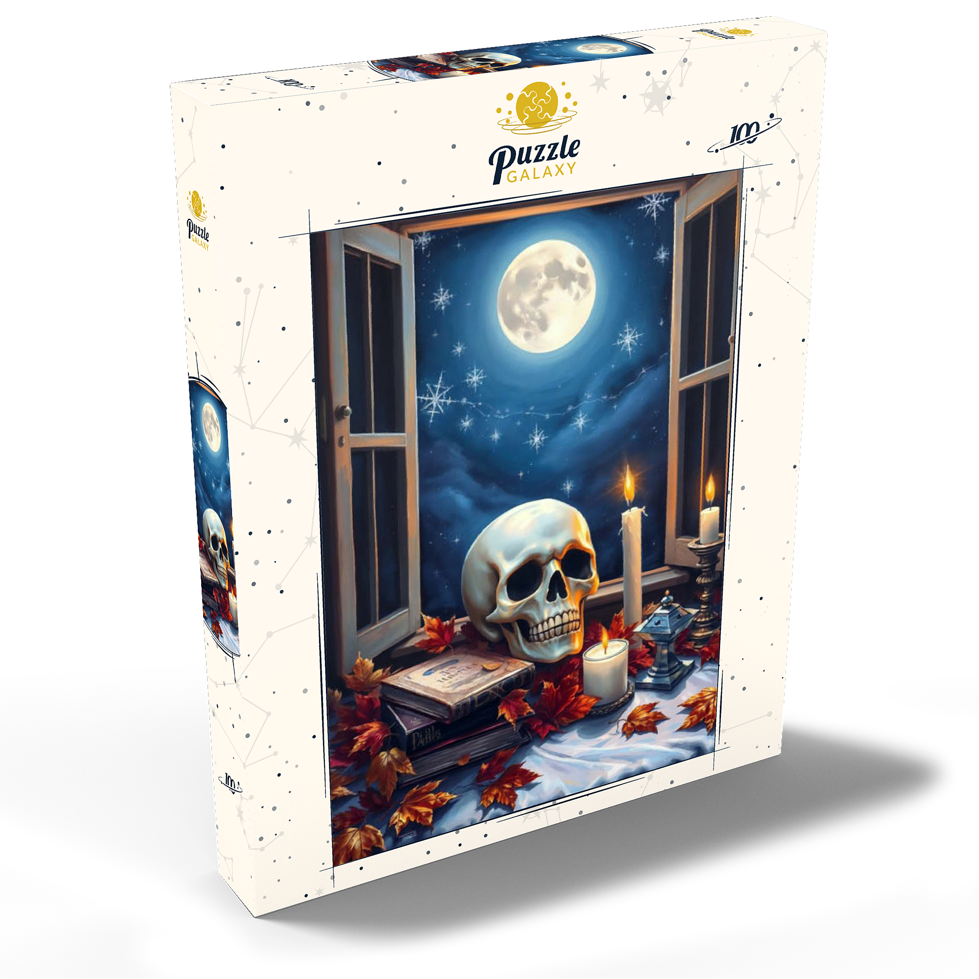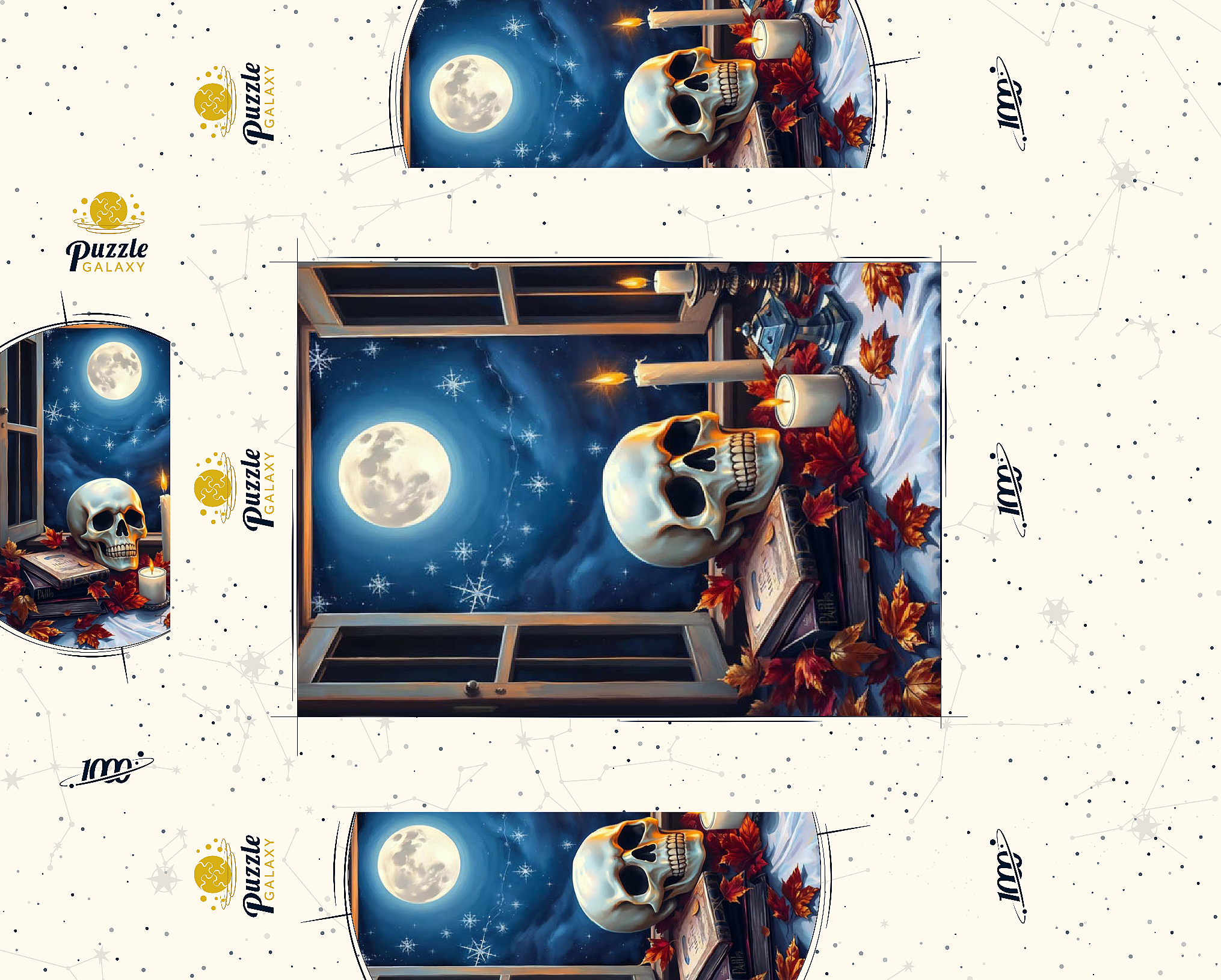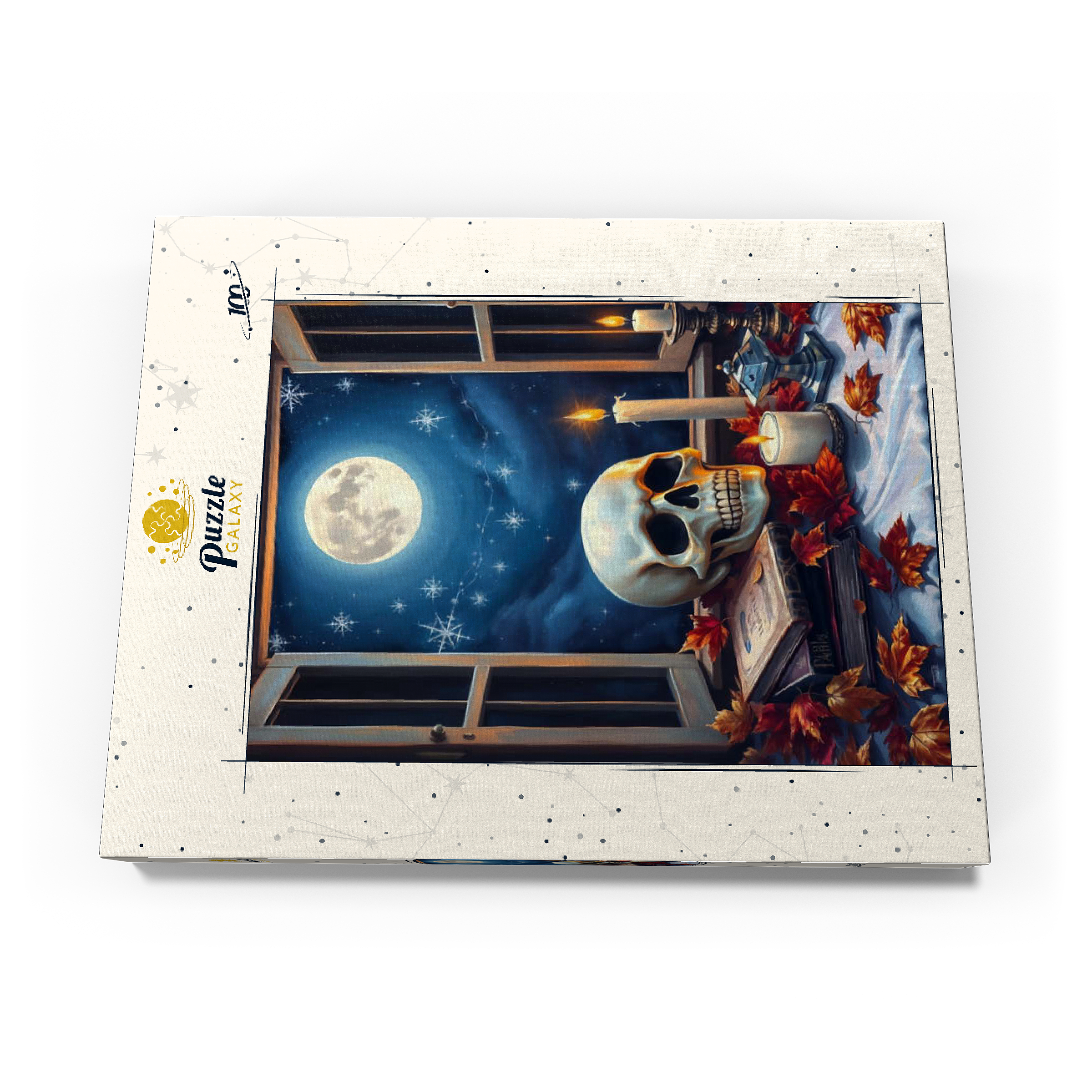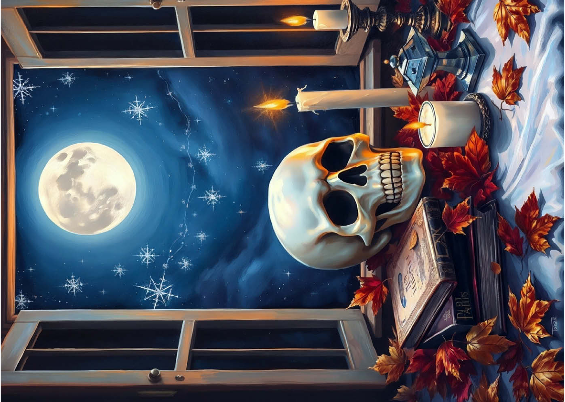 Ein faszinierendes digitales Kunstwerk, das eine mystische Stillleben-Szene vor einem leuchtenden Vollmond und einem sternenklaren Nachthimmel zeigt. Ein offenes Fenster rahmt den ätherischen Blick und wirft Mondlicht auf einen Tisch, der mit einem menschlichen Schädel, alten Büchern und flackernden Kerzen geschmückt ist. Herbstblätter in Rot- und Orangetönen umgeben das Arrangement und verleihen ihm einen Hauch von saisonaler Eleganz. Das sanfte Leuchten der Kerzen verstärkt die geheimnisvolle und atmosphärische Stimmung und weckt Assoziationen zu Themen wie Sterblichkeit, Reflexion und Übernatürlichem. Dieses Werk ist ideal für Liebhaber von Gothic-Dekor, Halloween-Ästhetik und Dark-Fantasy-Kunst und eignet sich perfekt, um jedem Raum eine stimmungsvolle, dramatische Note zu verleihen.