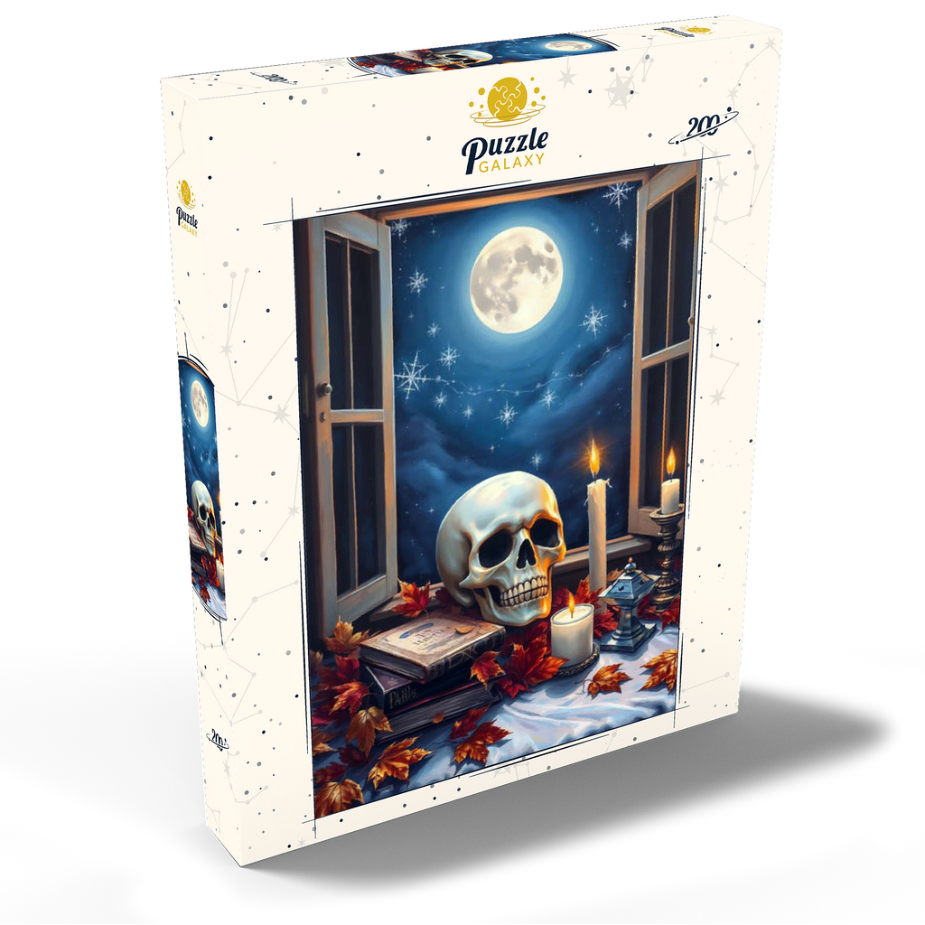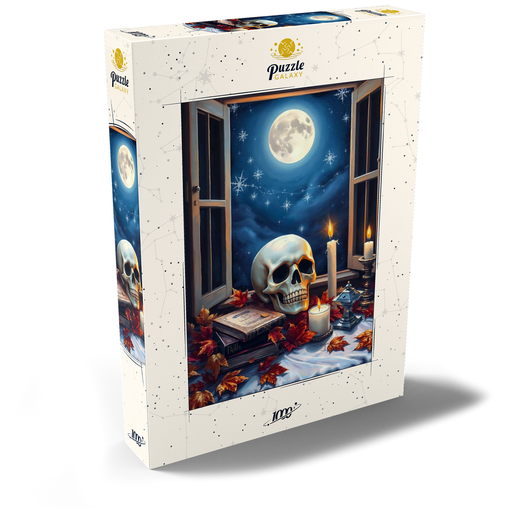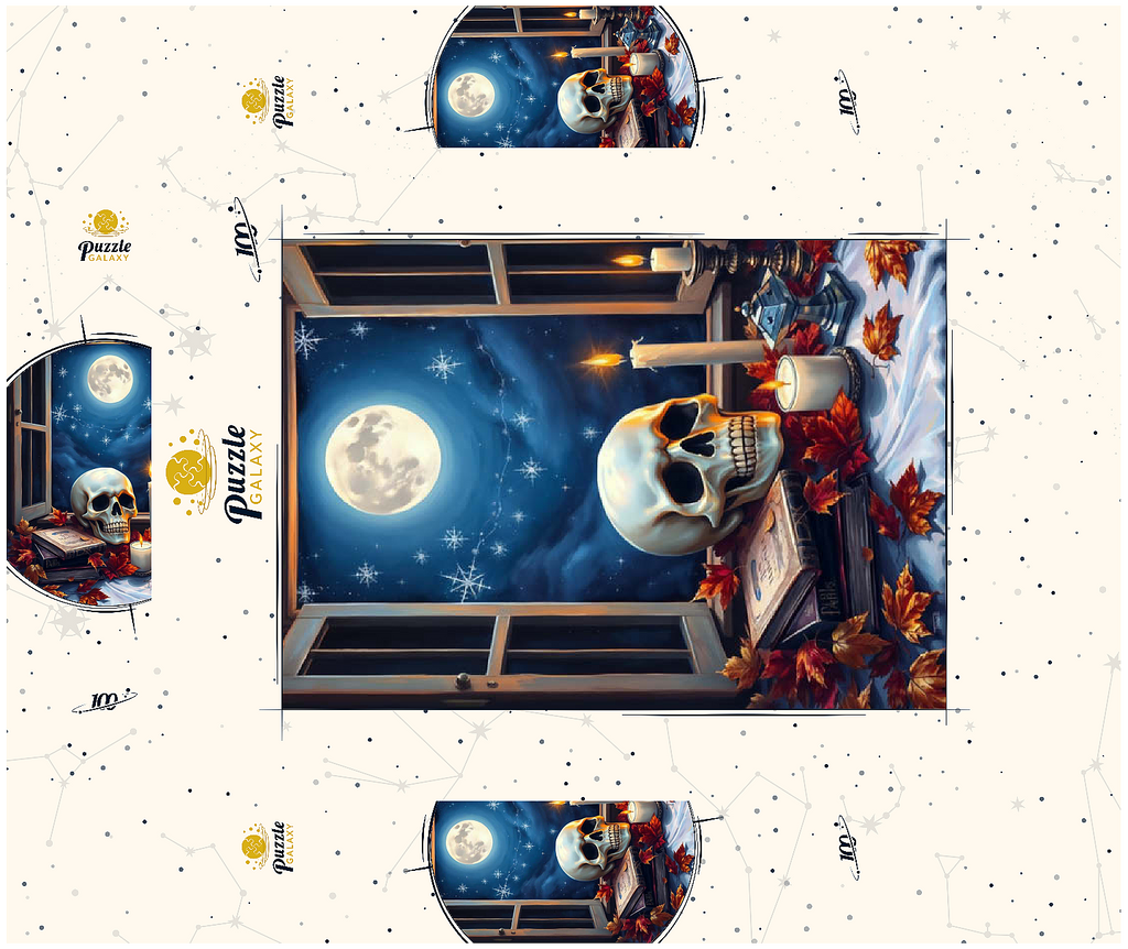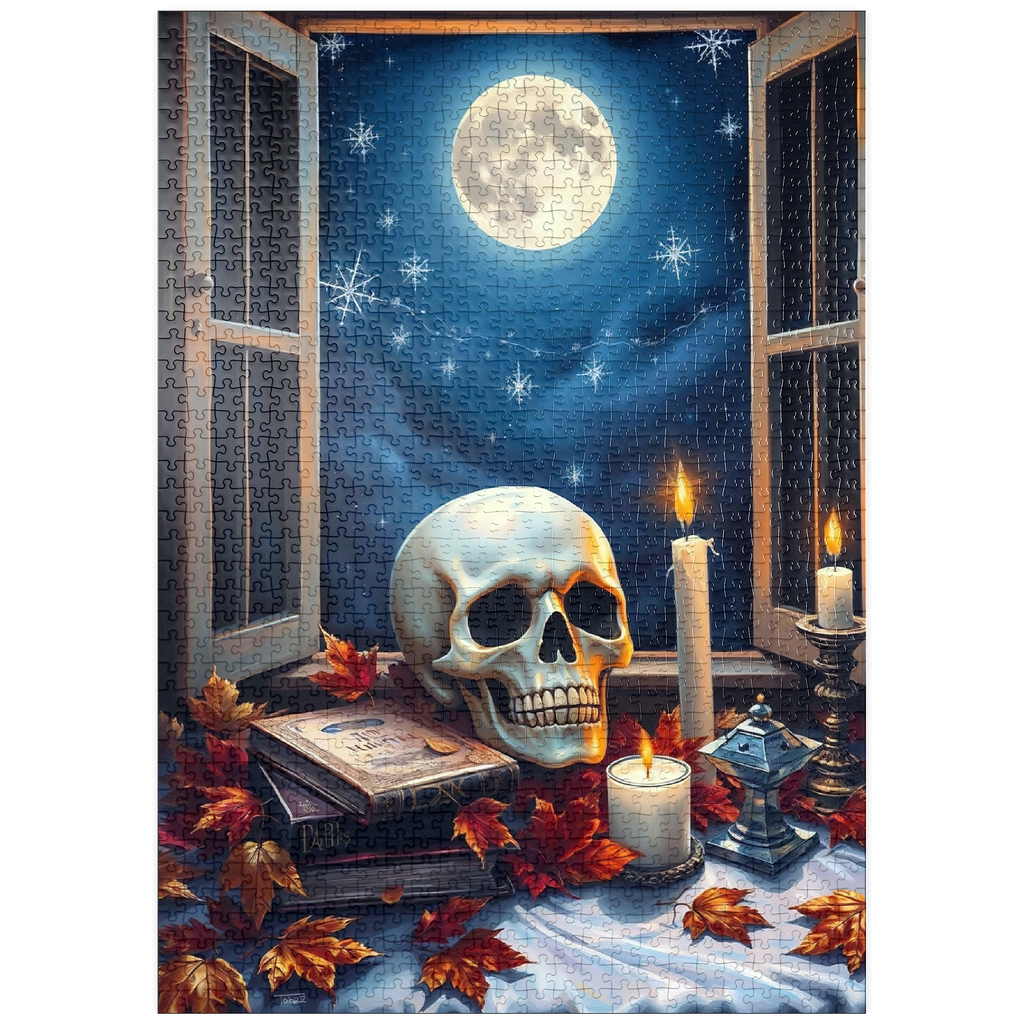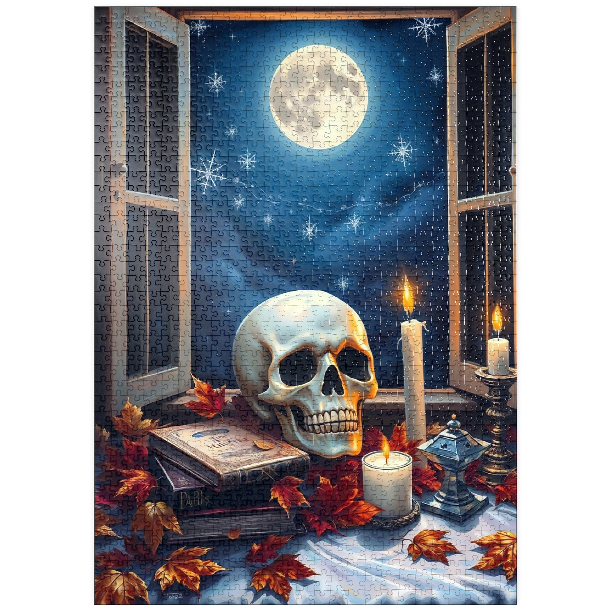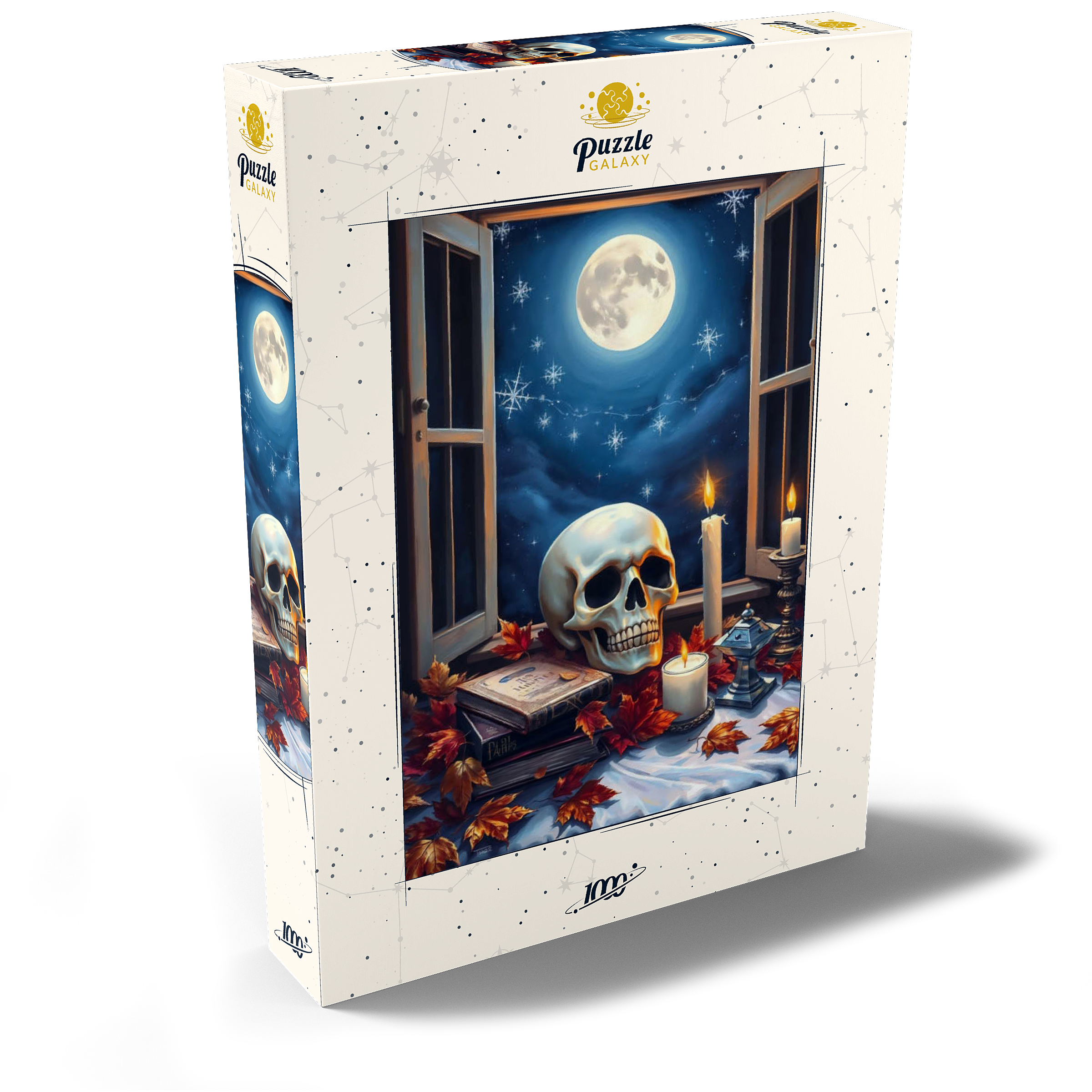 Ein faszinierendes digitales Kunstwerk, das eine mystische Stillleben-Szene vor einem leuchtenden Vollmond und einem sternenklaren Nachthimmel zeigt. Ein offenes Fenster rahmt den ätherischen Blick und wirft Mondlicht auf einen Tisch, der mit einem menschlichen Schädel, alten Büchern und flackernden Kerzen geschmückt ist. Herbstblätter in Rot- und Orangetönen umgeben das Arrangement und verleihen ihm einen Hauch von saisonaler Eleganz. Das sanfte Leuchten der Kerzen verstärkt die geheimnisvolle und atmosphärische Stimmung und weckt Assoziationen zu Themen wie Sterblichkeit, Reflexion und Übernatürlichem. Dieses Werk ist ideal für Liebhaber von Gothic-Dekor, Halloween-Ästhetik und Dark-Fantasy-Kunst und eignet sich perfekt, um jedem Raum eine stimmungsvolle, dramatische Note zu verleihen.