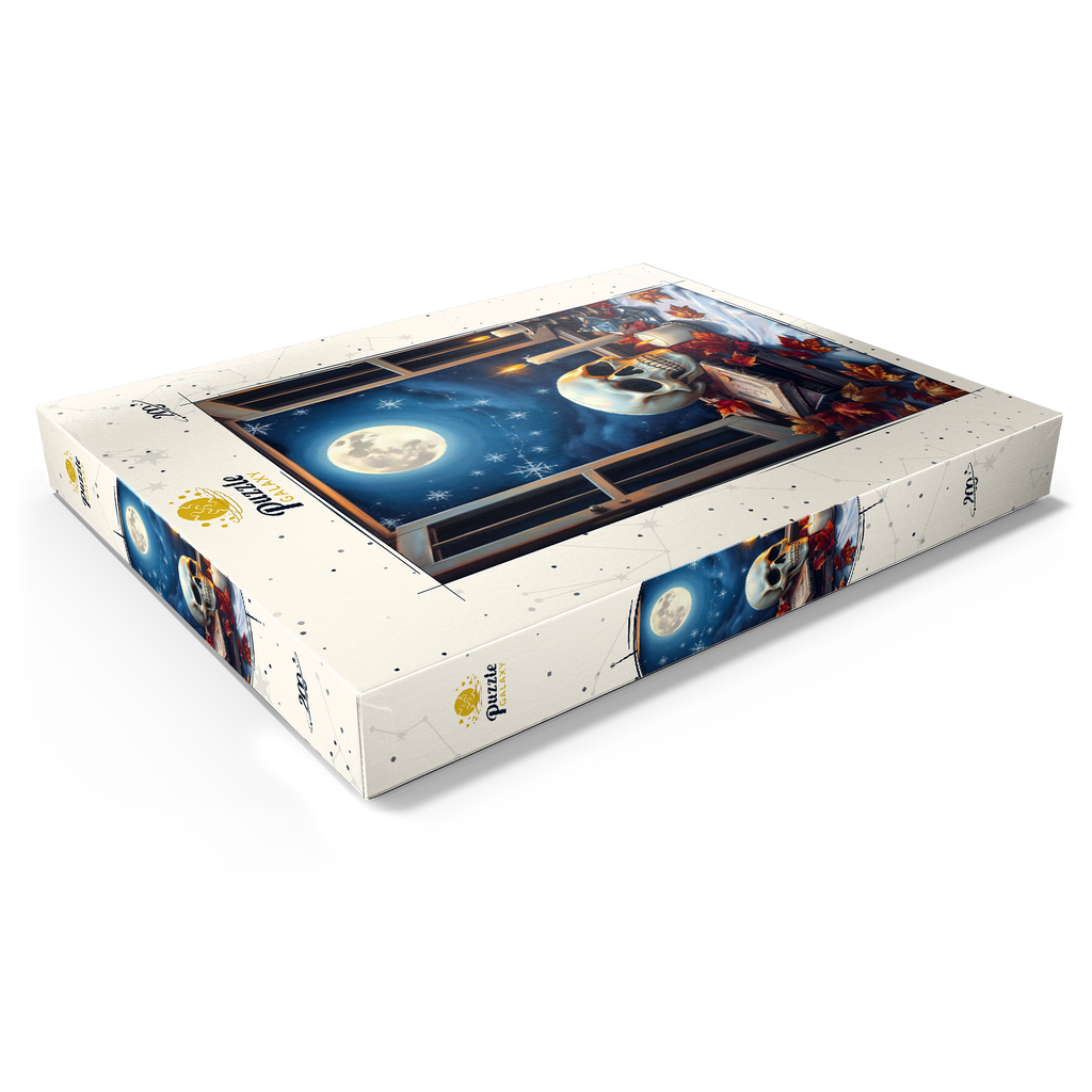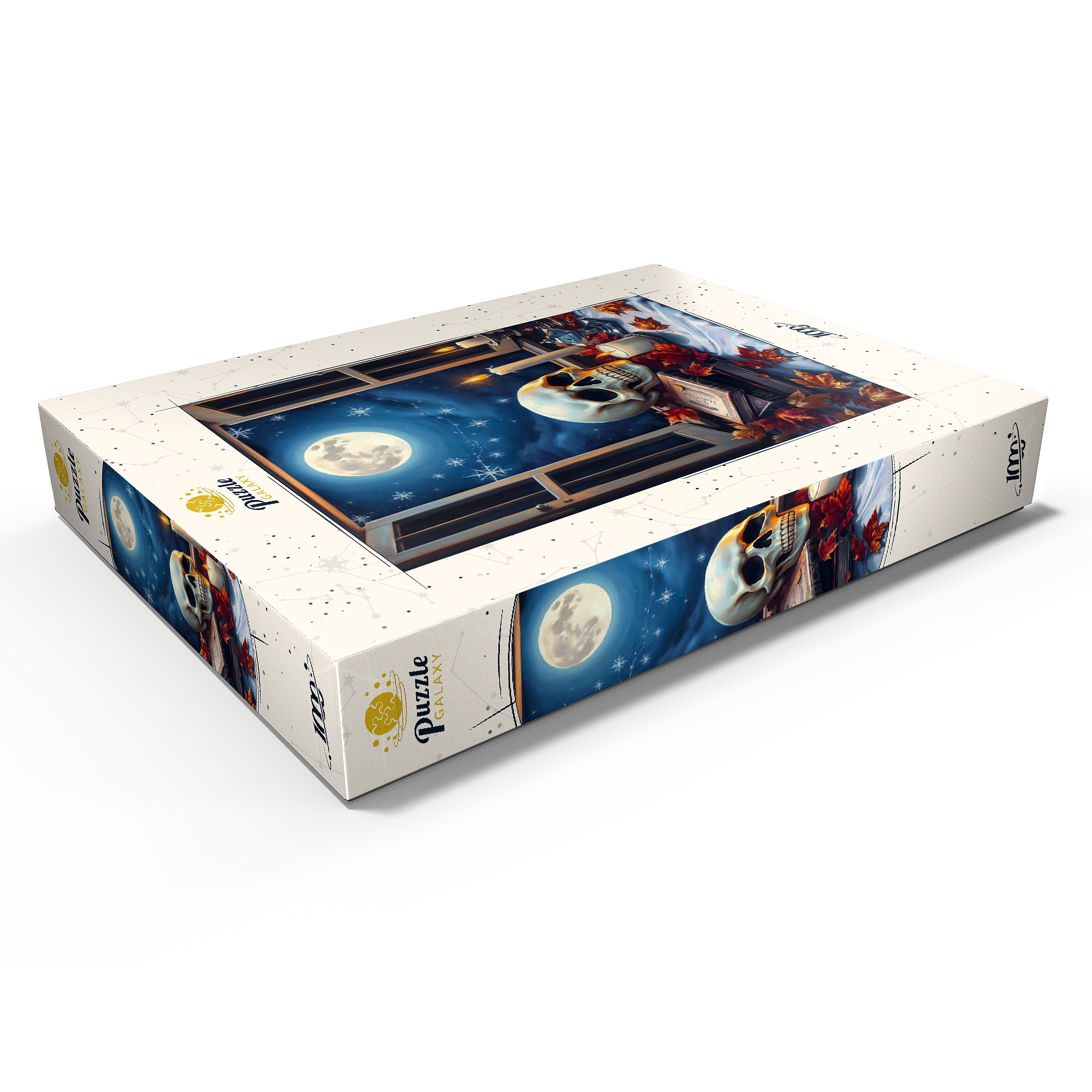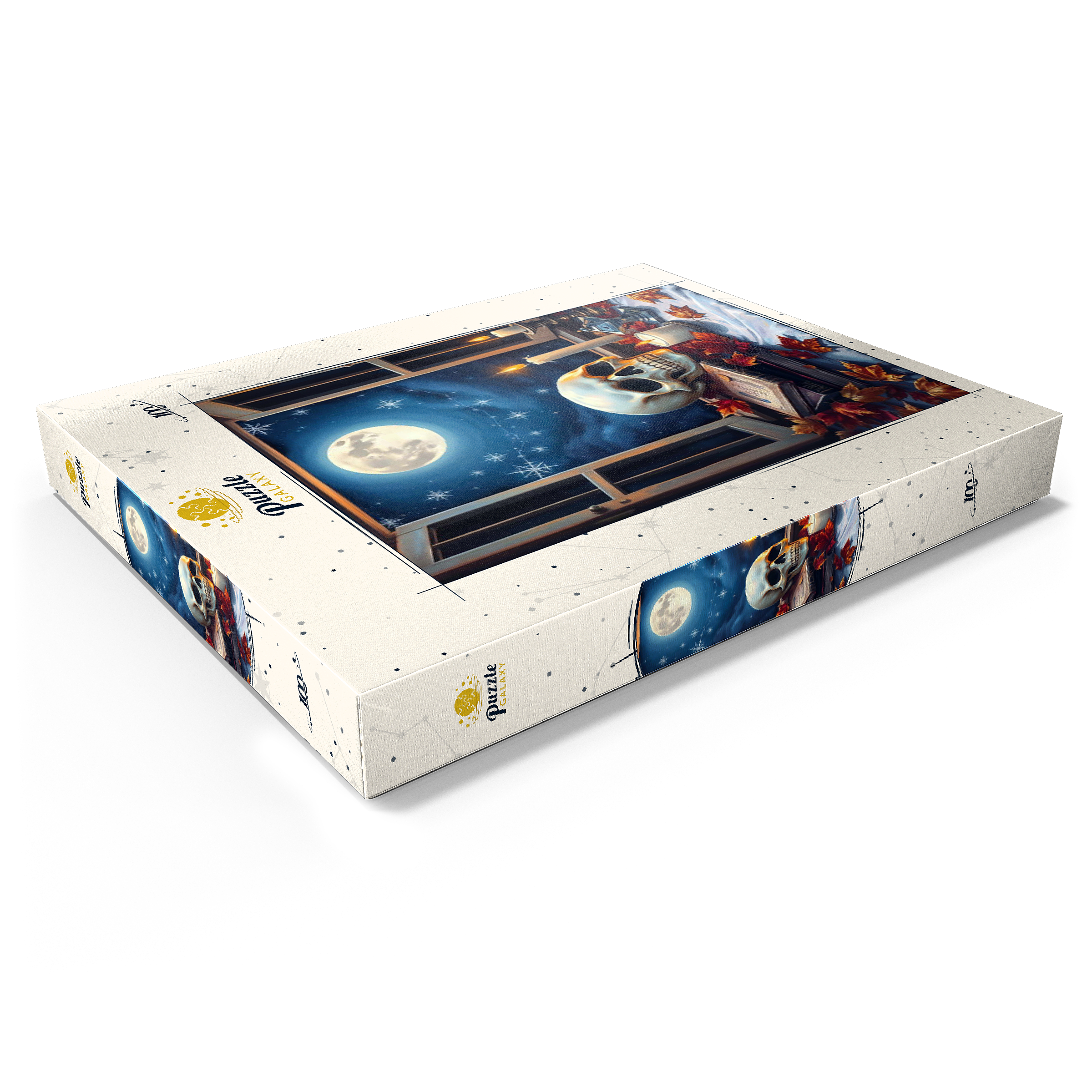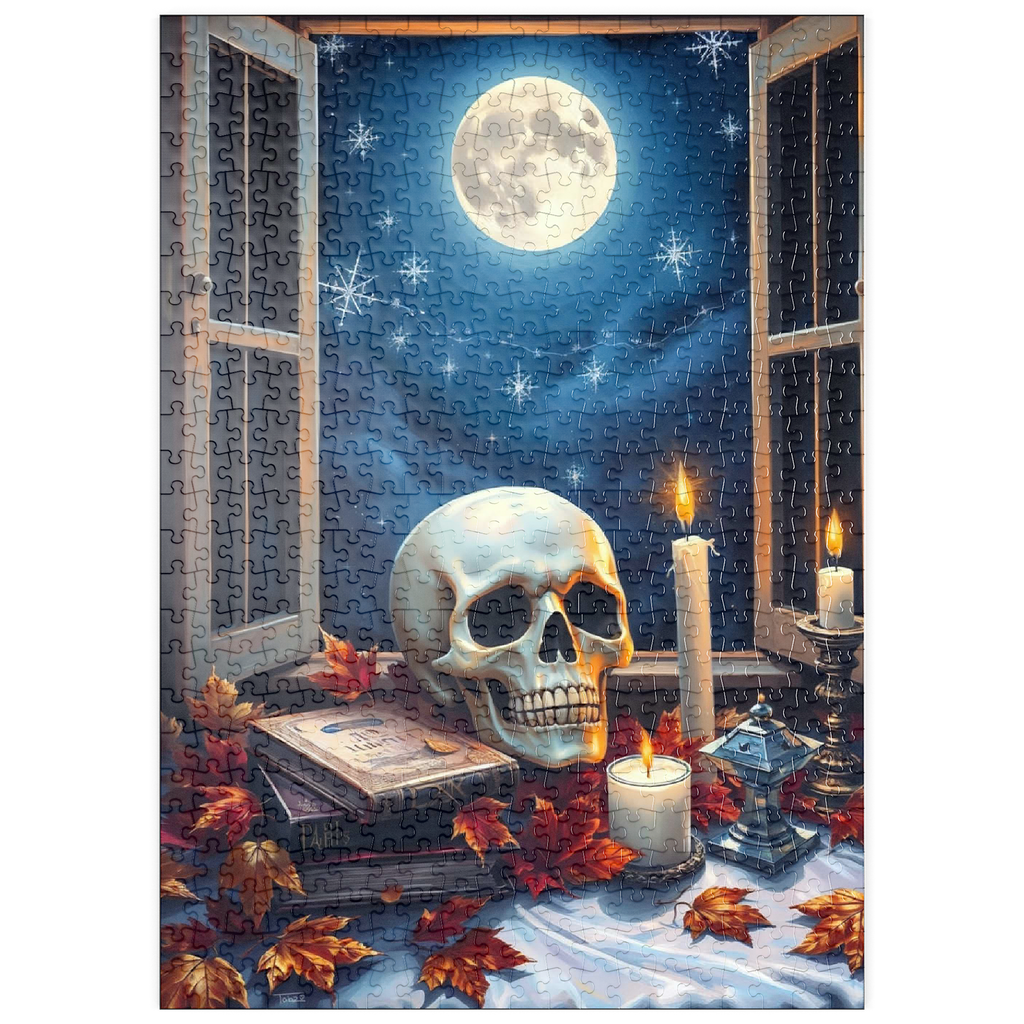 Ein faszinierendes digitales Kunstwerk, das eine mystische Stillleben-Szene vor einem leuchtenden Vollmond und einem sternenklaren Nachthimmel zeigt. Ein offenes Fenster rahmt den ätherischen Blick und wirft Mondlicht auf einen Tisch, der mit einem menschlichen Schädel, alten Büchern und flackernden Kerzen geschmückt ist. Herbstblätter in Rot- und Orangetönen umgeben das Arrangement und verleihen ihm einen Hauch von saisonaler Eleganz. Das sanfte Leuchten der Kerzen verstärkt die geheimnisvolle und atmosphärische Stimmung und weckt Assoziationen zu Themen wie Sterblichkeit, Reflexion und Übernatürlichem. Dieses Werk ist ideal für Liebhaber von Gothic-Dekor, Halloween-Ästhetik und Dark-Fantasy-Kunst und eignet sich perfekt, um jedem Raum eine stimmungsvolle, dramatische Note zu verleihen.