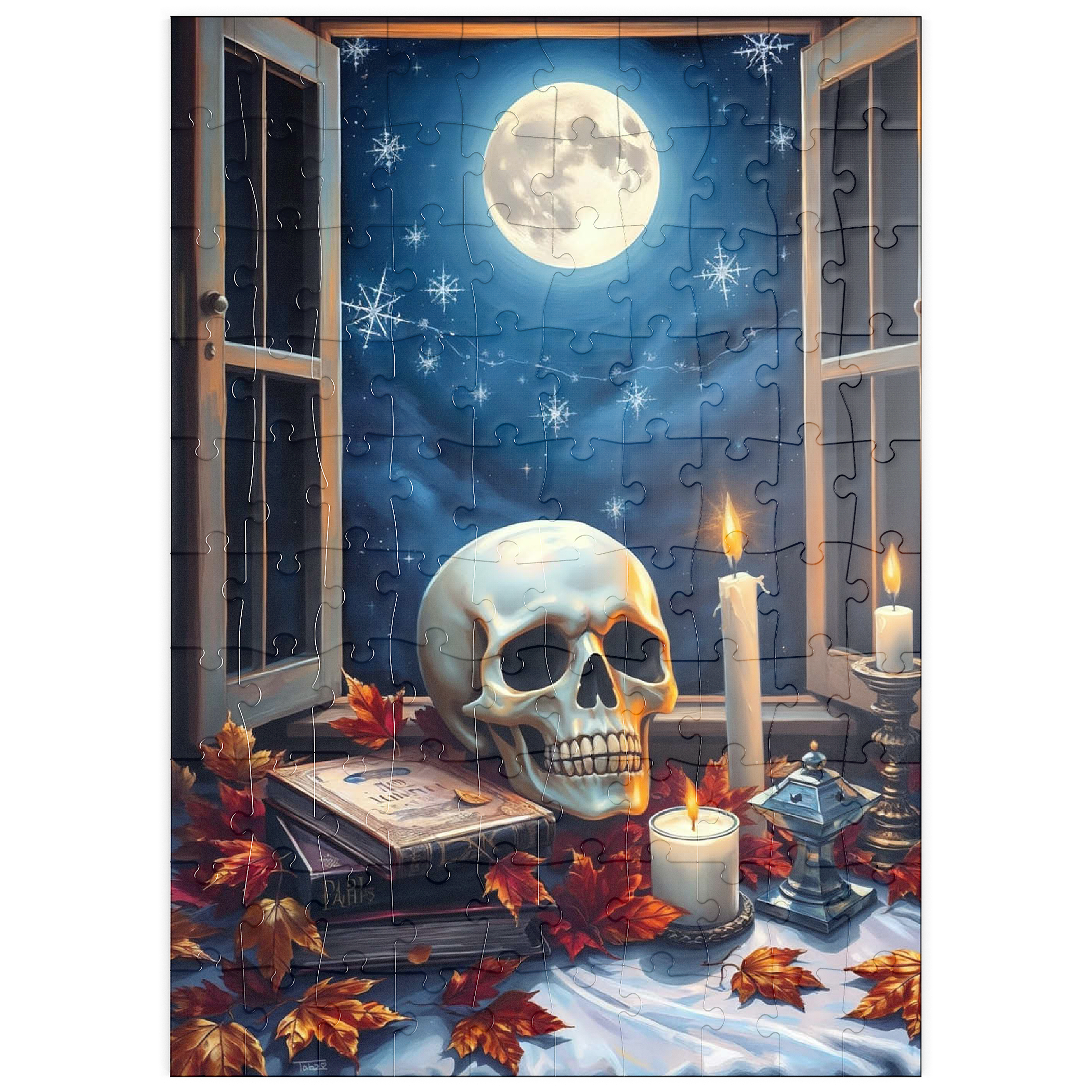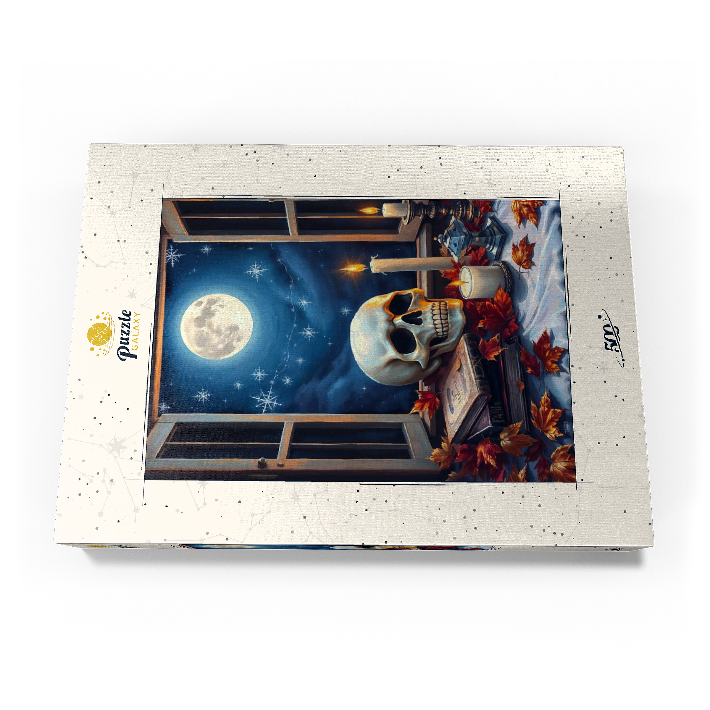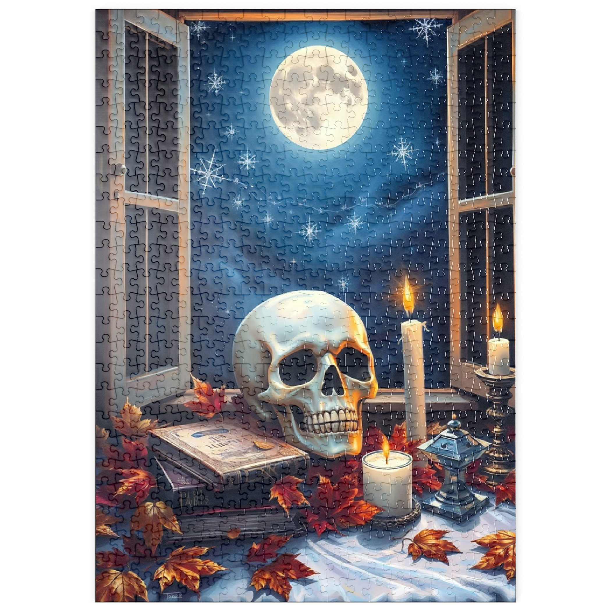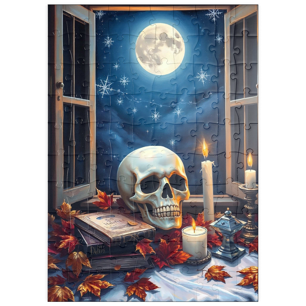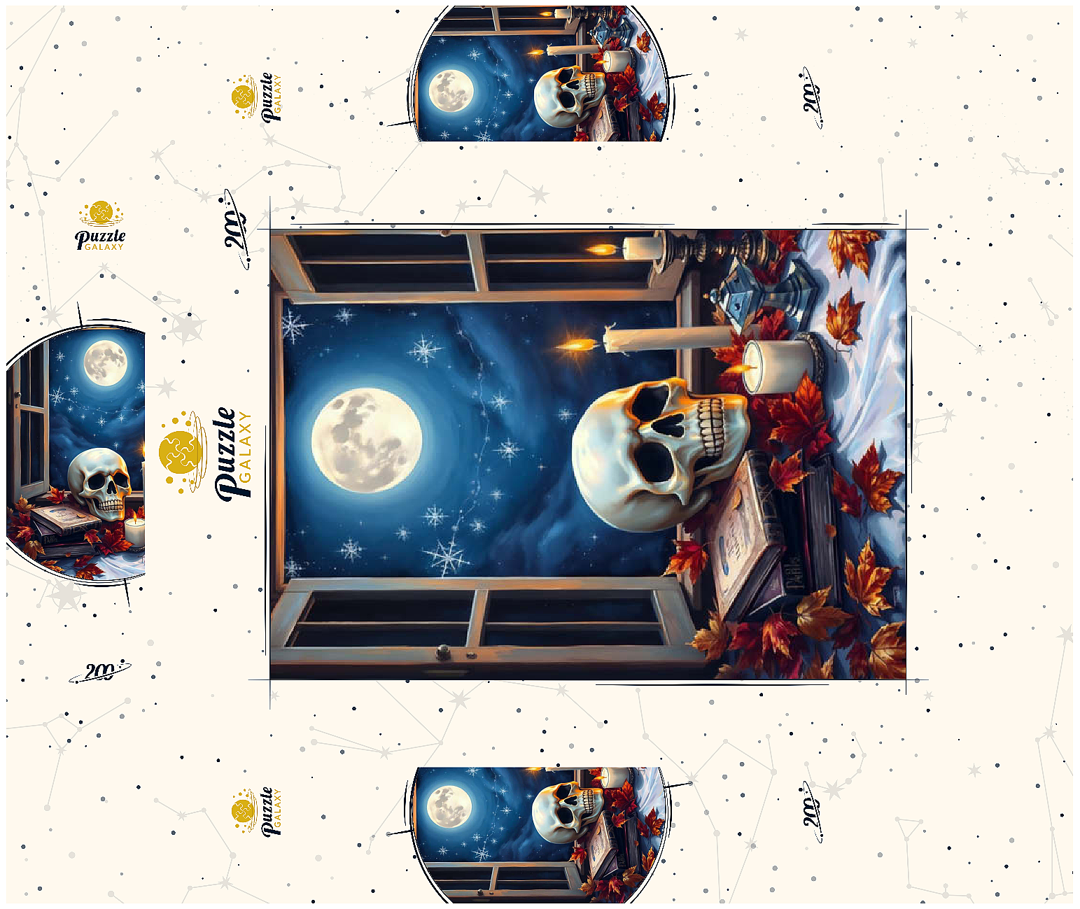 Ein faszinierendes digitales Kunstwerk, das eine mystische Stillleben-Szene vor einem leuchtenden Vollmond und einem sternenklaren Nachthimmel zeigt. Ein offenes Fenster rahmt den ätherischen Blick und wirft Mondlicht auf einen Tisch, der mit einem menschlichen Schädel, alten Büchern und flackernden Kerzen geschmückt ist. Herbstblätter in Rot- und Orangetönen umgeben das Arrangement und verleihen ihm einen Hauch von saisonaler Eleganz. Das sanfte Leuchten der Kerzen verstärkt die geheimnisvolle und atmosphärische Stimmung und weckt Assoziationen zu Themen wie Sterblichkeit, Reflexion und Übernatürlichem. Dieses Werk ist ideal für Liebhaber von Gothic-Dekor, Halloween-Ästhetik und Dark-Fantasy-Kunst und eignet sich perfekt, um jedem Raum eine stimmungsvolle, dramatische Note zu verleihen.
