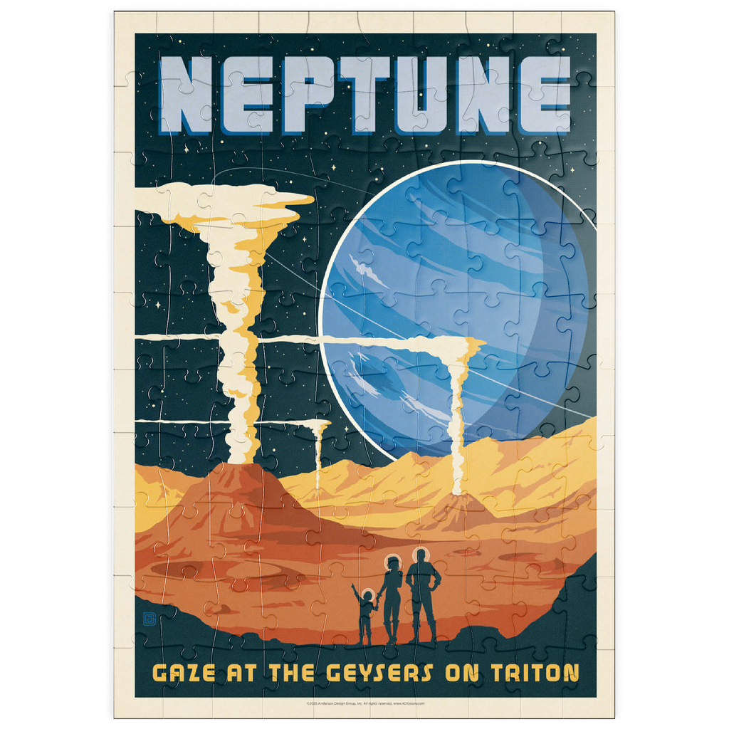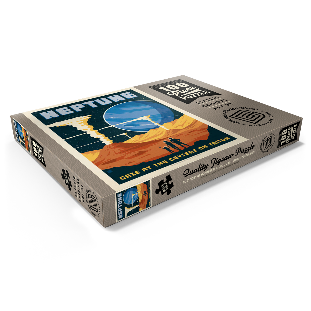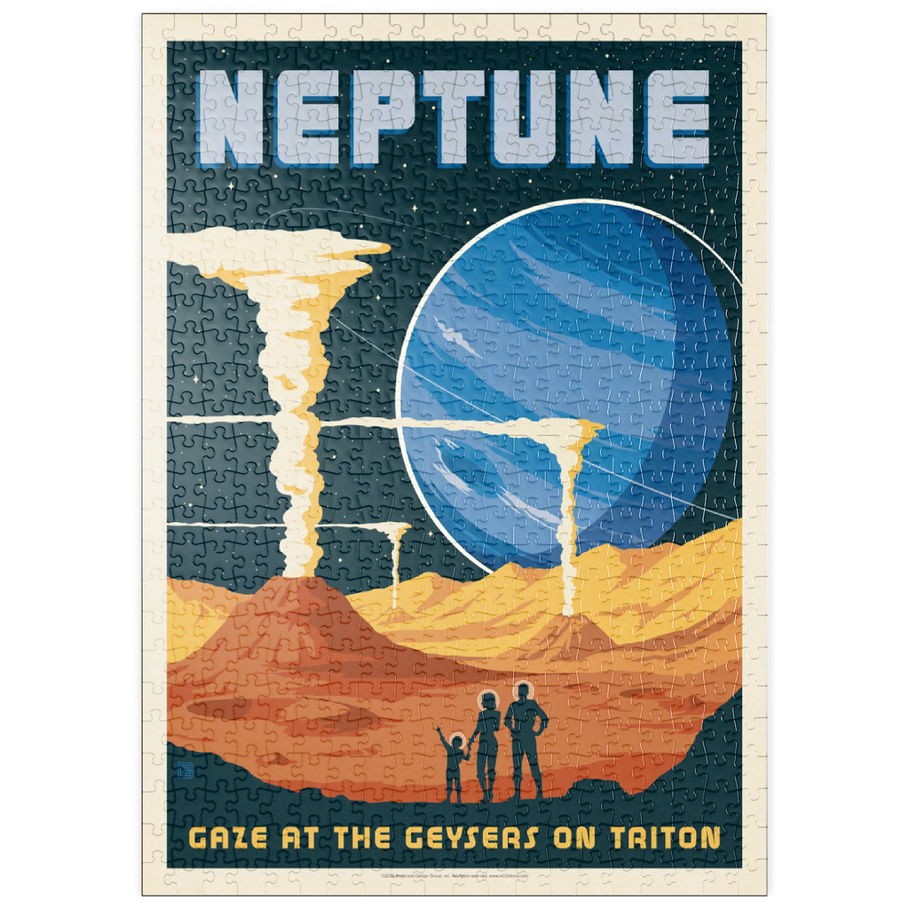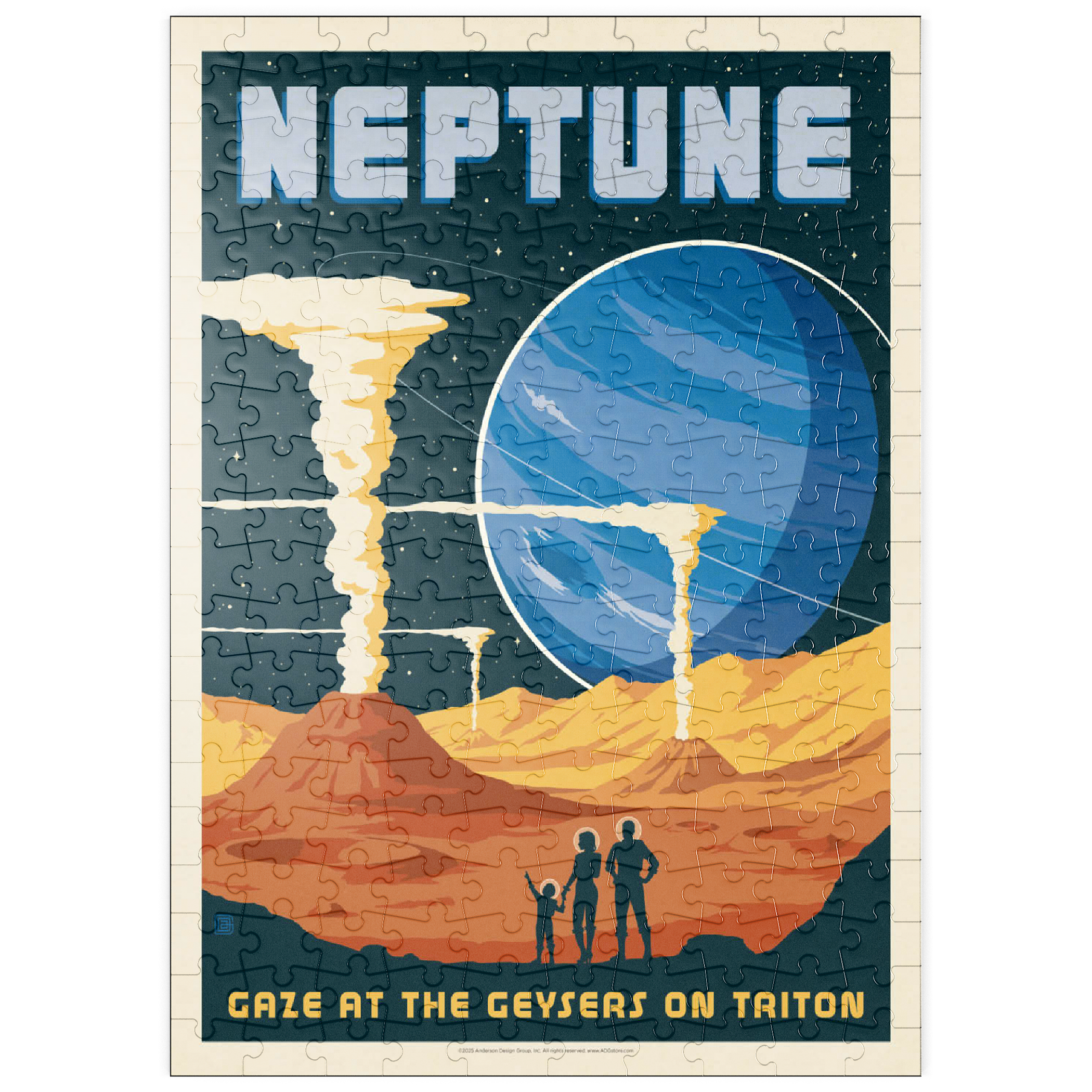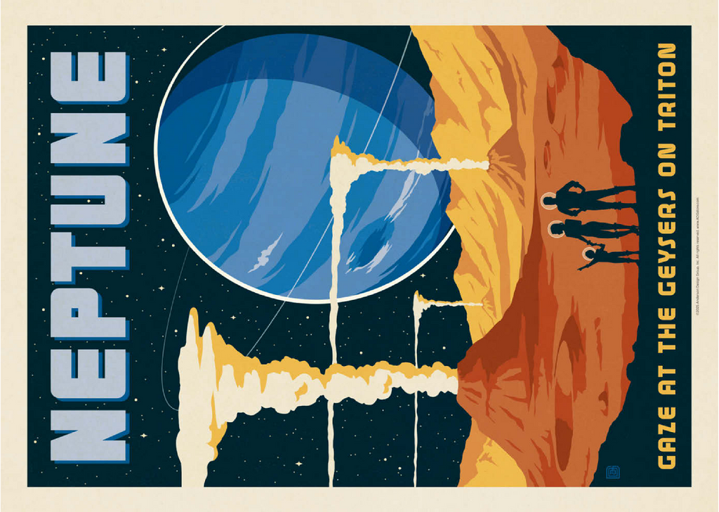 Dieses Retro-Poster zum Thema Weltraumfahrt zeigt eine beeindruckende Ansicht von Neptun, gesehen von seinem größten Mond Triton, der für seine aktiven Stickstoffgeysire bekannt ist. Die Szene zeigt eine Familie von Weltraumforschern, die auf der rötlichen, felsigen Oberfläche von Triton stehen und zu den hoch in die dünne Atmosphäre schießenden Geysiren blicken. Neptun dominiert den Himmel mit seinen satten Blautönen und sichtbaren atmosphärischen Bändern und bildet eine atemberaubende Kulisse. Der künstlerische Stil ist stark von Reiseplakaten aus der Mitte des Jahrhunderts inspiriert und zeichnet sich durch klare Linien, kräftige Farben und vereinfachte, aber dynamische Designelemente aus, die Nostalgie und Abenteuerlust wecken. Die hoch aufragenden Geysire, die realistische Planetenperspektive und die Darstellung der außerirdischen Erkundung verleihen dem Bild ein faszinierendes Gefühl von Größe und Staunen. Triton, bekannt für seine retrograde Umlaufbahn und seine geologische Aktivität, wird hier kreativ als potenzielles Reiseziel innerhalb unseres Sonnensystems dargestellt. Die warmen Farbtöne der Landschaft bilden einen schönen Kontrast zu den kühlen Blautönen von Neptun und verstärken so die visuelle Wirkung. Das Poster fängt die Aufregung des Weltraumtourismus und die Faszination der Entdeckung ferner Welten ein. Dieses fantasievolle, vintage-inspirierte Kunstwerk ist perfekt für Weltraumbegeisterte und alle, die von der Erforschung anderer Planeten fasziniert sind.