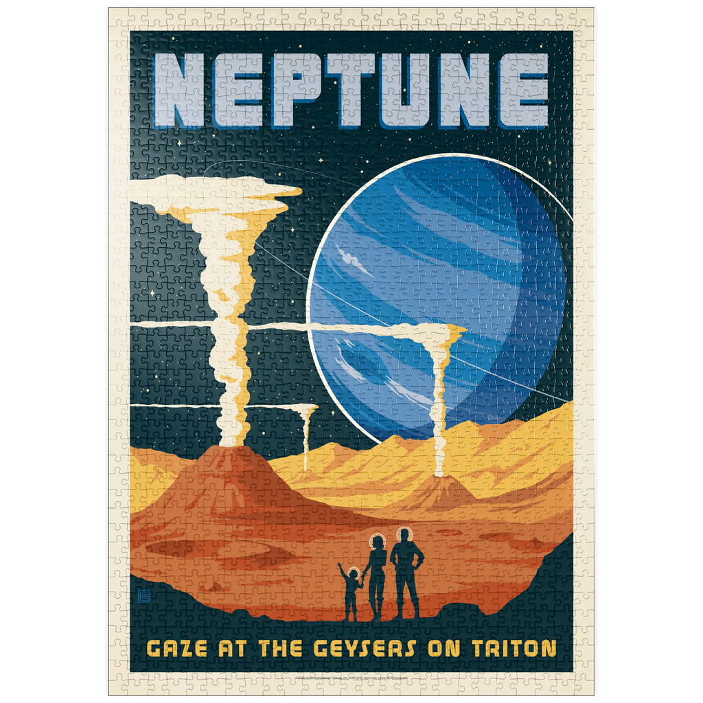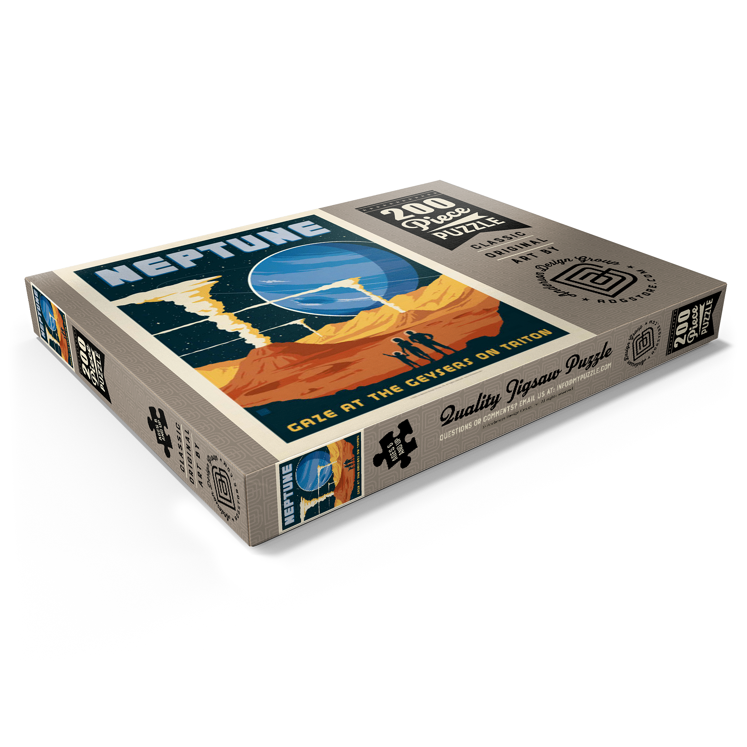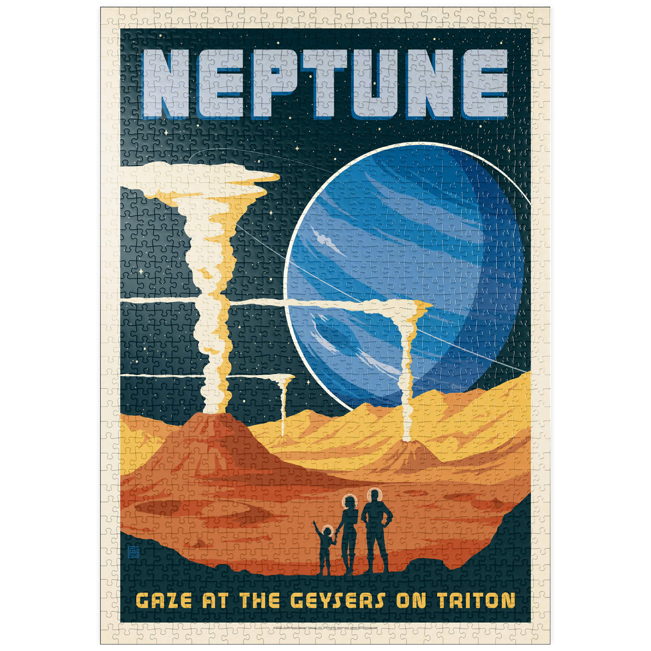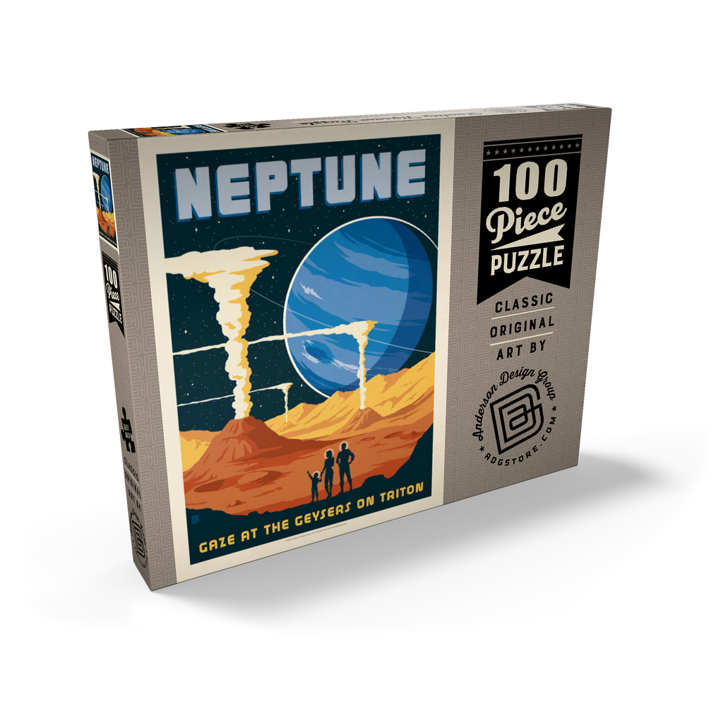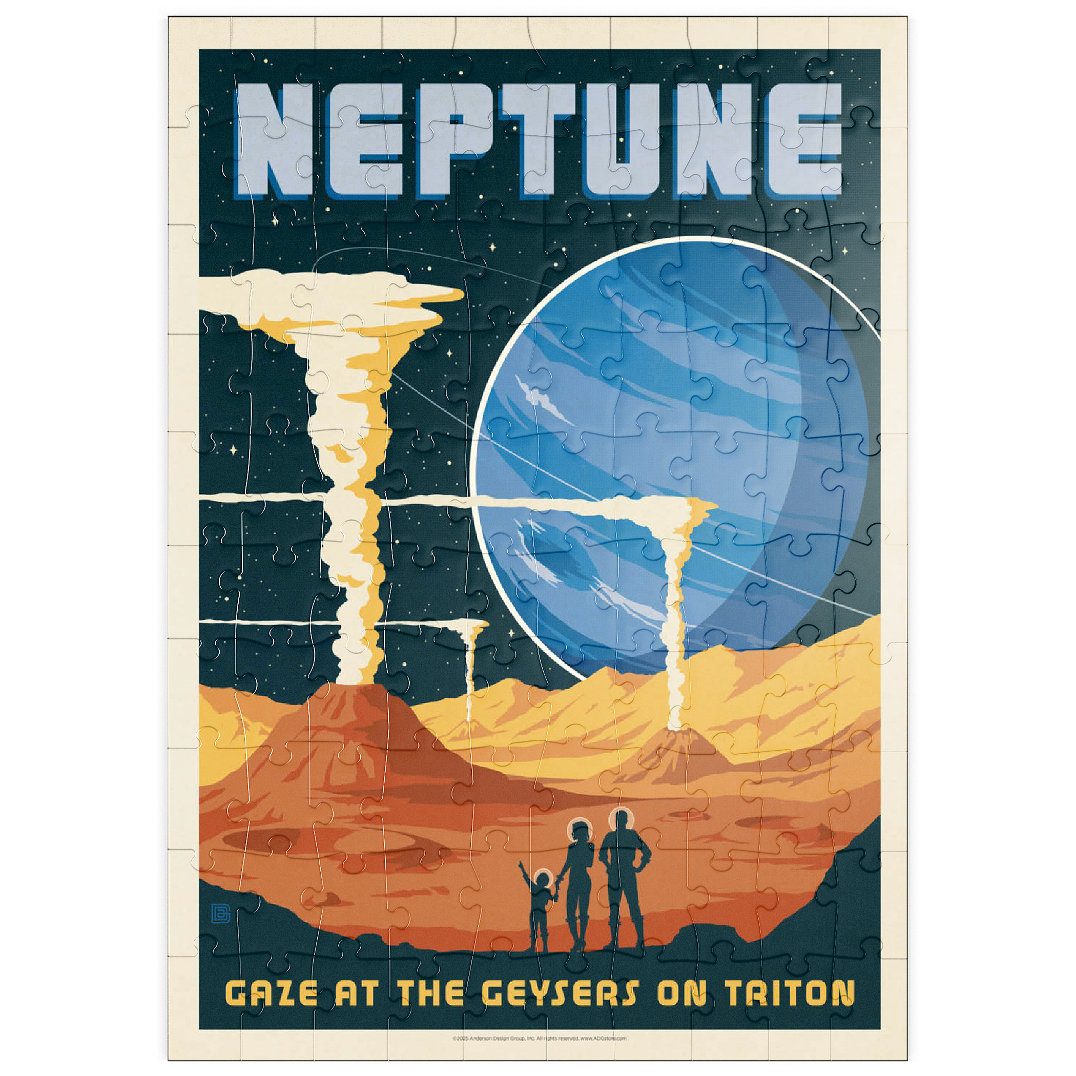 Dieses Retro-Poster zum Thema Weltraumfahrt zeigt eine beeindruckende Ansicht von Neptun, gesehen von seinem größten Mond Triton, der für seine aktiven Stickstoffgeysire bekannt ist. Die Szene zeigt eine Familie von Weltraumforschern, die auf der rötlichen, felsigen Oberfläche von Triton stehen und zu den hoch in die dünne Atmosphäre schießenden Geysiren blicken. Neptun dominiert den Himmel mit seinen satten Blautönen und sichtbaren atmosphärischen Bändern und bildet eine atemberaubende Kulisse. Der künstlerische Stil ist stark von Reiseplakaten aus der Mitte des Jahrhunderts inspiriert und zeichnet sich durch klare Linien, kräftige Farben und vereinfachte, aber dynamische Designelemente aus, die Nostalgie und Abenteuerlust wecken. Die hoch aufragenden Geysire, die realistische Planetenperspektive und die Darstellung der außerirdischen Erkundung verleihen dem Bild ein faszinierendes Gefühl von Größe und Staunen. Triton, bekannt für seine retrograde Umlaufbahn und seine geologische Aktivität, wird hier kreativ als potenzielles Reiseziel innerhalb unseres Sonnensystems dargestellt. Die warmen Farbtöne der Landschaft bilden einen schönen Kontrast zu den kühlen Blautönen von Neptun und verstärken so die visuelle Wirkung. Das Poster fängt die Aufregung des Weltraumtourismus und die Faszination der Entdeckung ferner Welten ein. Dieses fantasievolle, vintage-inspirierte Kunstwerk ist perfekt für Weltraumbegeisterte und alle, die von der Erforschung anderer Planeten fasziniert sind.