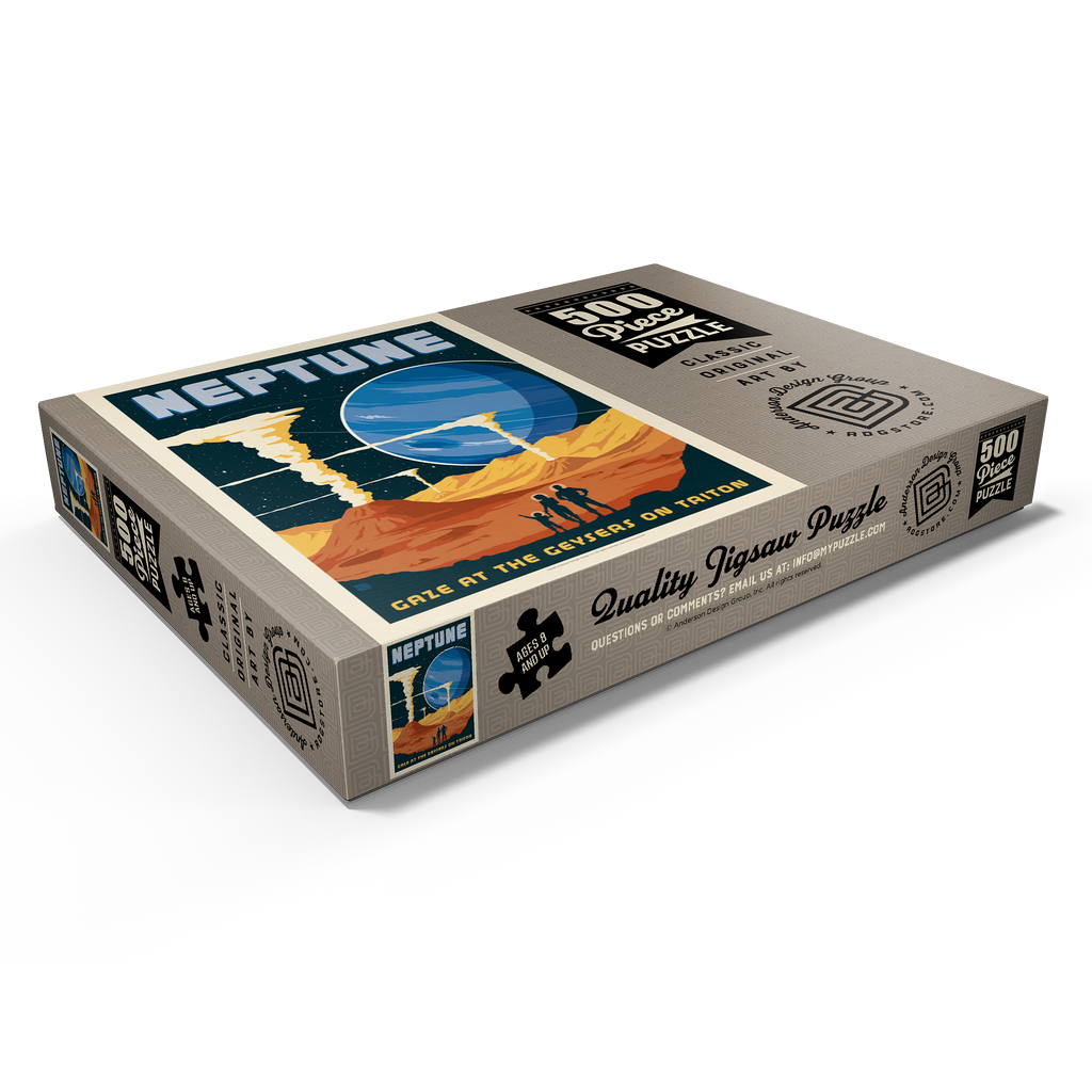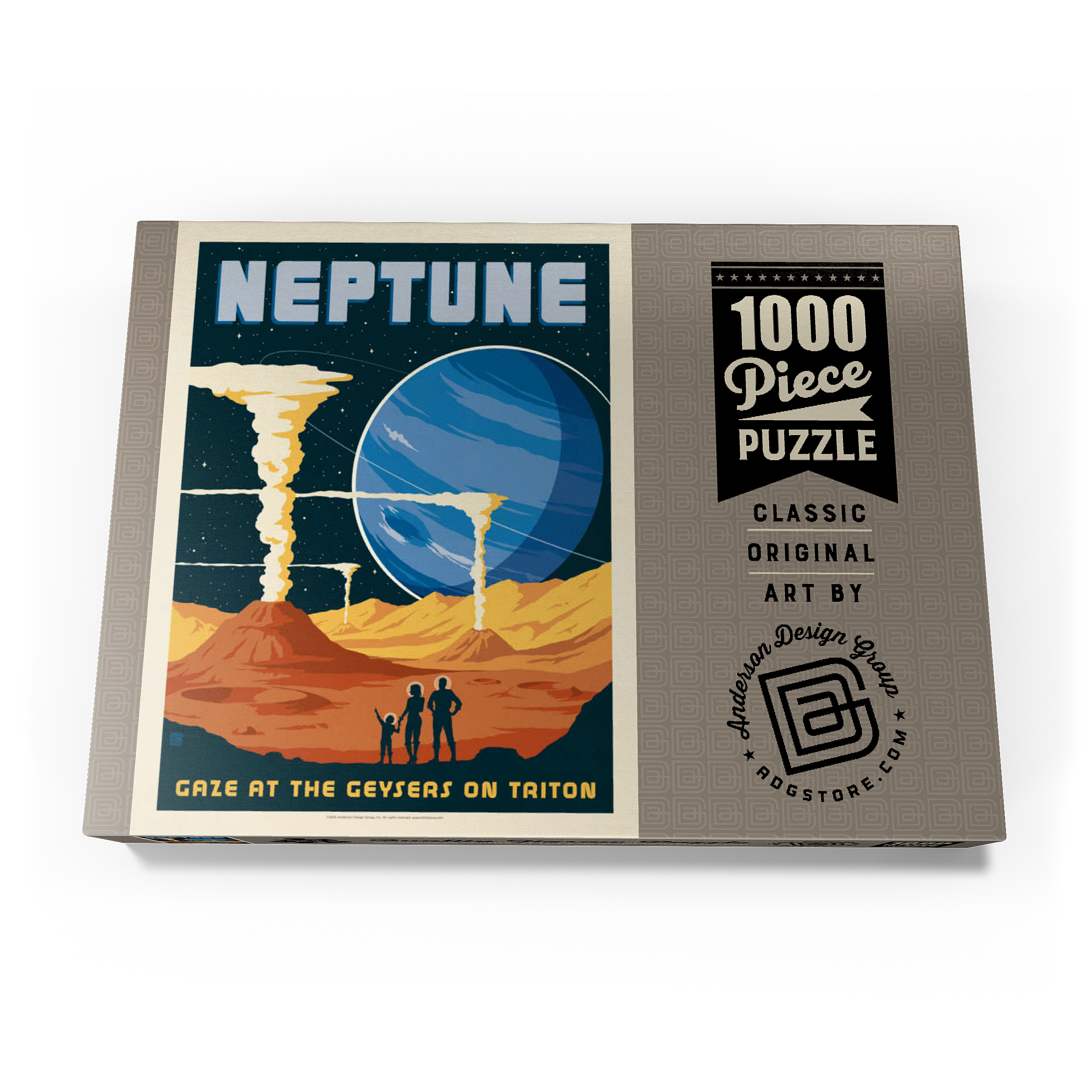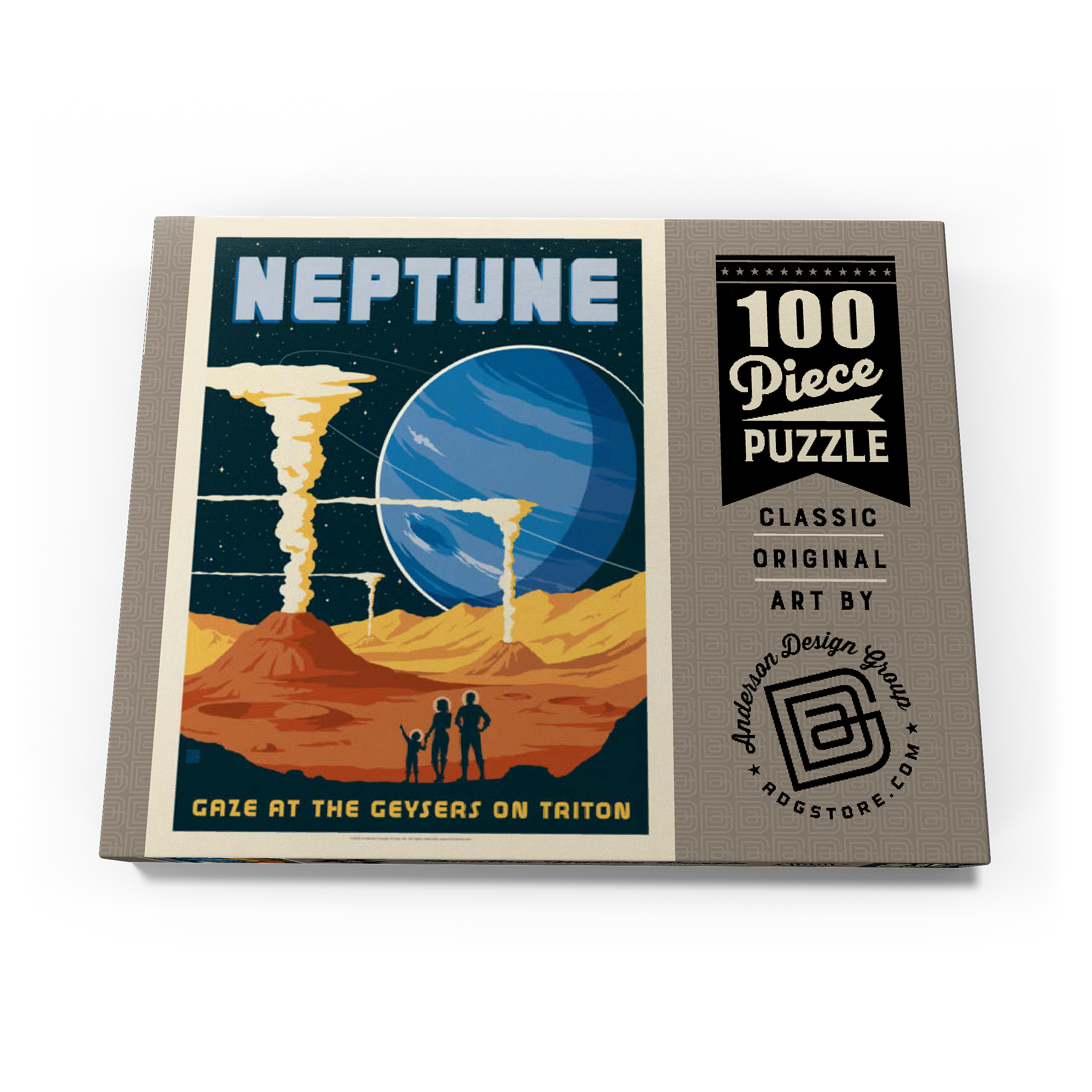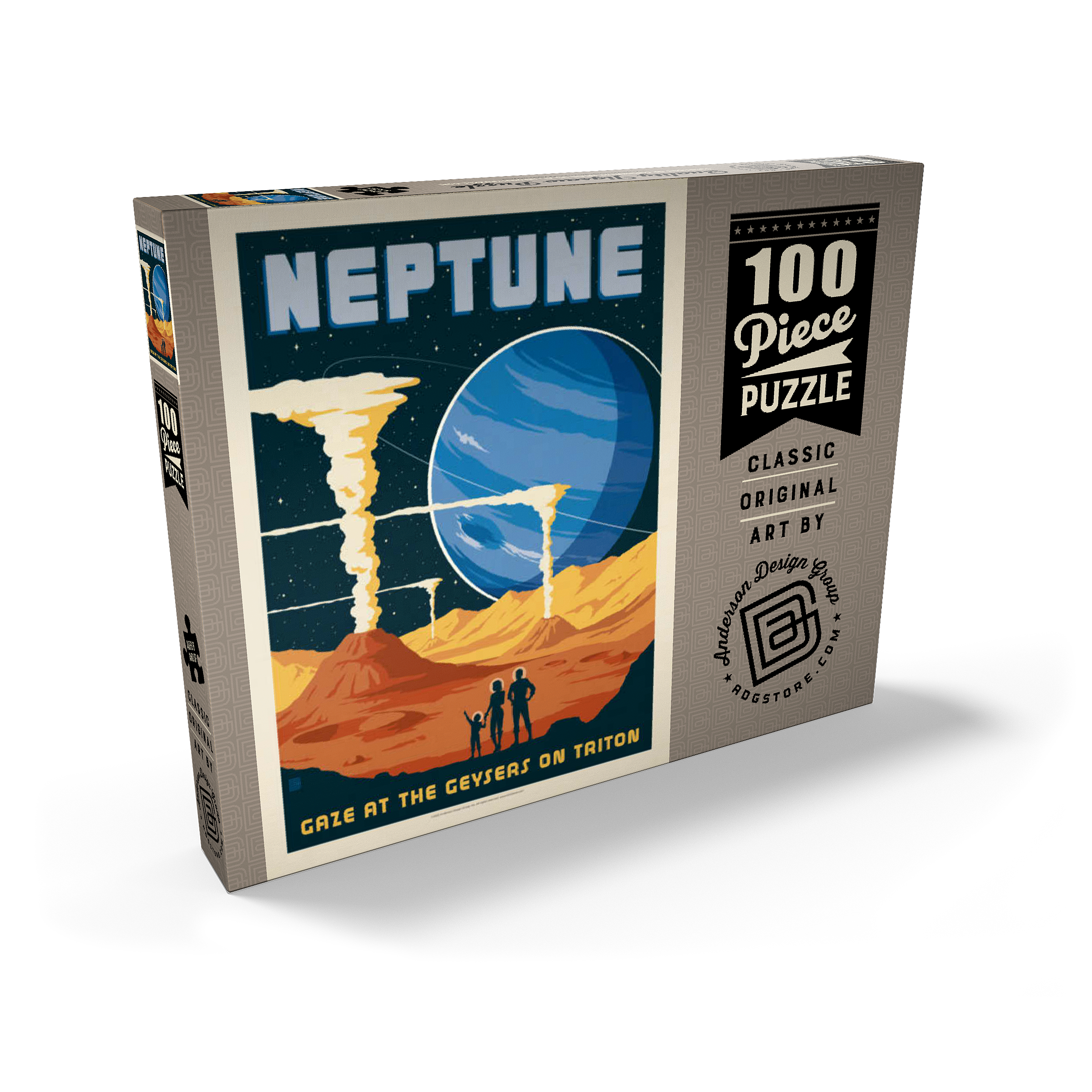 Dieses Retro-Poster zum Thema Weltraumfahrt zeigt eine beeindruckende Ansicht von Neptun, gesehen von seinem größten Mond Triton, der für seine aktiven Stickstoffgeysire bekannt ist. Die Szene zeigt eine Familie von Weltraumforschern, die auf der rötlichen, felsigen Oberfläche von Triton stehen und zu den hoch in die dünne Atmosphäre schießenden Geysiren blicken. Neptun dominiert den Himmel mit seinen satten Blautönen und sichtbaren atmosphärischen Bändern und bildet eine atemberaubende Kulisse. Der künstlerische Stil ist stark von Reiseplakaten aus der Mitte des Jahrhunderts inspiriert und zeichnet sich durch klare Linien, kräftige Farben und vereinfachte, aber dynamische Designelemente aus, die Nostalgie und Abenteuerlust wecken. Die hoch aufragenden Geysire, die realistische Planetenperspektive und die Darstellung der außerirdischen Erkundung verleihen dem Bild ein faszinierendes Gefühl von Größe und Staunen. Triton, bekannt für seine retrograde Umlaufbahn und seine geologische Aktivität, wird hier kreativ als potenzielles Reiseziel innerhalb unseres Sonnensystems dargestellt. Die warmen Farbtöne der Landschaft bilden einen schönen Kontrast zu den kühlen Blautönen von Neptun und verstärken so die visuelle Wirkung. Das Poster fängt die Aufregung des Weltraumtourismus und die Faszination der Entdeckung ferner Welten ein. Dieses fantasievolle, vintage-inspirierte Kunstwerk ist perfekt für Weltraumbegeisterte und alle, die von der Erforschung anderer Planeten fasziniert sind.
