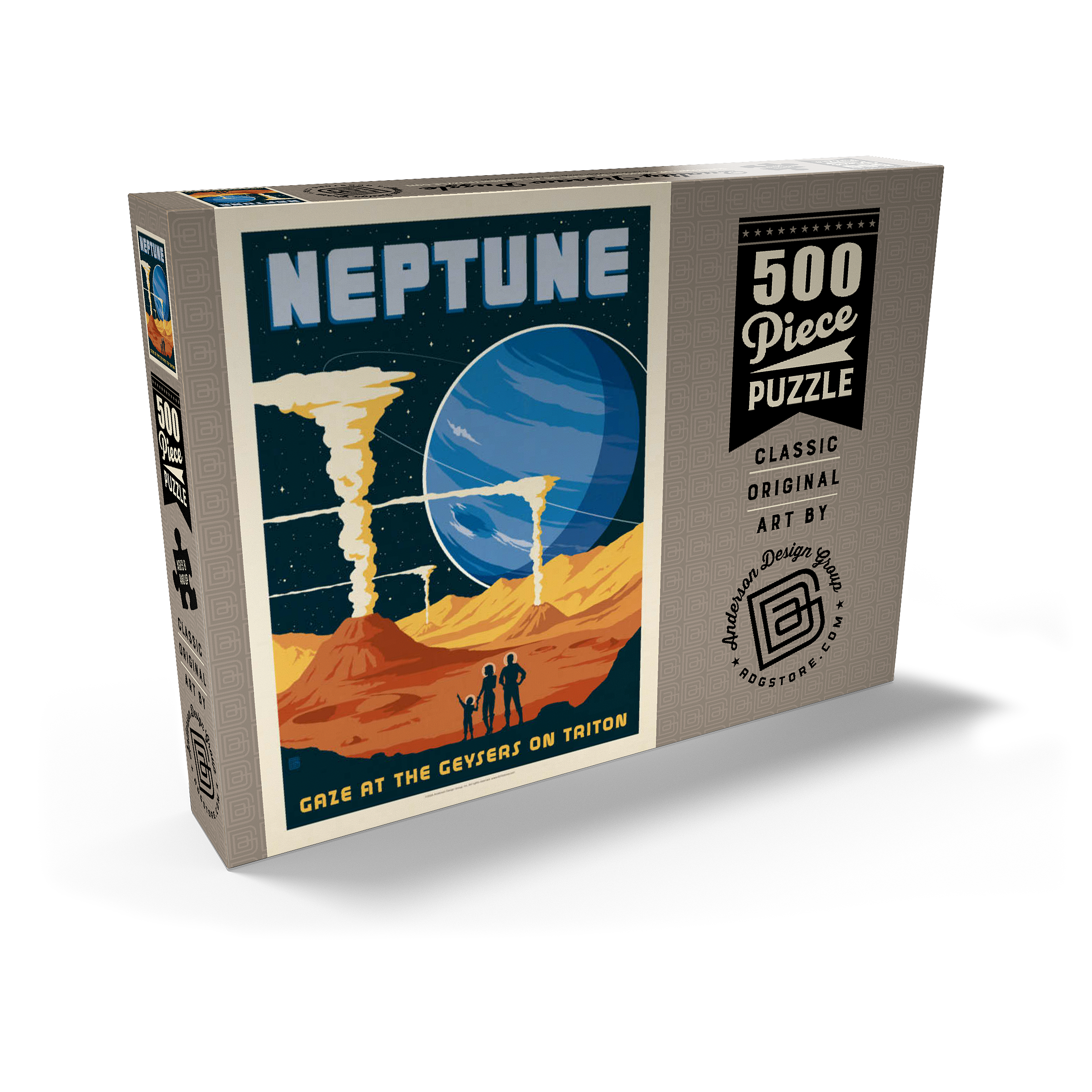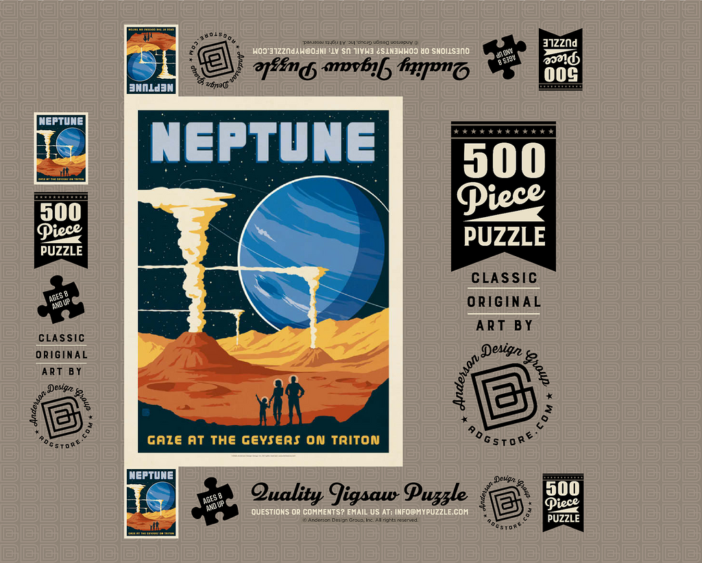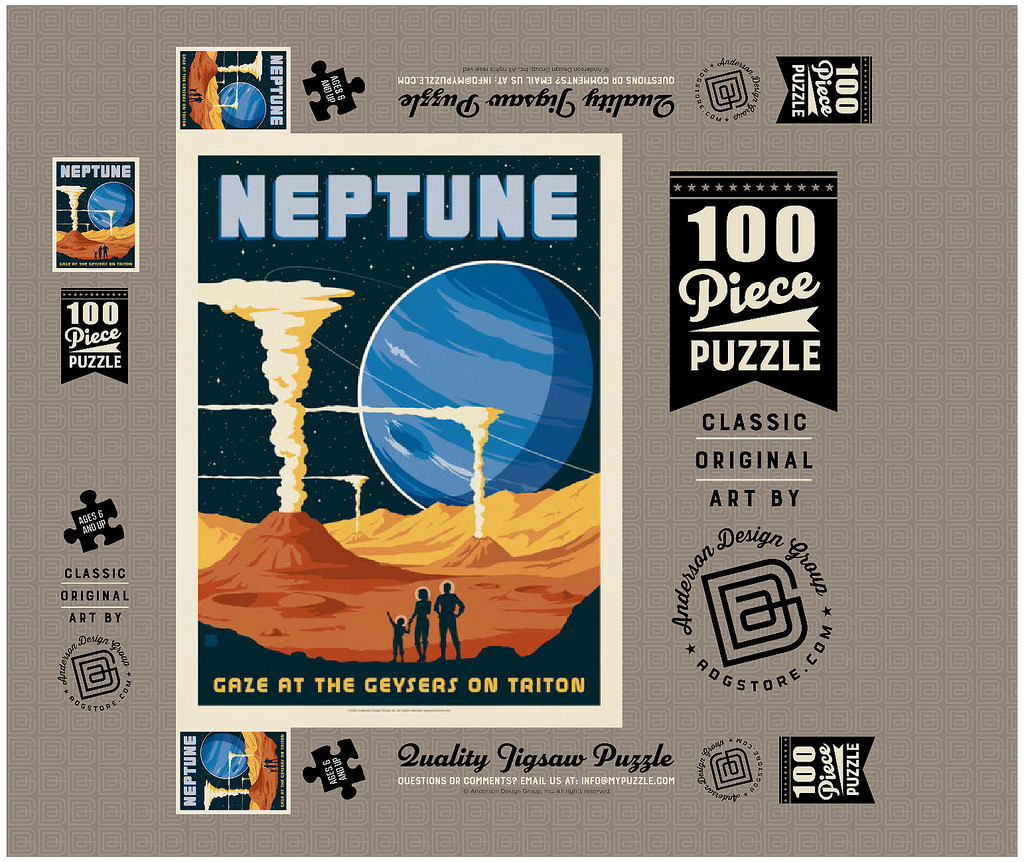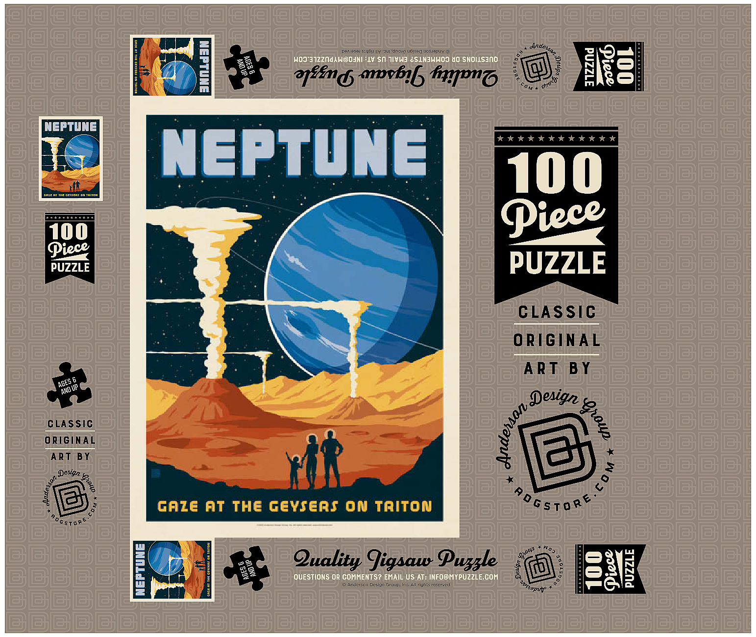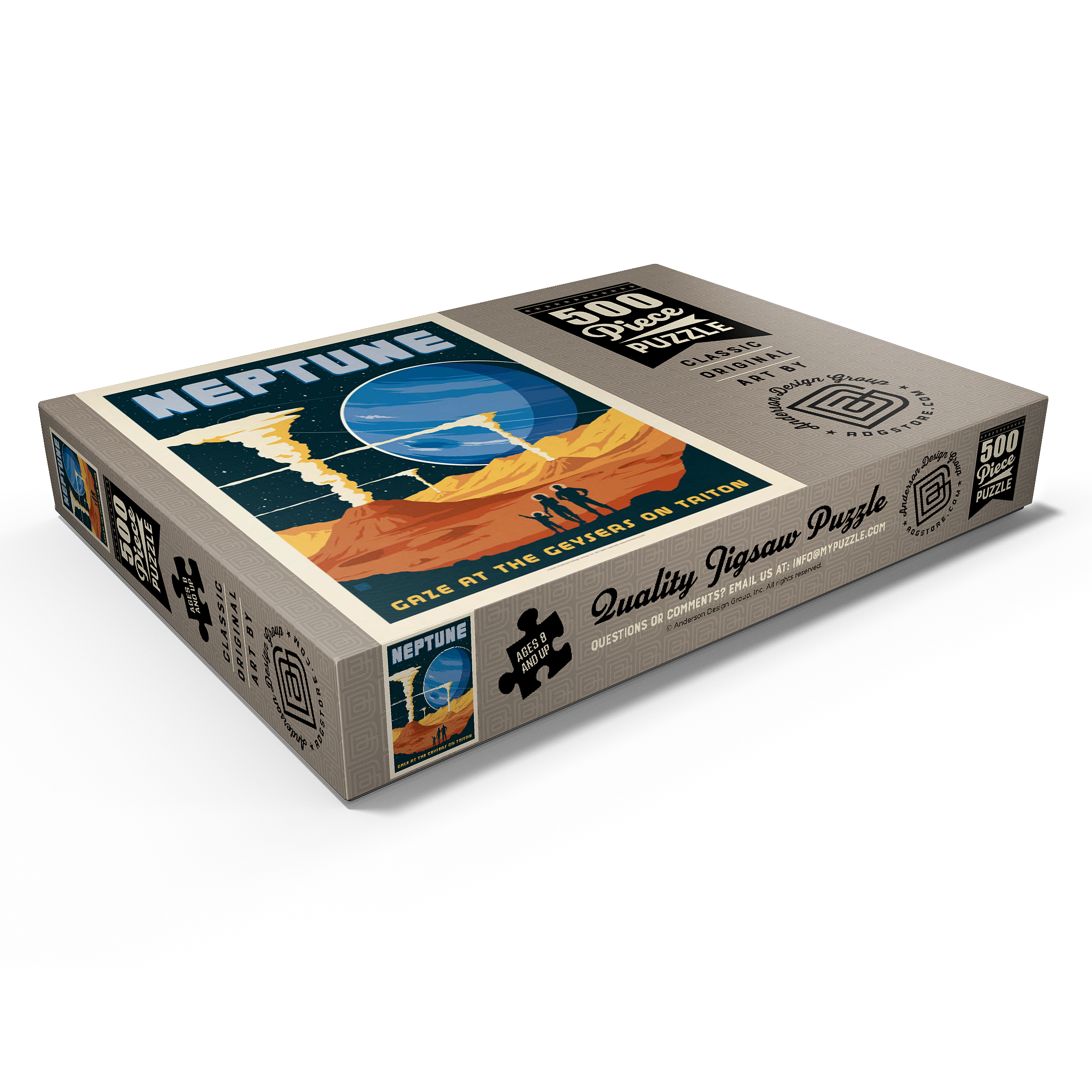 Dieses Retro-Poster zum Thema Weltraumfahrt zeigt eine beeindruckende Ansicht von Neptun, gesehen von seinem größten Mond Triton, der für seine aktiven Stickstoffgeysire bekannt ist. Die Szene zeigt eine Familie von Weltraumforschern, die auf der rötlichen, felsigen Oberfläche von Triton stehen und zu den hoch in die dünne Atmosphäre schießenden Geysiren blicken. Neptun dominiert den Himmel mit seinen satten Blautönen und sichtbaren atmosphärischen Bändern und bildet eine atemberaubende Kulisse. Der künstlerische Stil ist stark von Reiseplakaten aus der Mitte des Jahrhunderts inspiriert und zeichnet sich durch klare Linien, kräftige Farben und vereinfachte, aber dynamische Designelemente aus, die Nostalgie und Abenteuerlust wecken. Die hoch aufragenden Geysire, die realistische Planetenperspektive und die Darstellung der außerirdischen Erkundung verleihen dem Bild ein faszinierendes Gefühl von Größe und Staunen. Triton, bekannt für seine retrograde Umlaufbahn und seine geologische Aktivität, wird hier kreativ als potenzielles Reiseziel innerhalb unseres Sonnensystems dargestellt. Die warmen Farbtöne der Landschaft bilden einen schönen Kontrast zu den kühlen Blautönen von Neptun und verstärken so die visuelle Wirkung. Das Poster fängt die Aufregung des Weltraumtourismus und die Faszination der Entdeckung ferner Welten ein. Dieses fantasievolle, vintage-inspirierte Kunstwerk ist perfekt für Weltraumbegeisterte und alle, die von der Erforschung anderer Planeten fasziniert sind.