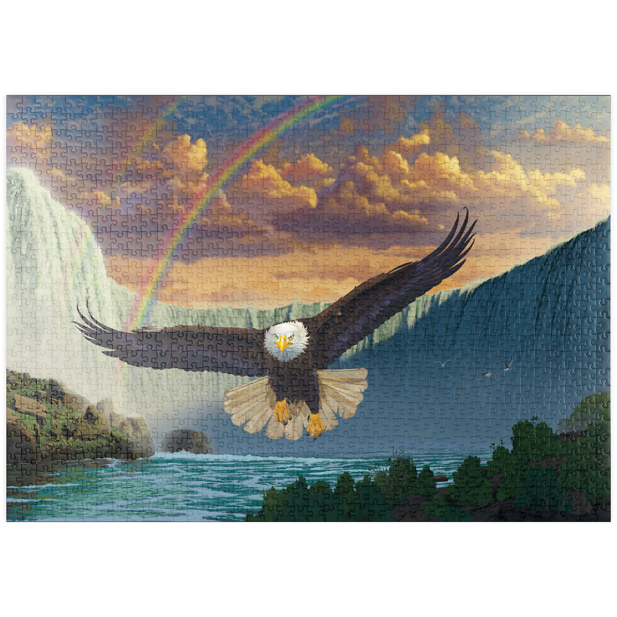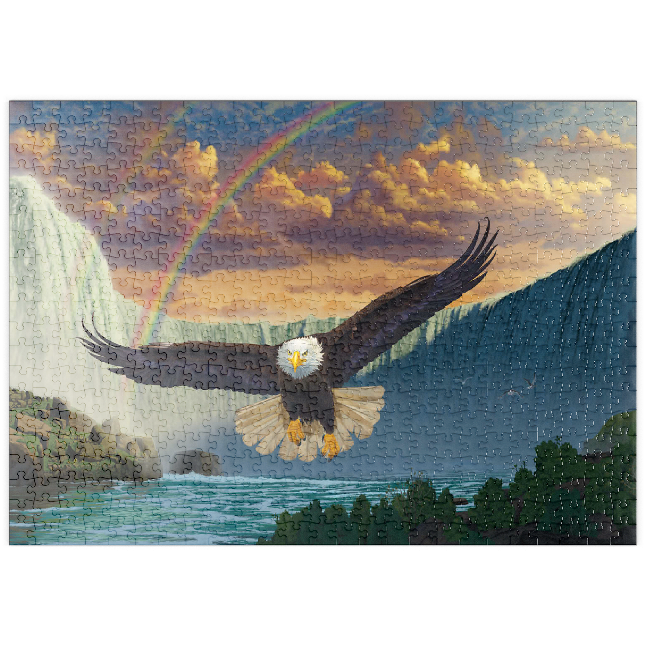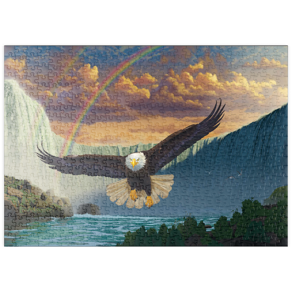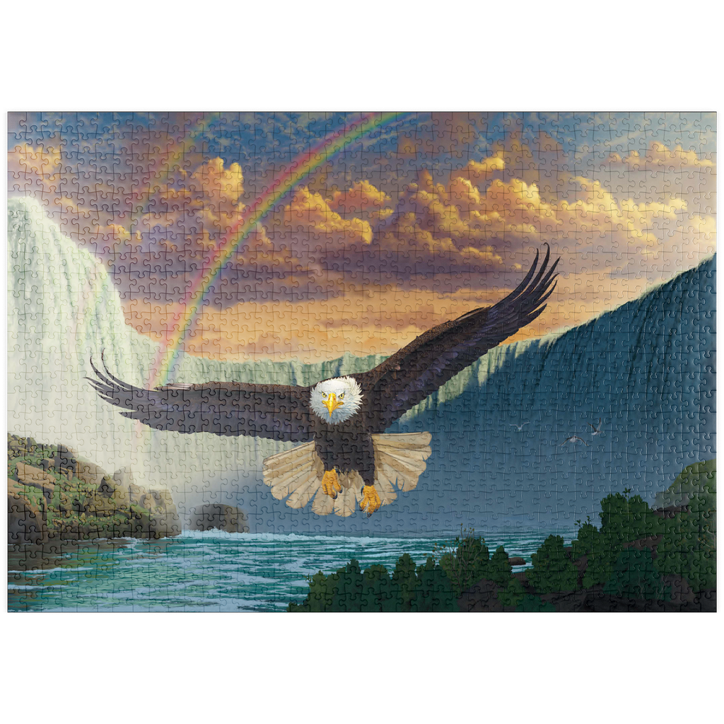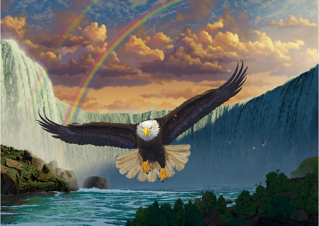 Dieses Kunstwerk zeigt einen majestätischen Weißkopfseeadler im Flug vor einem atemberaubenden doppelten Regenbogen, der sich über die mächtigen Niagarafälle wölbt. Der Adler wirkt stark und kraftvoll, sein Blick ist nach vorne gerichtet. Der Wasserfall dominiert den Hintergrund, flankiert von dramatischen Klippen und üppiger Vegetation. Die gesamte Szene vermittelt ein Gefühl von Ehrfurcht und Staunen.