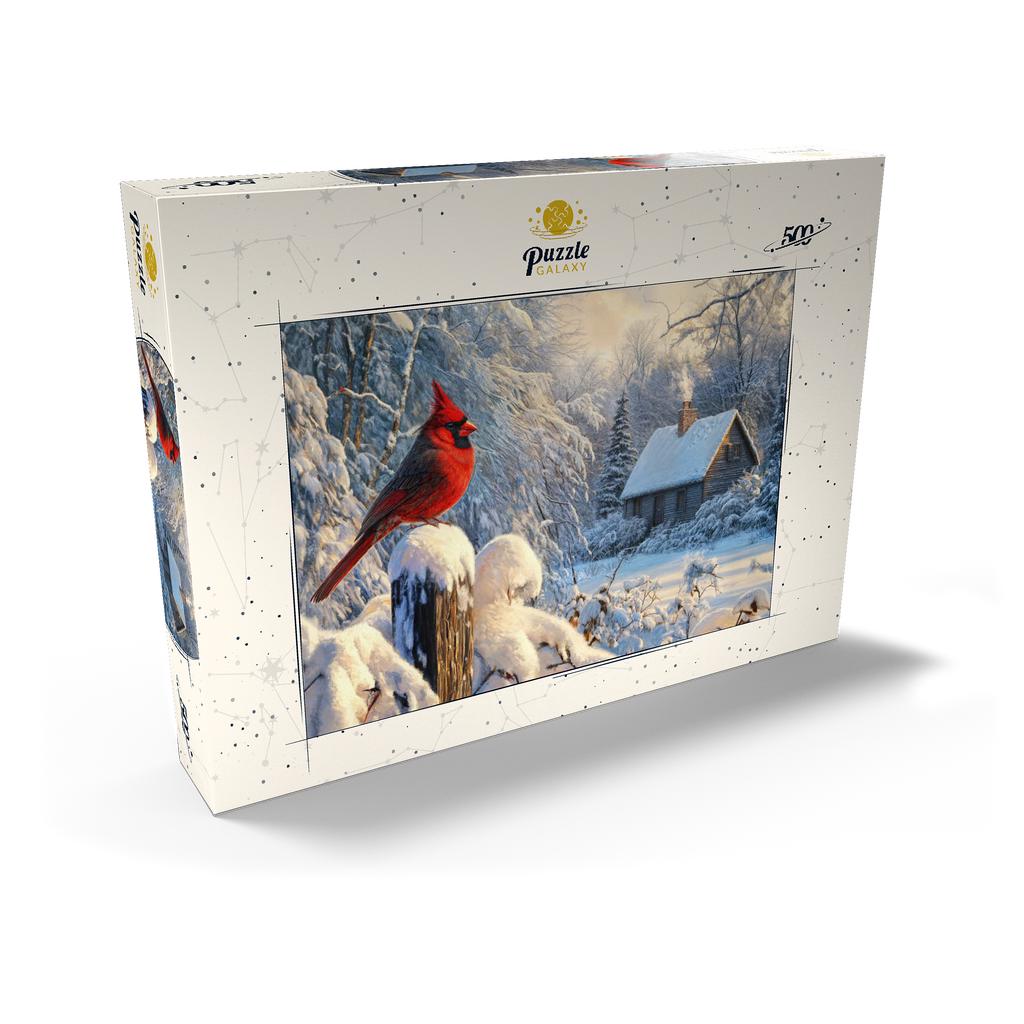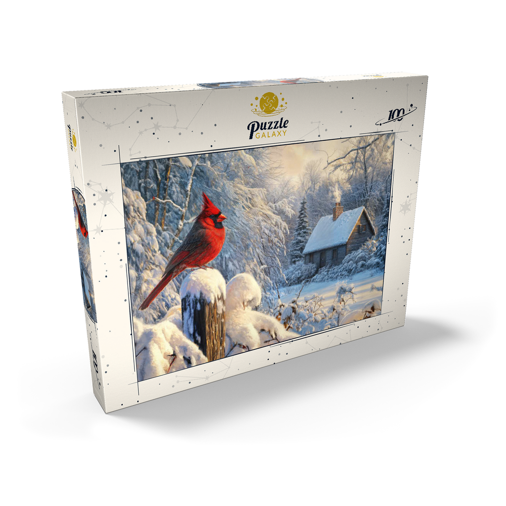 Diese ruhige Winterszene zeigt einen lebhaften Kardinal, der auf einem schneebedeckten Pfosten sitzt. Sein auffallend rotes Gefieder hebt sich von der frostigen Umgebung ab. Zwischen den verschneiten Bäumen steht eine rustikale Holzhütte, aus deren Schornstein eine leichte Rauchfahne aufsteigt, die Wärme und Ruhe ausstrahlt. Das goldene Licht des Sonnenaufgangs beleuchtet den unberührten Schnee und schafft eine malerische Mischung aus natürlicher Schönheit und jahreszeitlichem Charme.