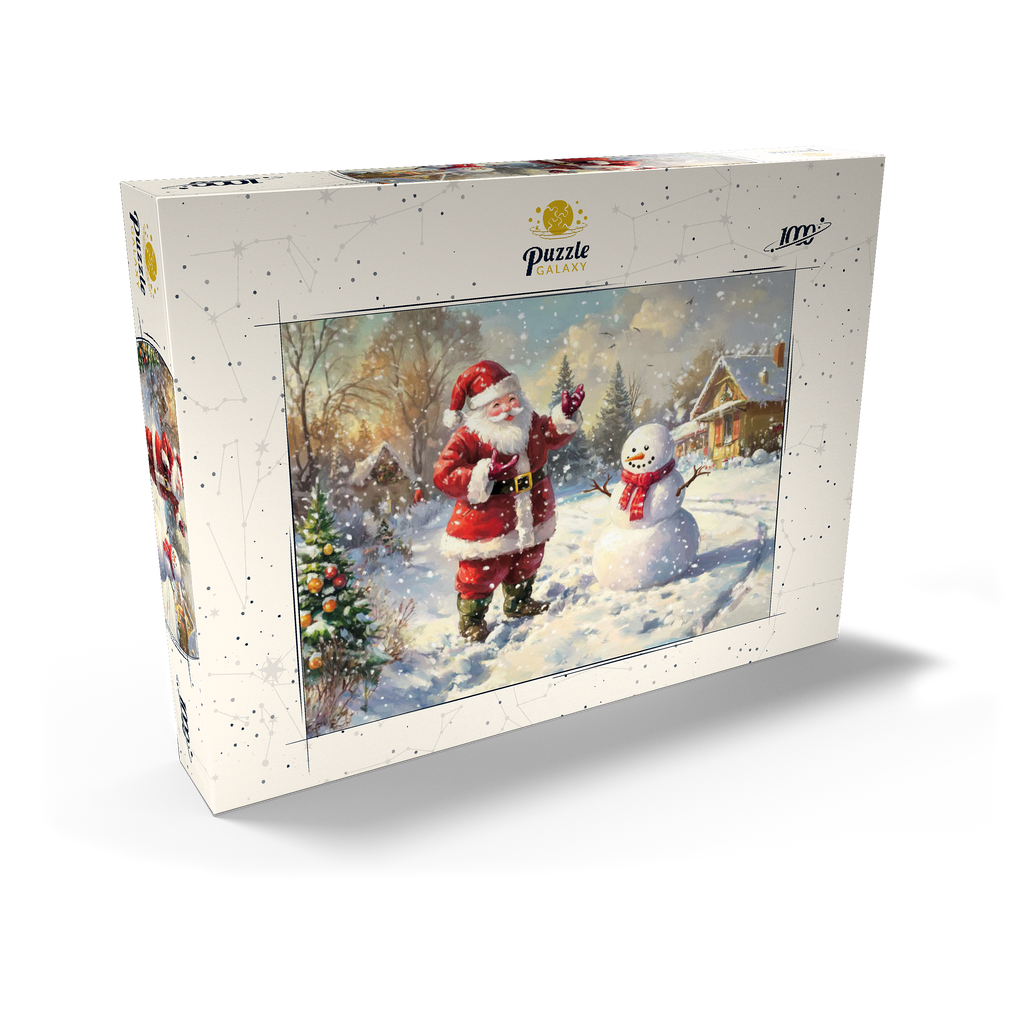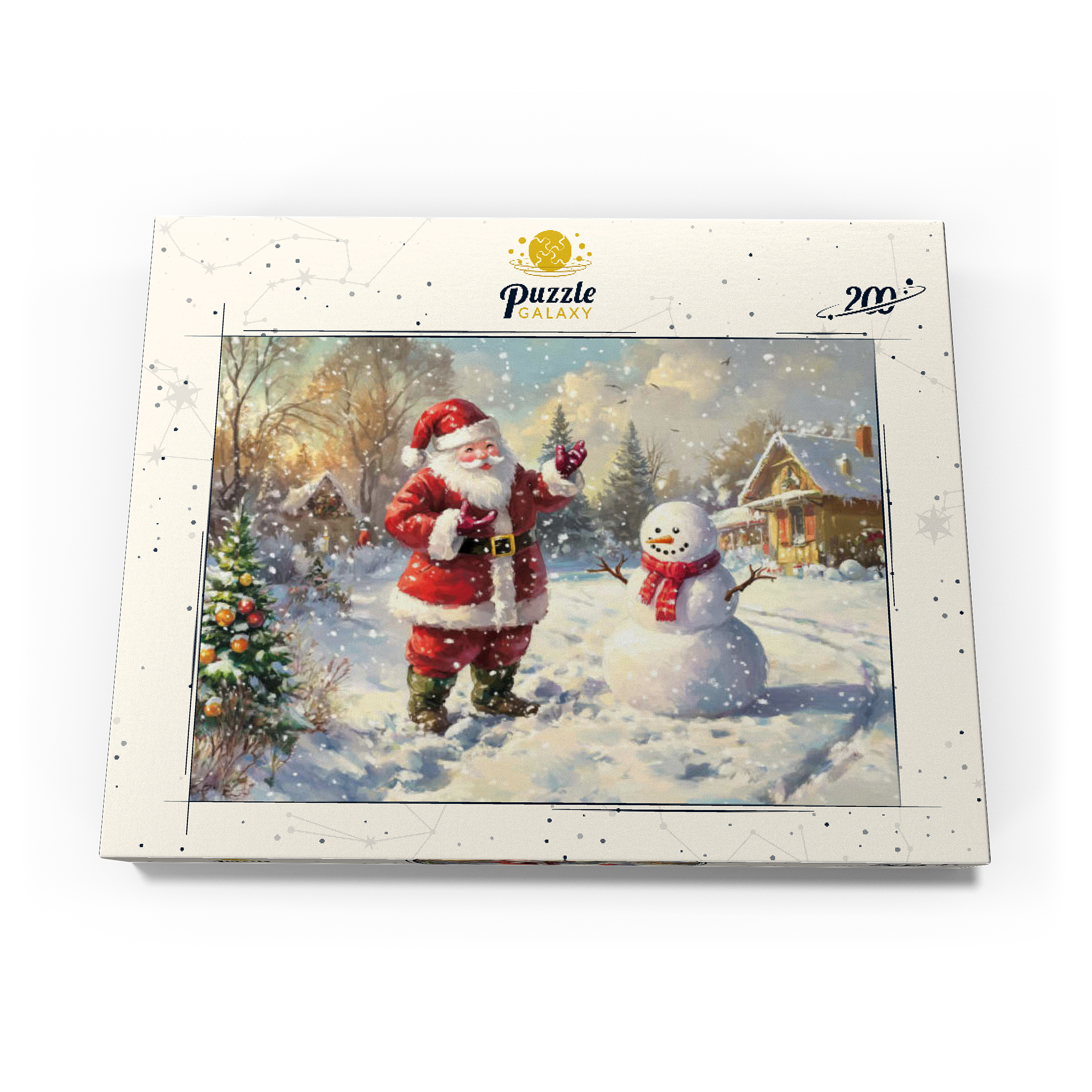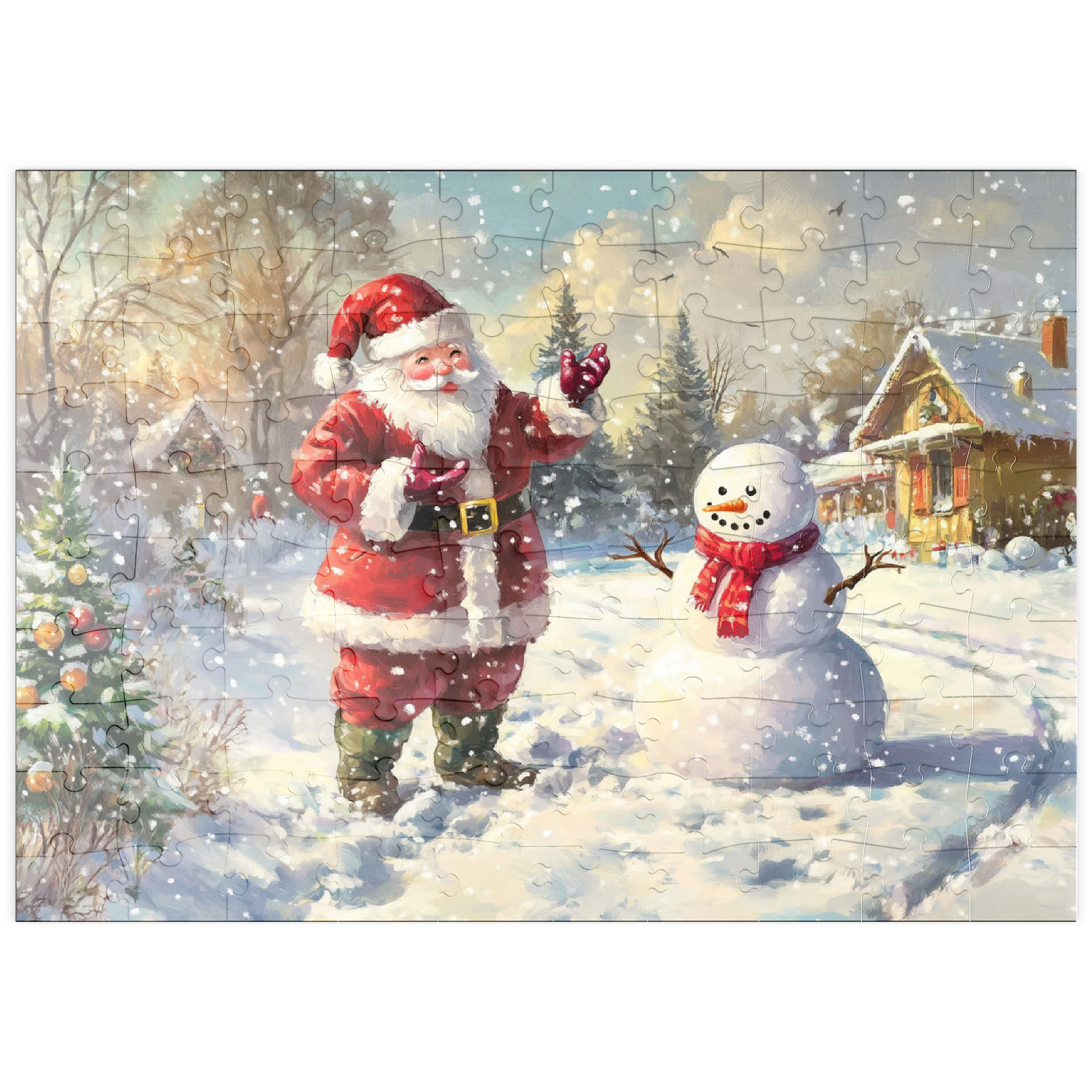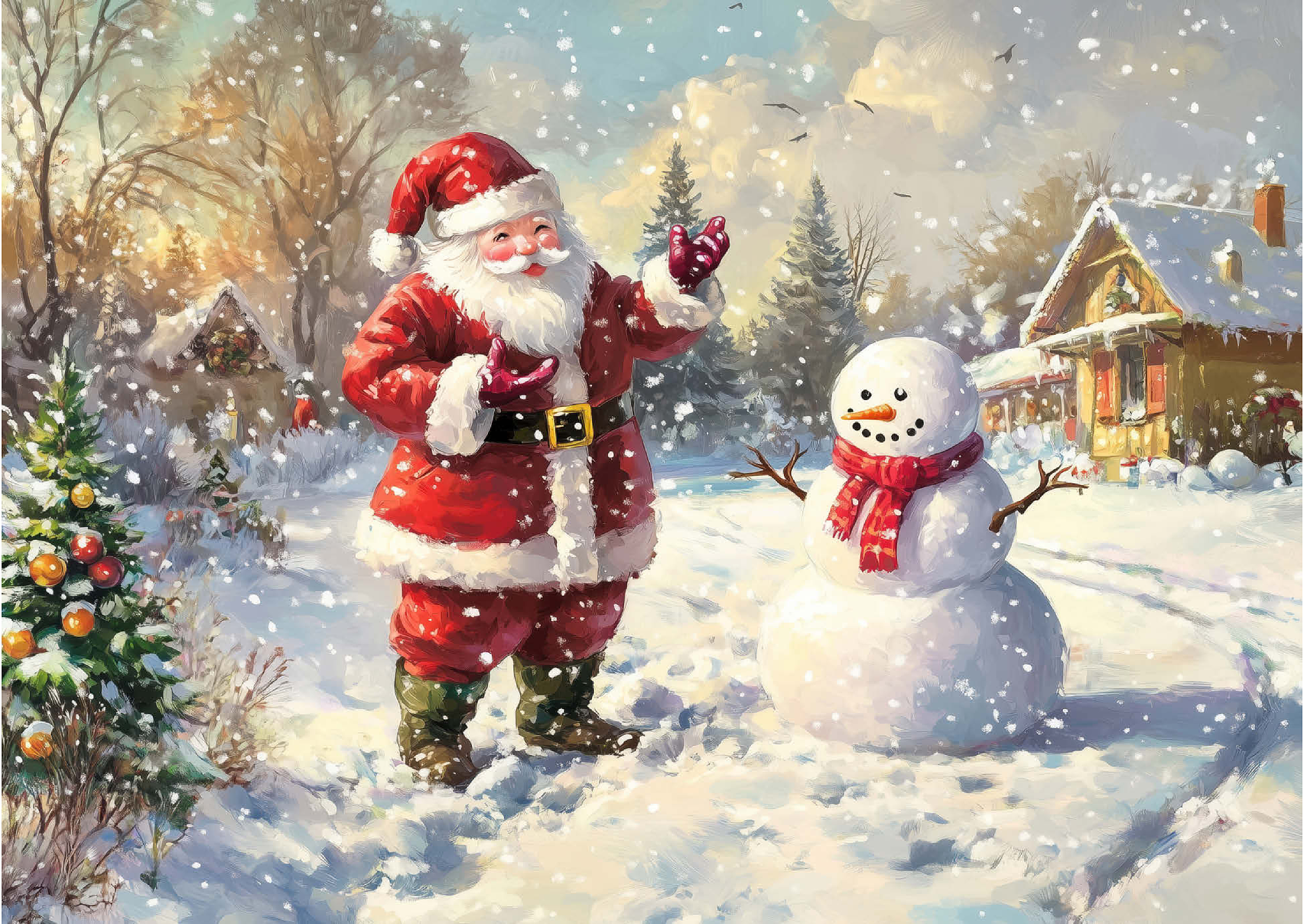 Diese herzerwärmende Winterszene zeigt den Weihnachtsmann, der neben einem fröhlichen Schneemann mit rotem Schal und Stockarmen steht. Der Schnee fällt sanft über die idyllische Schneelandschaft, in der gemütliche Hütten und ein geschmückter Weihnachtsbaum für festlichen Charme sorgen. Das warme Sonnenlicht fällt durch die kahlen Bäume und wirft einen goldenen Schein, der die zauberhafte Weihnachtsatmosphäre noch verstärkt. Diese entzückende Darstellung fängt die Essenz der Weihnachtsstimmung und der saisonalen Freude ein.