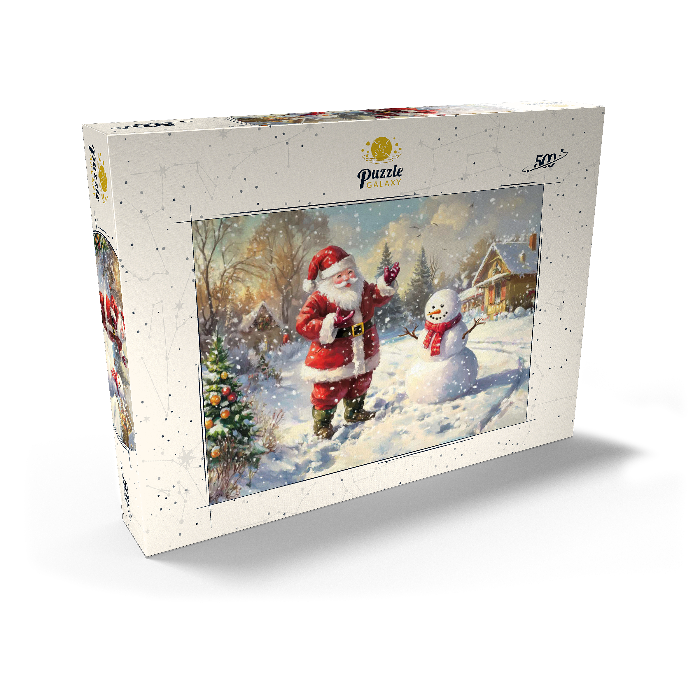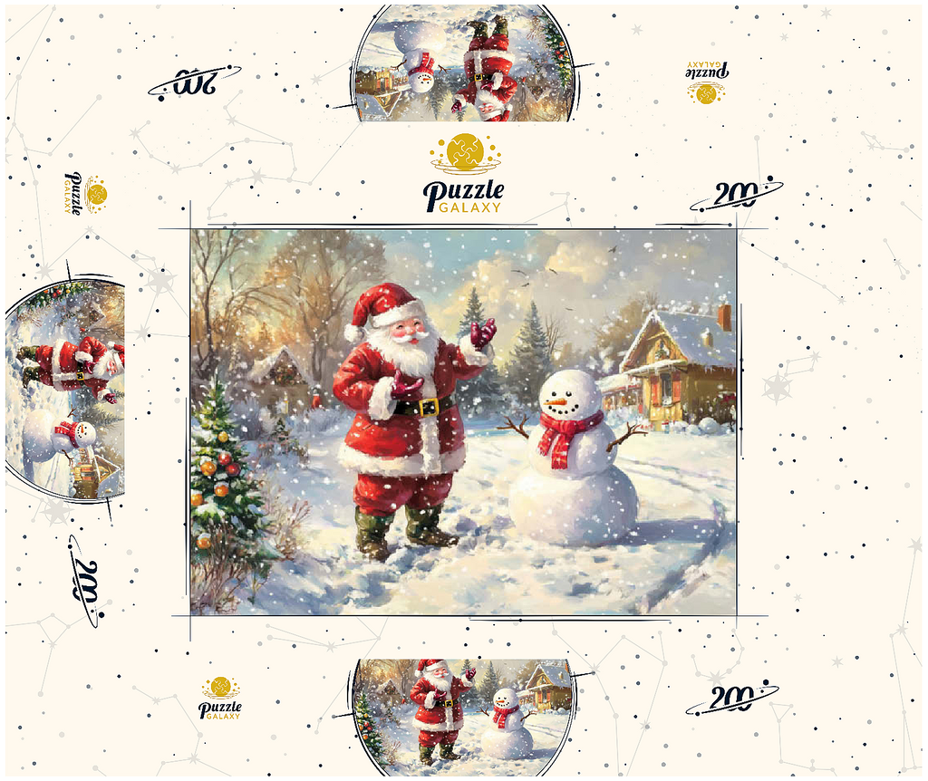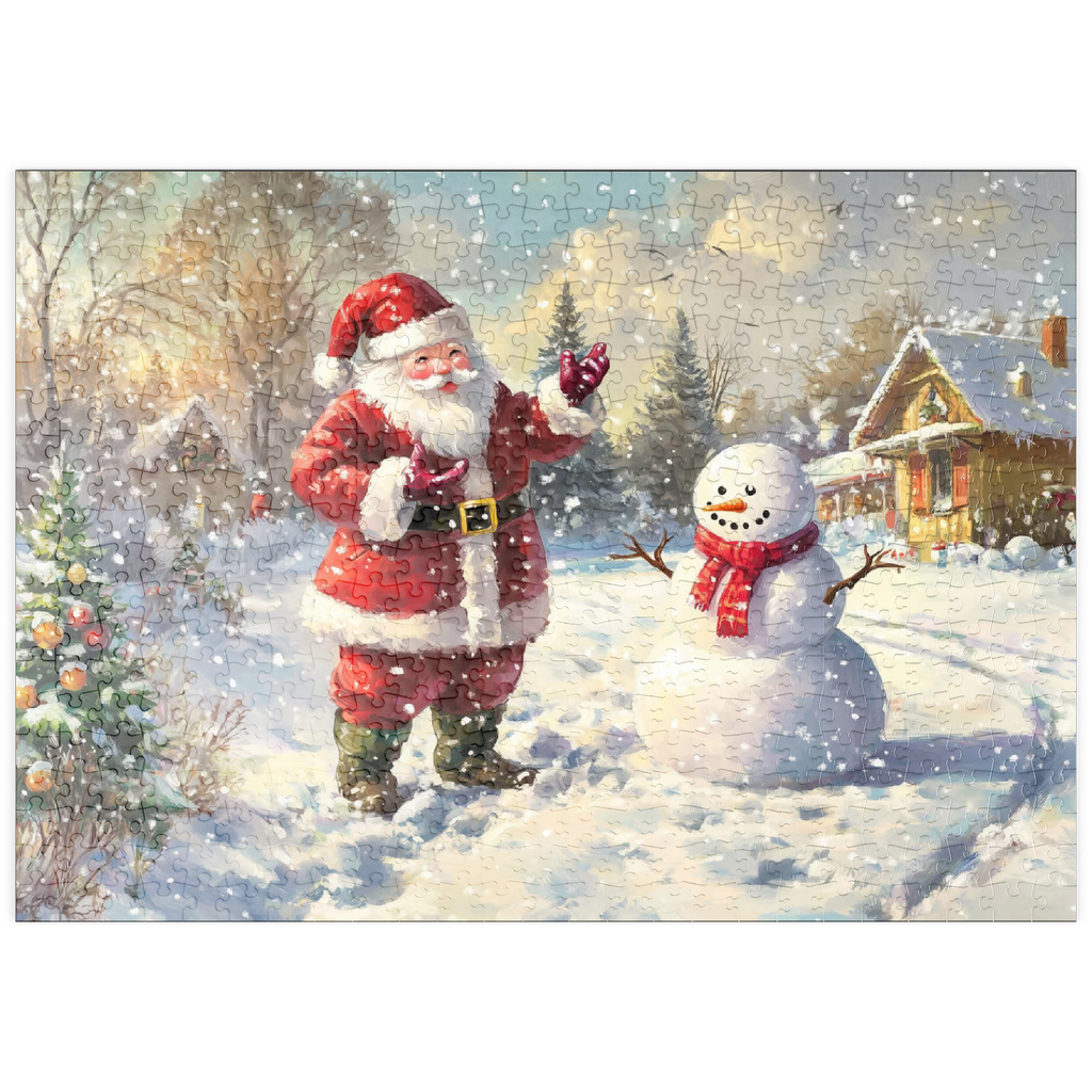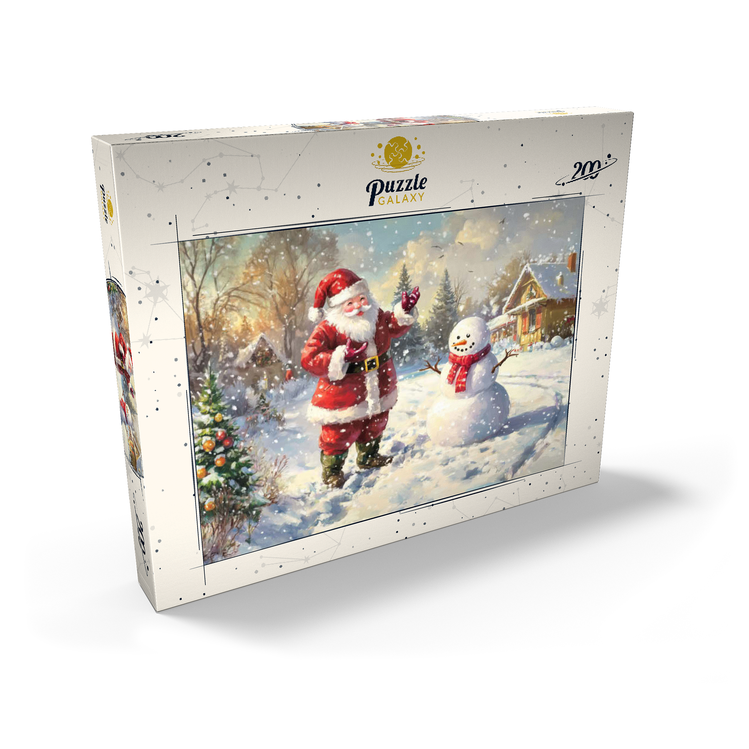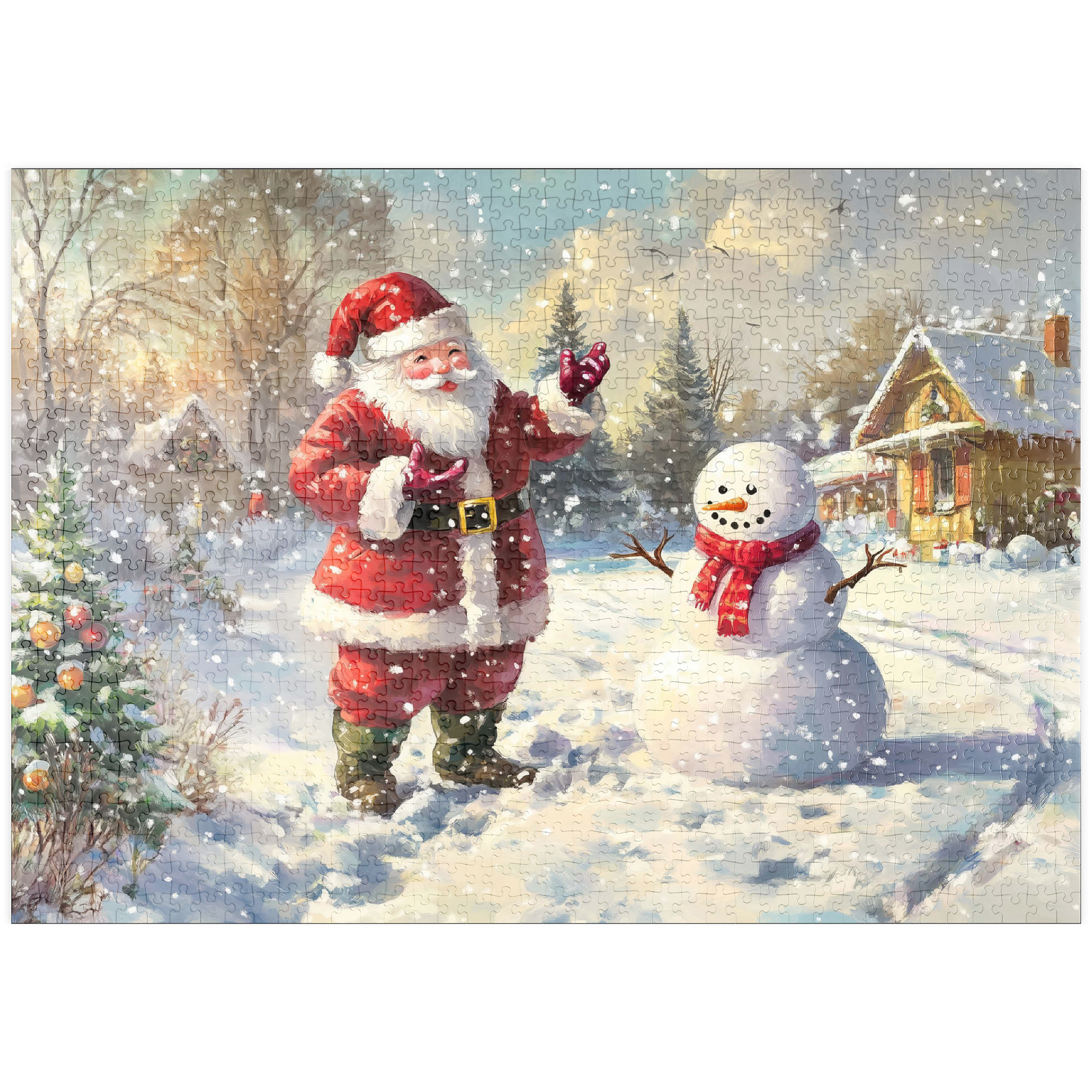Diese herzerwärmende Winterszene zeigt den Weihnachtsmann, der neben einem fröhlichen Schneemann mit rotem Schal und Stockarmen steht. Der Schnee fällt sanft über die idyllische Schneelandschaft, in der gemütliche Hütten und ein geschmückter Weihnachtsbaum für festlichen Charme sorgen. Das warme Sonnenlicht fällt durch die kahlen Bäume und wirft einen goldenen Schein, der die zauberhafte Weihnachtsatmosphäre noch verstärkt. Diese entzückende Darstellung fängt die Essenz der Weihnachtsstimmung und der saisonalen Freude ein.