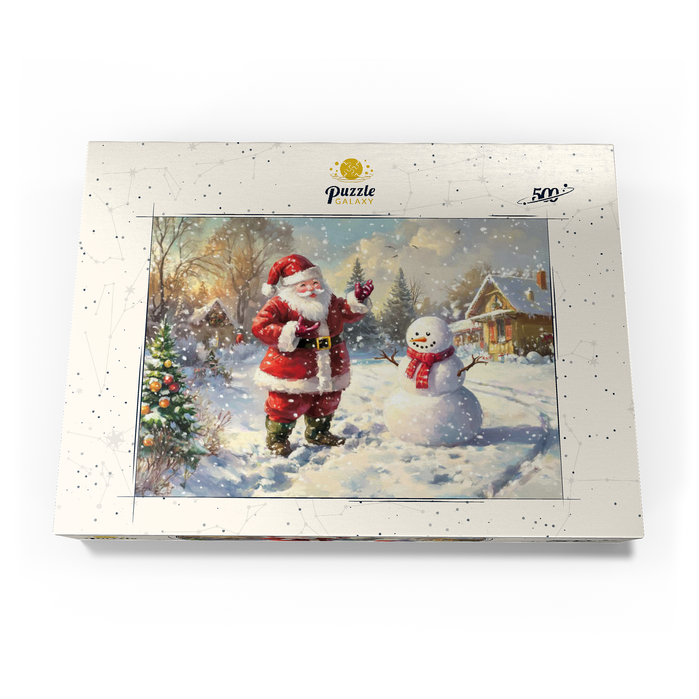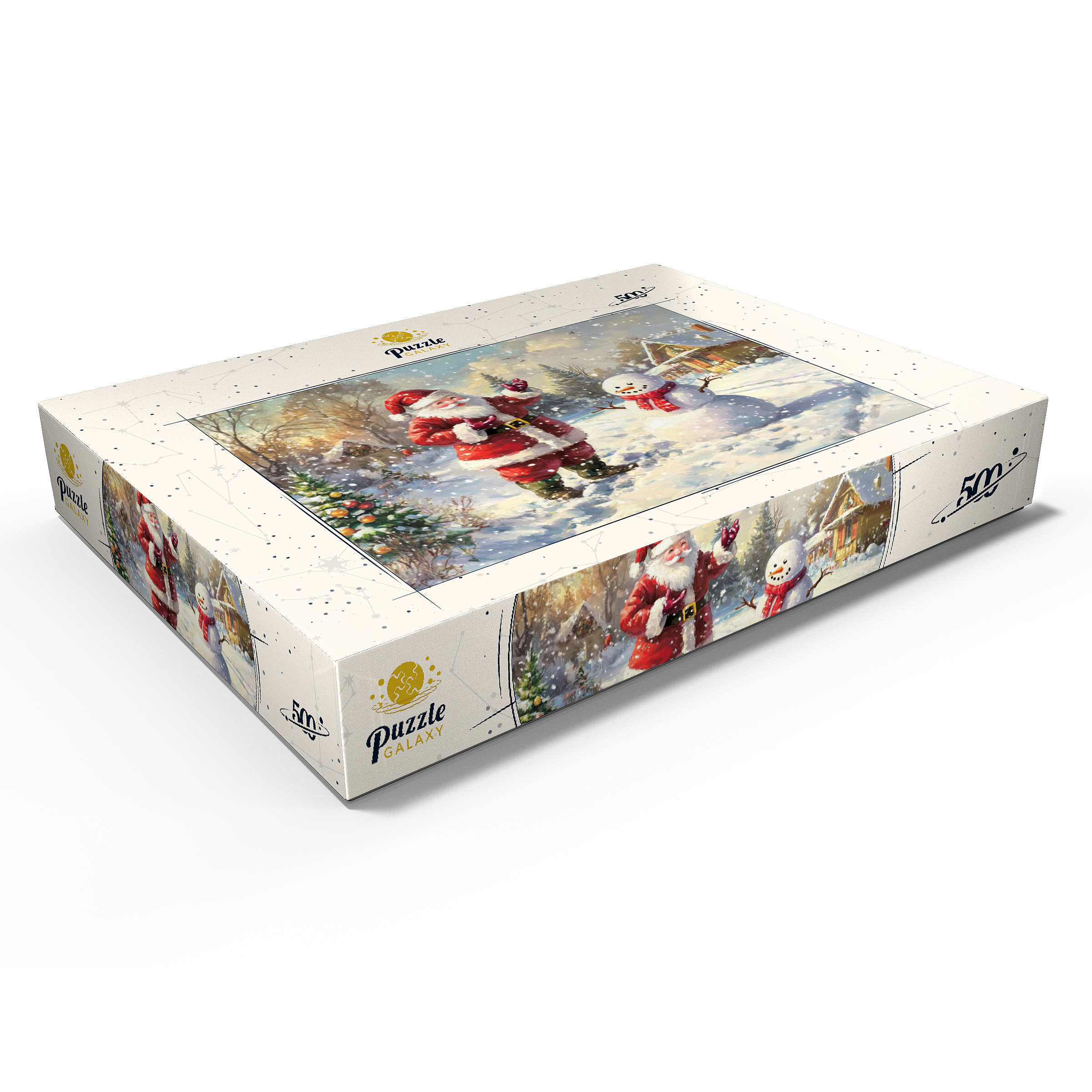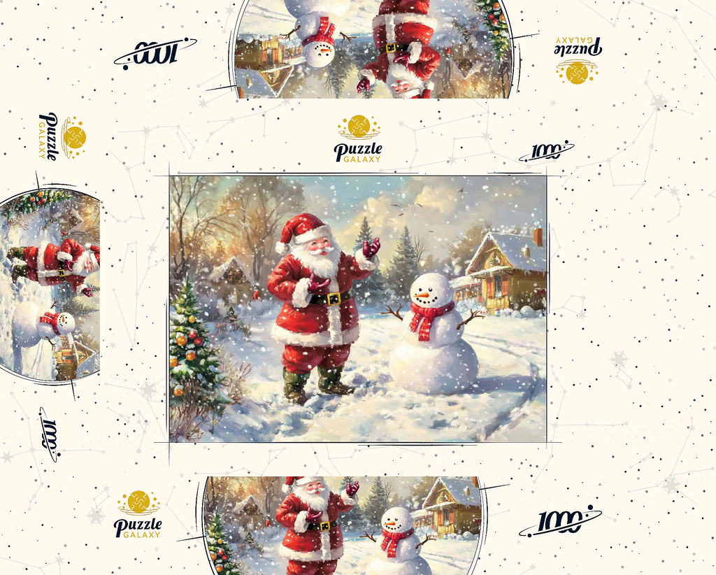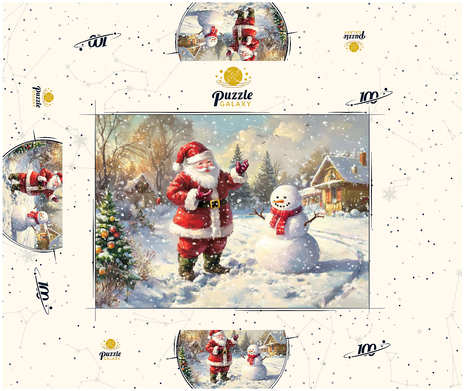 Diese herzerwärmende Winterszene zeigt den Weihnachtsmann, der neben einem fröhlichen Schneemann mit rotem Schal und Stockarmen steht. Der Schnee fällt sanft über die idyllische Schneelandschaft, in der gemütliche Hütten und ein geschmückter Weihnachtsbaum für festlichen Charme sorgen. Das warme Sonnenlicht fällt durch die kahlen Bäume und wirft einen goldenen Schein, der die zauberhafte Weihnachtsatmosphäre noch verstärkt. Diese entzückende Darstellung fängt die Essenz der Weihnachtsstimmung und der saisonalen Freude ein.